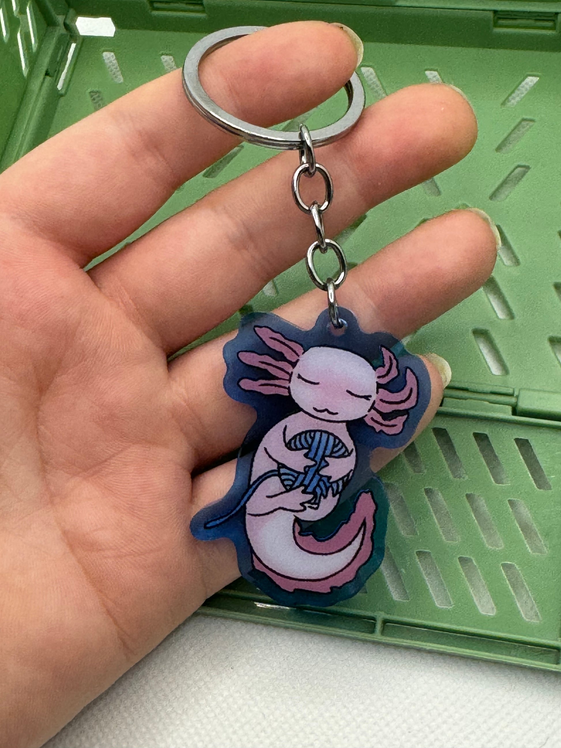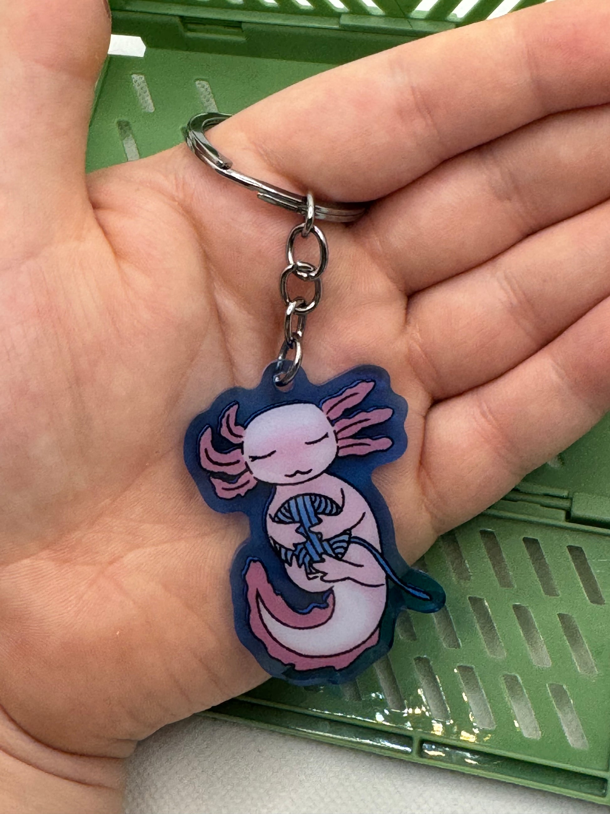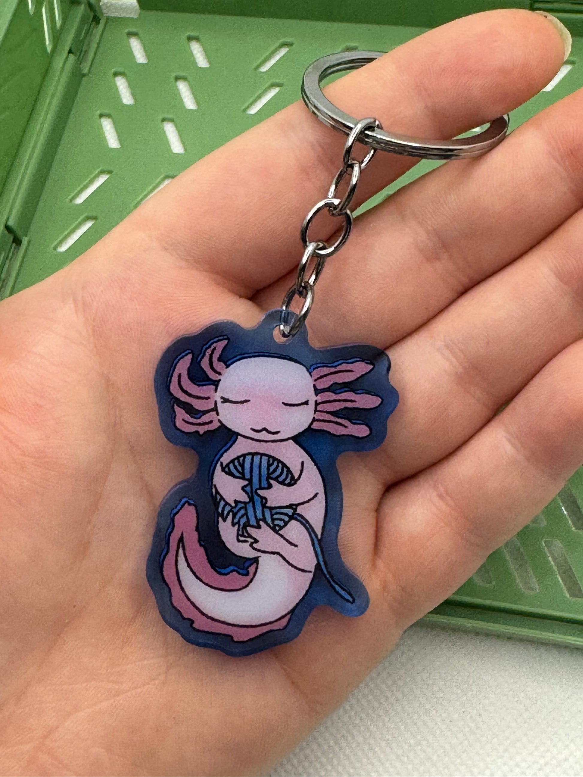 An acrylic keyring with my axolotl holding a ball of yarn design. This keyring is on blue translucent acrylic, and is double sided. The charm measures 2 inches at its largest dimension and the keyring part is a simple silver chain and large split ring for easy attachment to your keys, bag, zipper, etc!