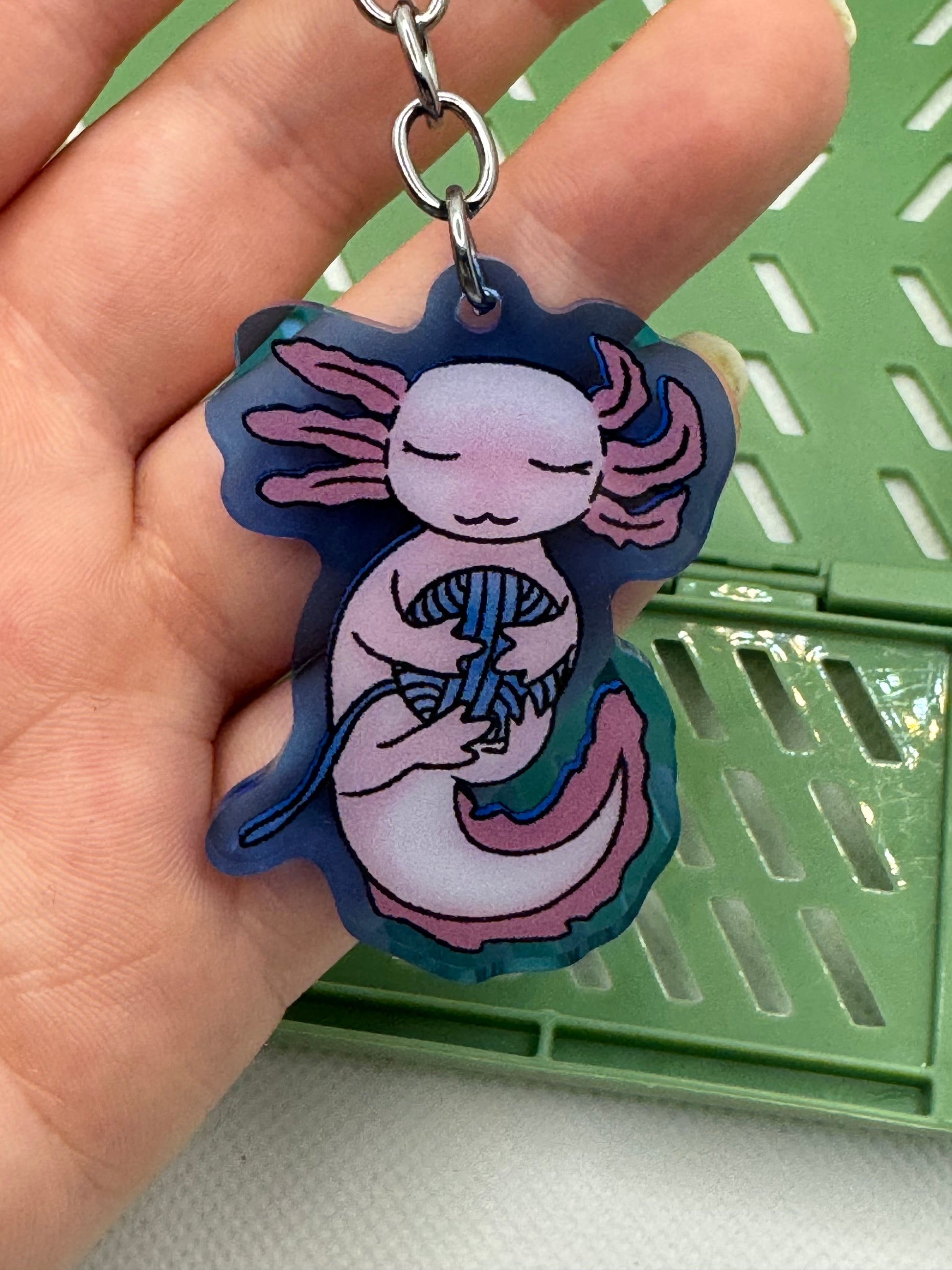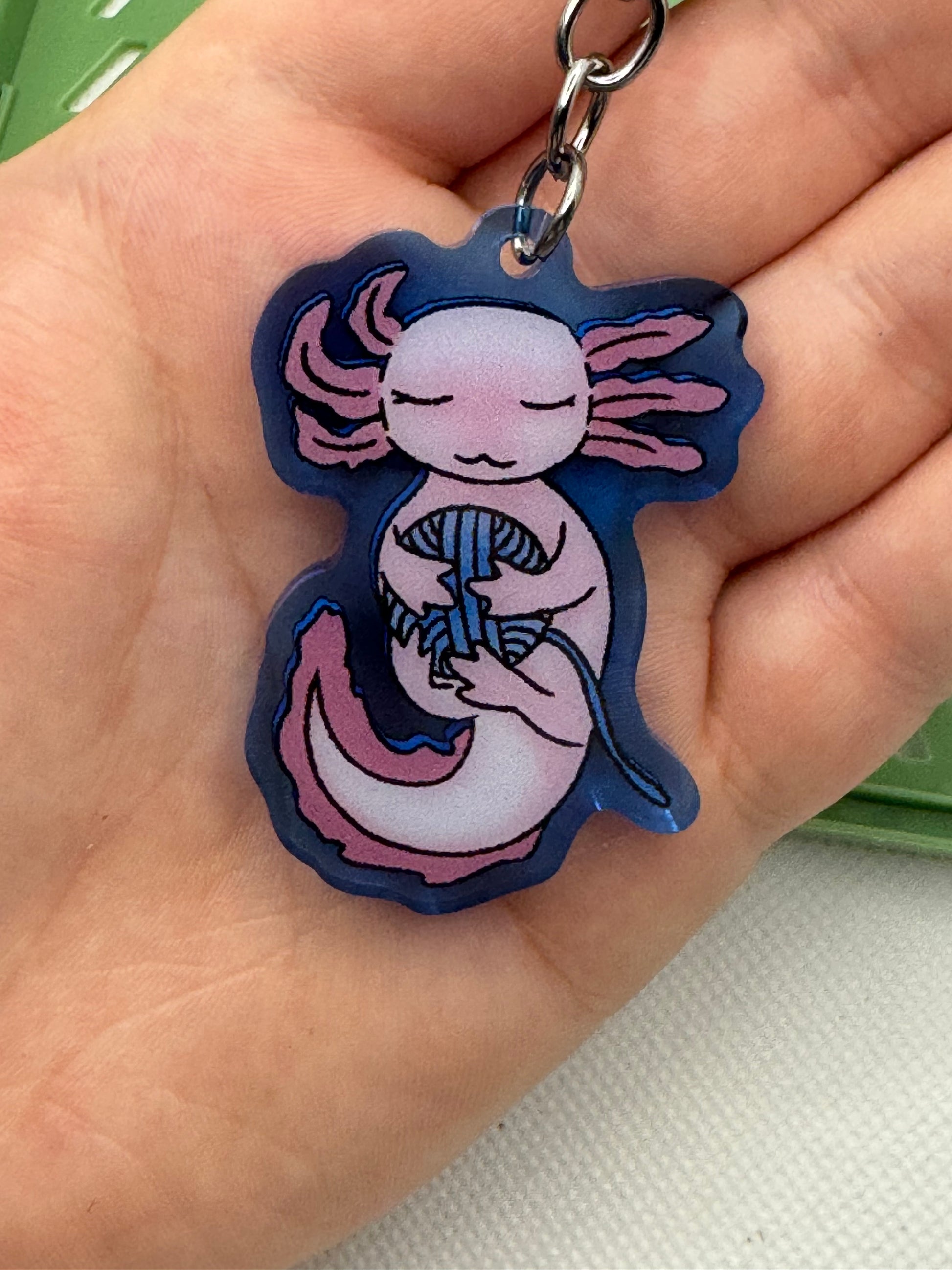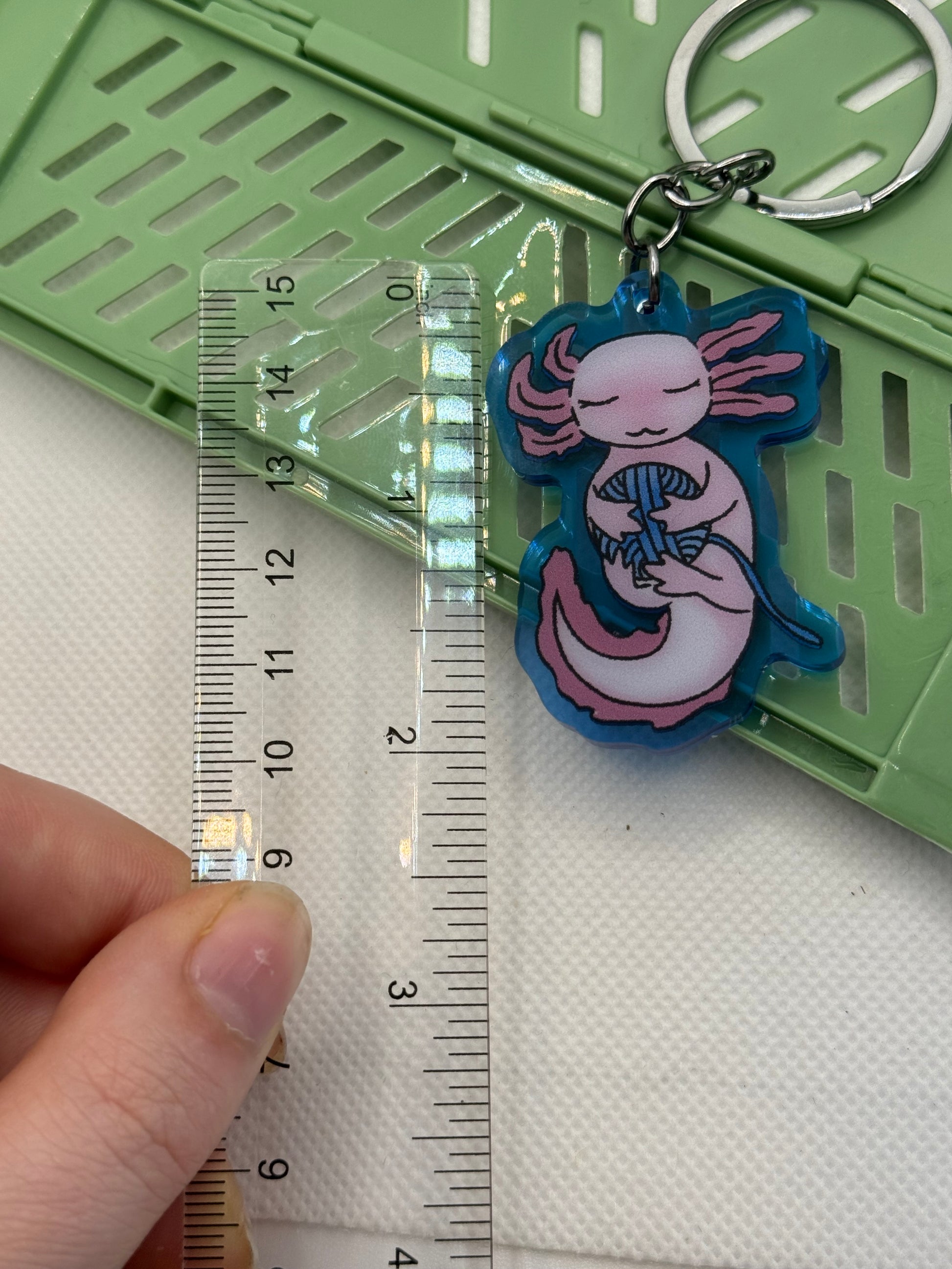 An acrylic keyring with my axolotl holding a ball of yarn design. This keyring is on blue translucent acrylic, and is double sided. The charm measures 2 inches at its largest dimension and the keyring part is a simple silver chain and large split ring for easy attachment to your keys, bag, zipper, etc!