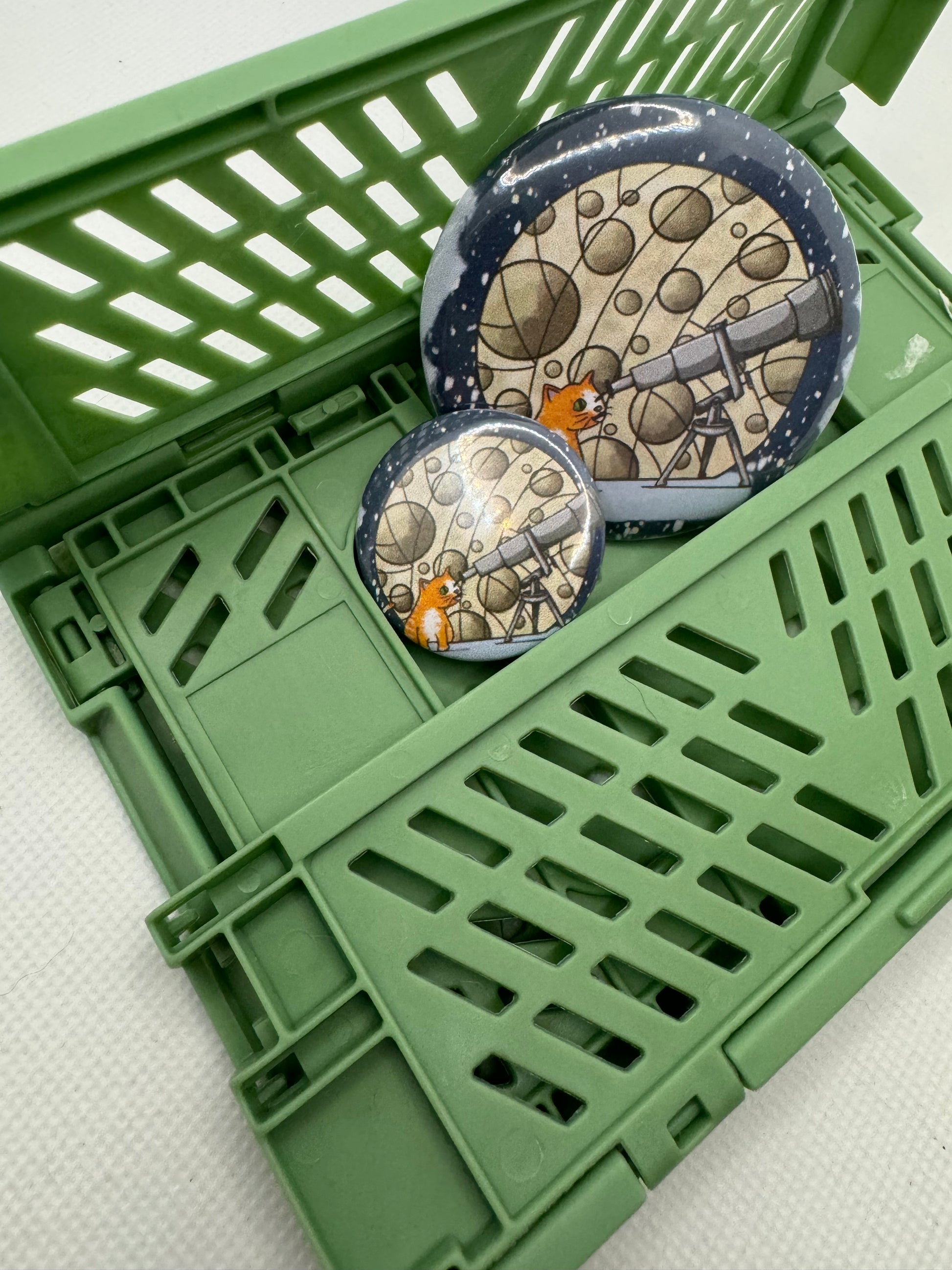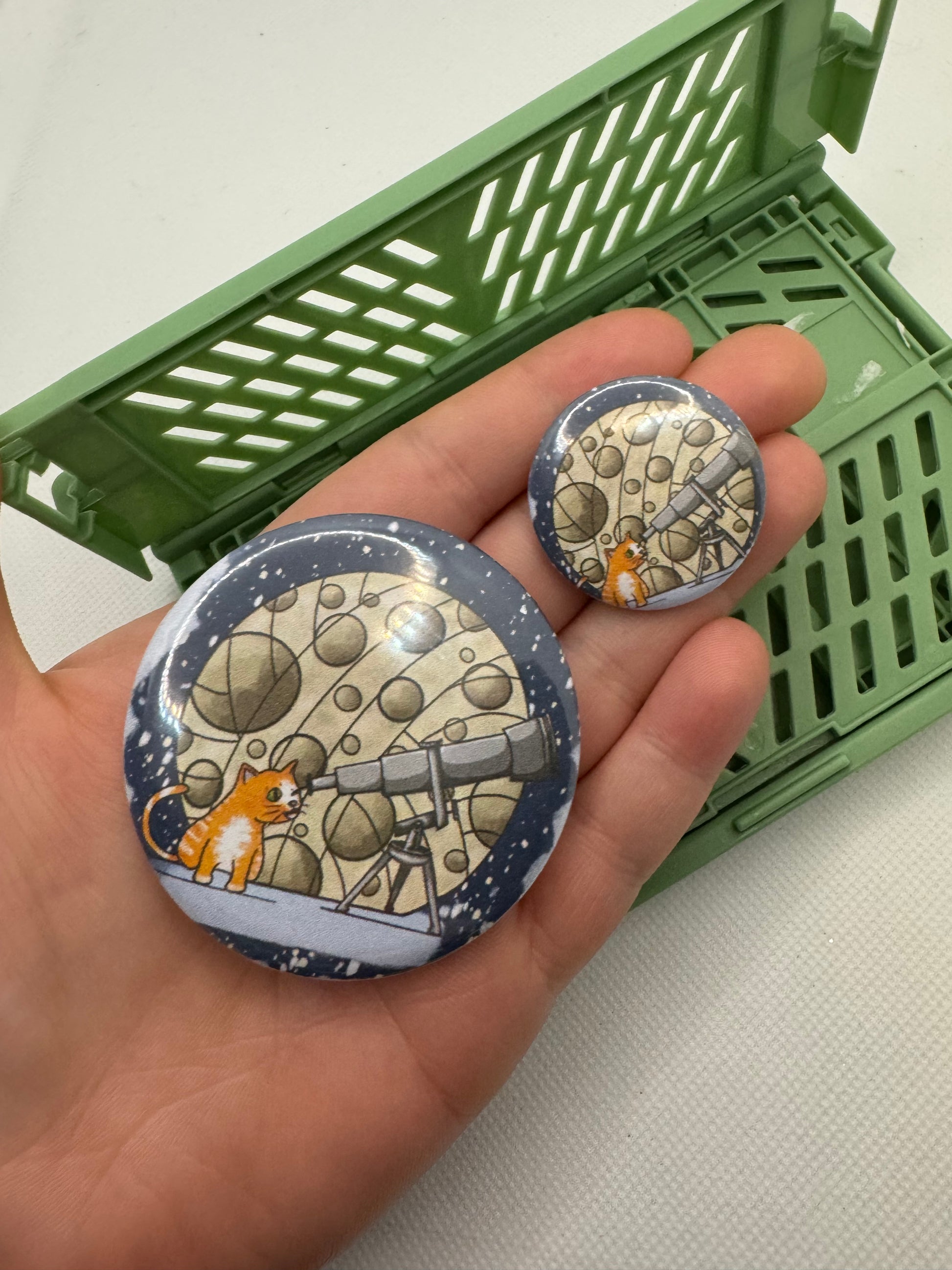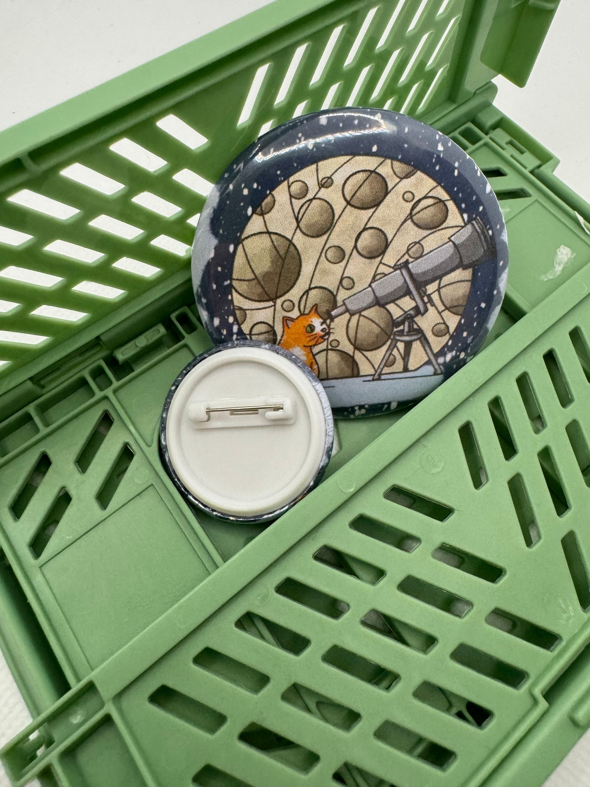 Button badge featuring my ginger cat star-gazing with a telescope, with a huge moon of yarn in the background of the sky on a blue background.