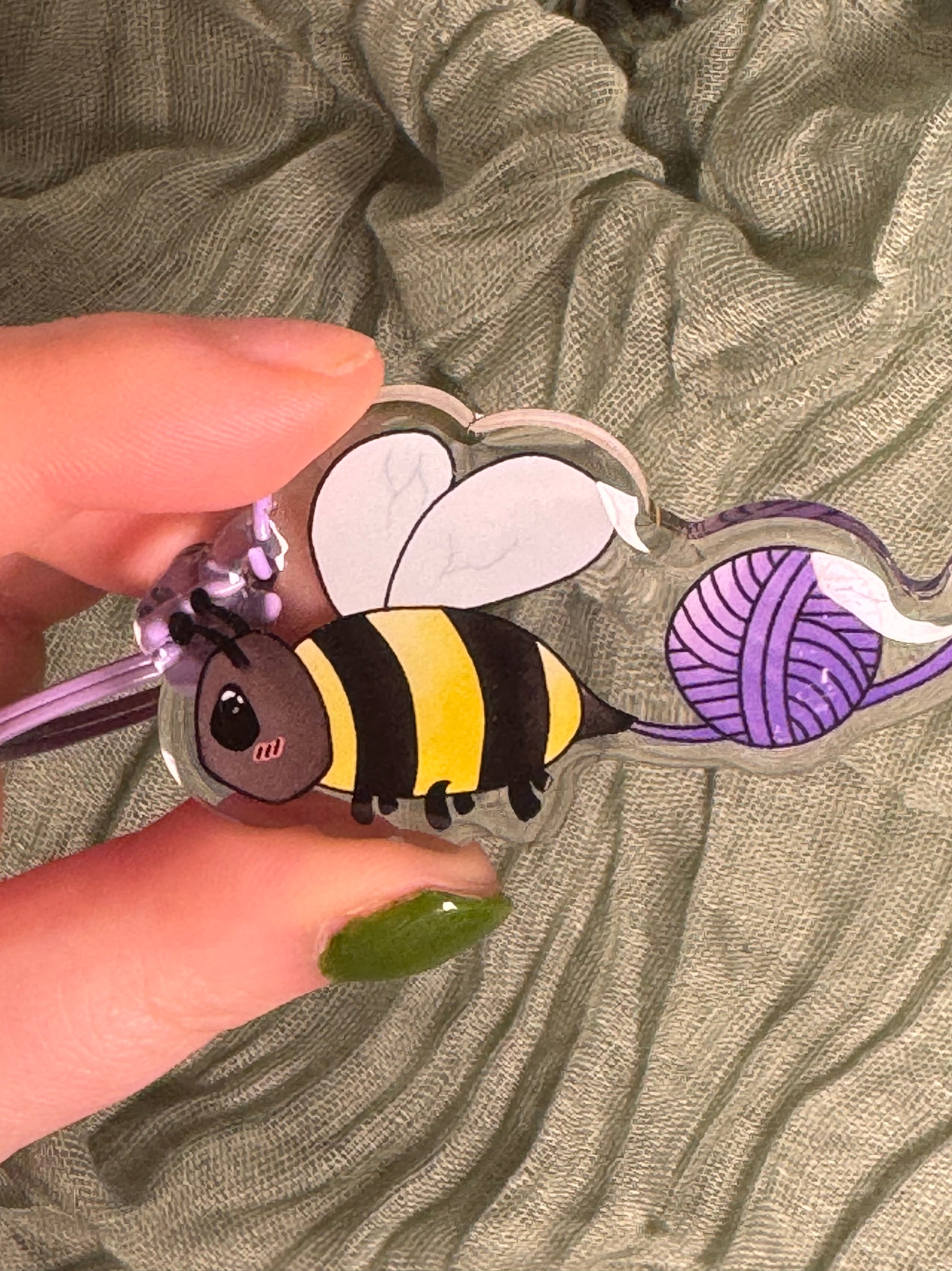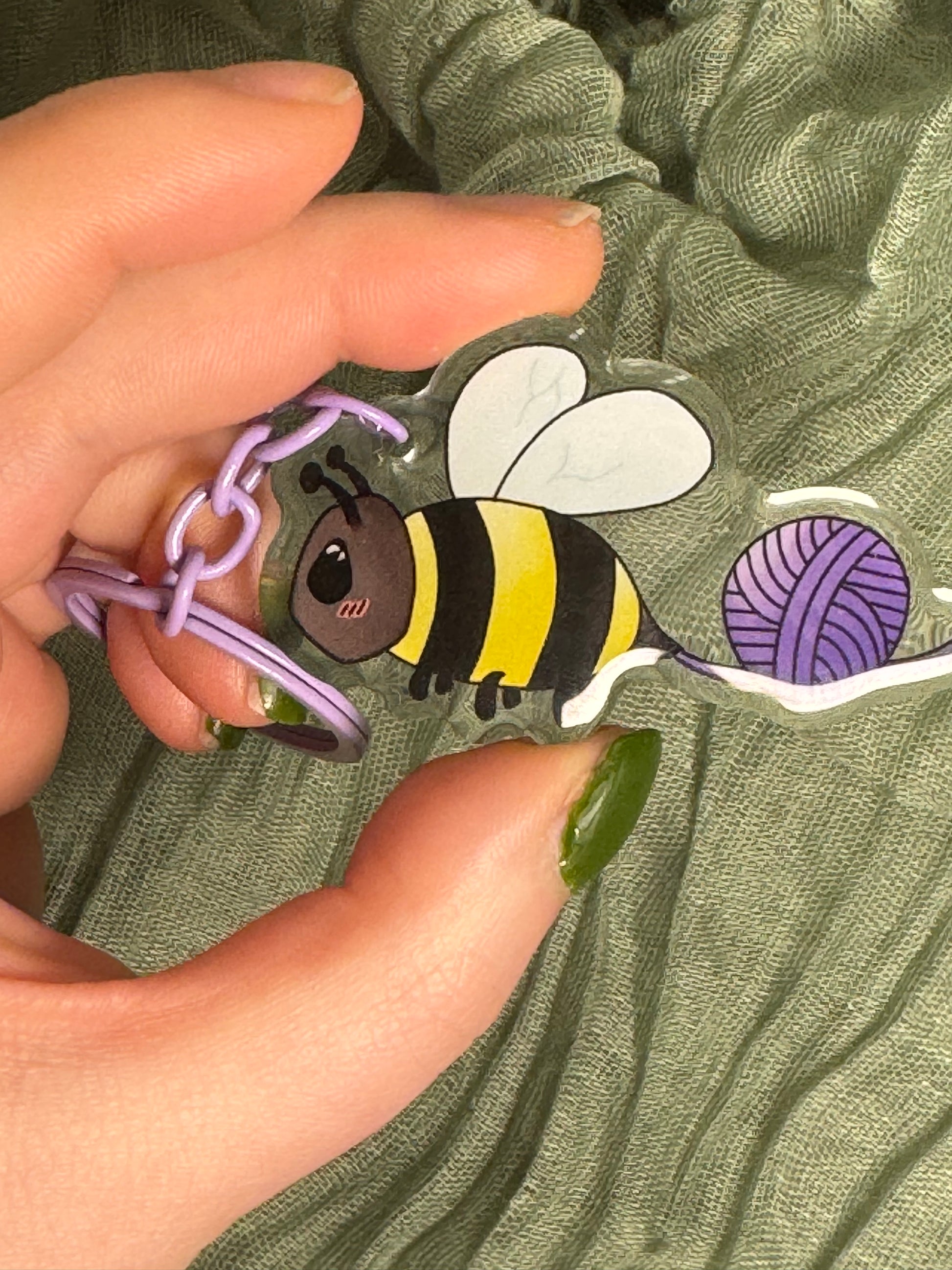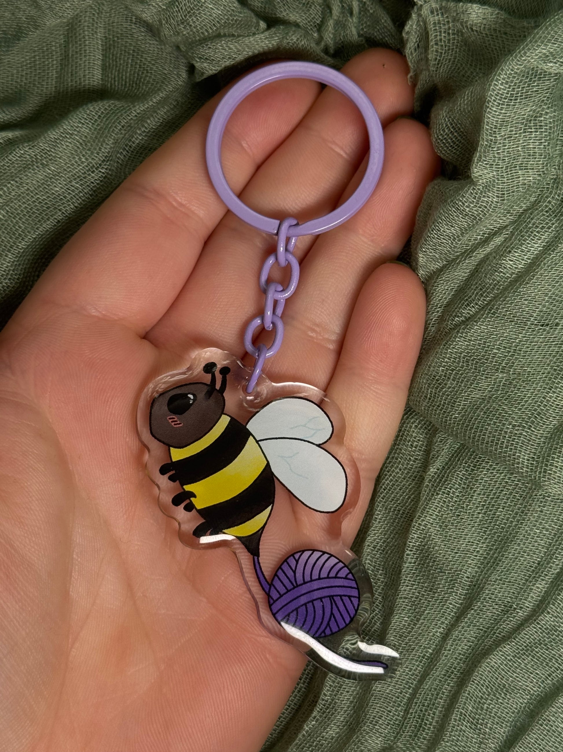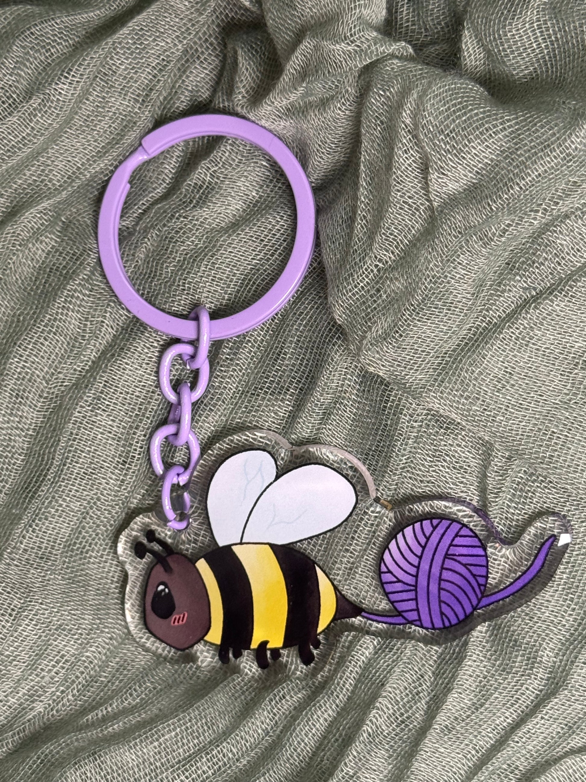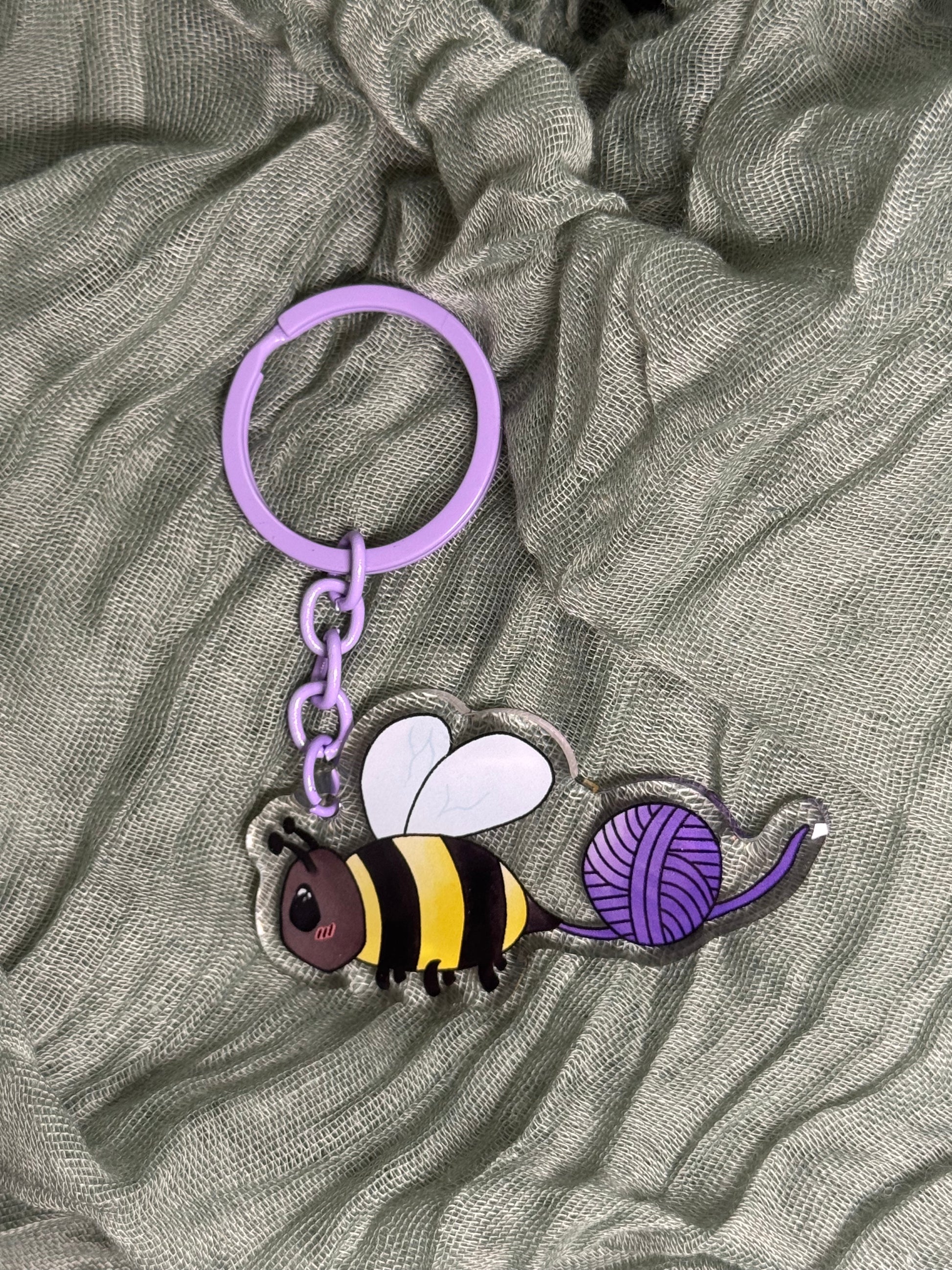 An acrylic keyring with my bumble bee leaving a trail of yarn design. This keyring is on clear acrylic, and is double sided, with front side domed epoxy finish. The charm measures 2.5-3 inches at its largest dimension and the keyring part is a simple purple metal chain and large split ring for easy attachment to your keys, bag, zipper, etc!