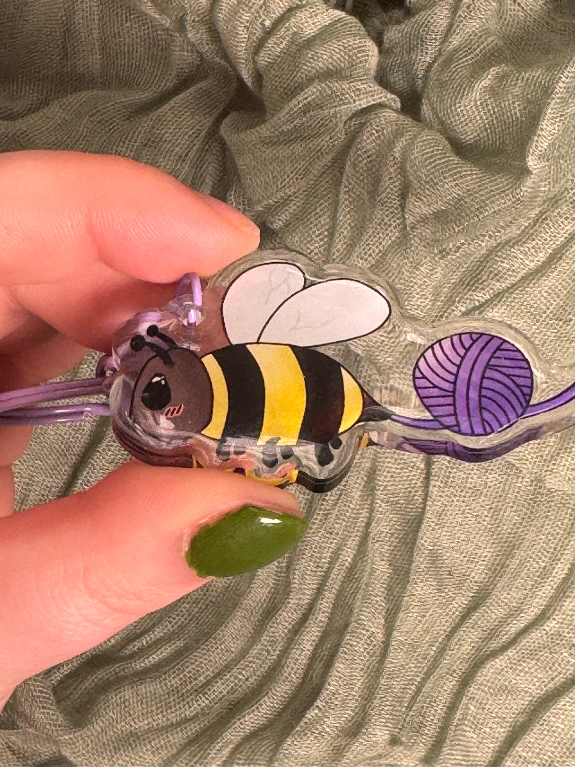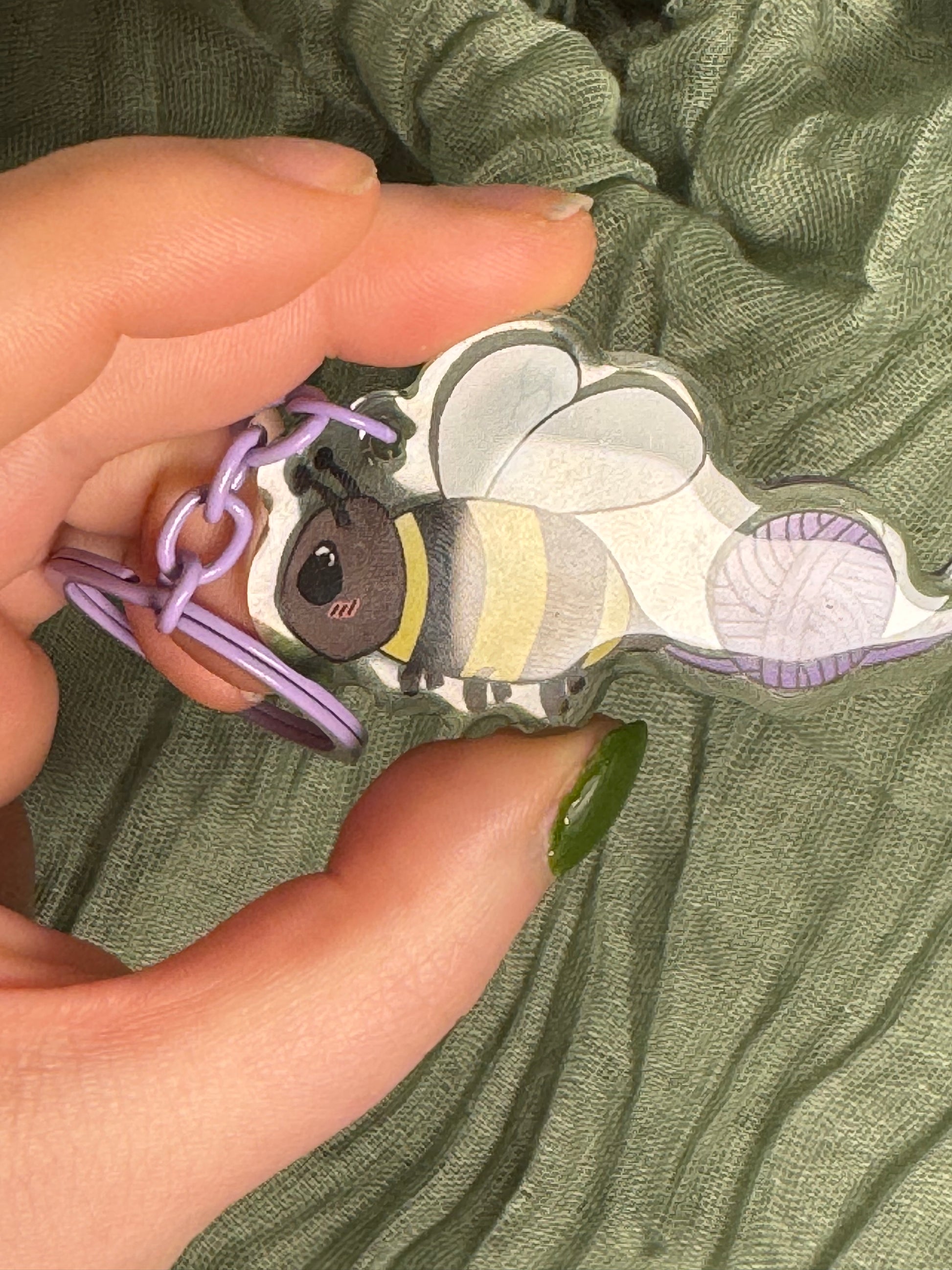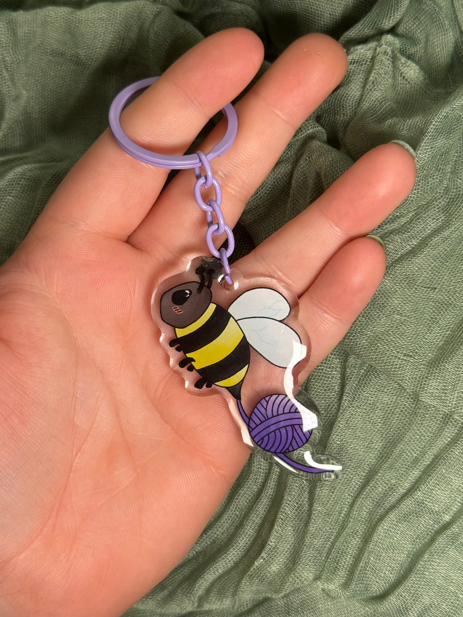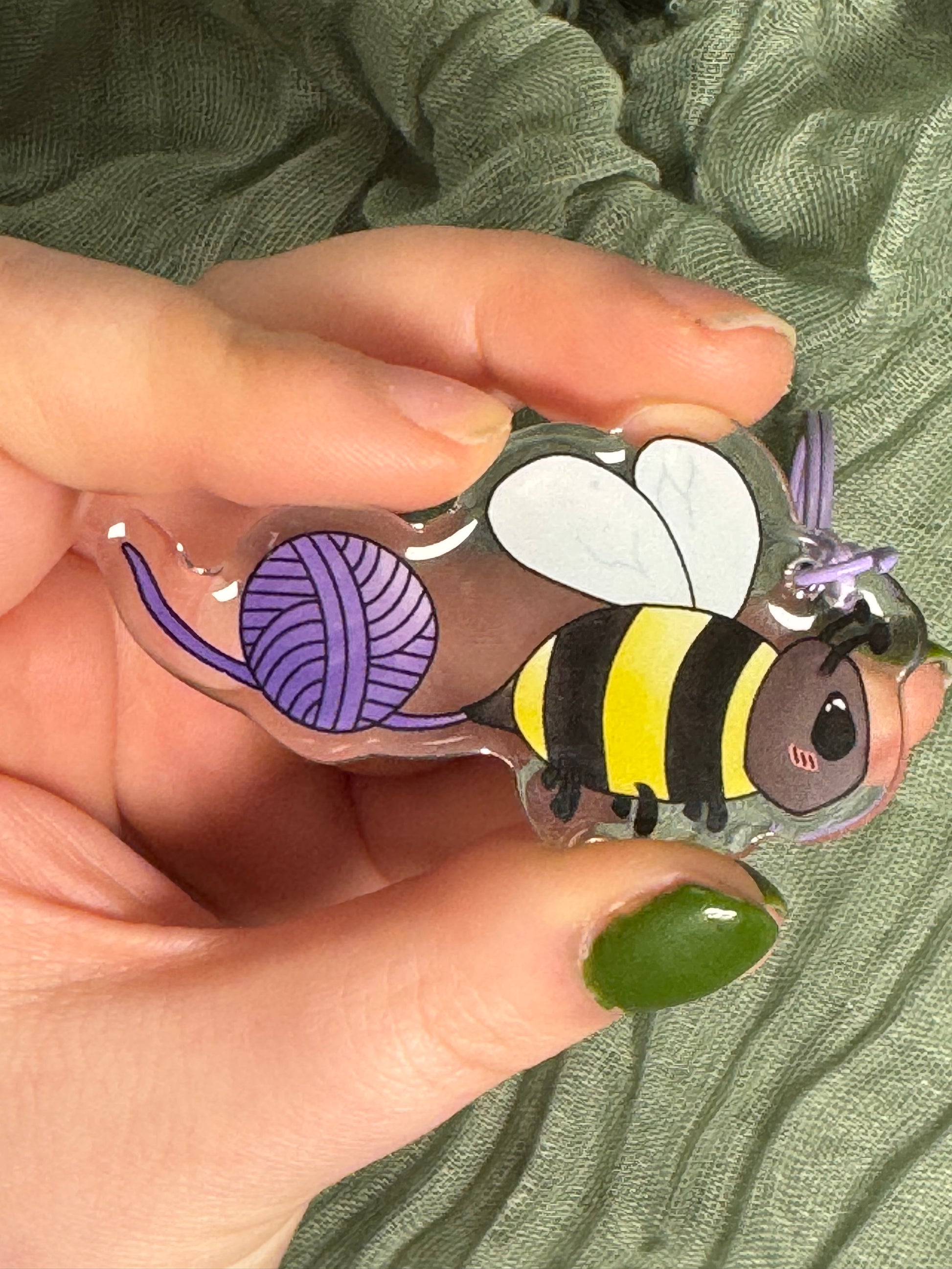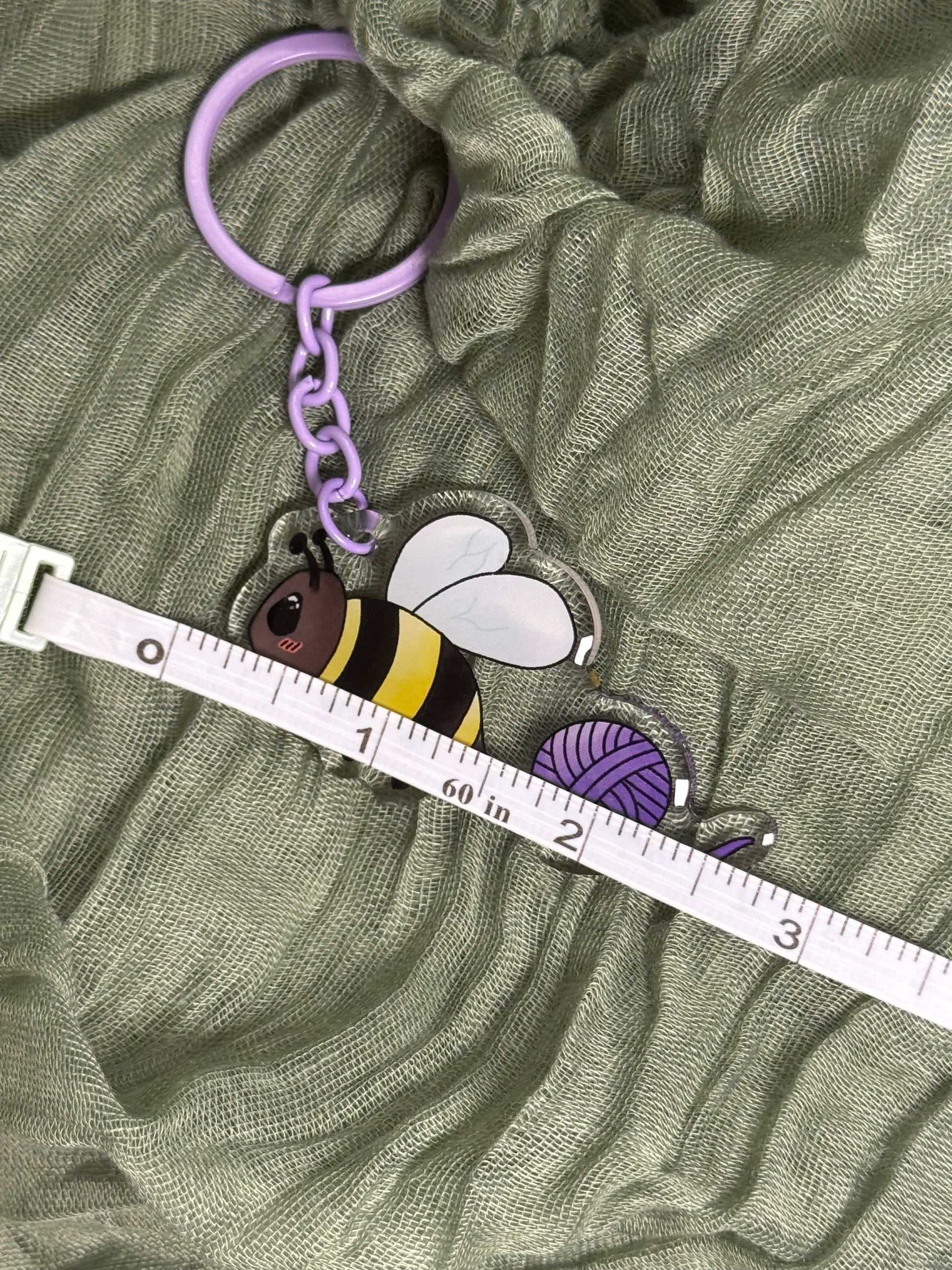 An acrylic keyring with my bumble bee leaving a trail of yarn design. This keyring is on clear acrylic, and is double sided, with front side domed epoxy finish. The charm measures 2.5-3 inches at its largest dimension and the keyring part is a simple purple metal chain and large split ring for easy attachment to your keys, bag, zipper, etc!