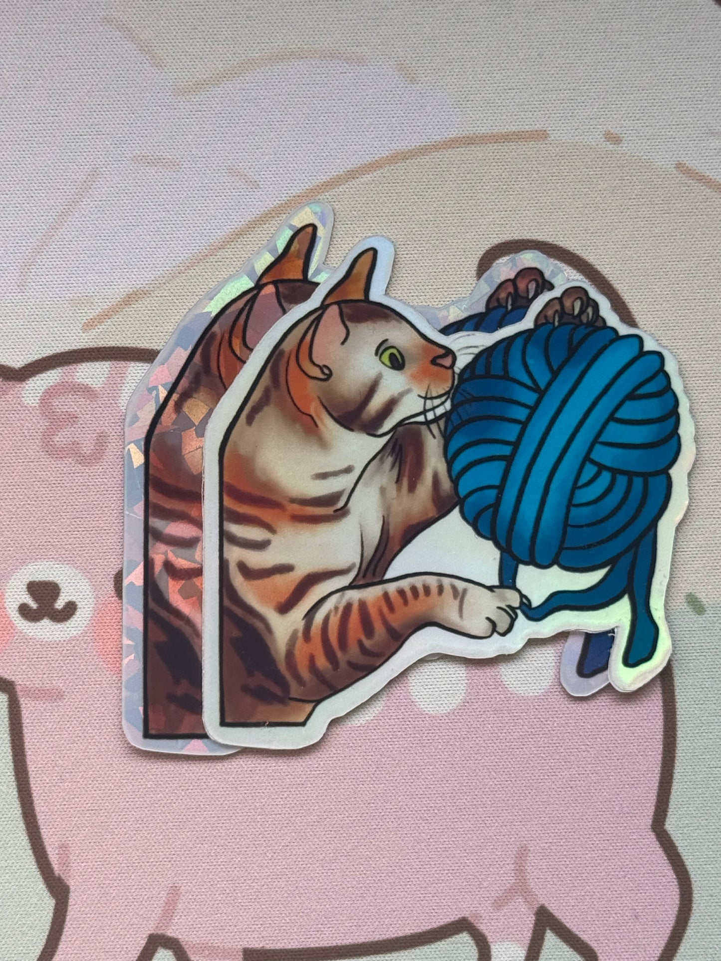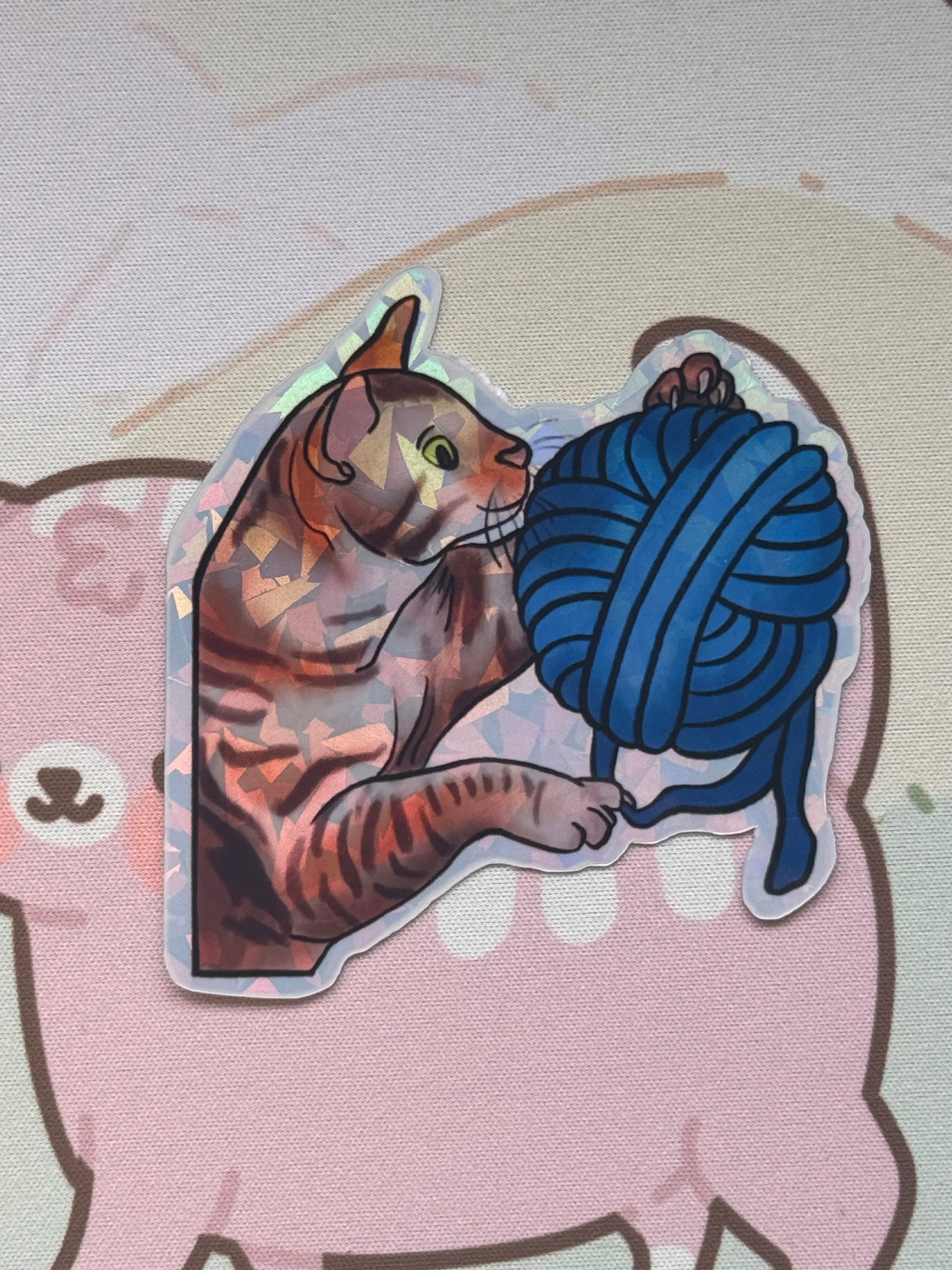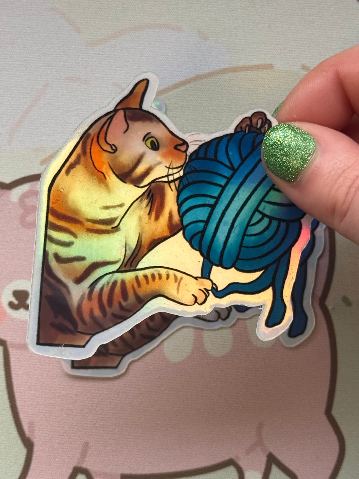 This sticker shows my tabby cat playing with a ball of yarn! It comes in 4 finishes: white glossy, rainbow holographic, cracked glass holographic, or glow in the dark!