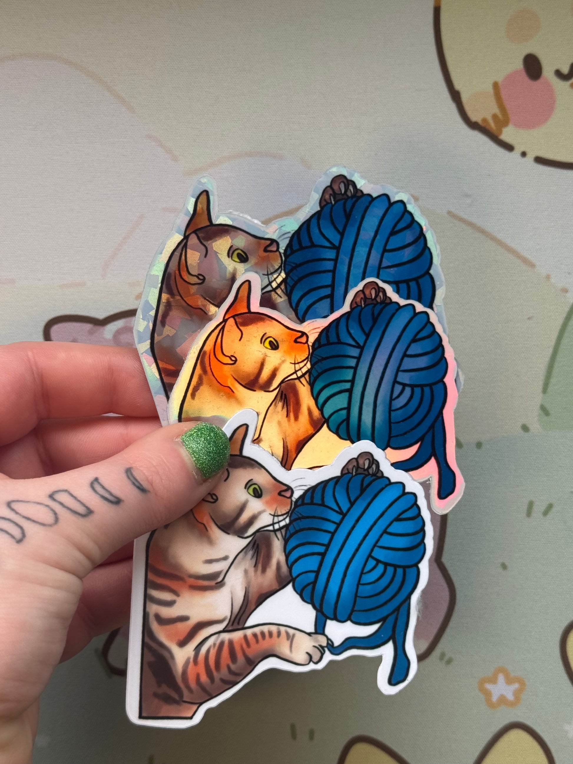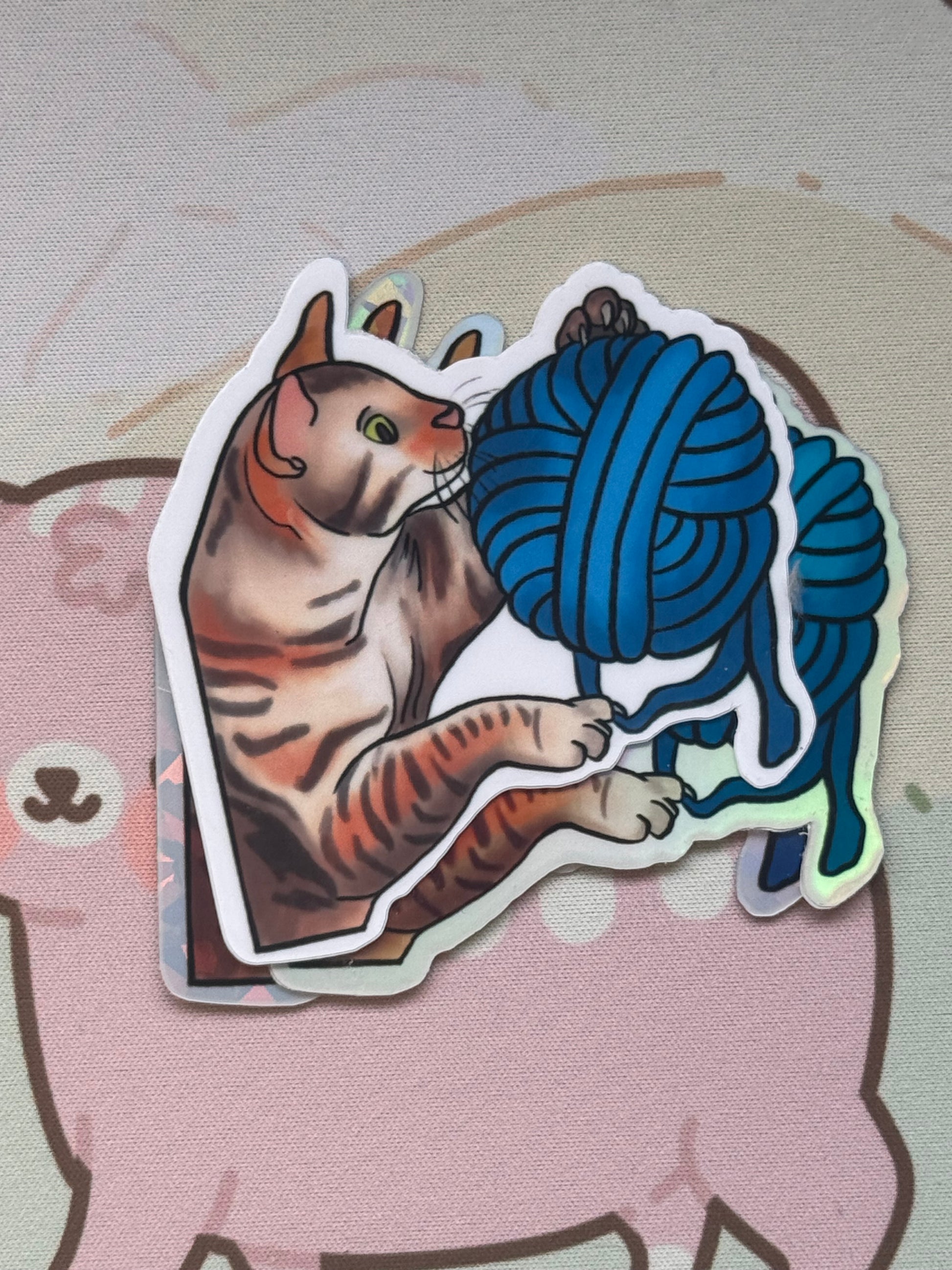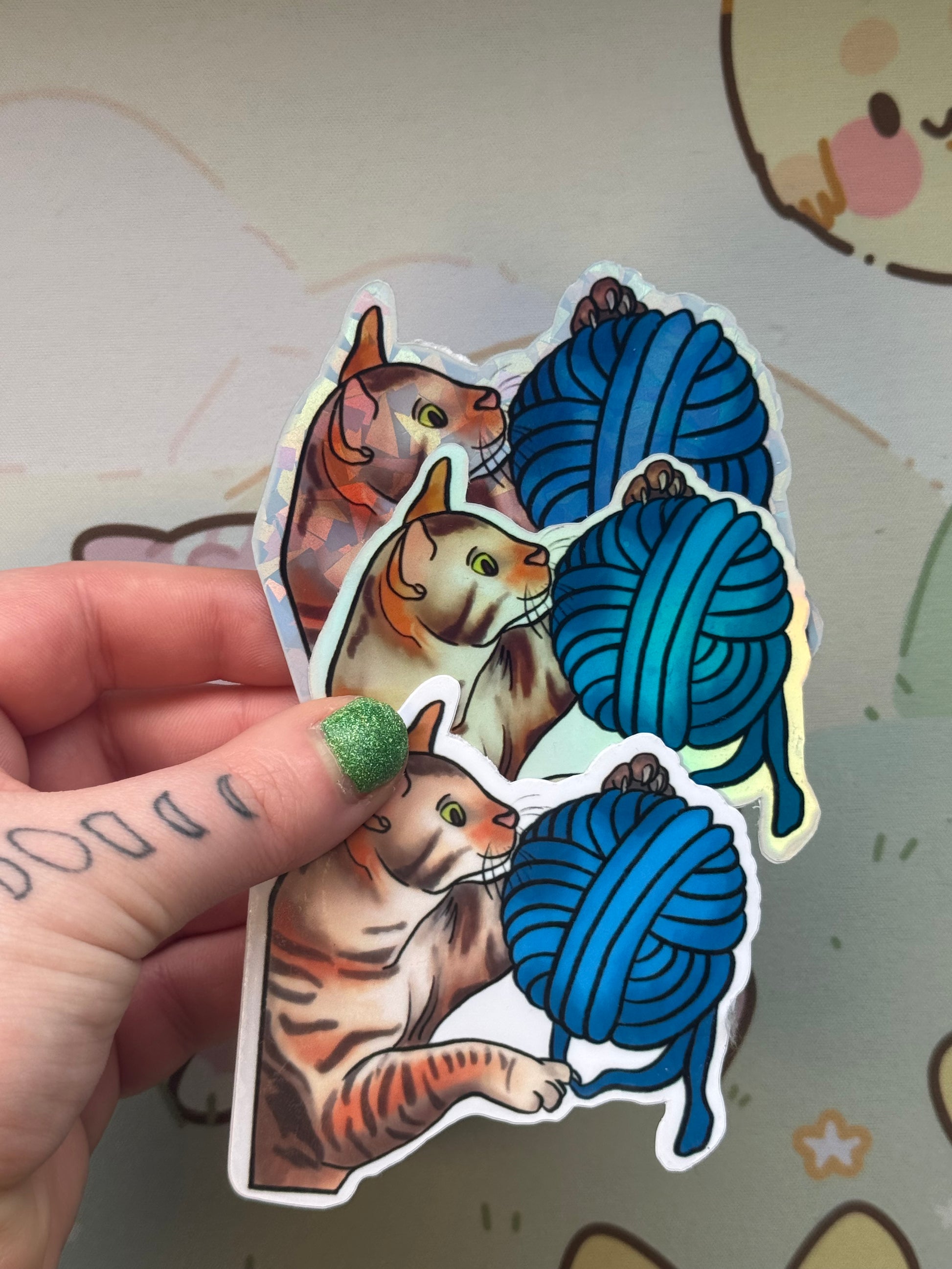 This sticker shows my tabby cat playing with a ball of yarn! It comes in 4 finishes: white glossy, rainbow holographic, cracked glass holographic, or glow in the dark!