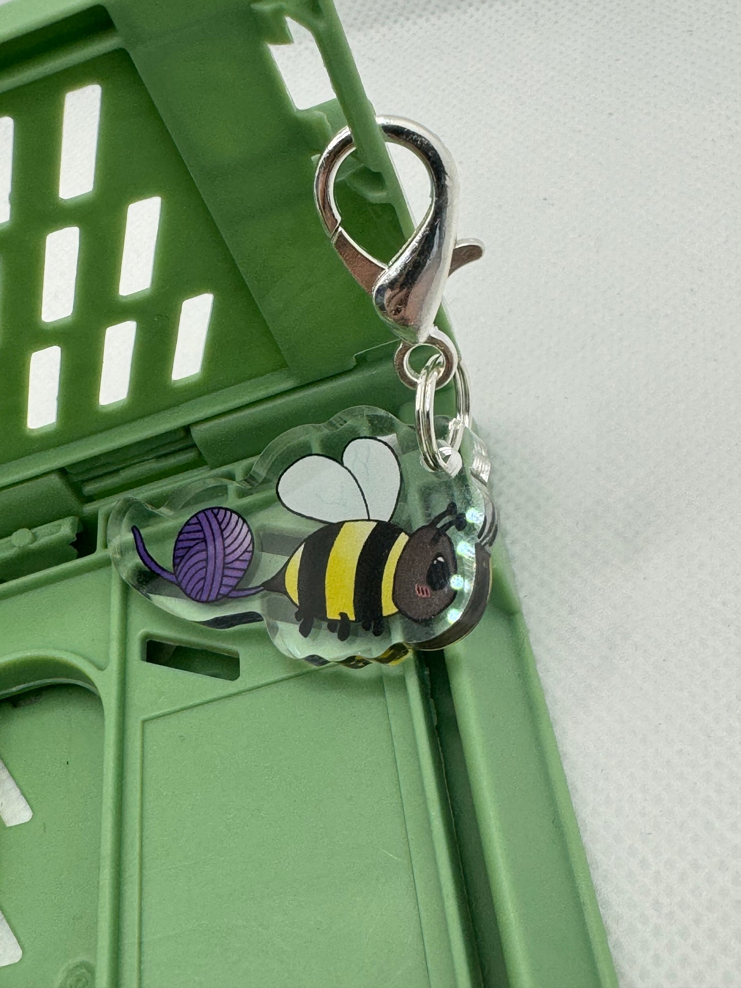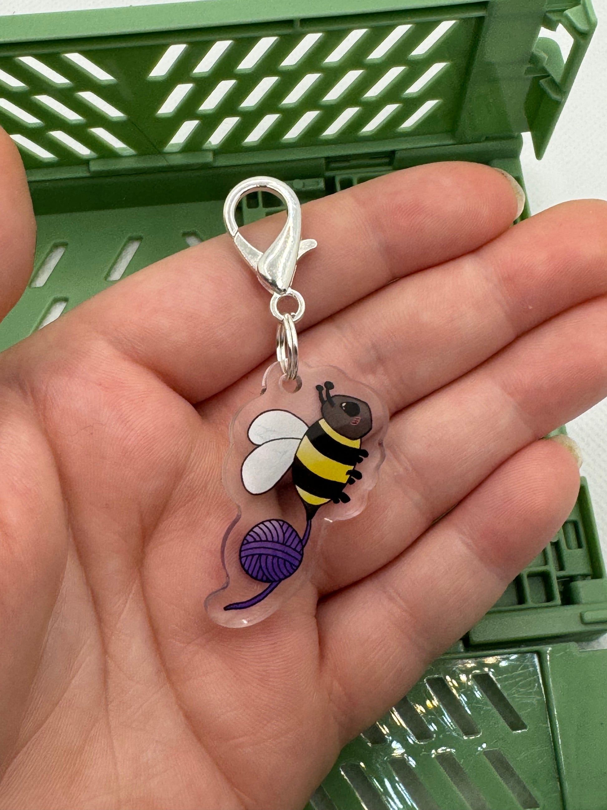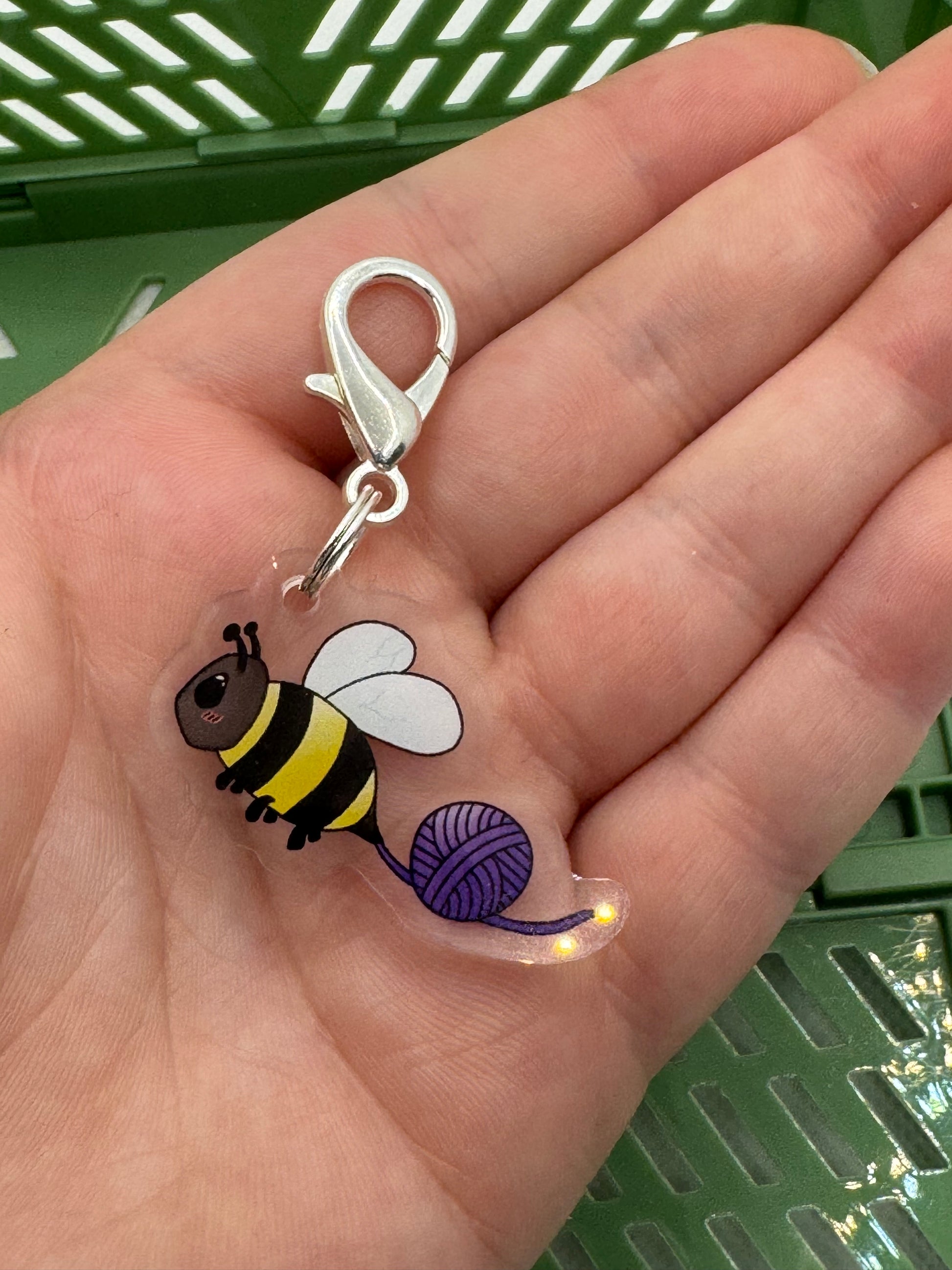 Designed by me (Harper), this stitch marker features a double sided printed 1.5 inch charm with my bumble-bee leaving a trail of yarn artwork. The metal parts are a 8mm split ring (making it easy to change the clasp type!) and a 23mm lobster clasp, which is the perfect size for larger projects with bulky yarn!