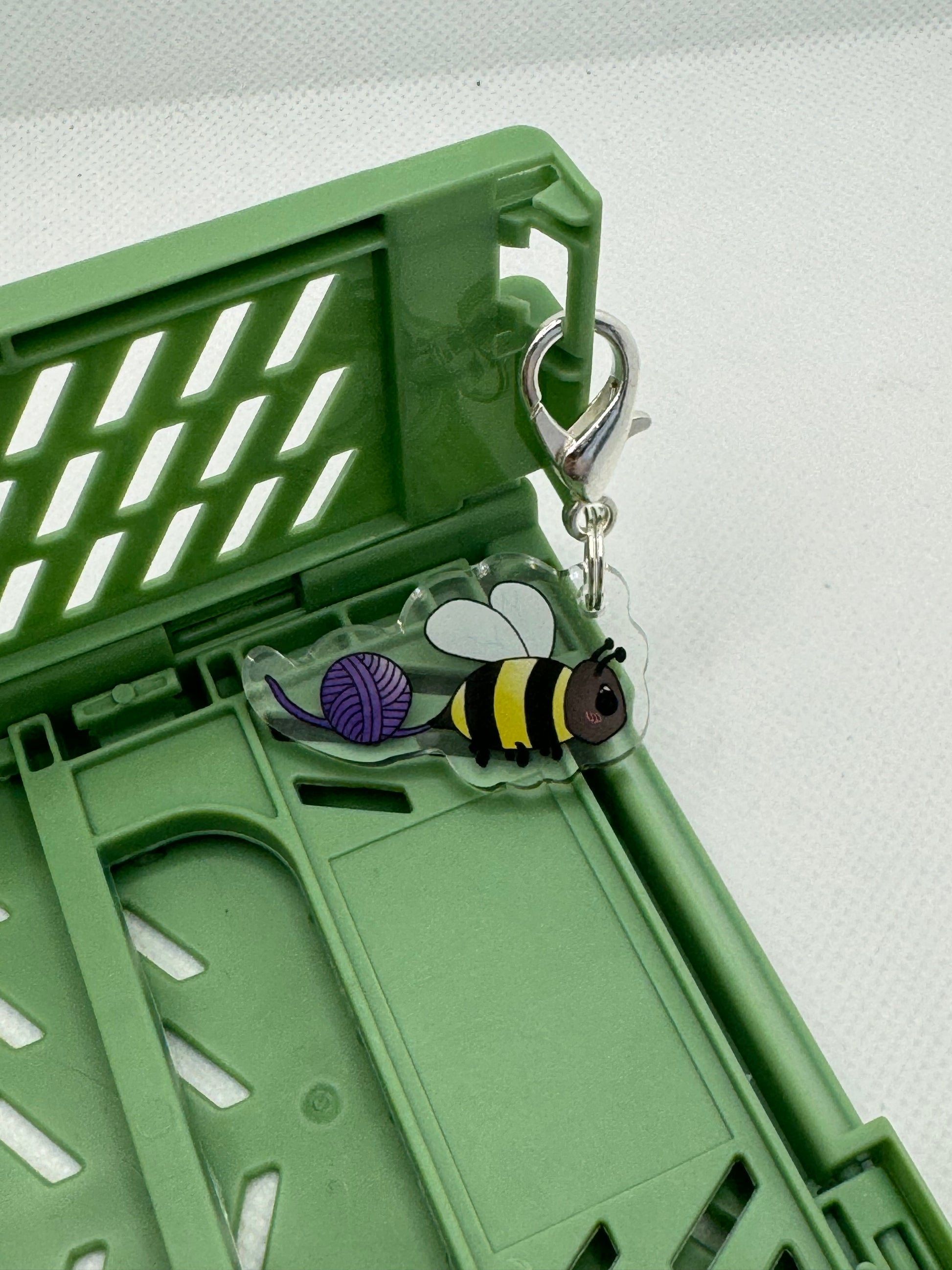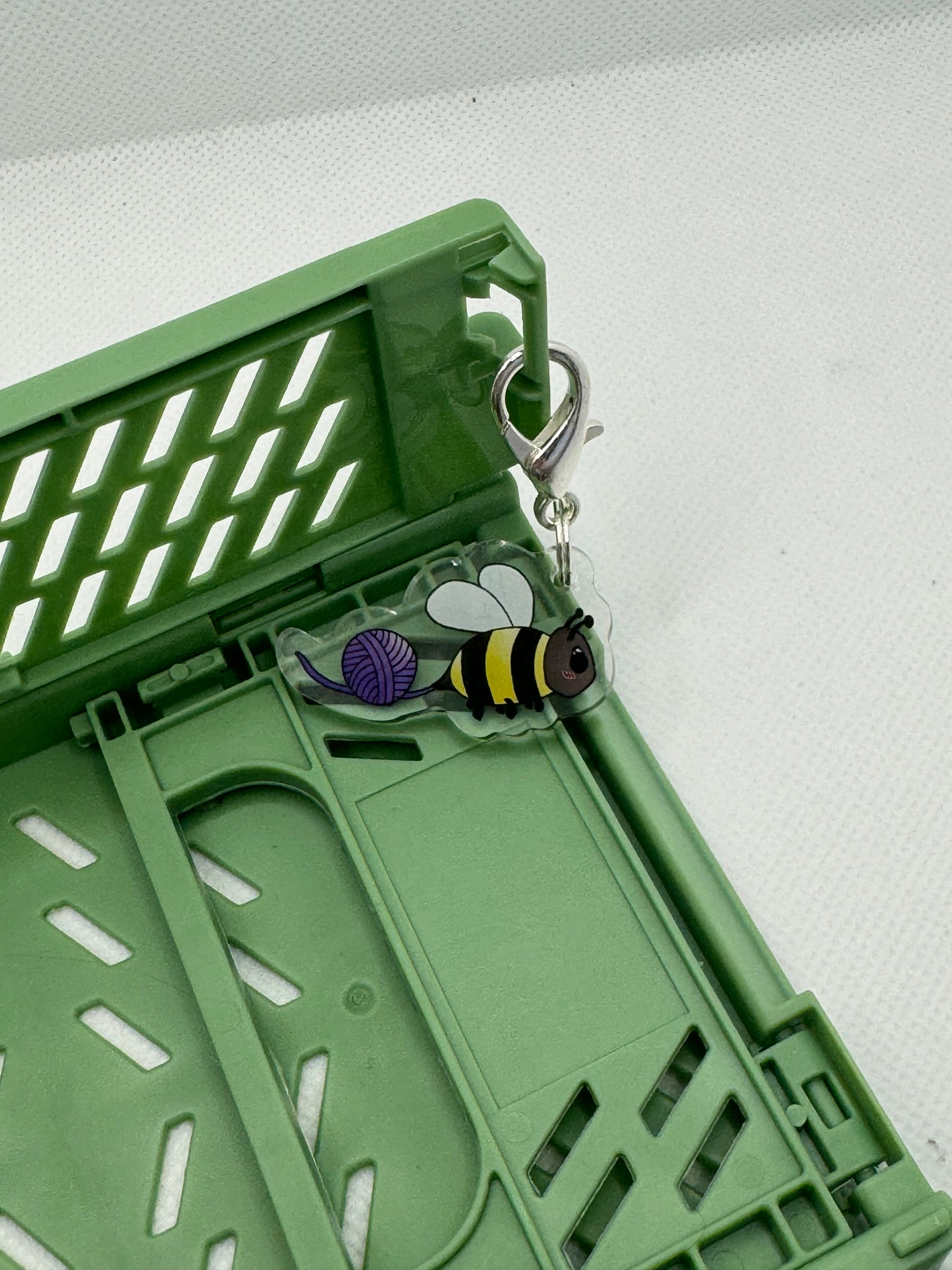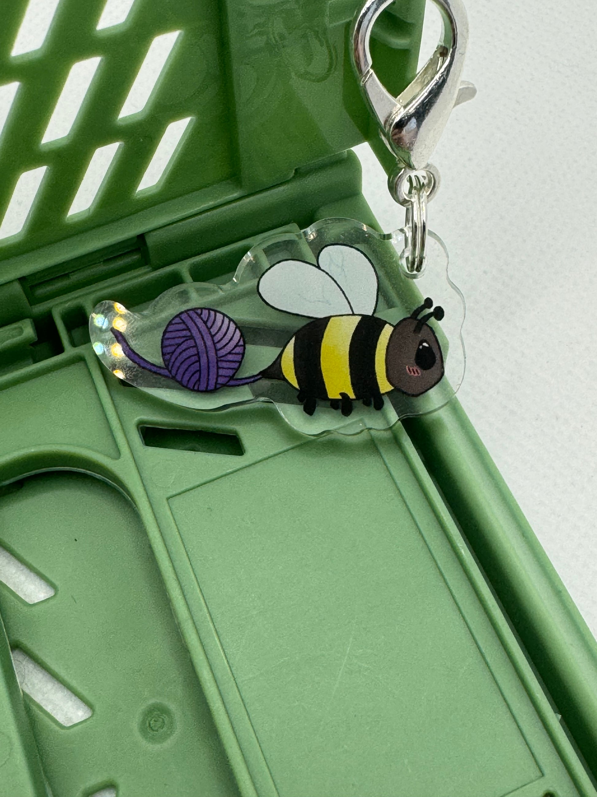 Designed by me (Harper), this stitch marker features a double sided printed 1.5 inch charm with my bumble-bee leaving a trail of yarn artwork. The metal parts are a 8mm split ring (making it easy to change the clasp type!) and a 23mm lobster clasp, which is the perfect size for larger projects with bulky yarn!