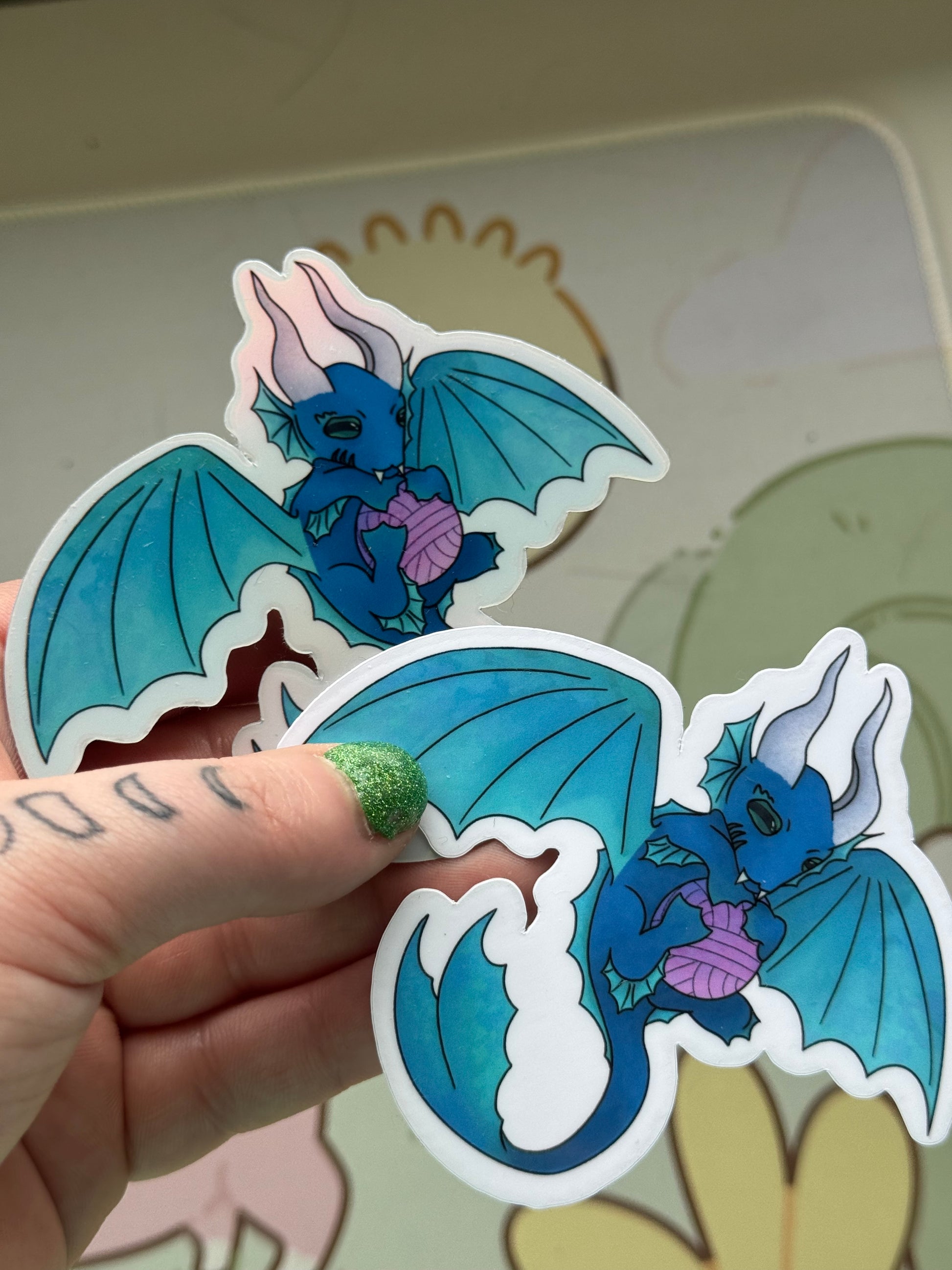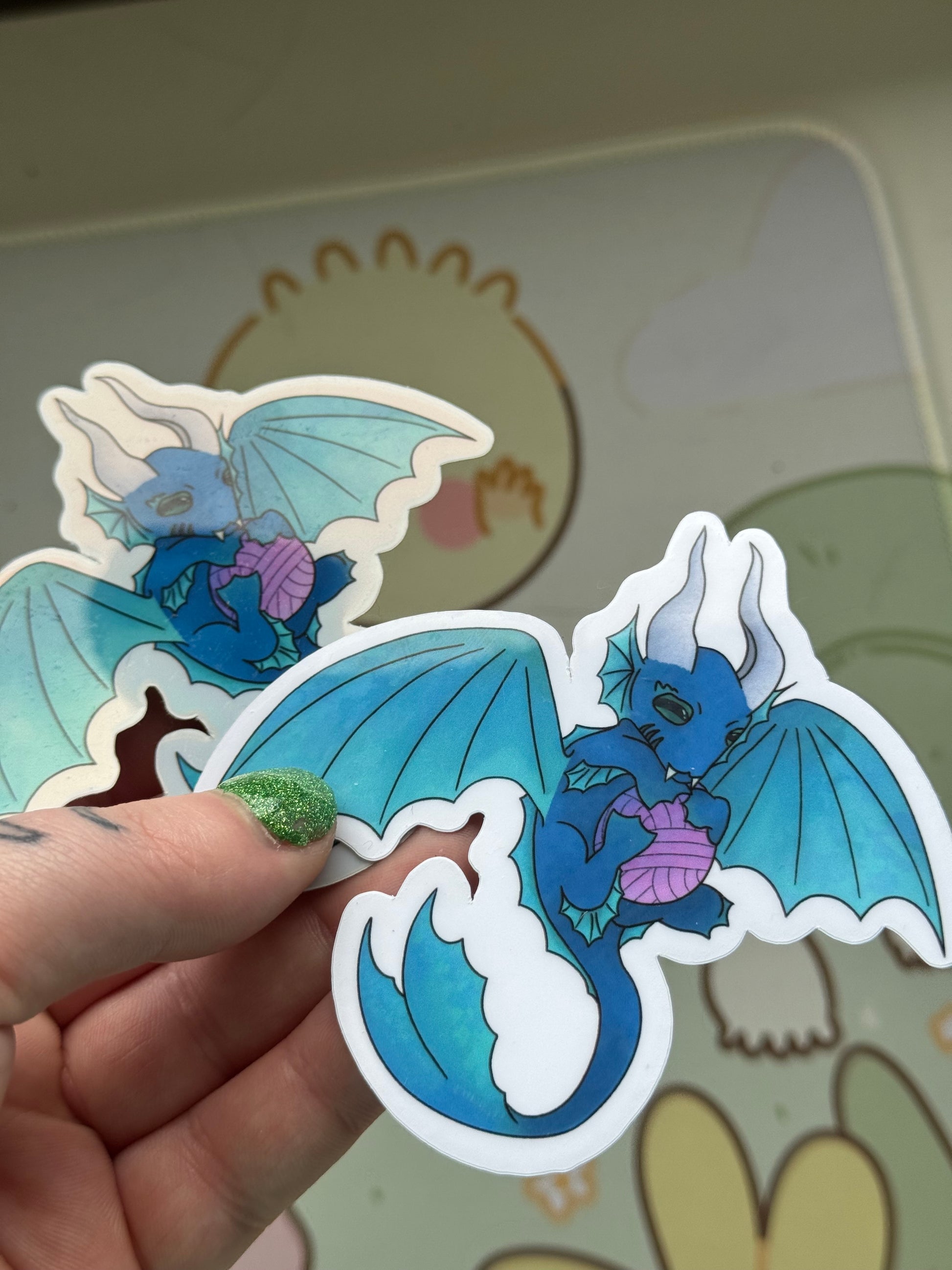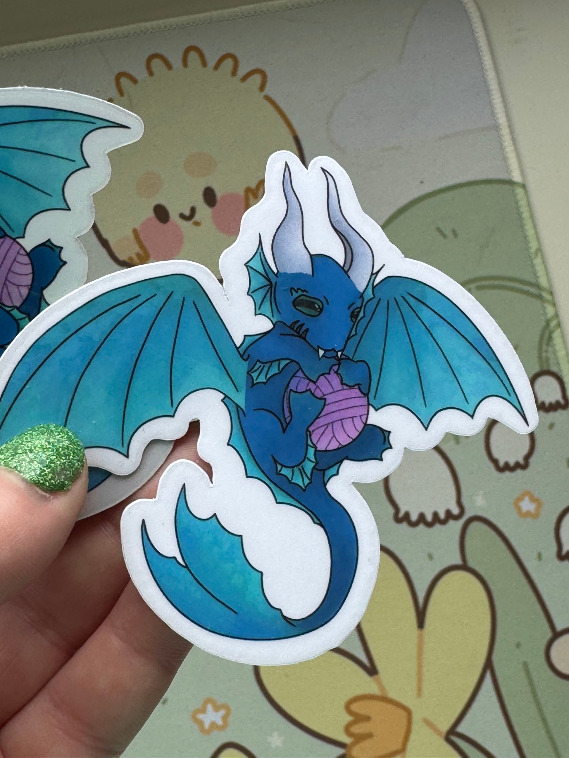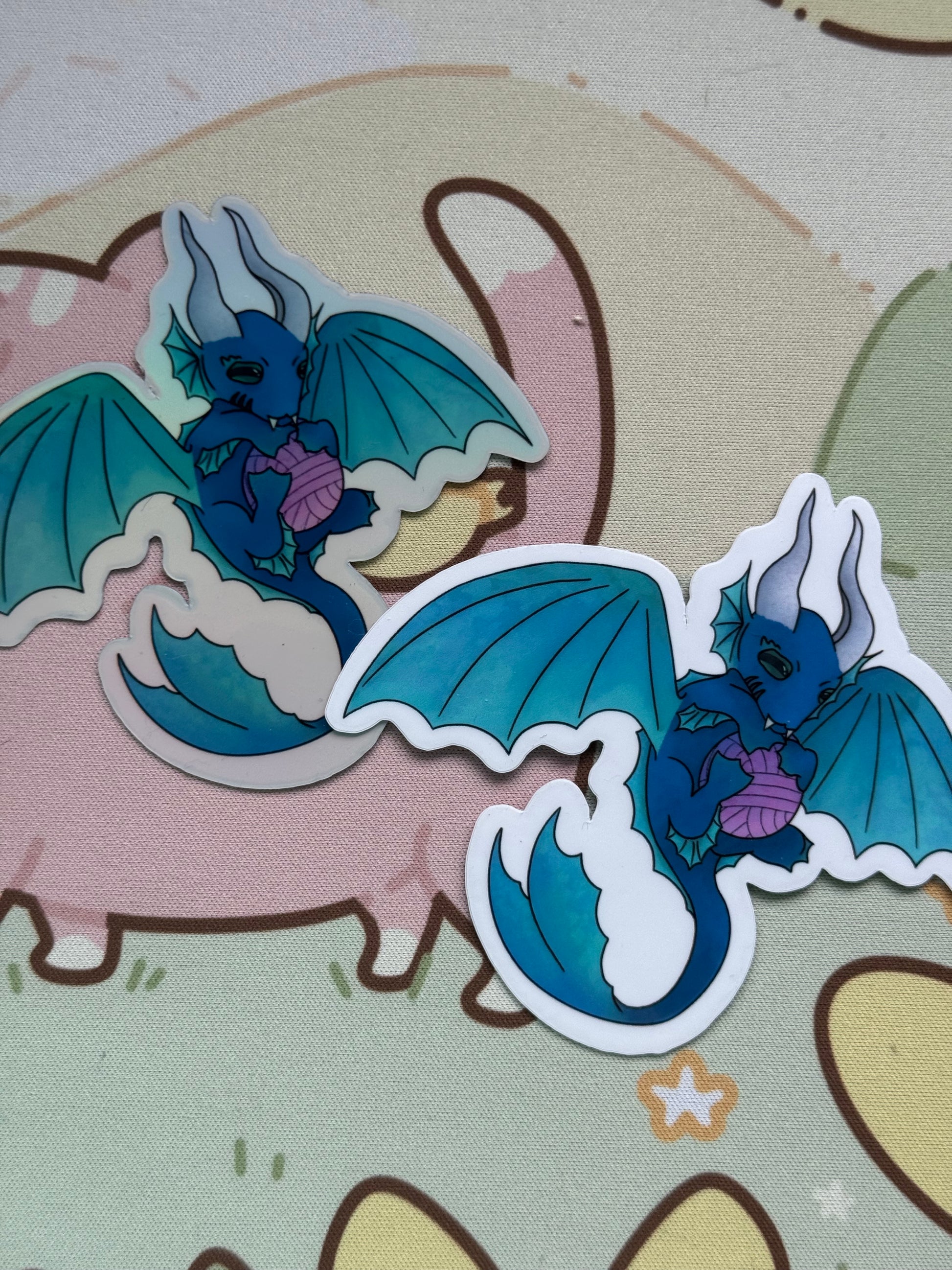 This sticker shows my blue/ aqua, aquatic, "mermaid" style dragon holding a ball of yarn! It comes in 3 finishes: white glossy, rainbow holographic, or cracked glass holographic!