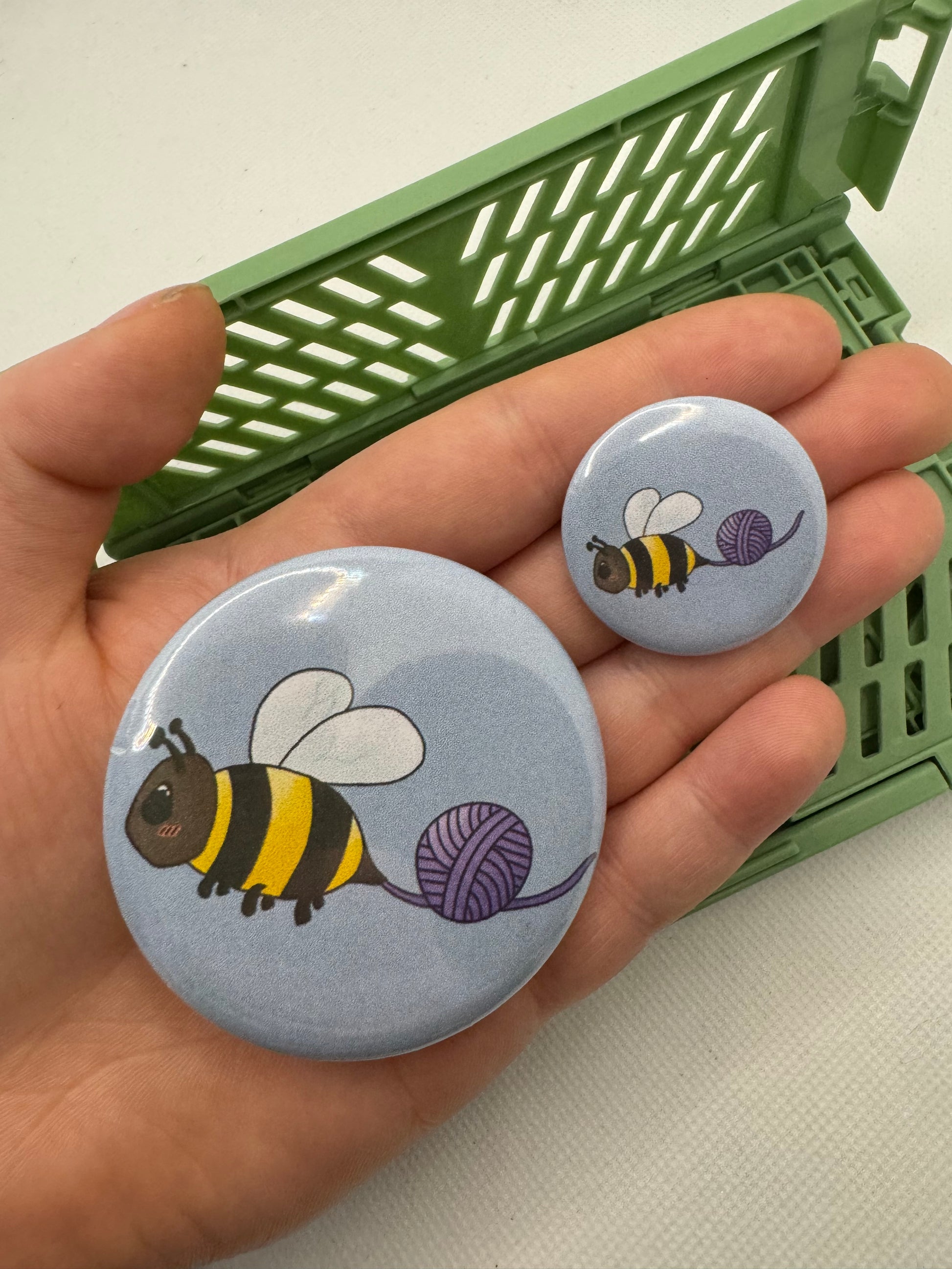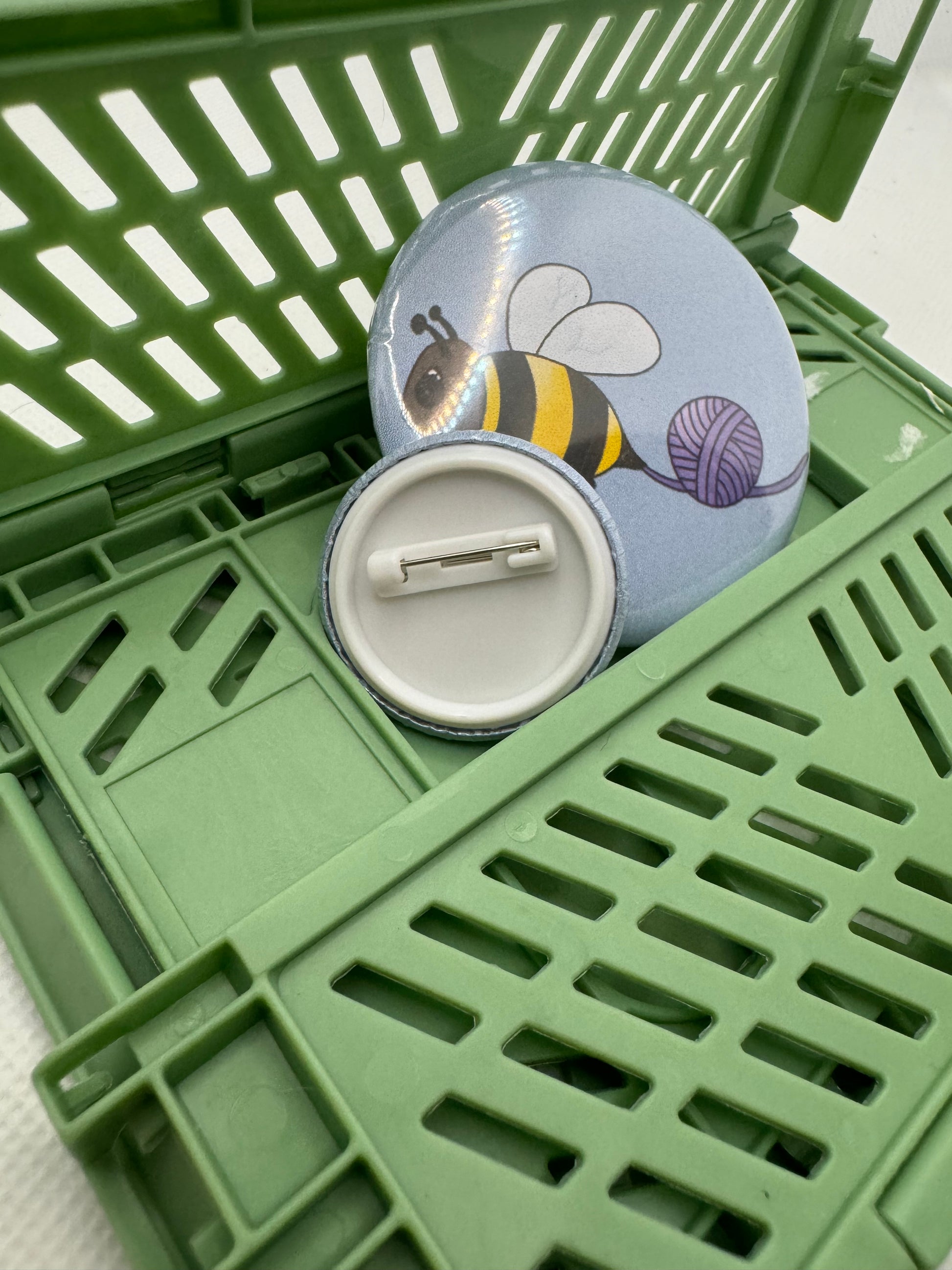 Button badge featuring my bumble bee leaving a trail of yarn on a light blue background.