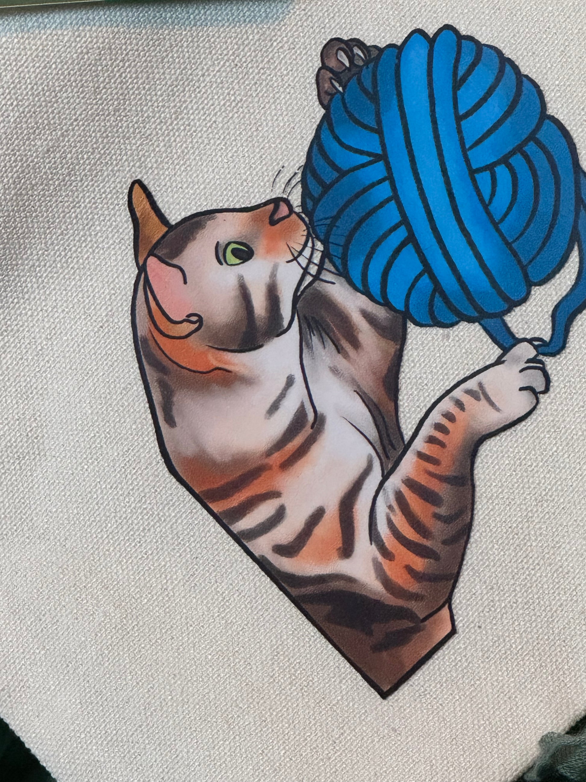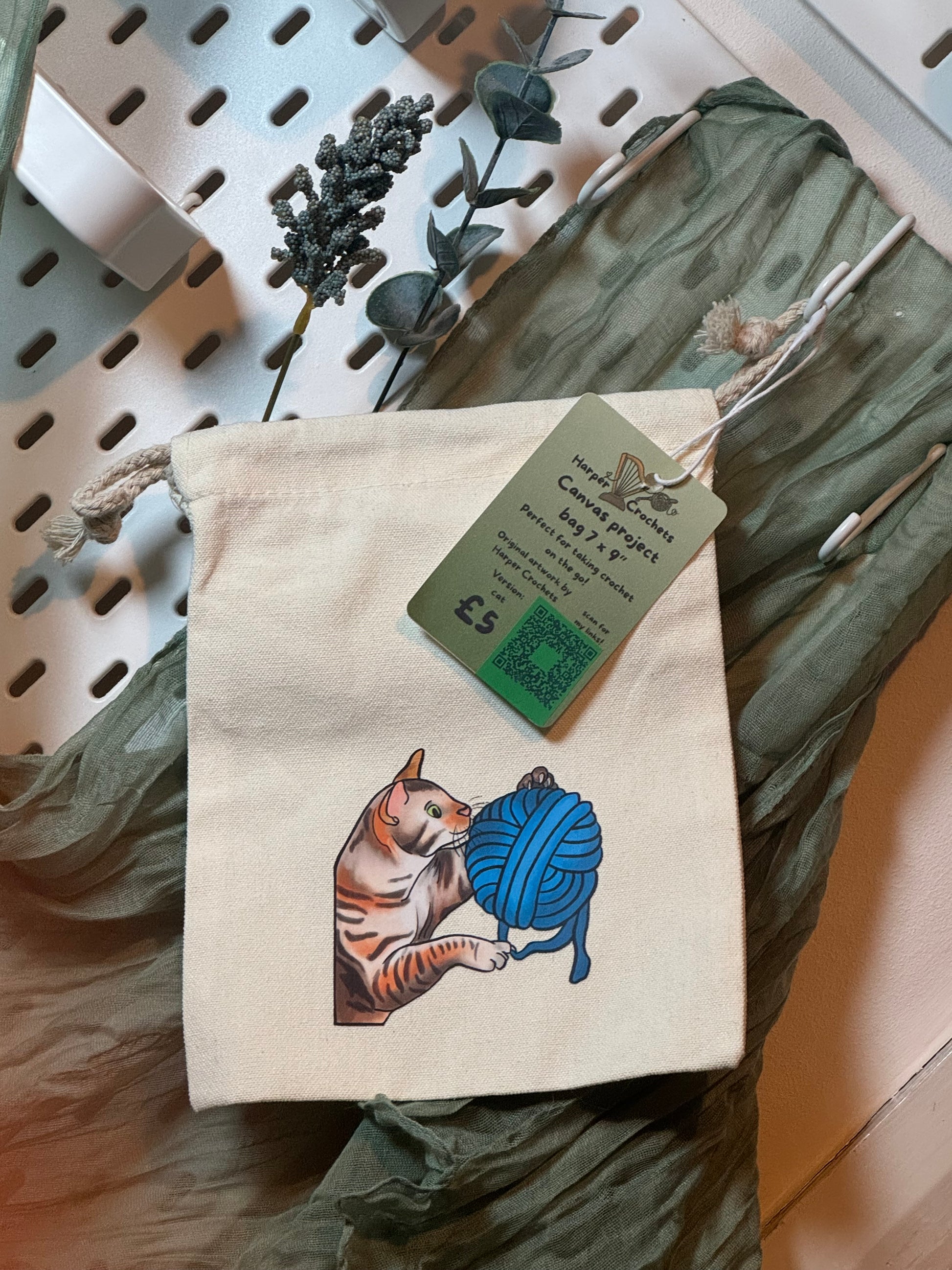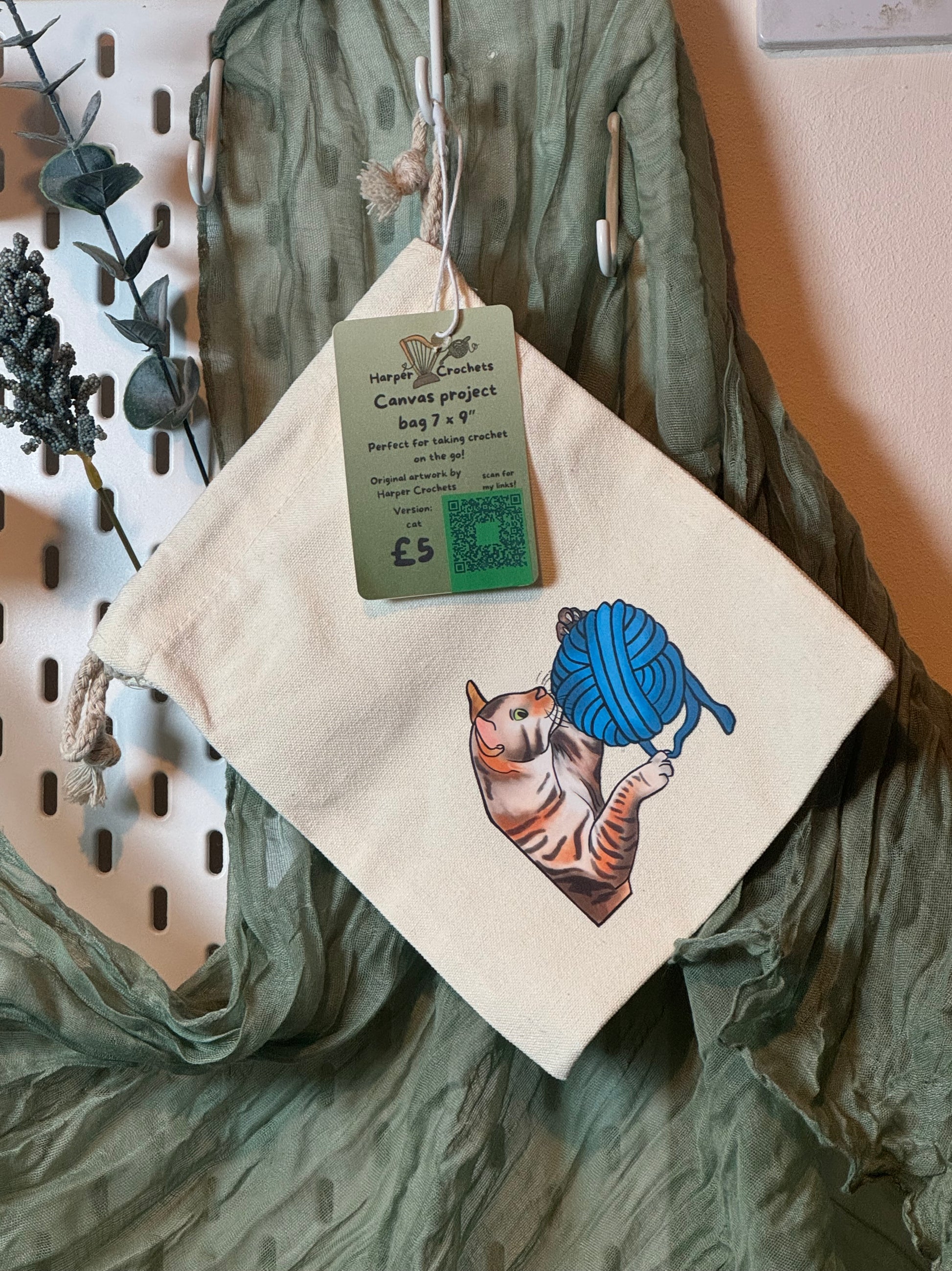 Project bag featuring my tabby cat playing with a ball of yarn design.