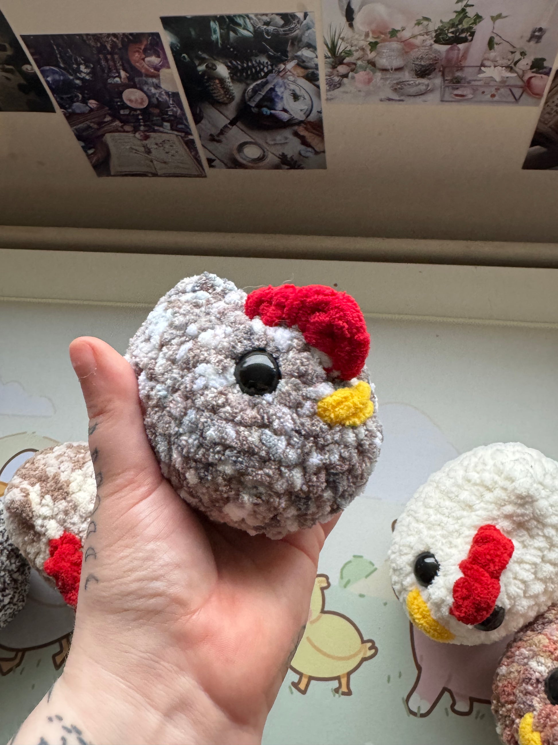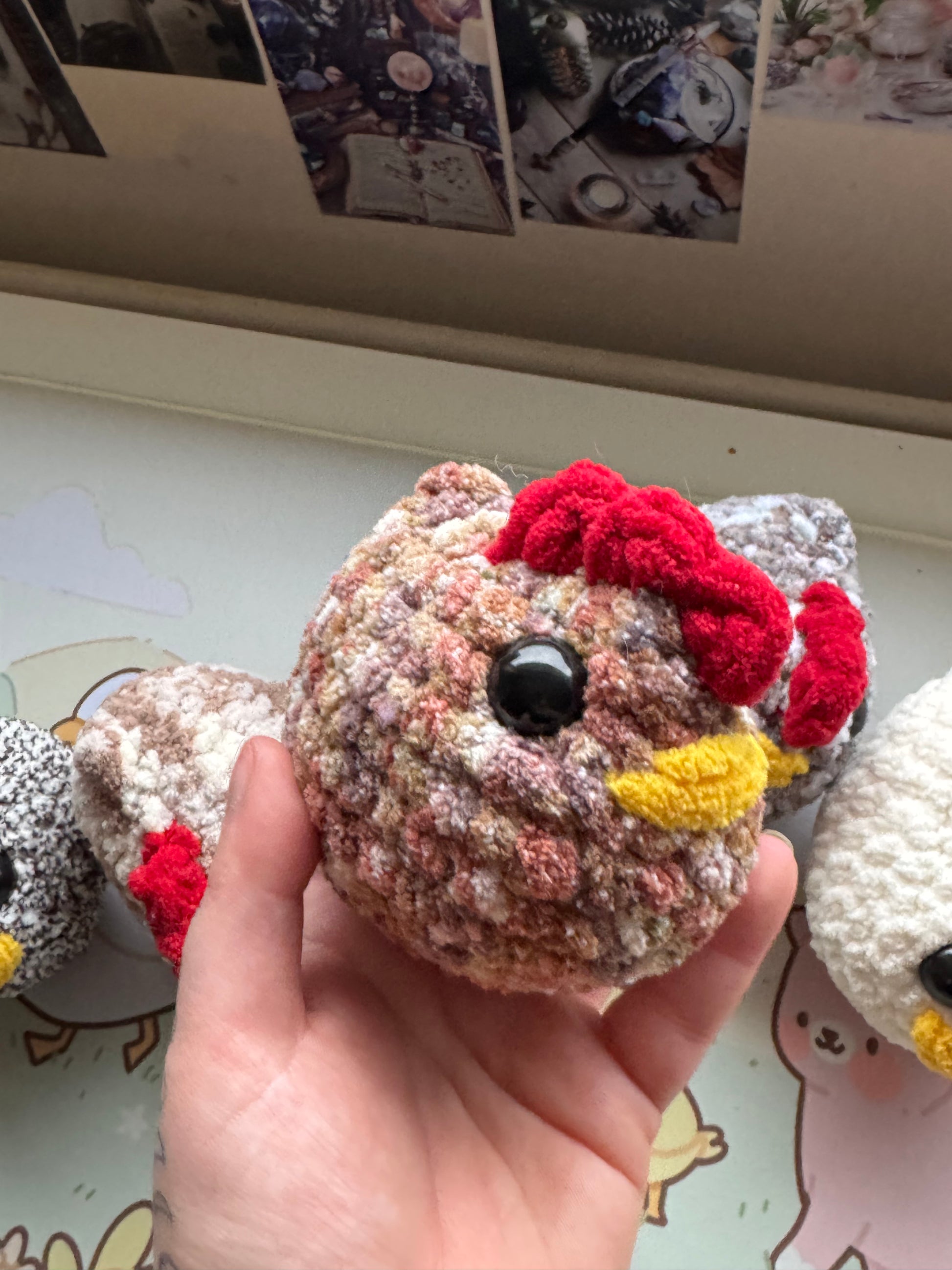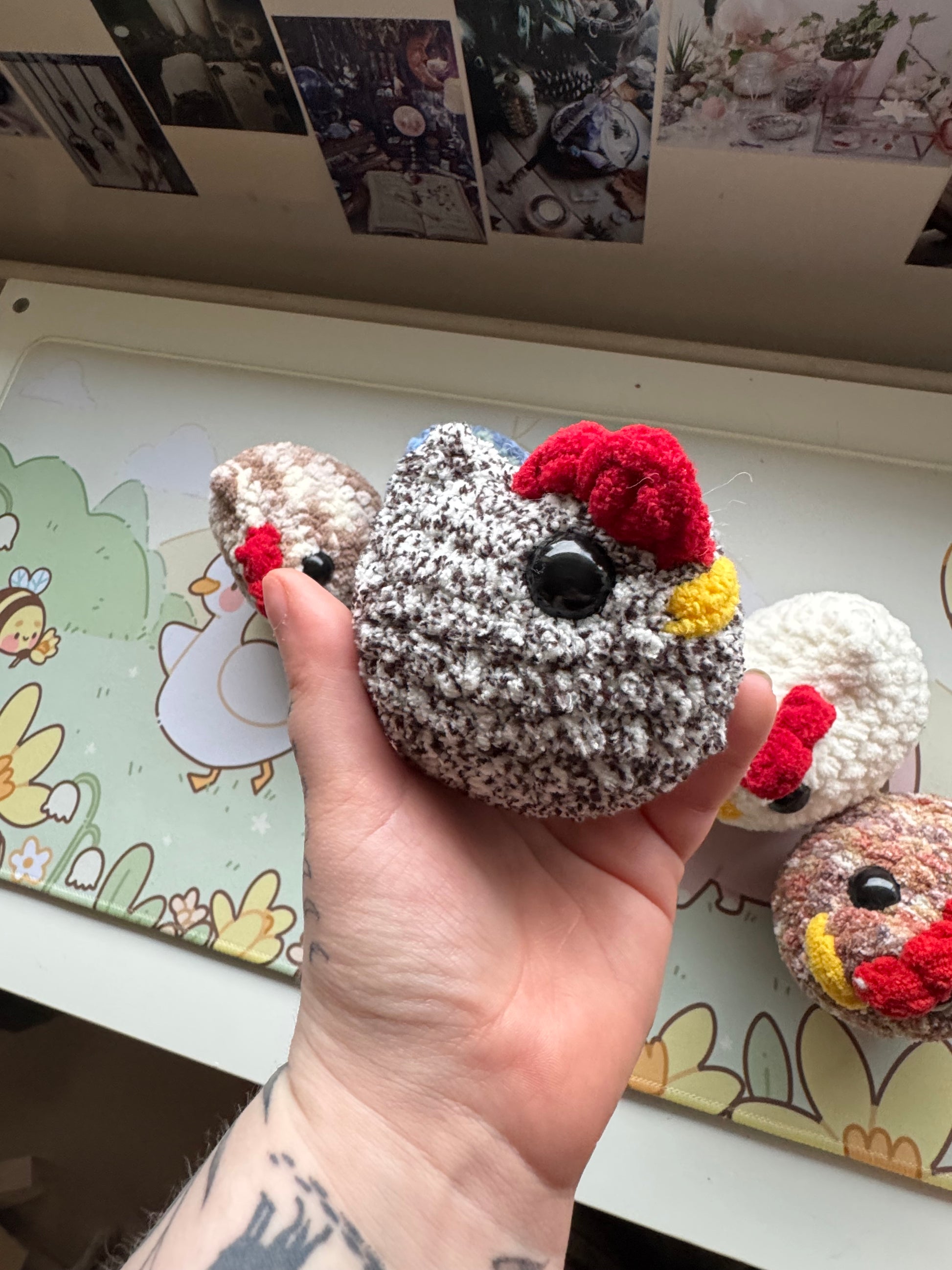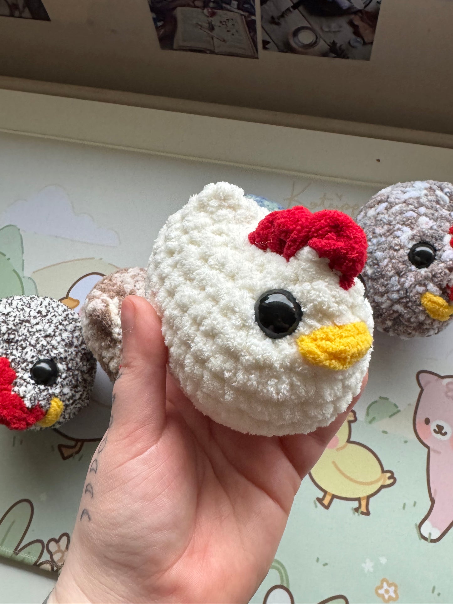 These chickens will range slightly in size due to tension while crocheting and different yarn skeins being slightly different, but I can assure you they're all super soft and cute! Please use the photos with my hands in as a size gauge. I like to stuff my plushies firmly so they last longer under cuddling conditions, since stuffing breaks down over time when cuddled a lot! They may seem firm at first but they've still got good squish-ability and will only get squishier!