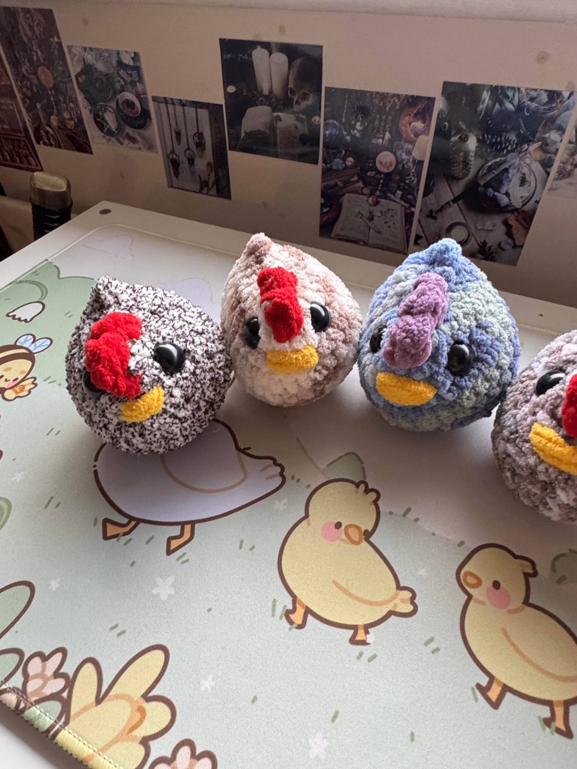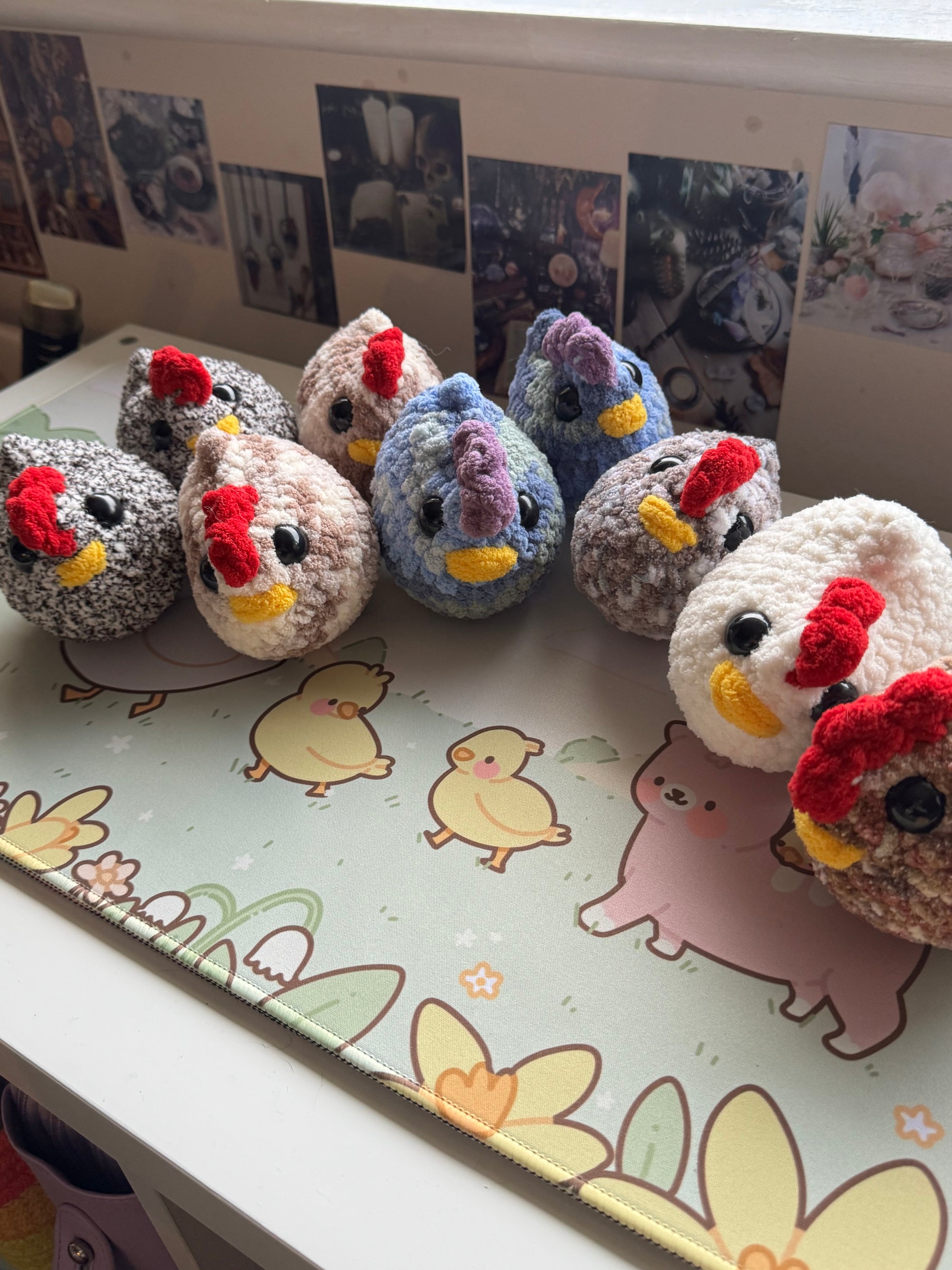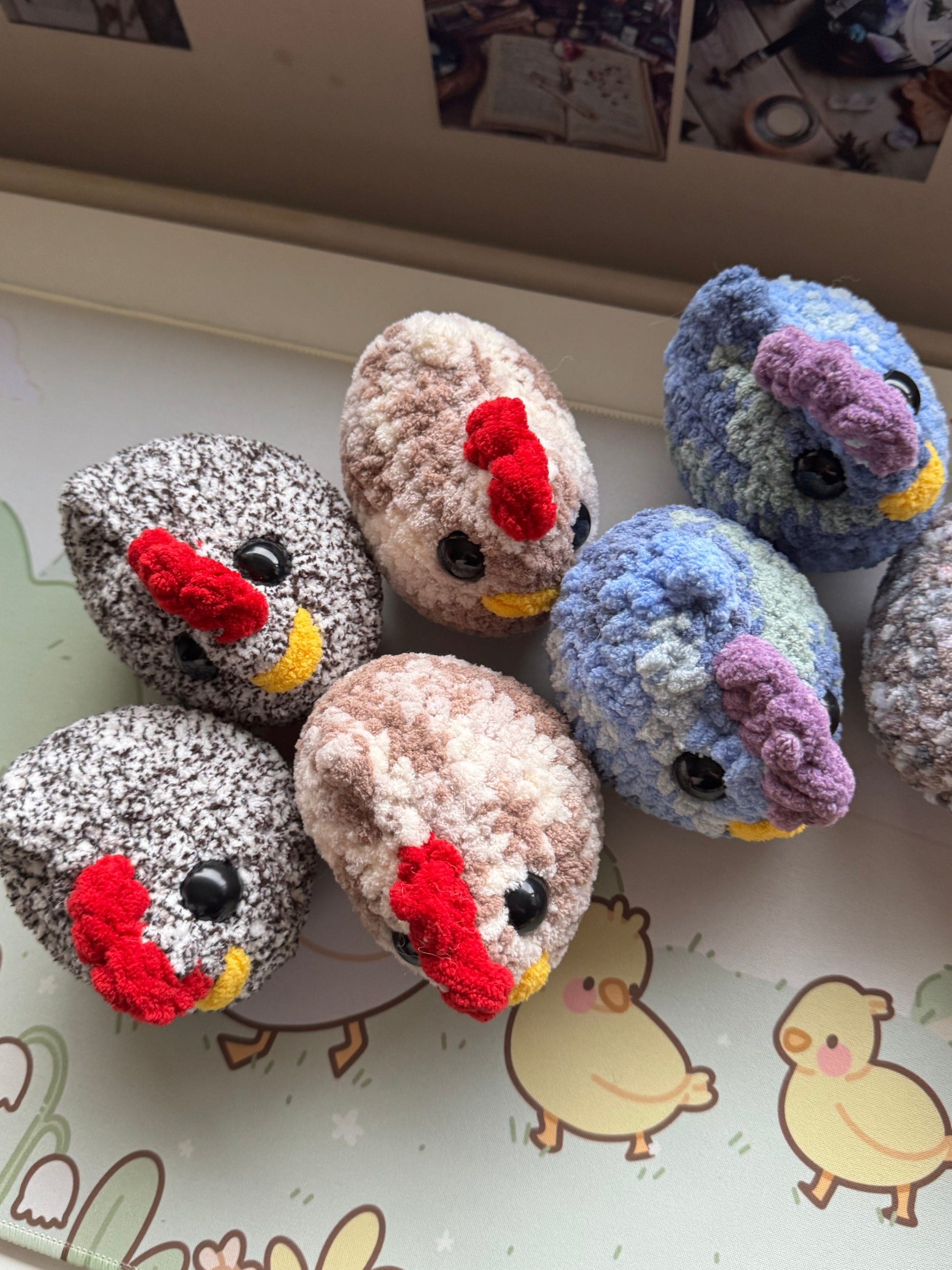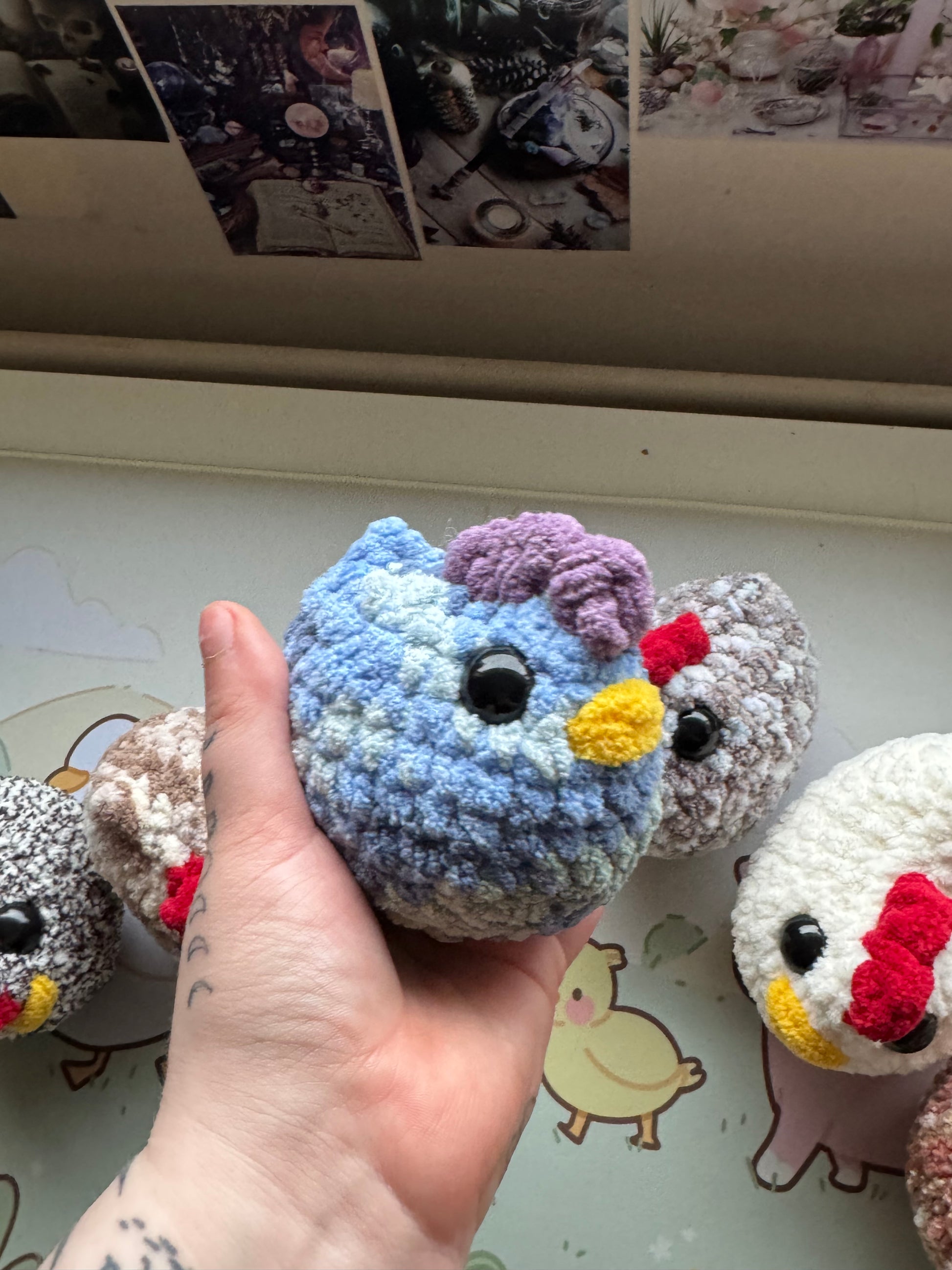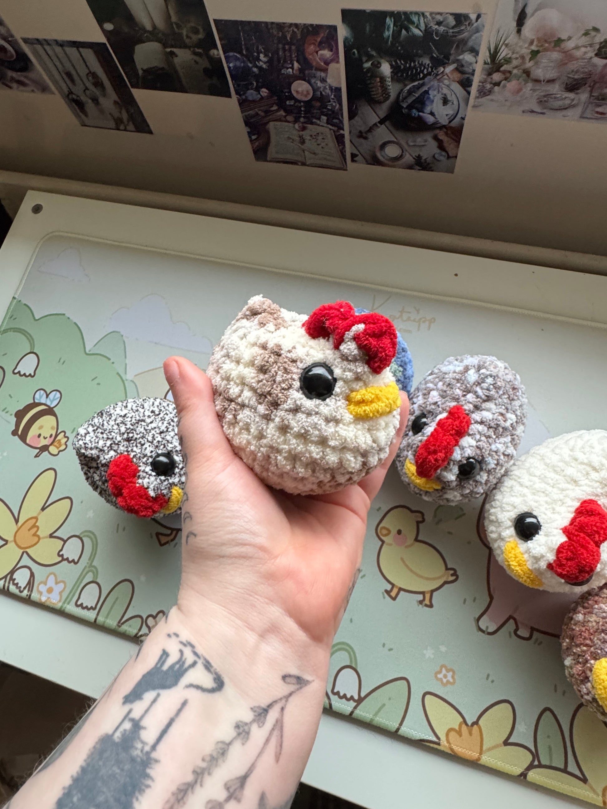 These chickens will range slightly in size due to tension while crocheting and different yarn skeins being slightly different, but I can assure you they're all super soft and cute! Please use the photos with my hands in as a size gauge. I like to stuff my plushies firmly so they last longer under cuddling conditions, since stuffing breaks down over time when cuddled a lot! They may seem firm at first but they've still got good squish-ability and will only get squishier!