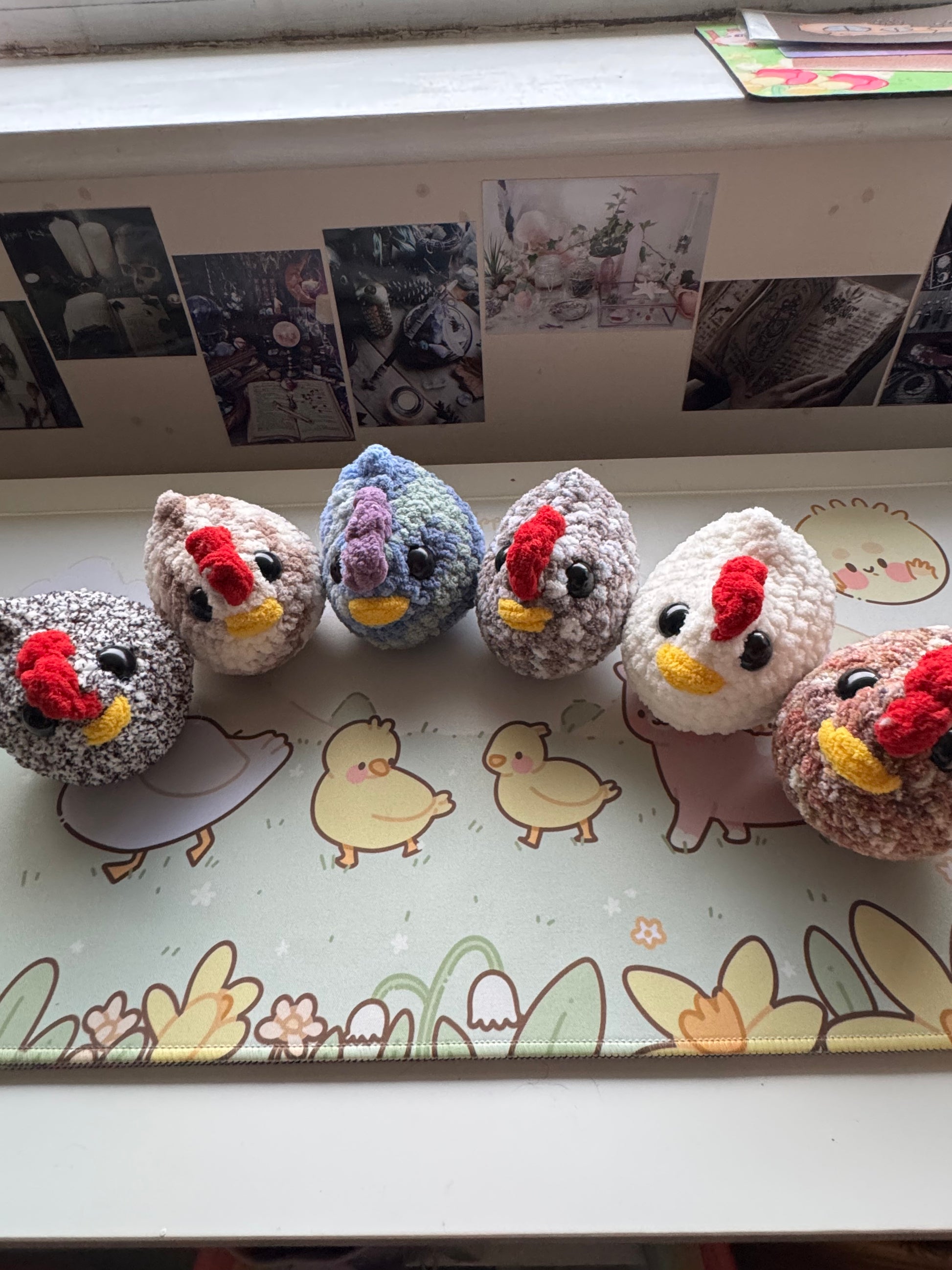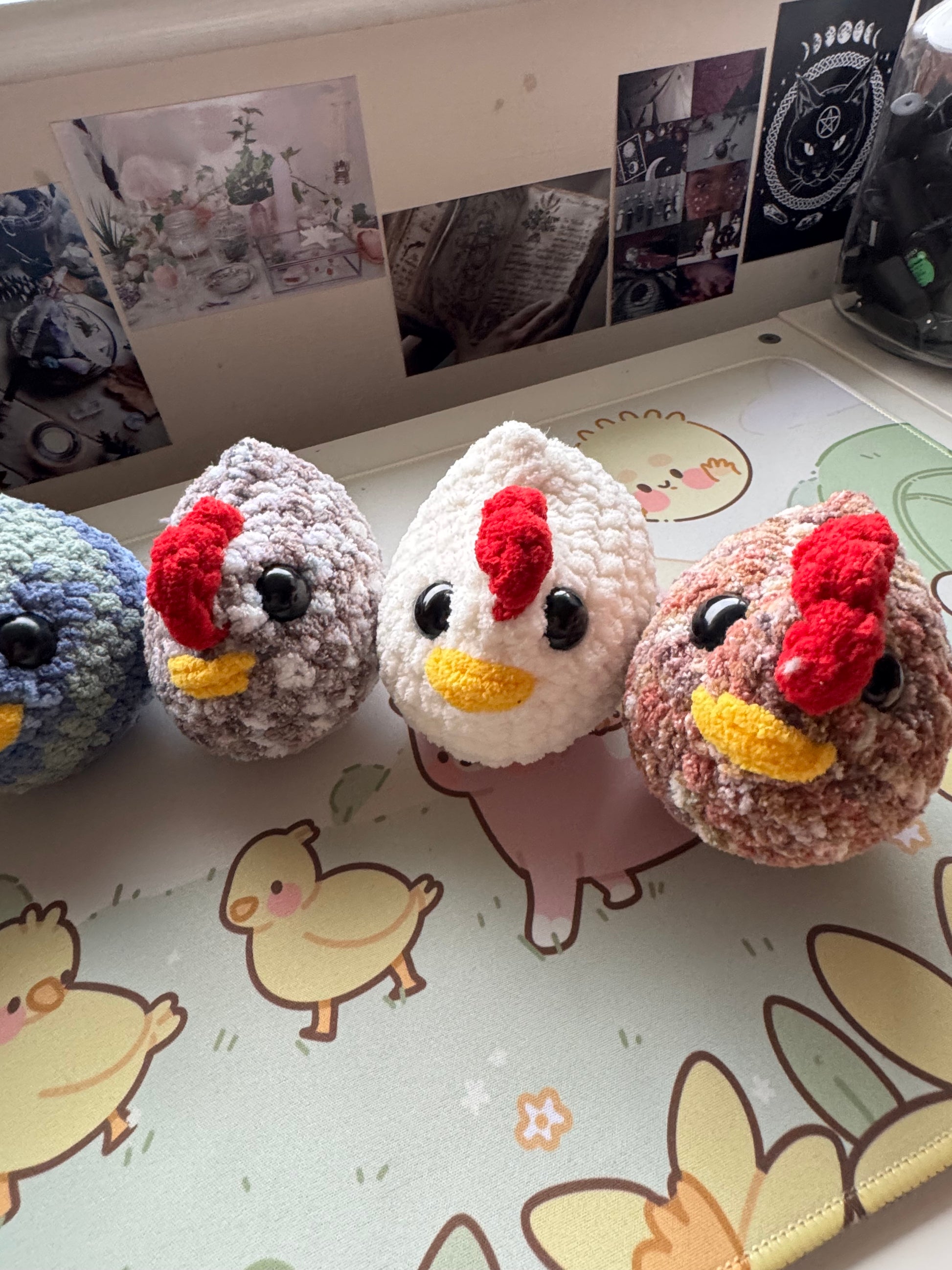 Made to order crochet chicken plushies for adoption, made by me, Harper! There are several feather patterns to choose from, so you can be clucking when you adopt the right chicken for you!
