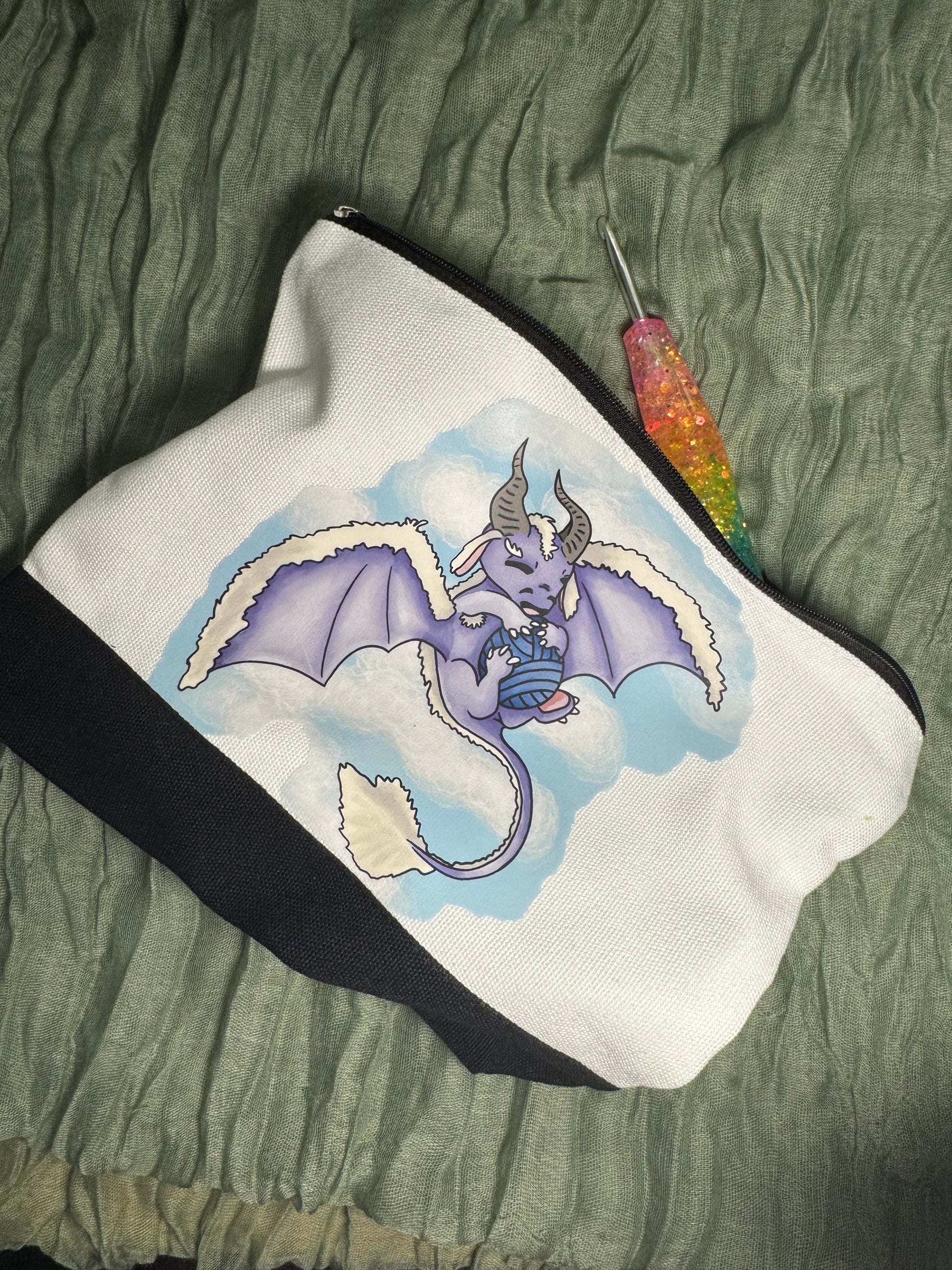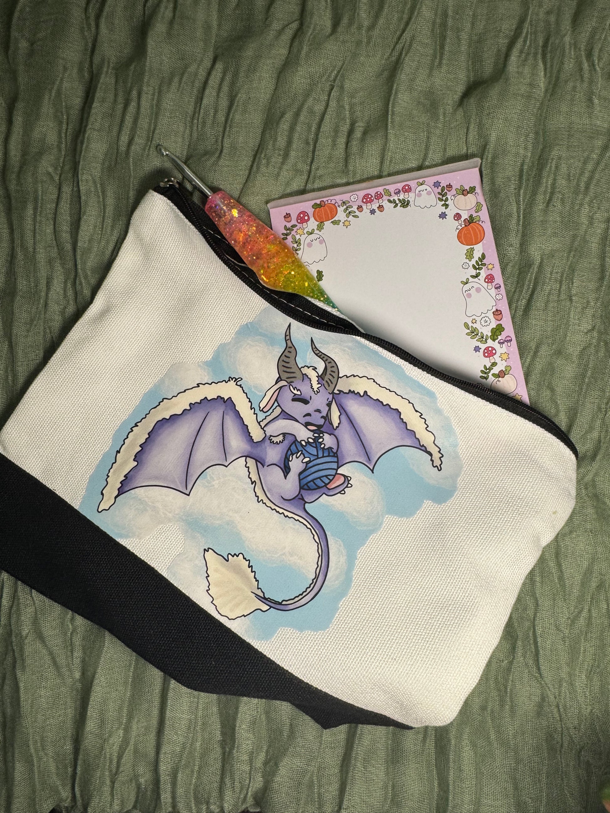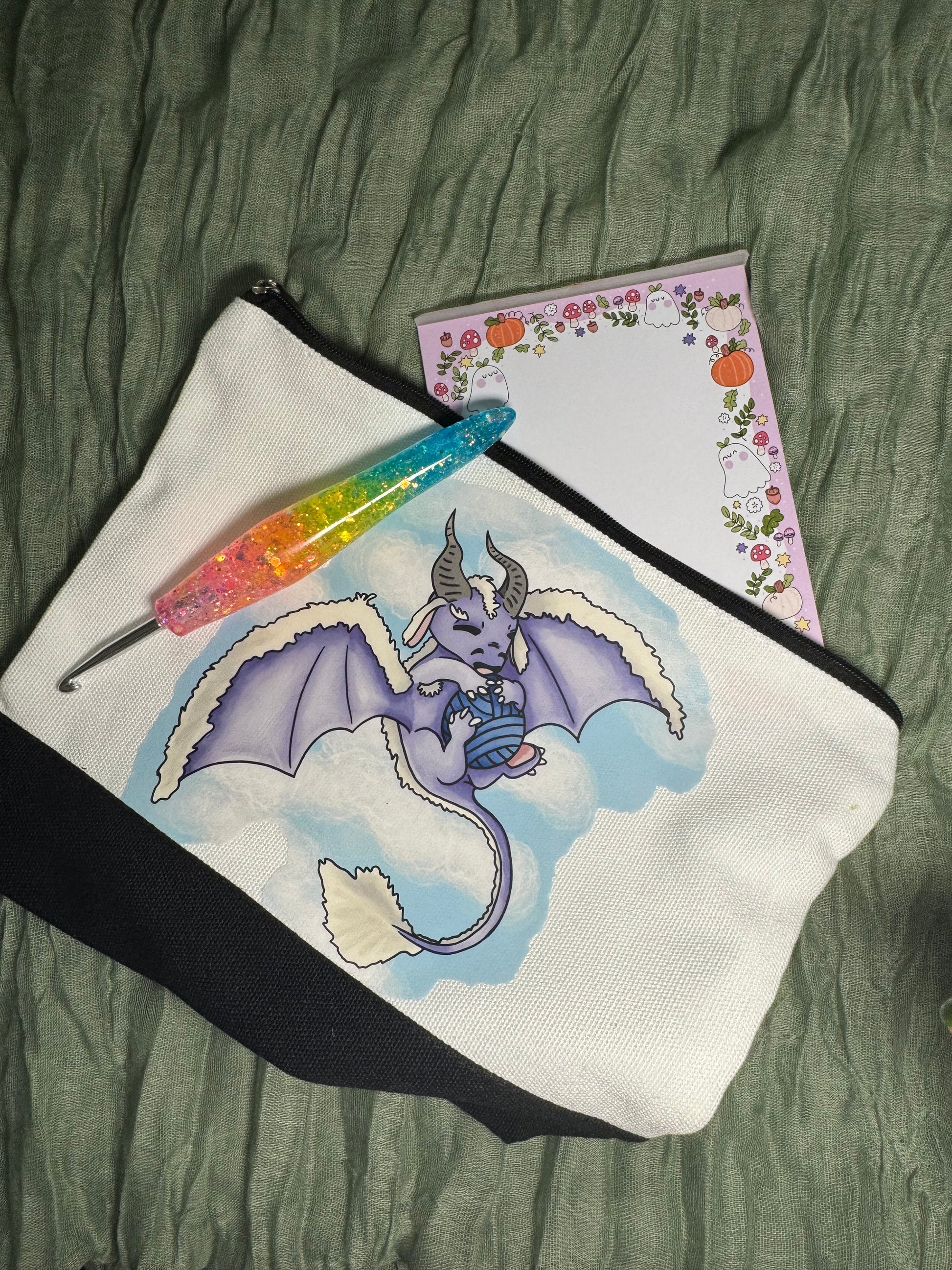 Featuring my design of a purple dragon playing with a ball of yarn in the sky! Perfect for your hooks and notions, this crochet hook case measures 22cm long, 15cm tall, and has a depth of 6cm thanks to a gusset at the bottom, which expands as you fill the case! It has a sturdy zip closure for keeping all your hooks and stitch markers secure, instead of spilling out all over your bag!
