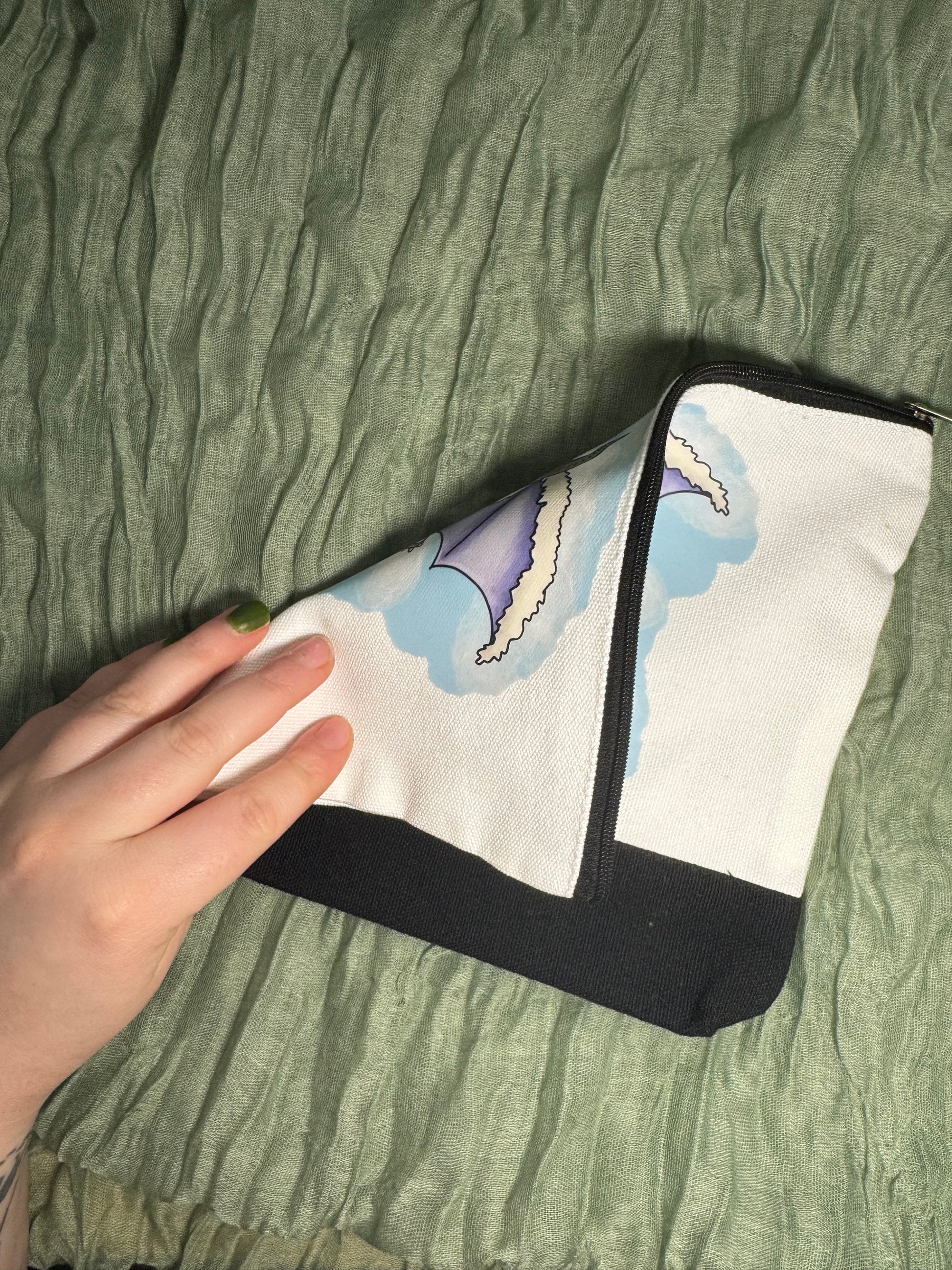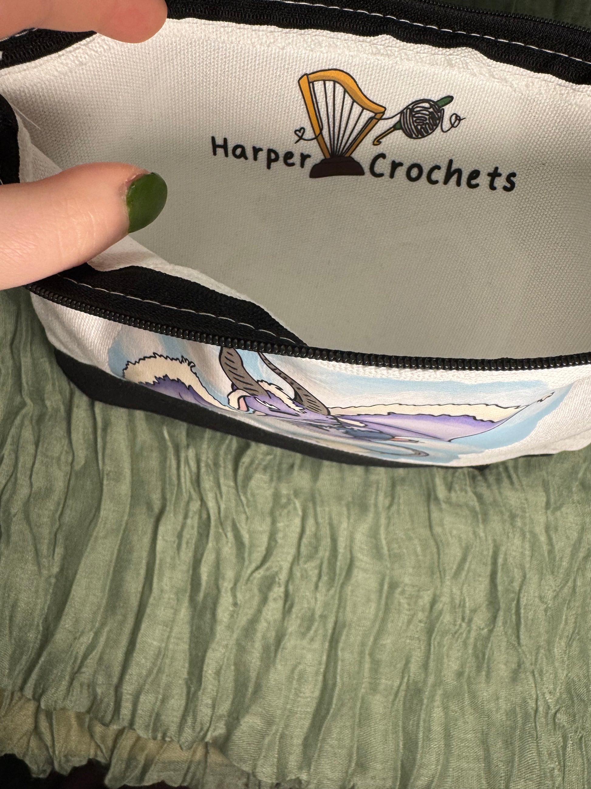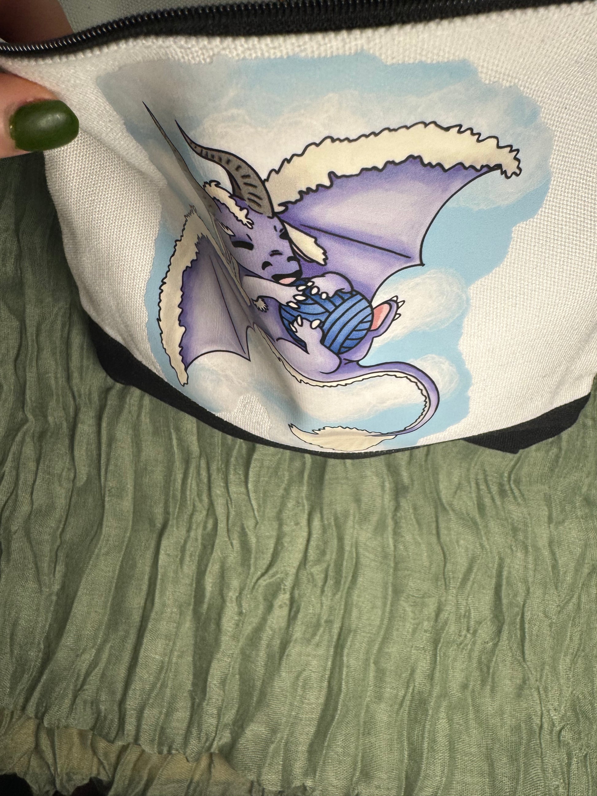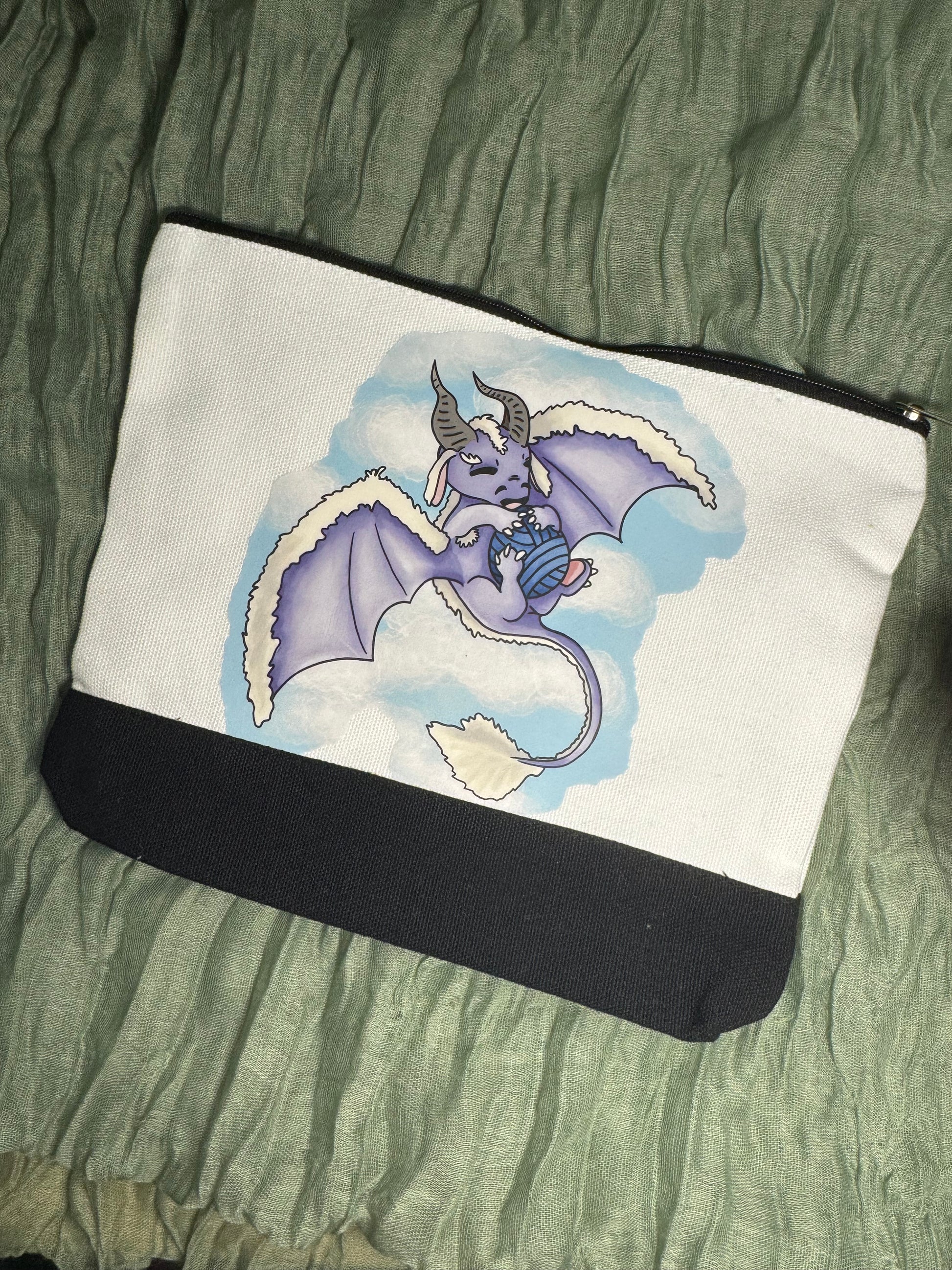 Featuring my design of a purple dragon playing with a ball of yarn in the sky! Perfect for your hooks and notions, this crochet hook case measures 22cm long, 15cm tall, and has a depth of 6cm thanks to a gusset at the bottom, which expands as you fill the case! It has a sturdy zip closure for keeping all your hooks and stitch markers secure, instead of spilling out all over your bag!