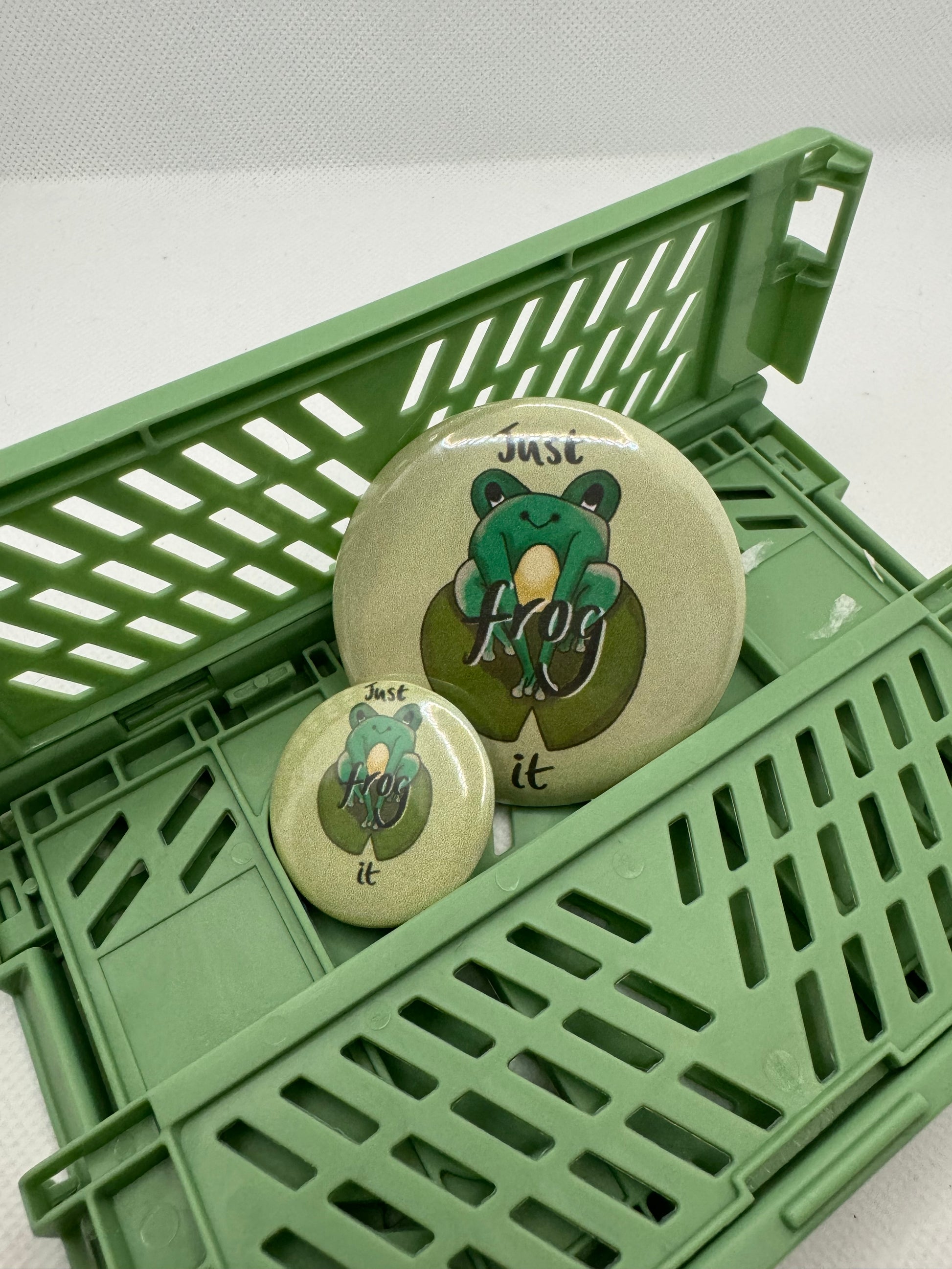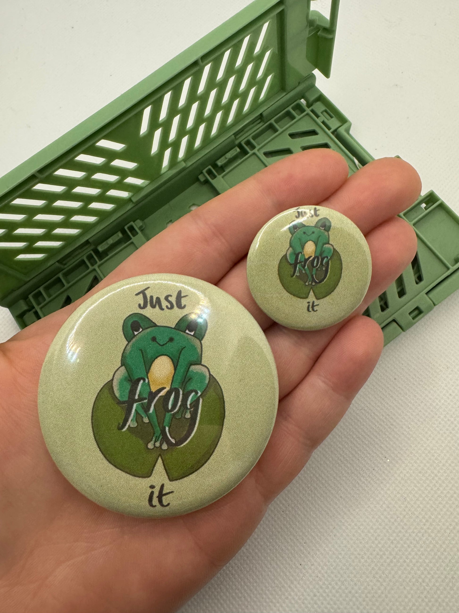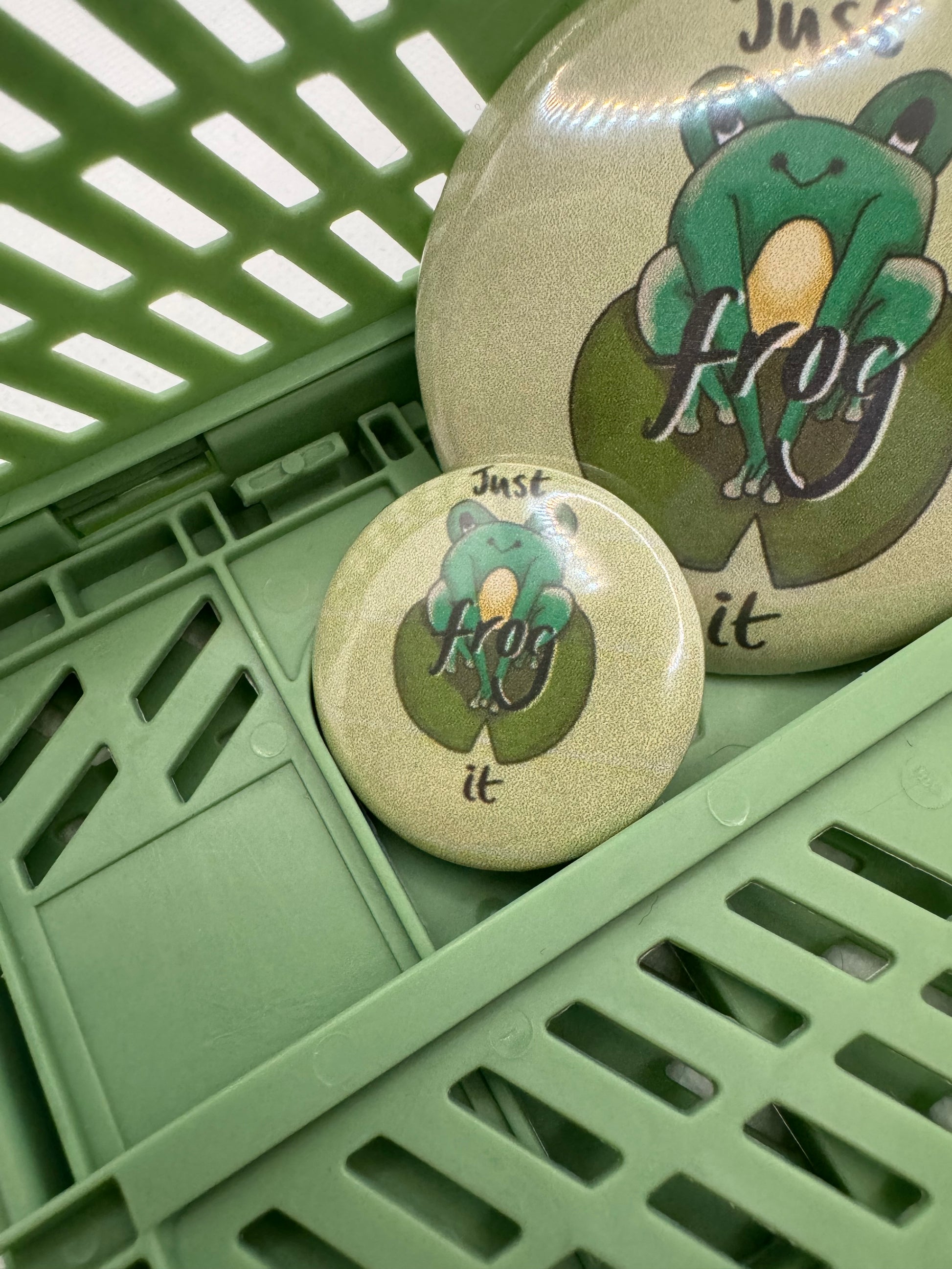 Button badge featuring my frog on a lily pad design with the words "Just frog it" on a light sage green background.