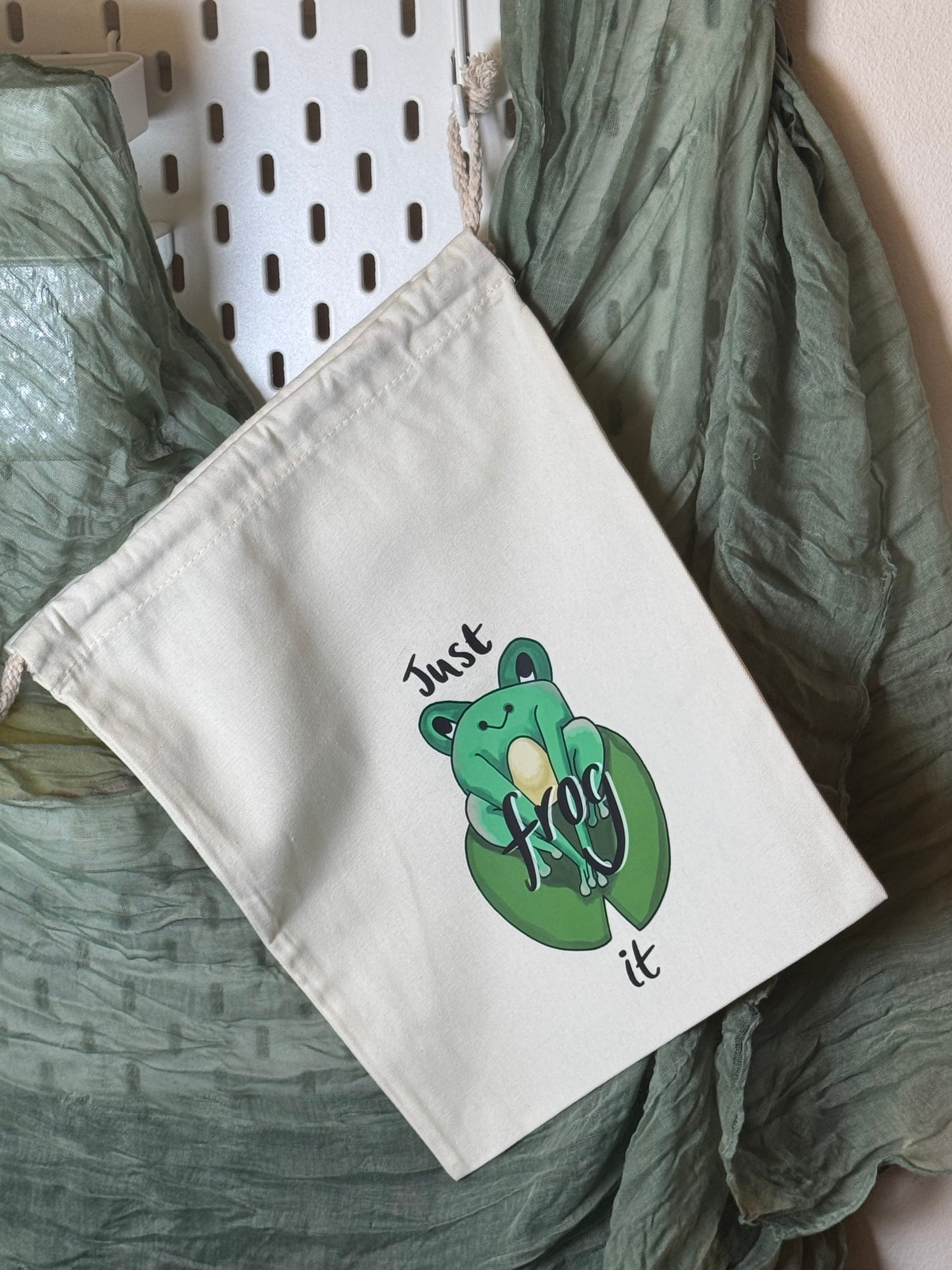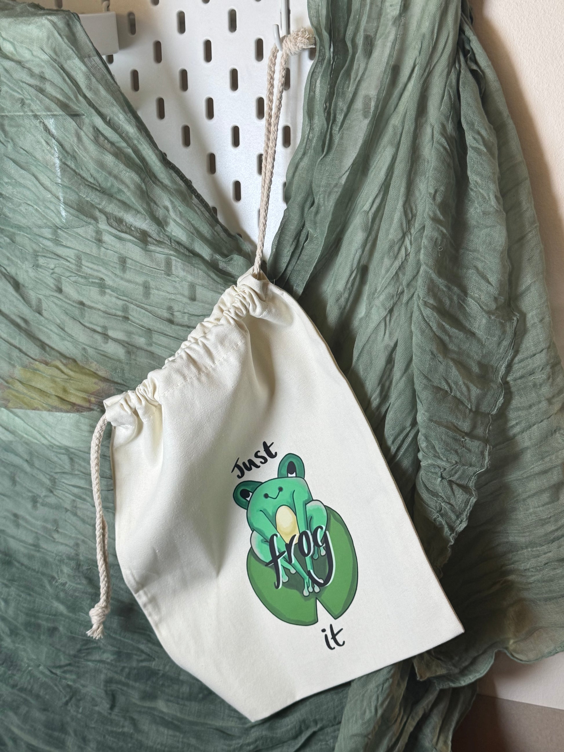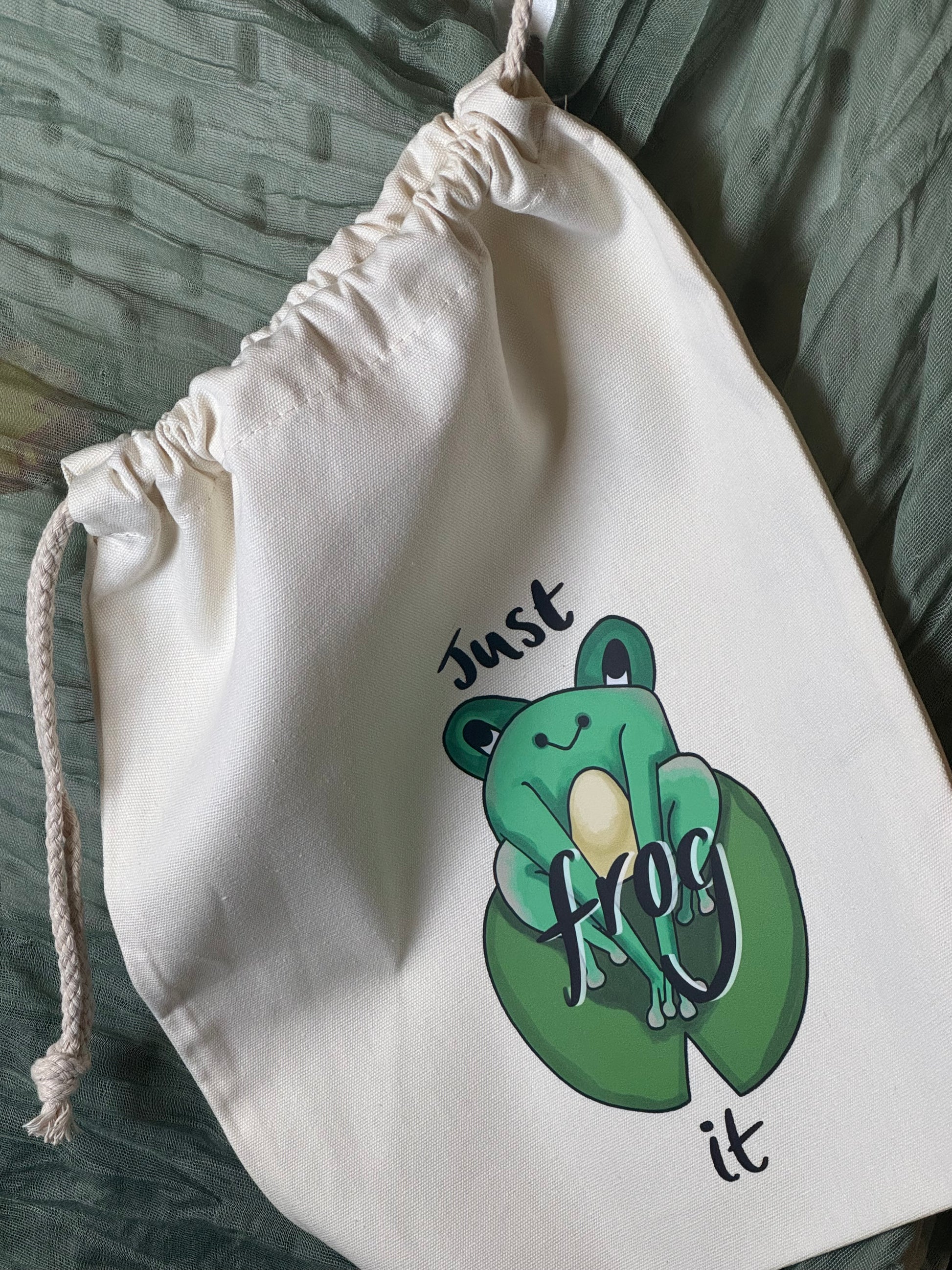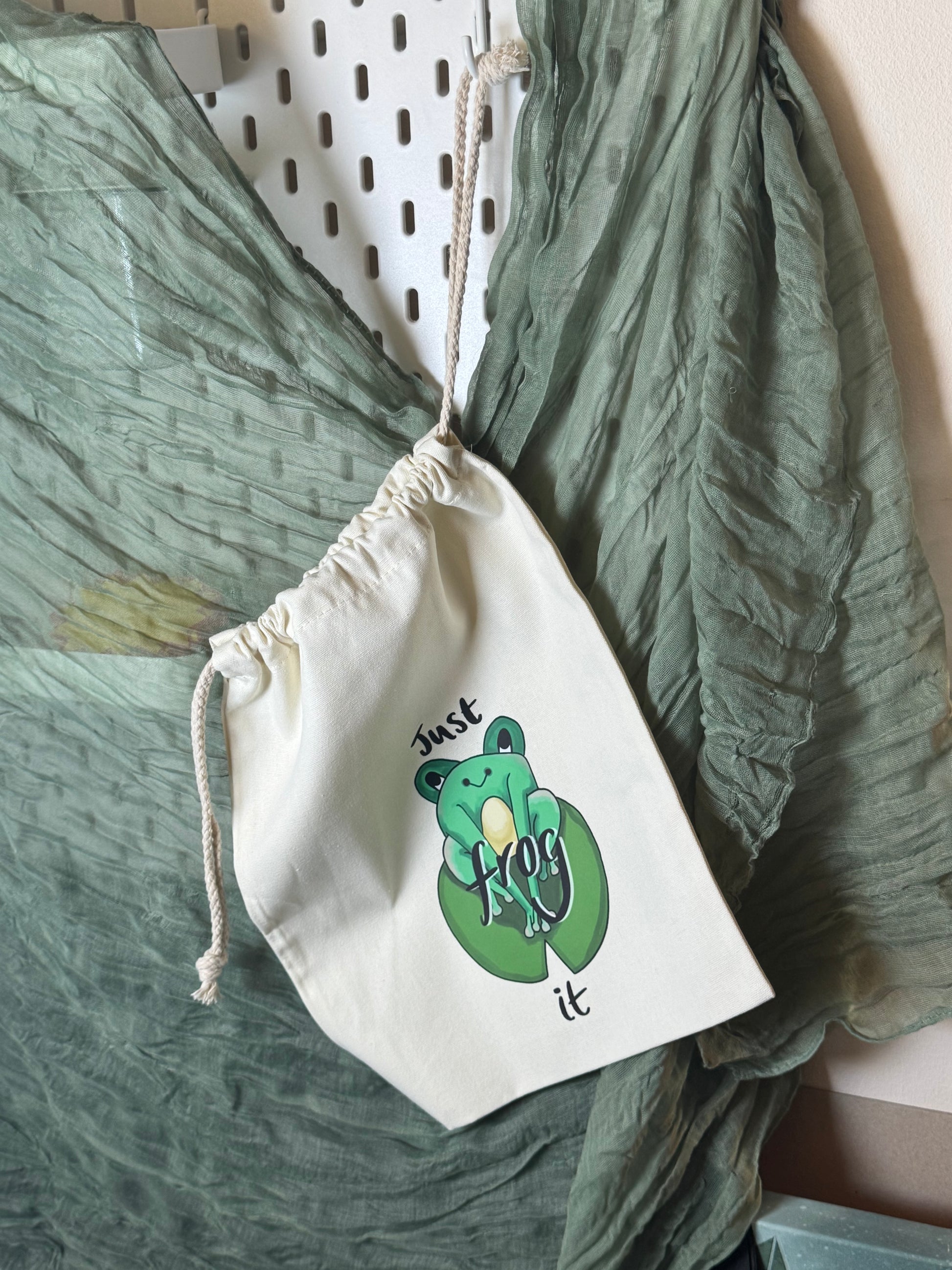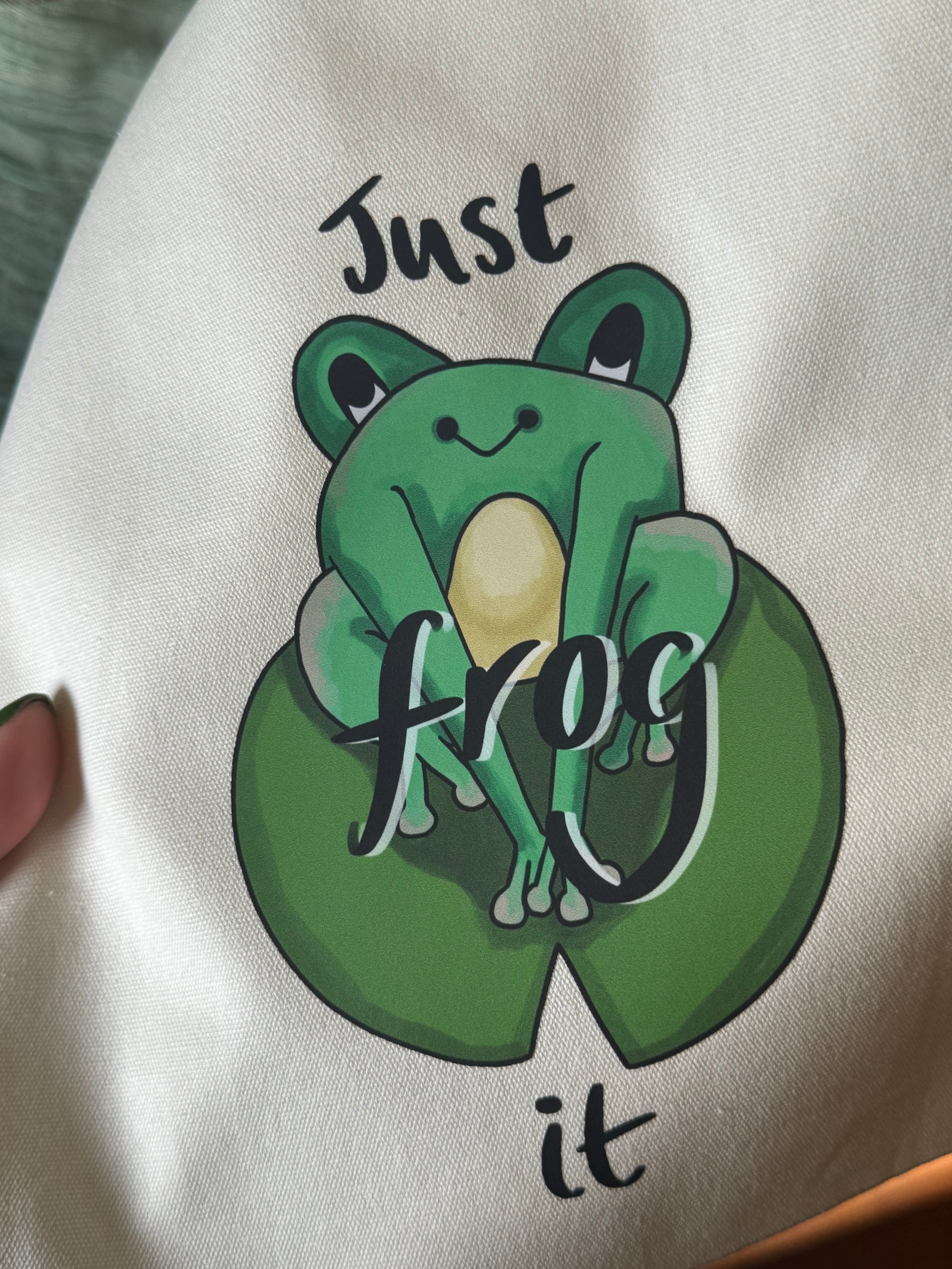 Project bag featuring my frog on a lily pad design and the words "slow fashion".