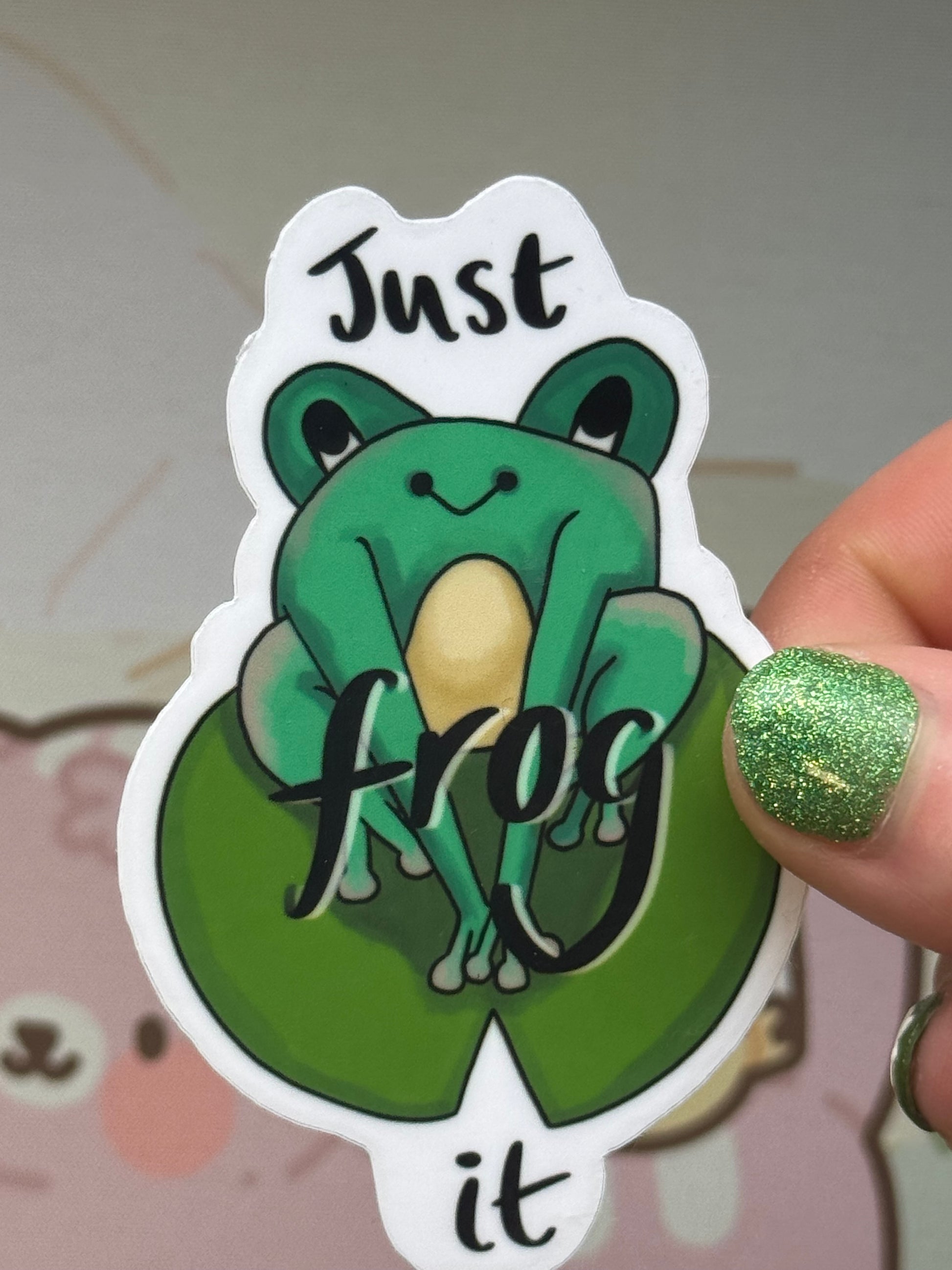 This sticker shows my frog on a lilly-pad design with the words "Just frog it"! It comes in 4 finishes: white glossy, rainbow holographic, cracked glass holographic, or glow in the dark!