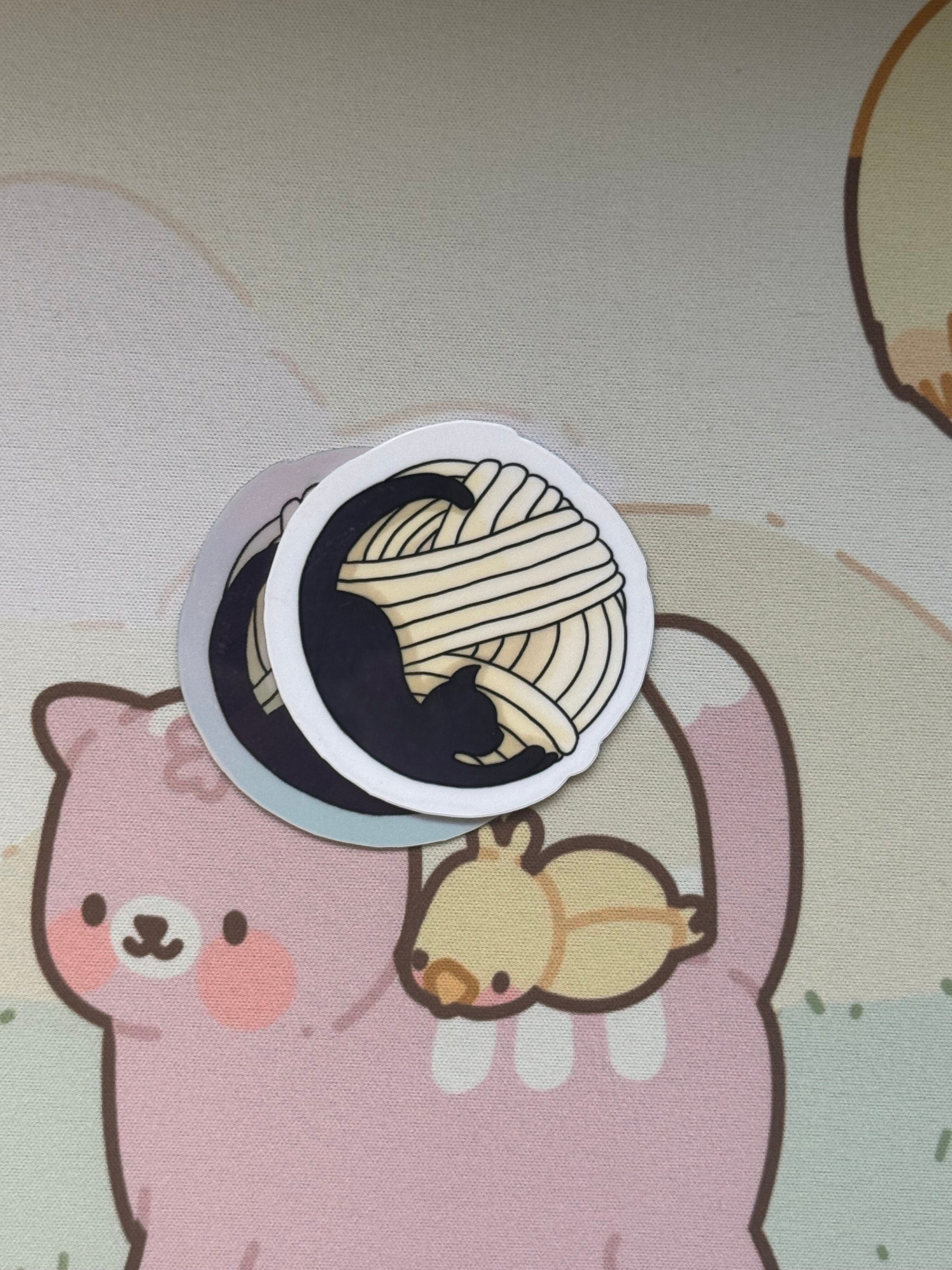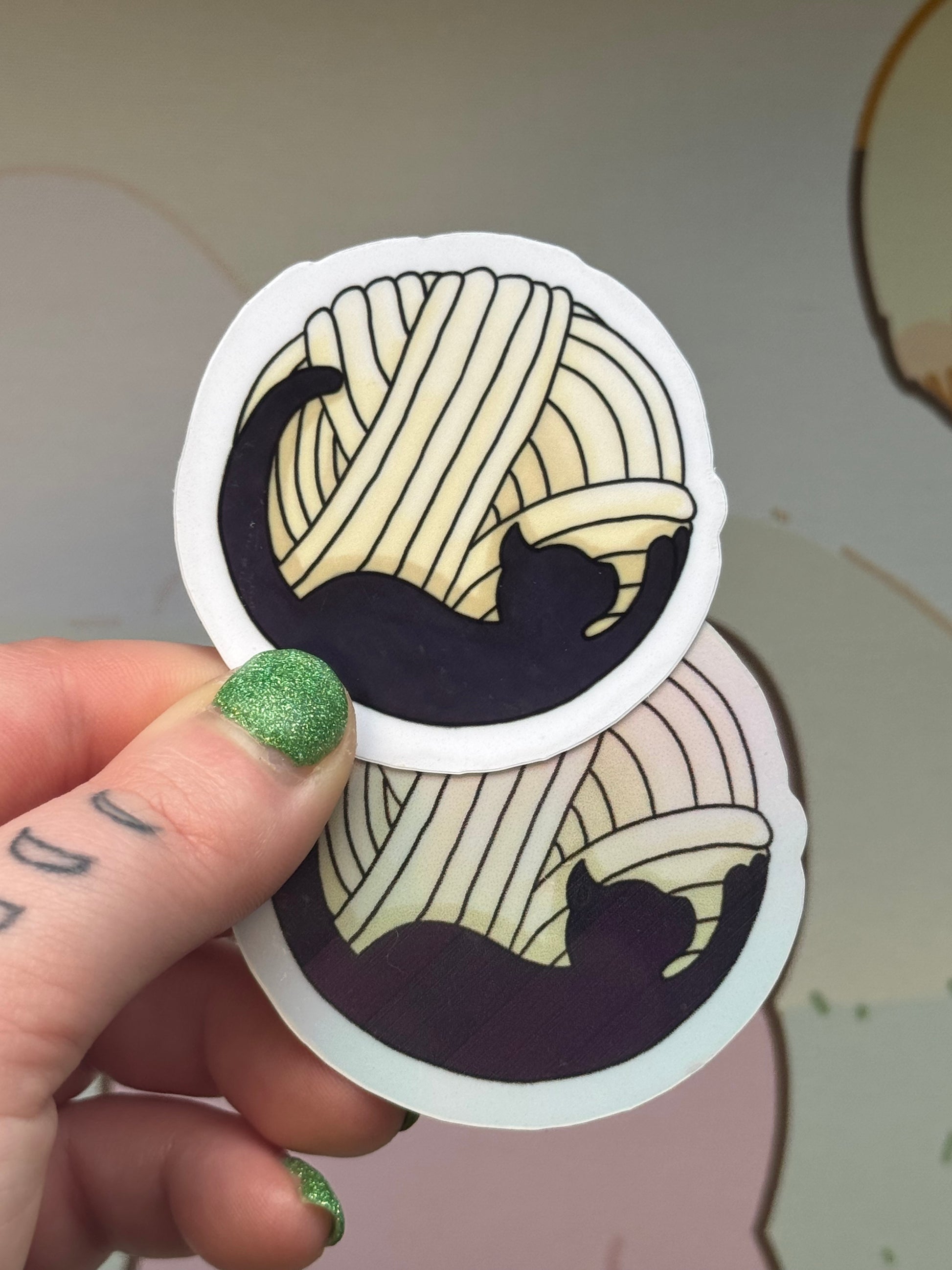 This sticker shows my black cat silhouetted on a moon of yarn/ a ball of yarn! It comes in 4 finishes: white glossy, rainbow holographic, cracked glass holographic, or glow in the dark!