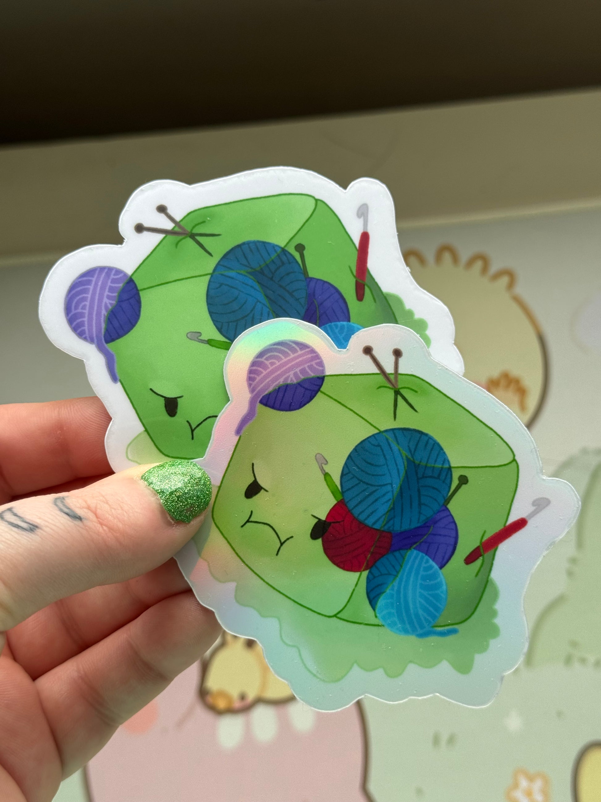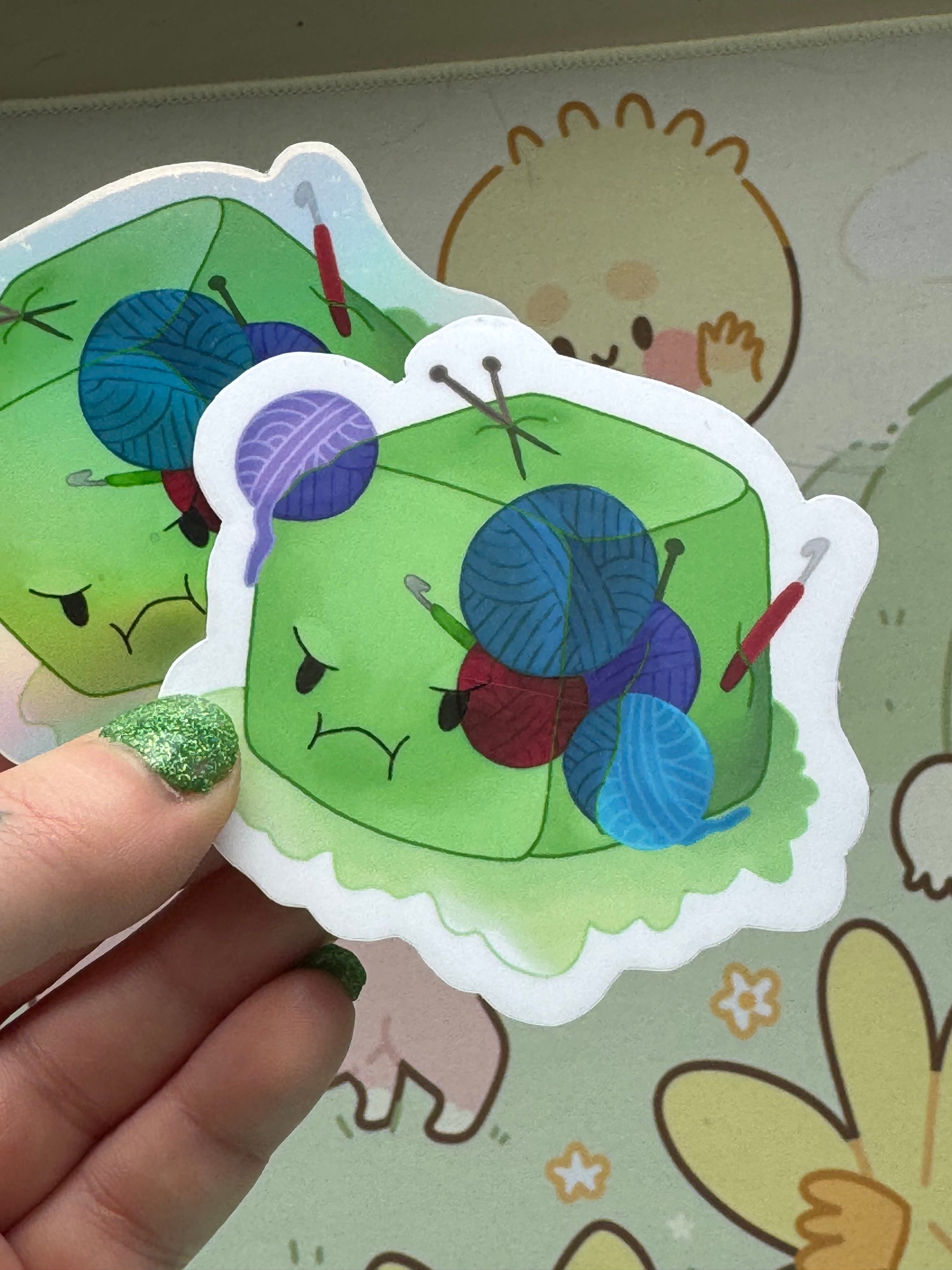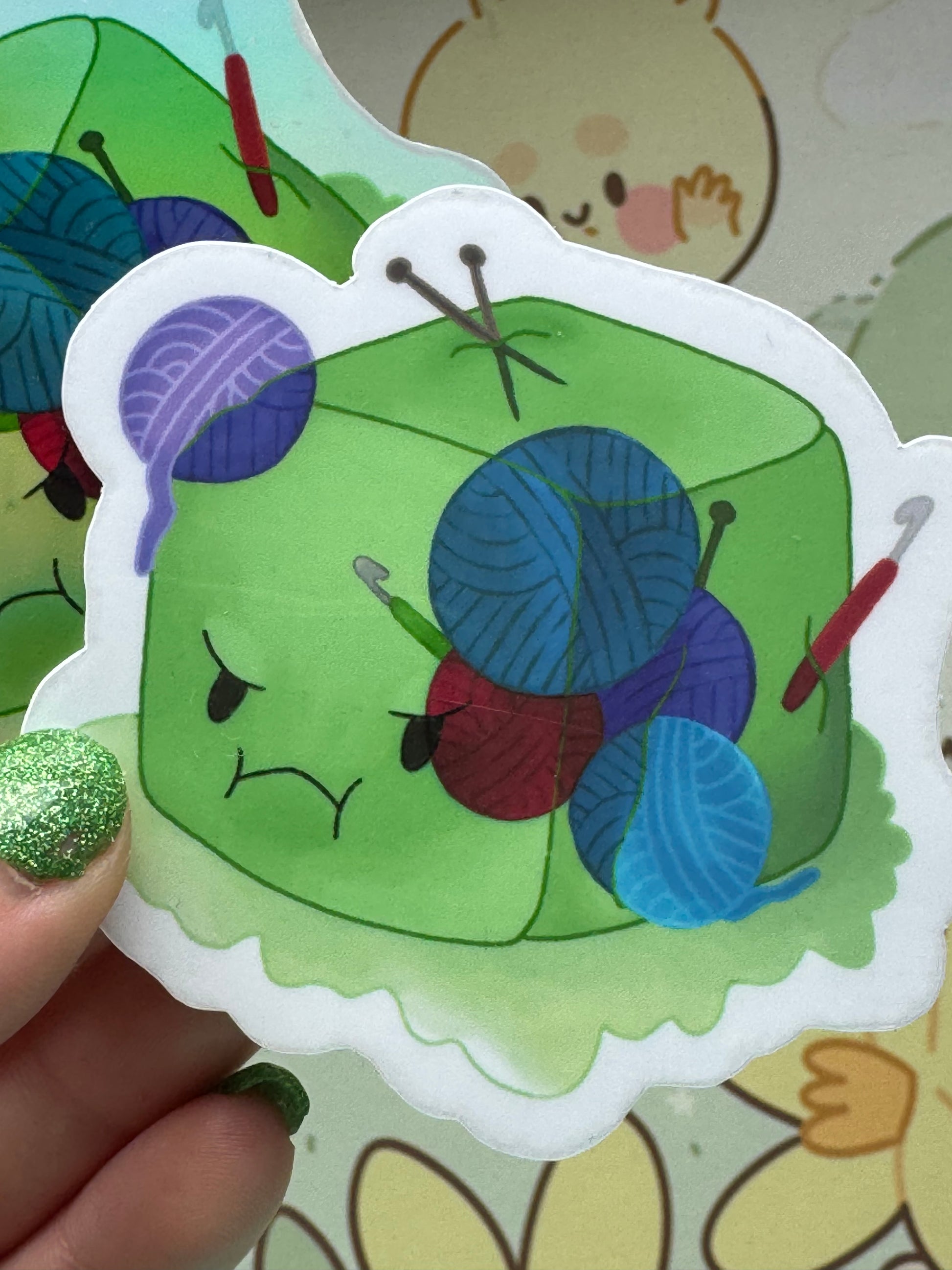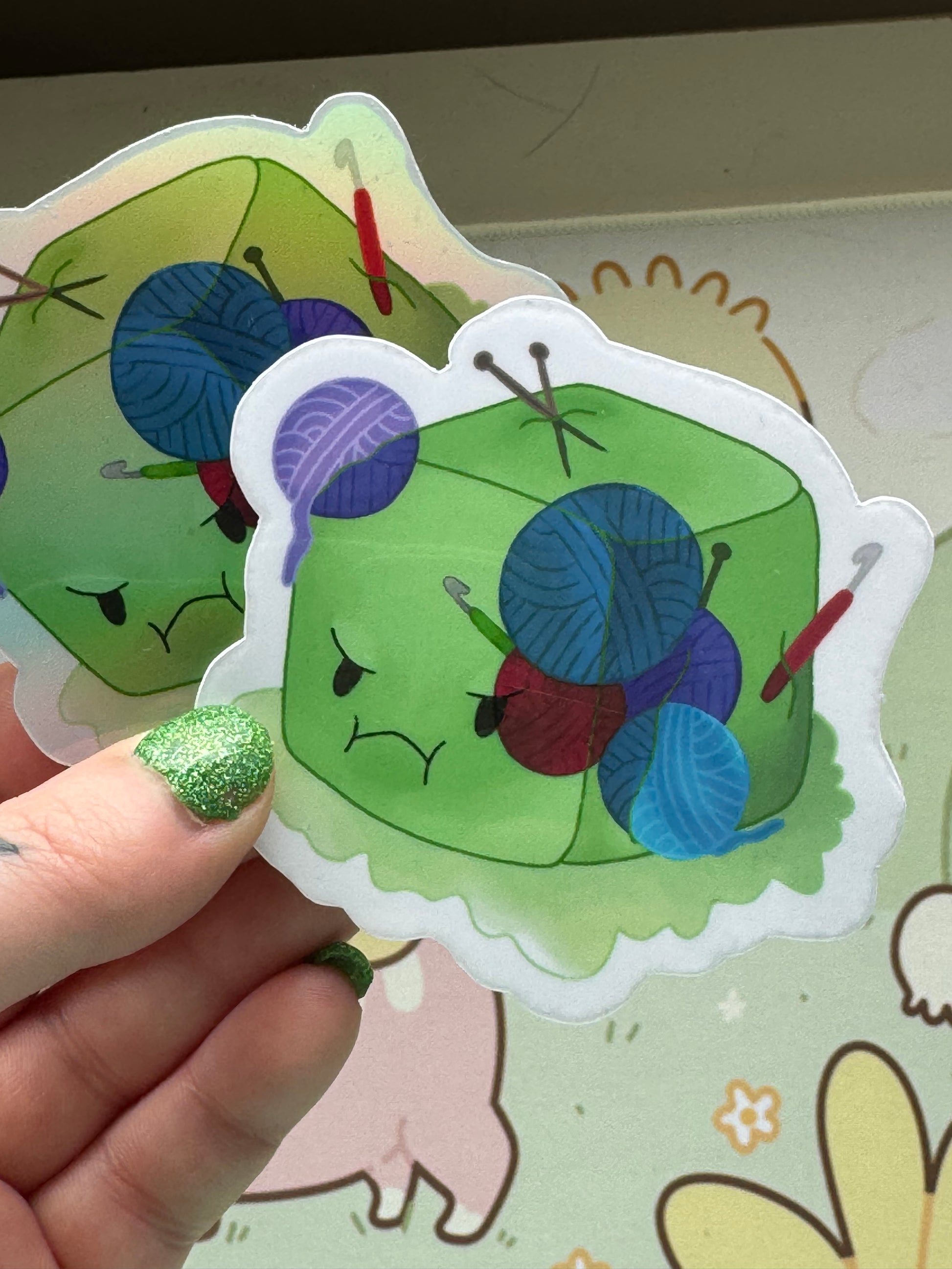 This sticker shows my gelatinous cube who came across a fibre artist and their yarn and tools (and of course, absorbed them)! It comes in 3 finishes: white glossy, rainbow holographic, or cracked glass holographic!