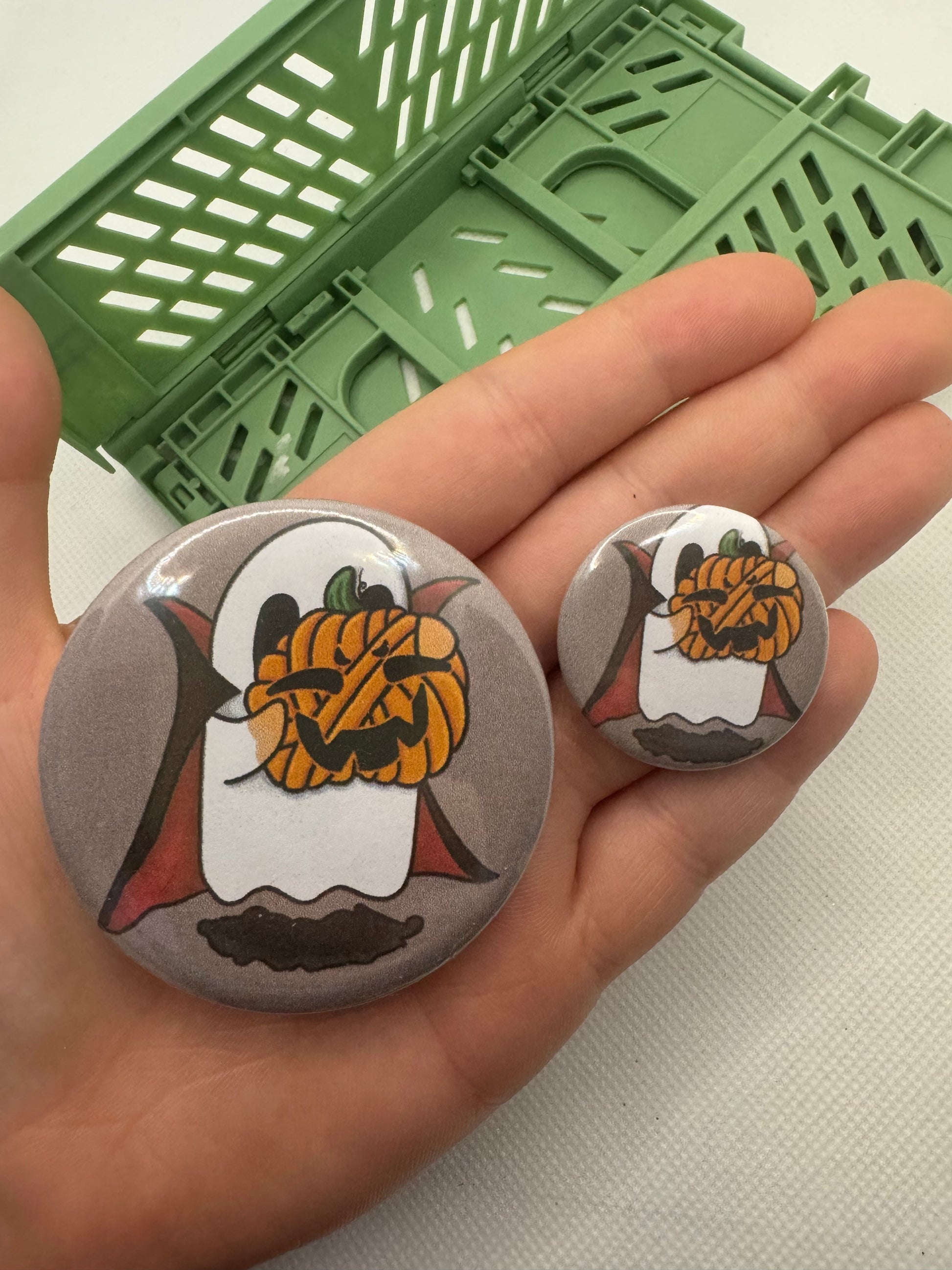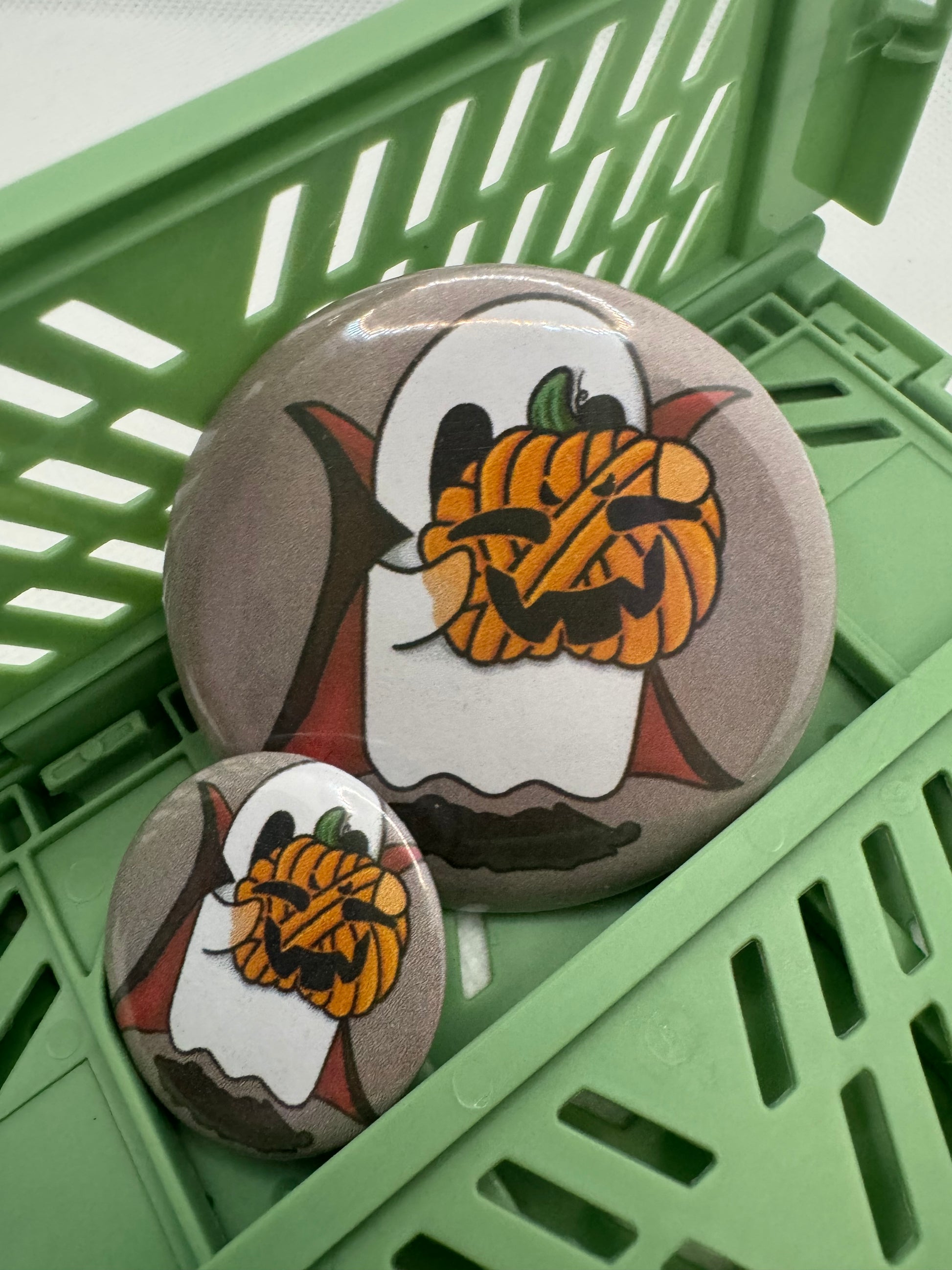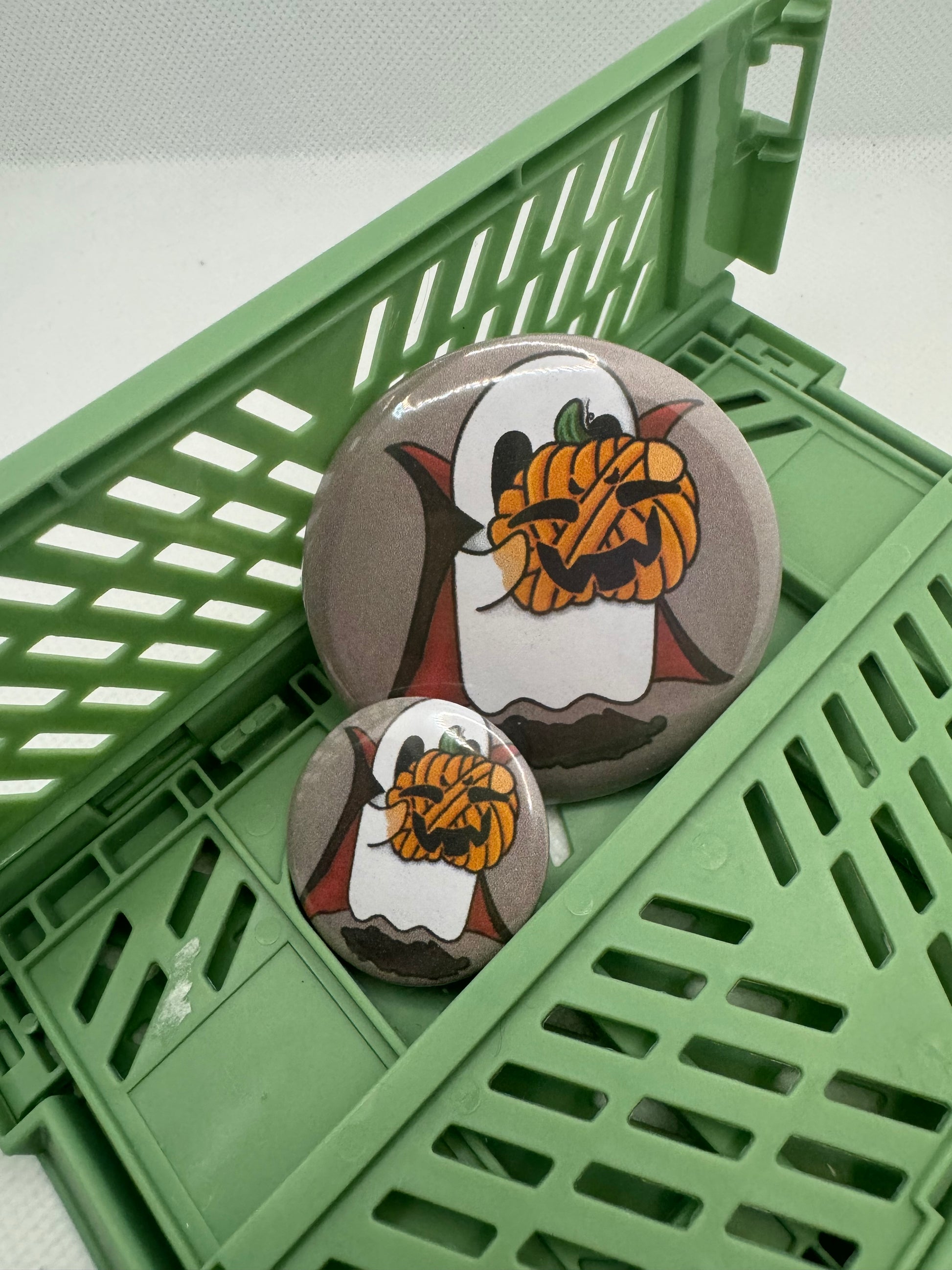 Button badge featuring my ghost dressed as a vampire, and holding a carved yarn pumpkin design on a taupe brown/grey-ish background.