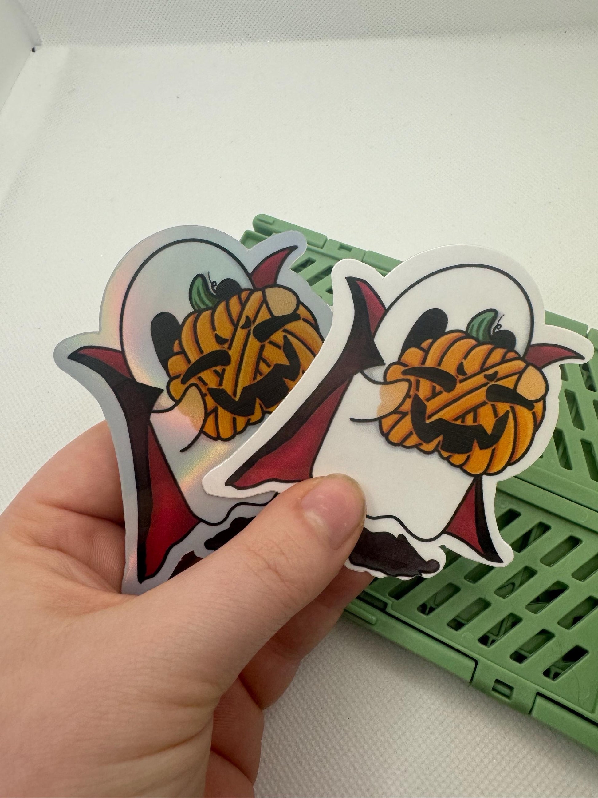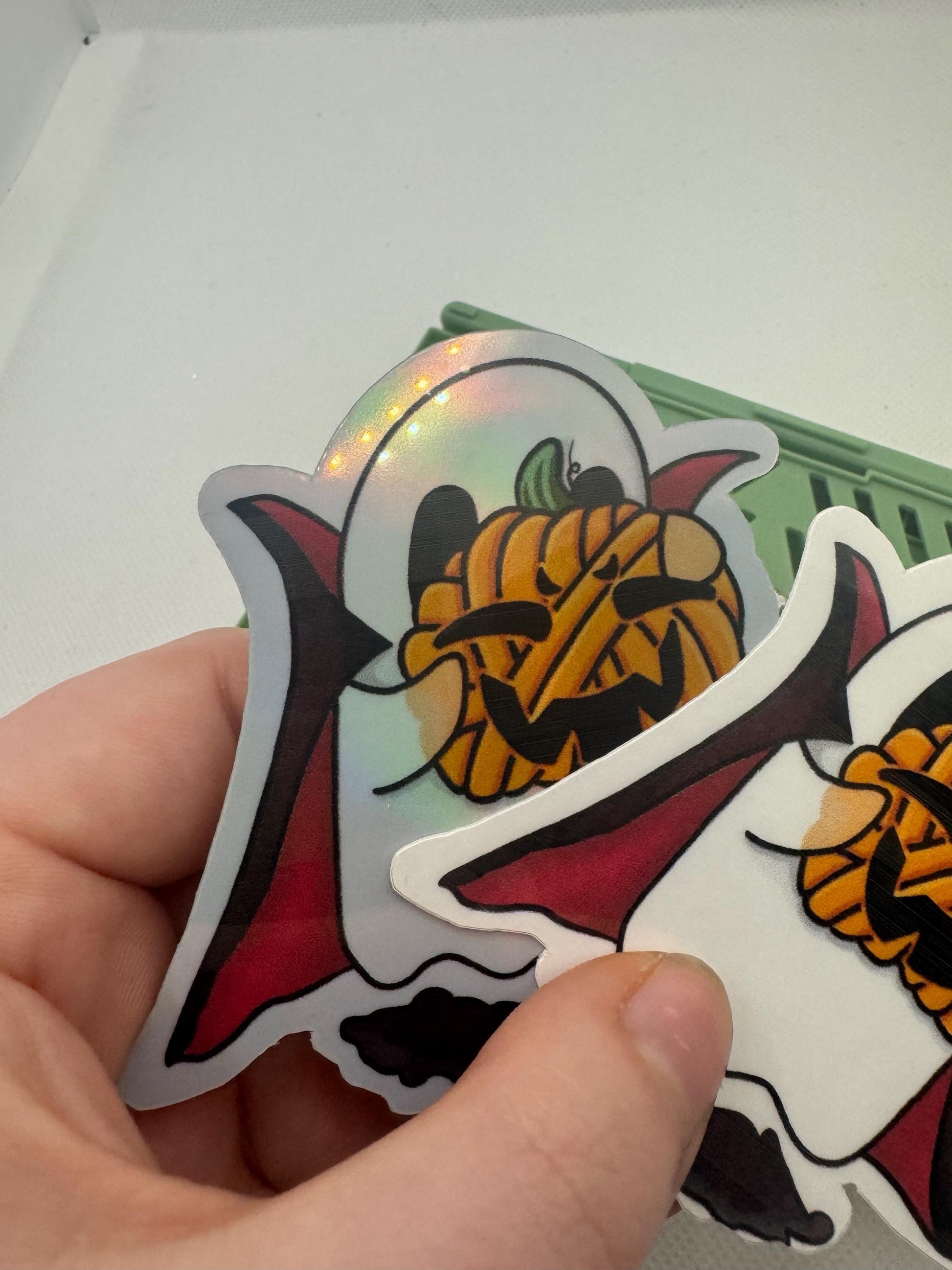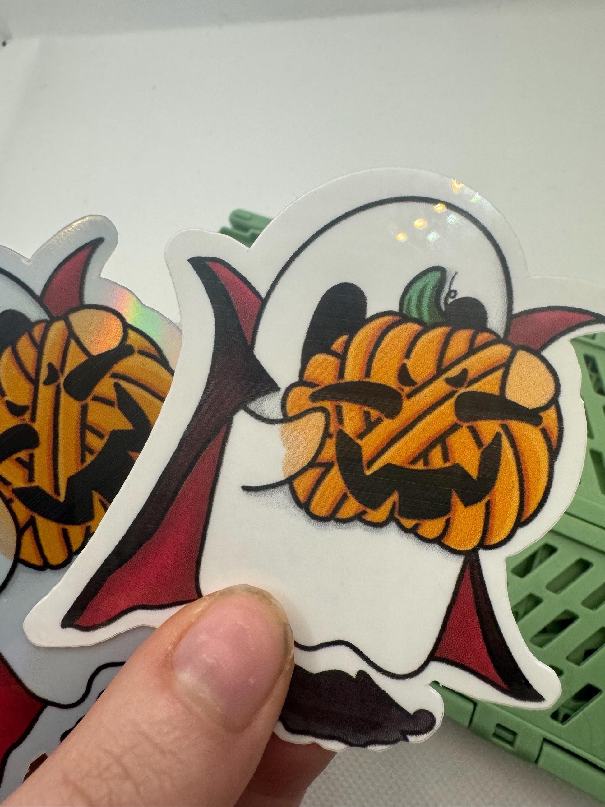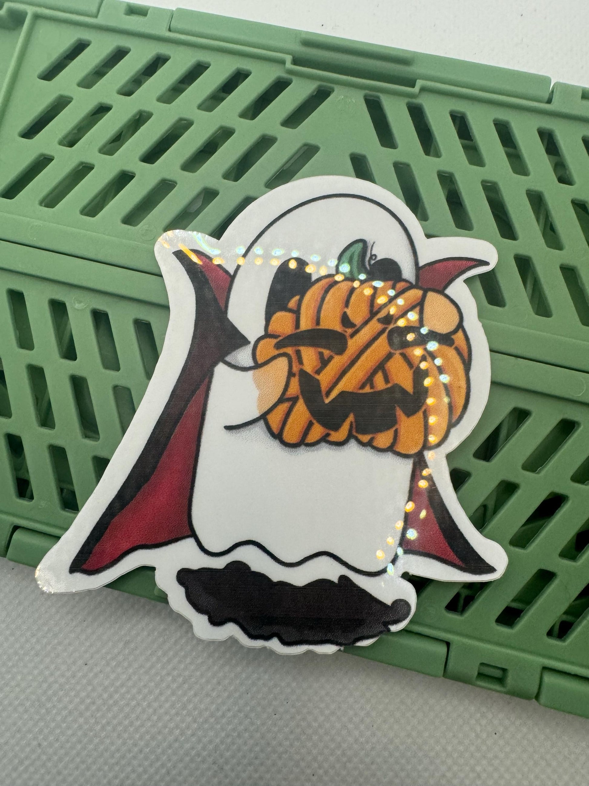 This sticker shows my ghost dressed as a vampire, holding a carved yarn pumpkin! It comes in 4 finishes: white glossy, rainbow holographic, cracked glass holographic, or glow in the dark!