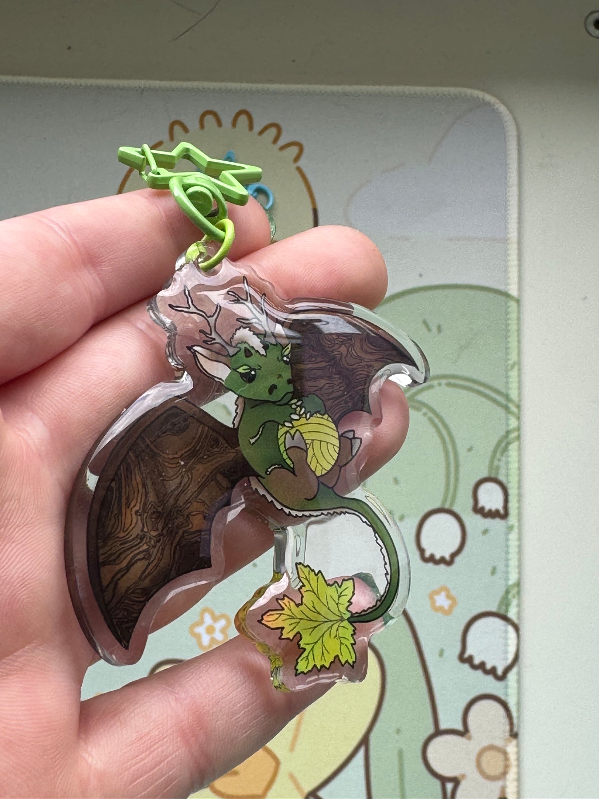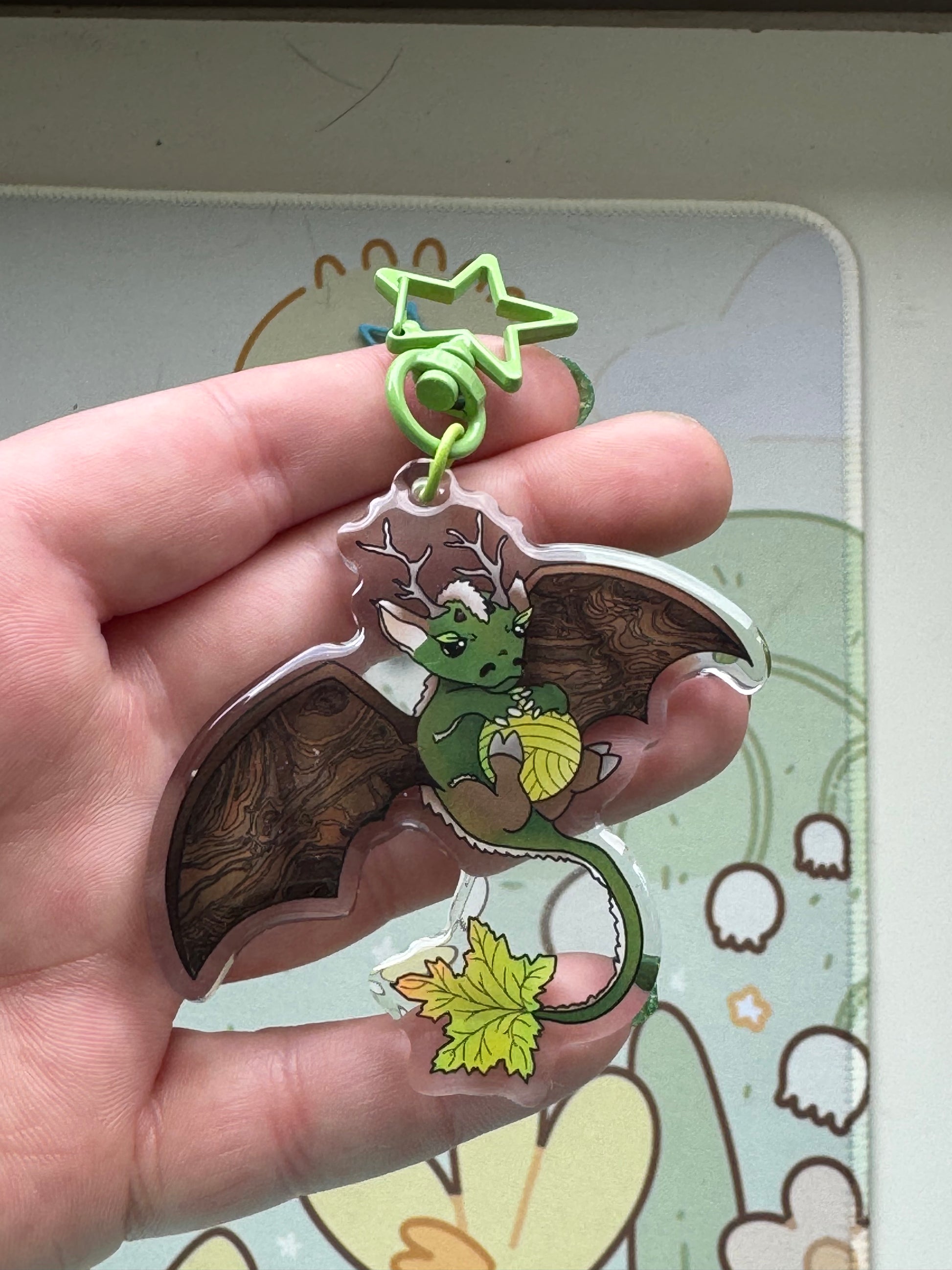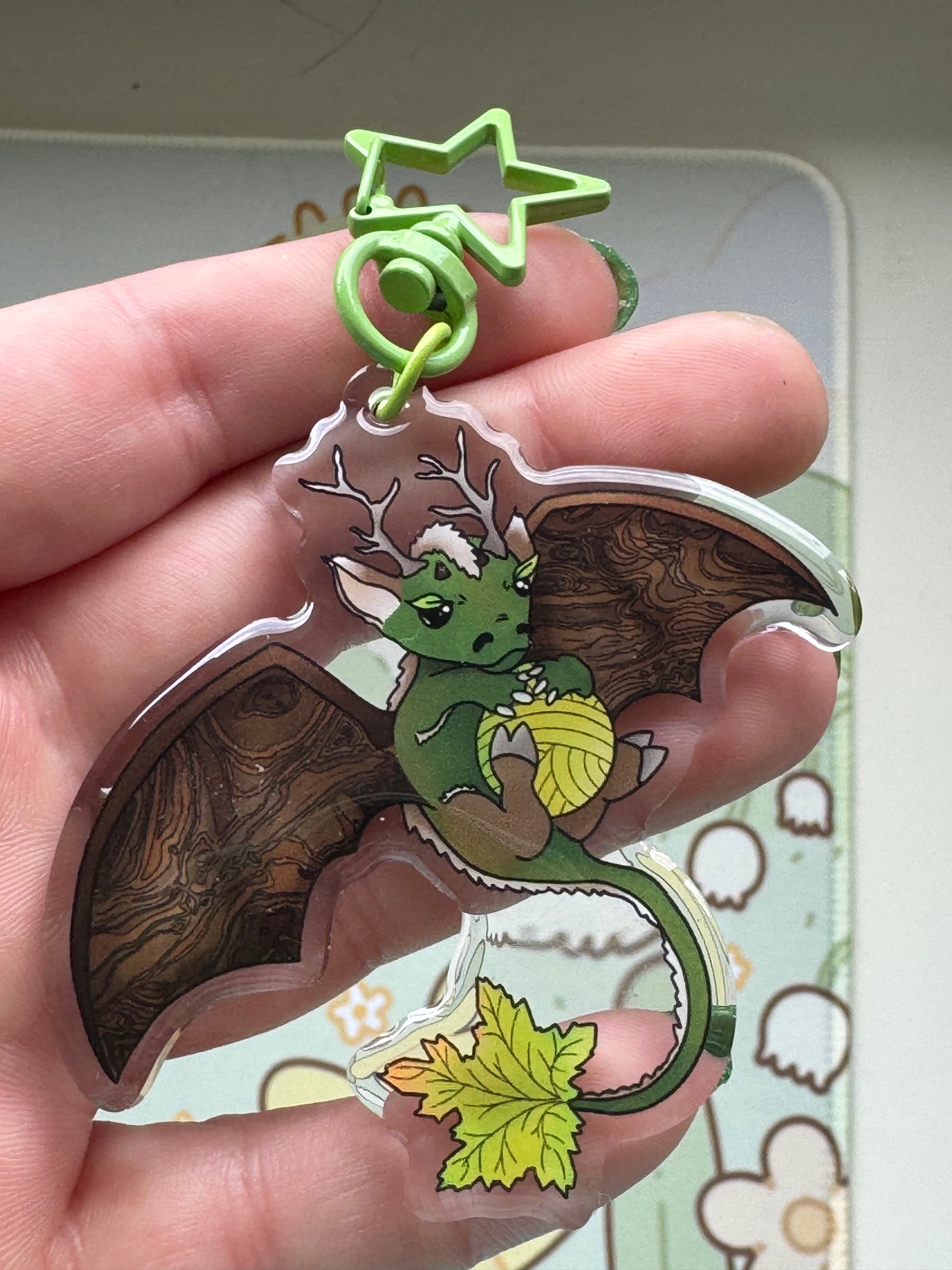 About the design: This is the final dragon I drew, and is by far my personal favourite! The woodgrain on the wings, the satyr inspired deer back legs, and the antlers are some of my favourite details in this design! As mentioned above, this is keyring number 4 (Set04) in a set of 4 unique and fun dragon keyrings! Each dragon is in reference to a different style/ breed/ type of dragon and has different colours, features and details, but I like to think they all fly in the sky together with their balls of yarn!