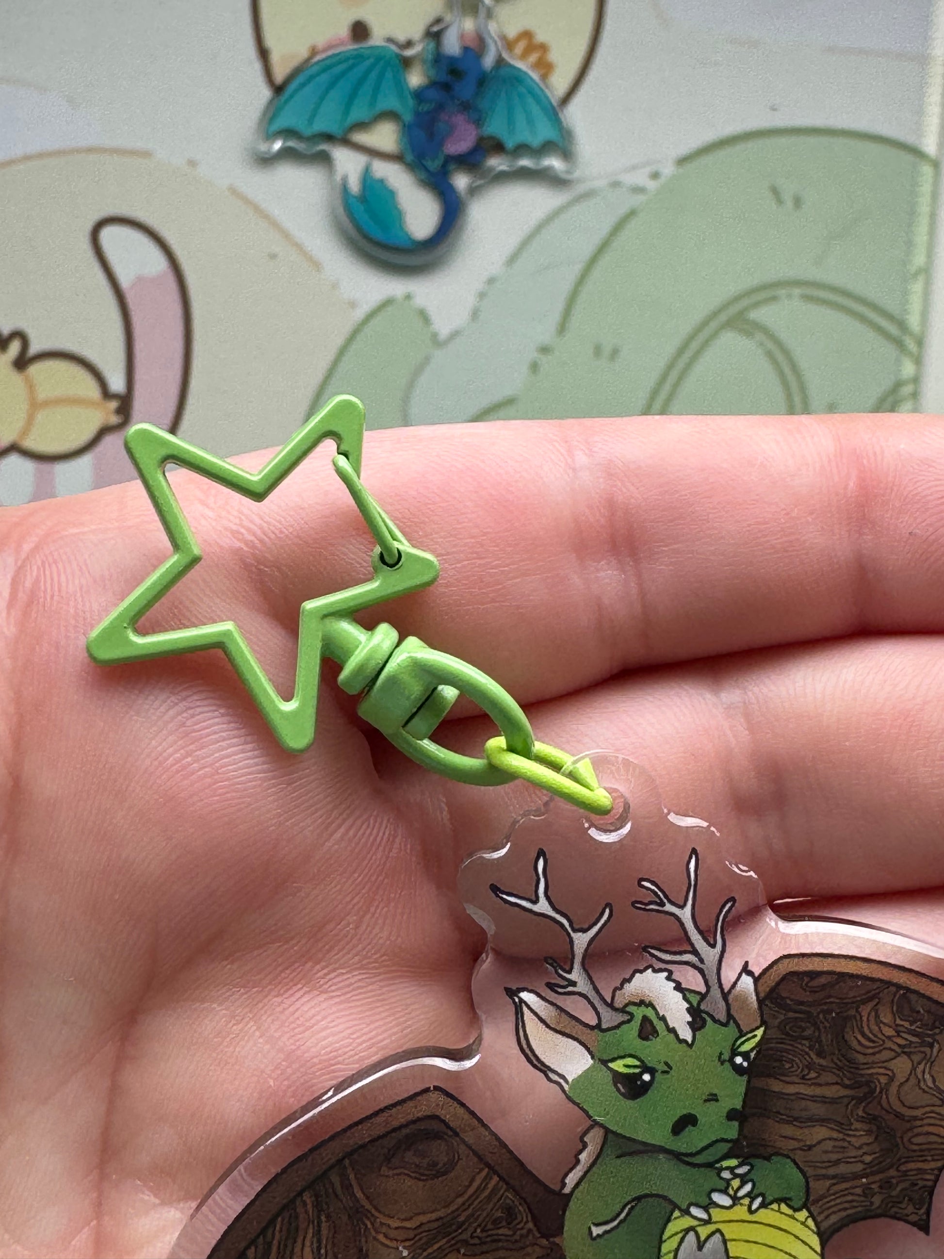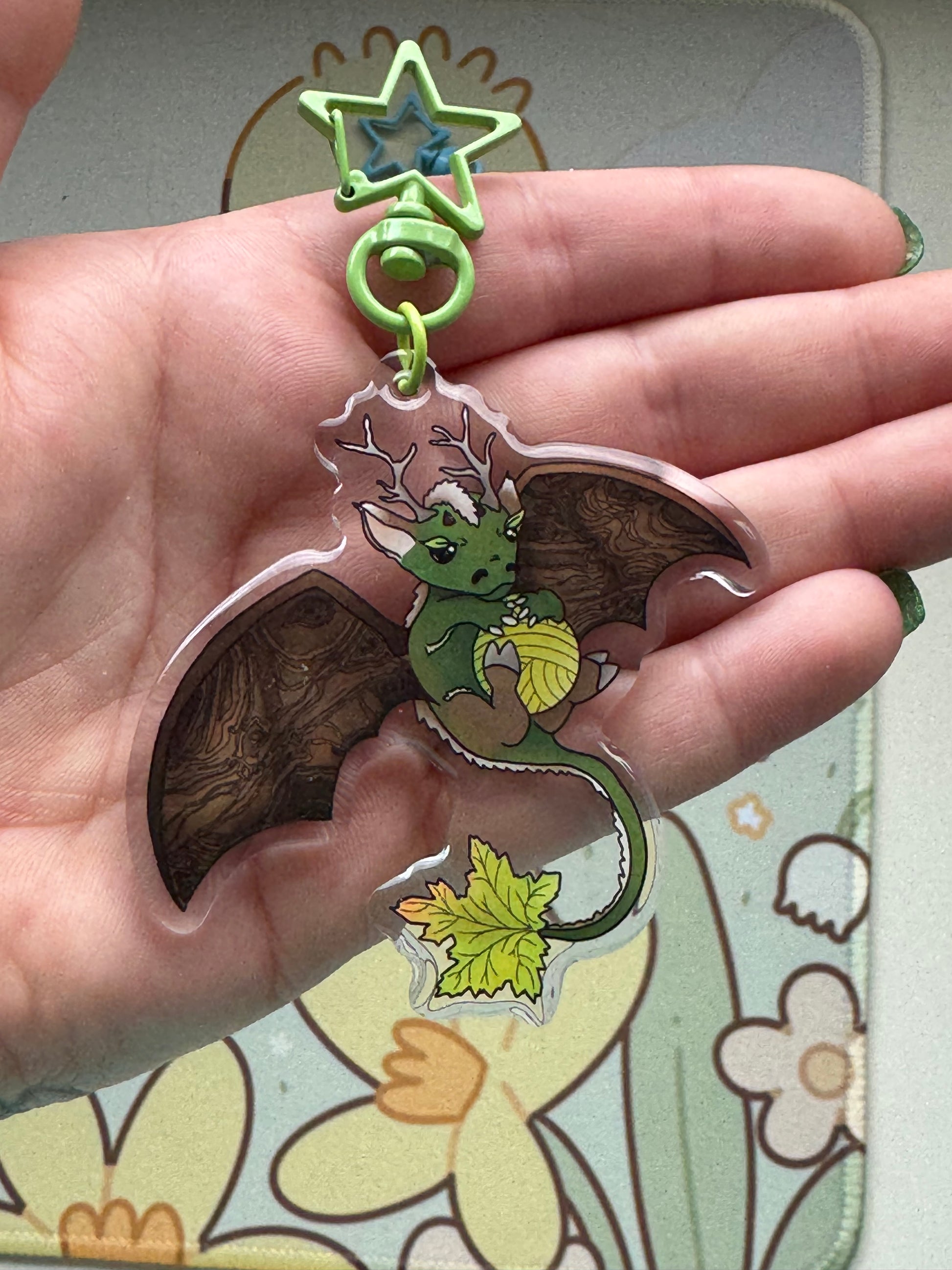 An acrylic keyring with my green and brown "woodland spirit" style nature dragon design. This keyring is number Set04 and is part of a set of 4 unique dragons with yarn designs on clear acrylic, and is double sided, with domed epoxy finish on the front. The charm measures 2.5 inches at its largest dimension and the keyring part is a green star lobster/ lever clasp for easy attachment to your keys, bag, zipper, etc!