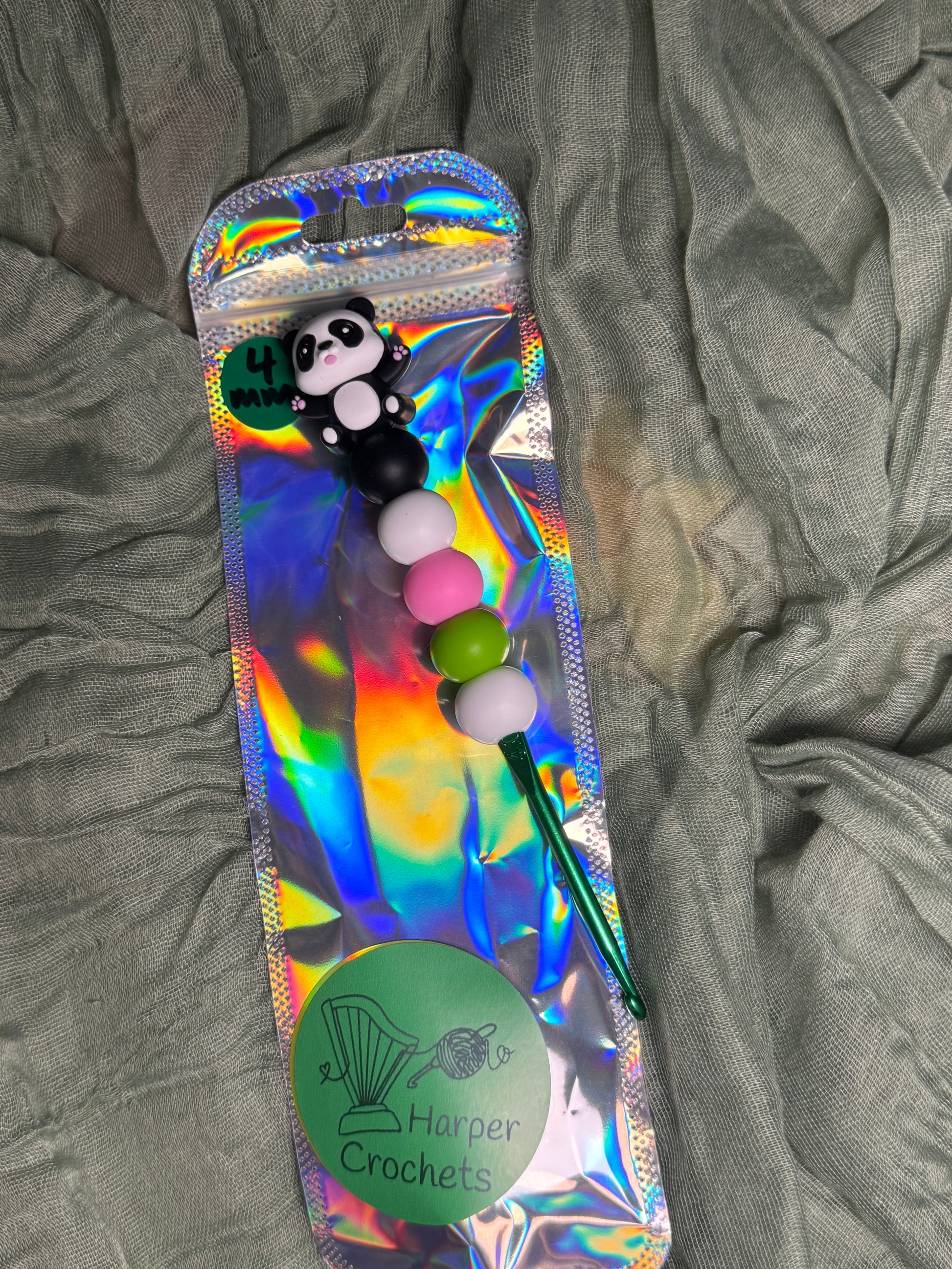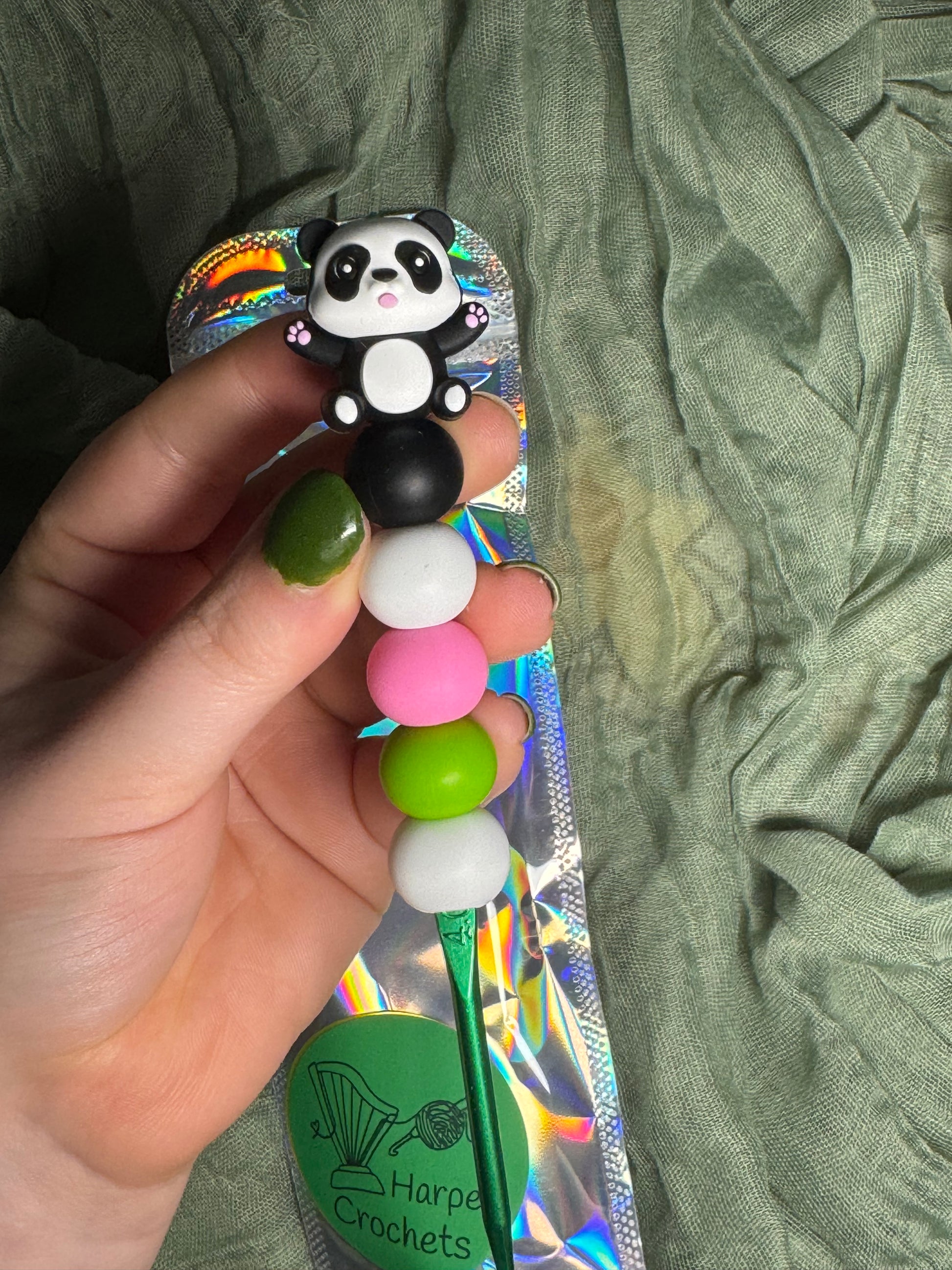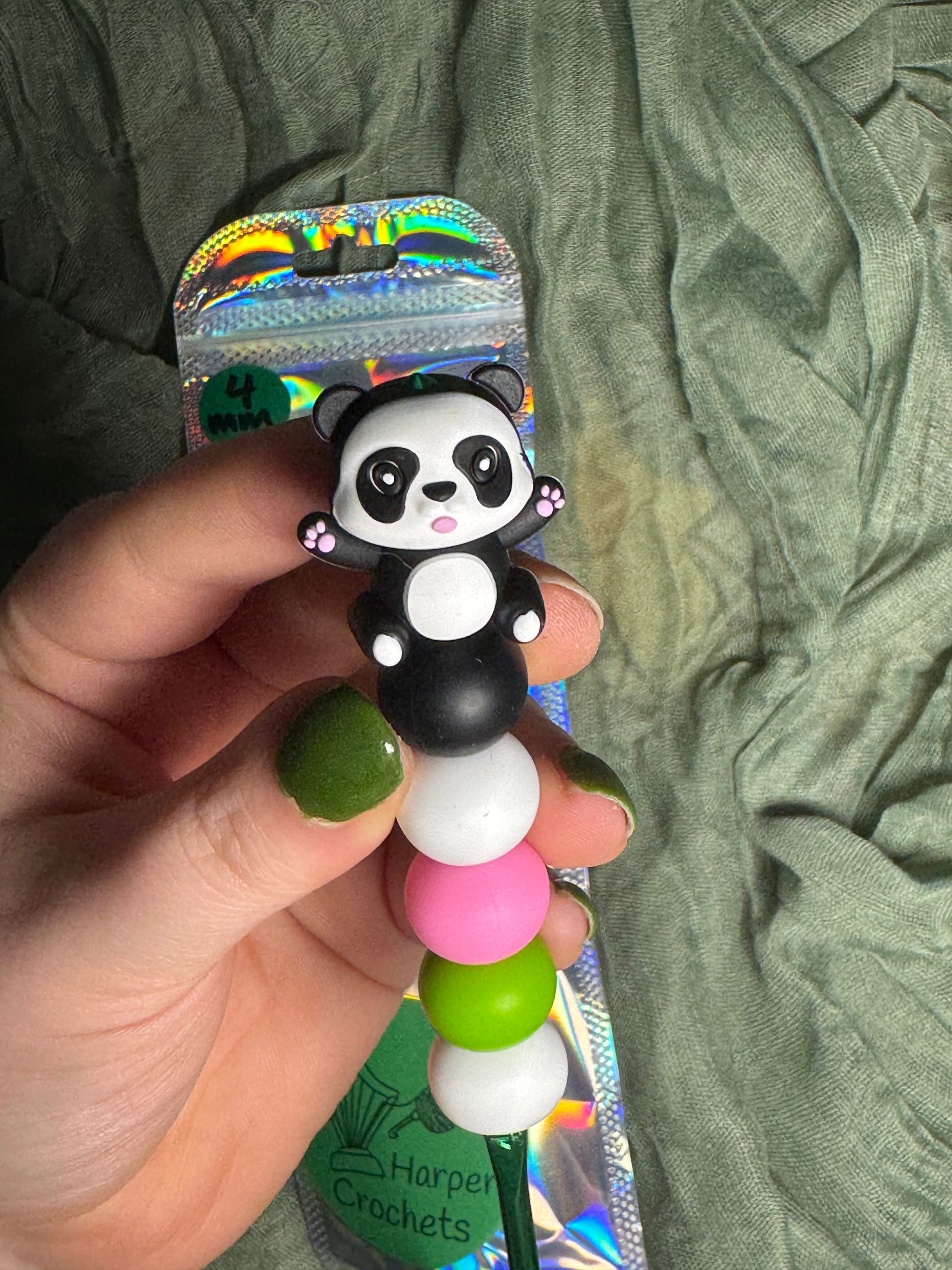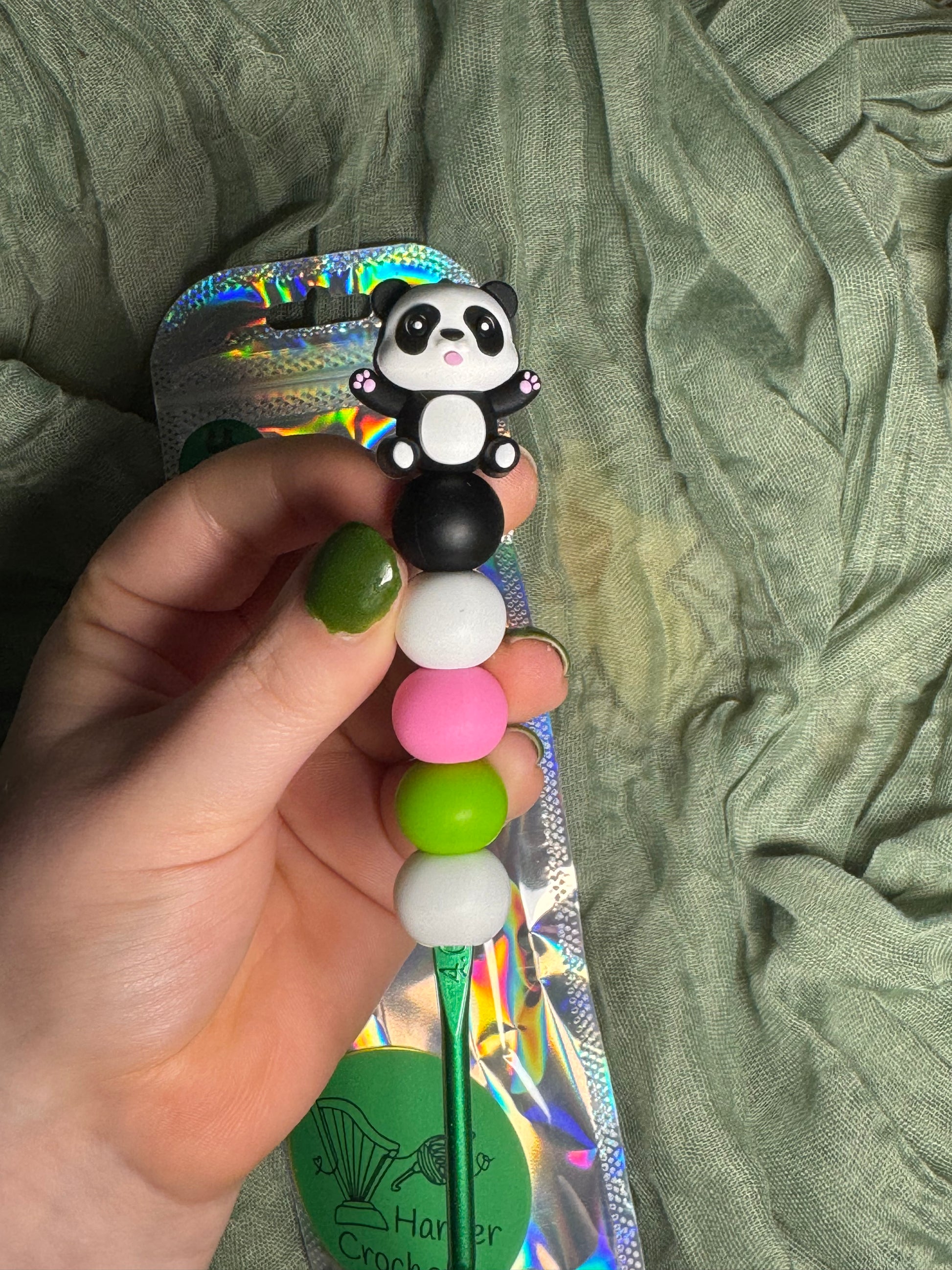 Handmade beaded crochet hook with cute 3D panda topper and colour themed beads in a size 4mm hook.