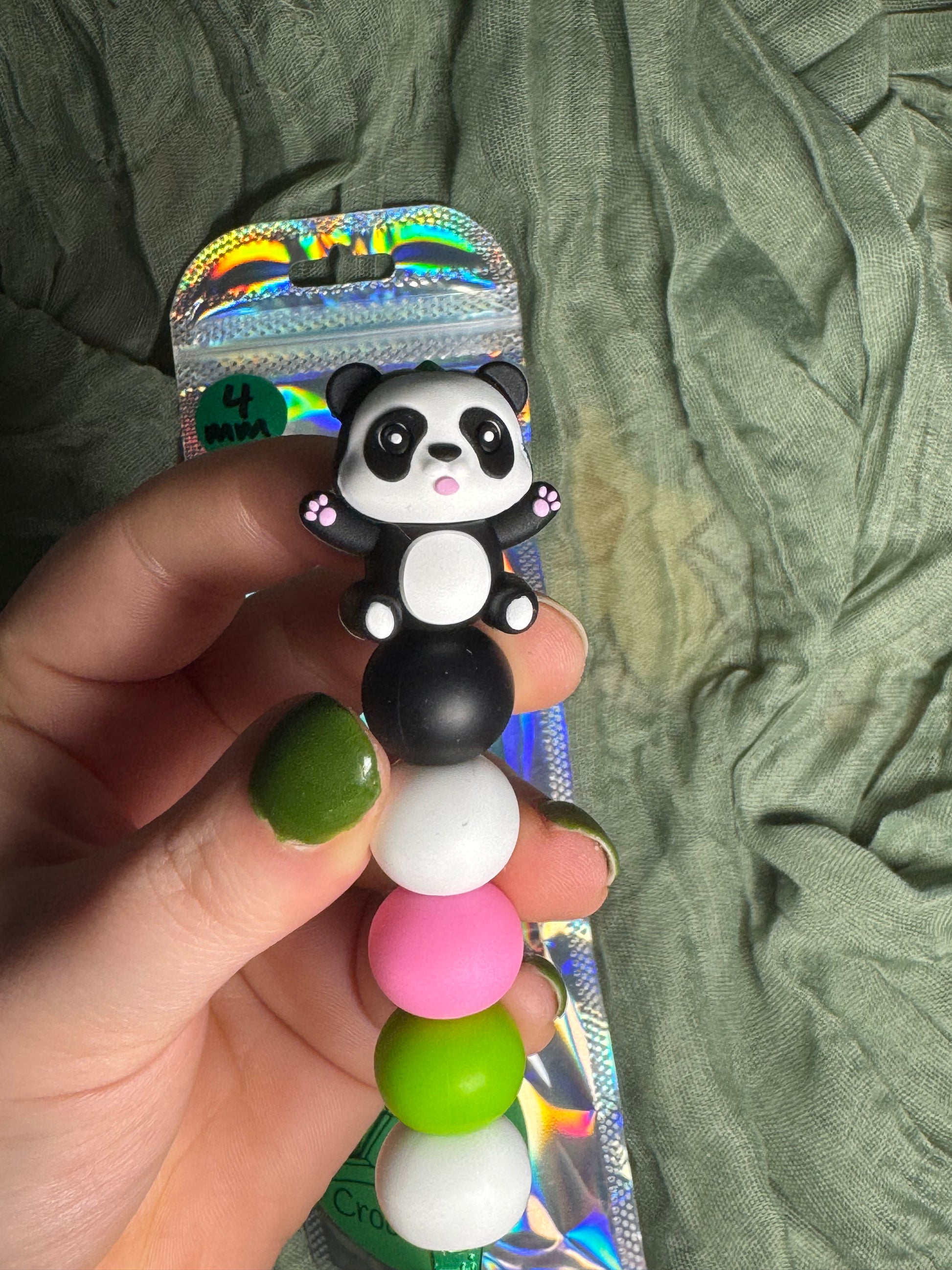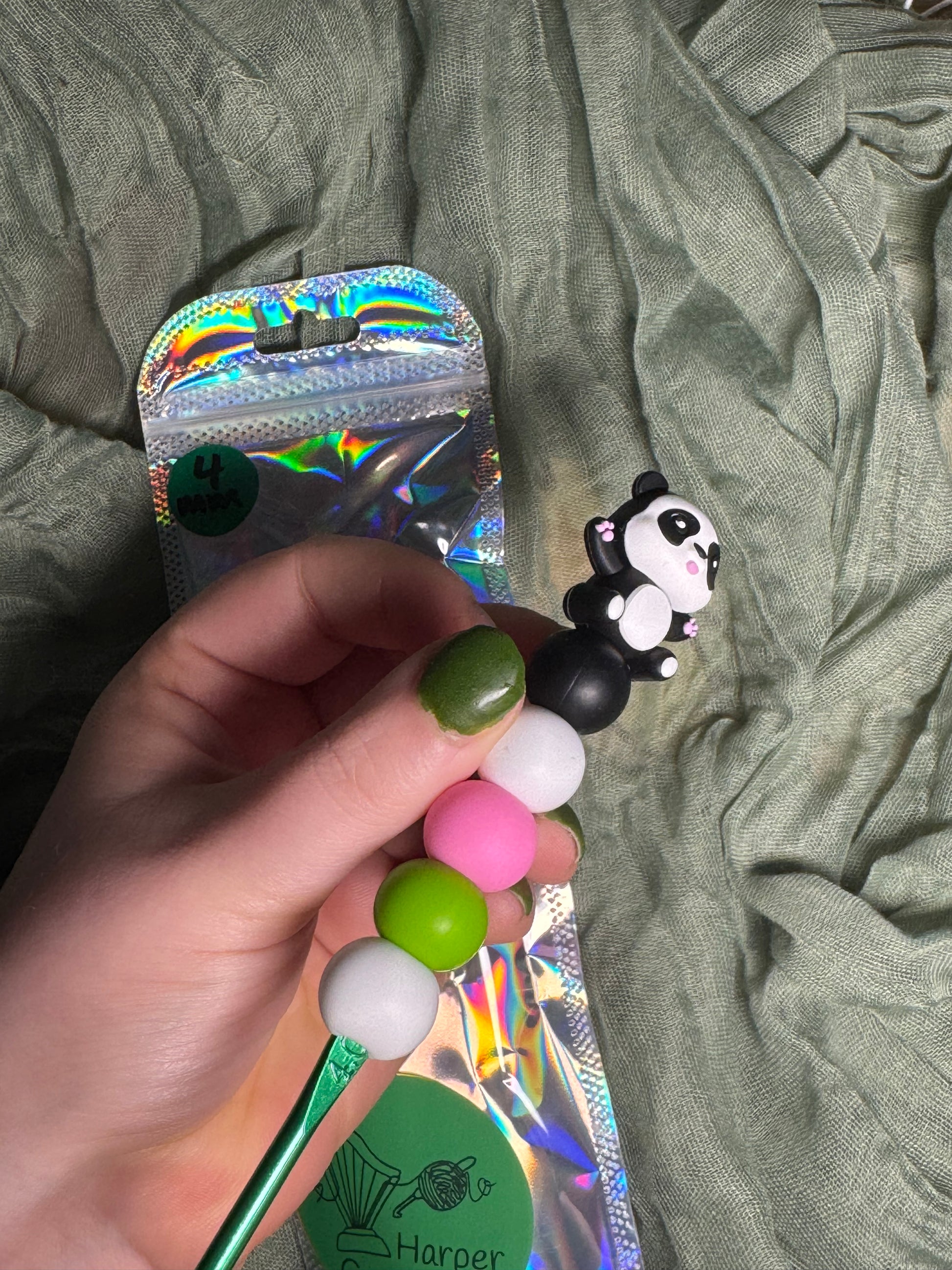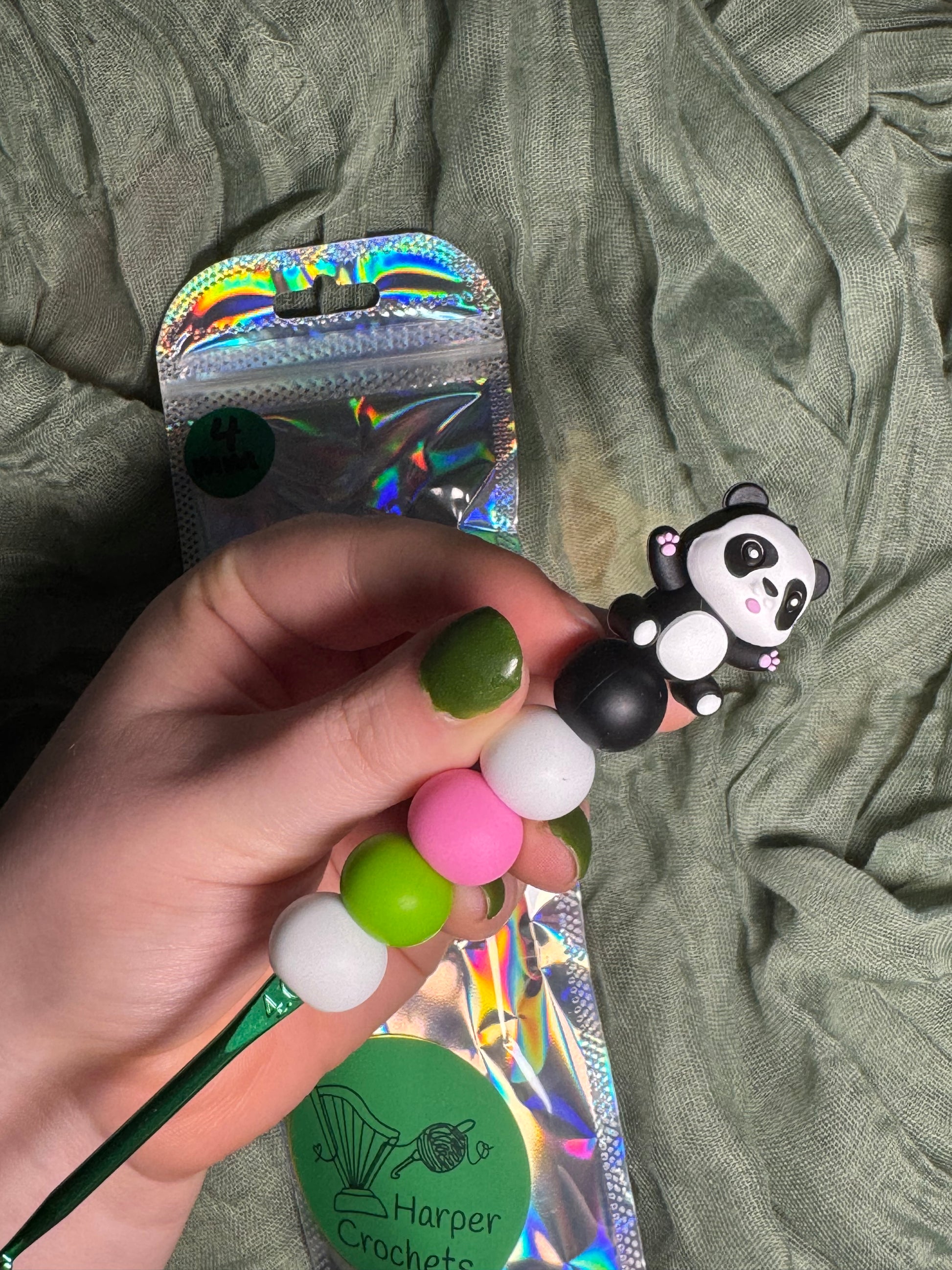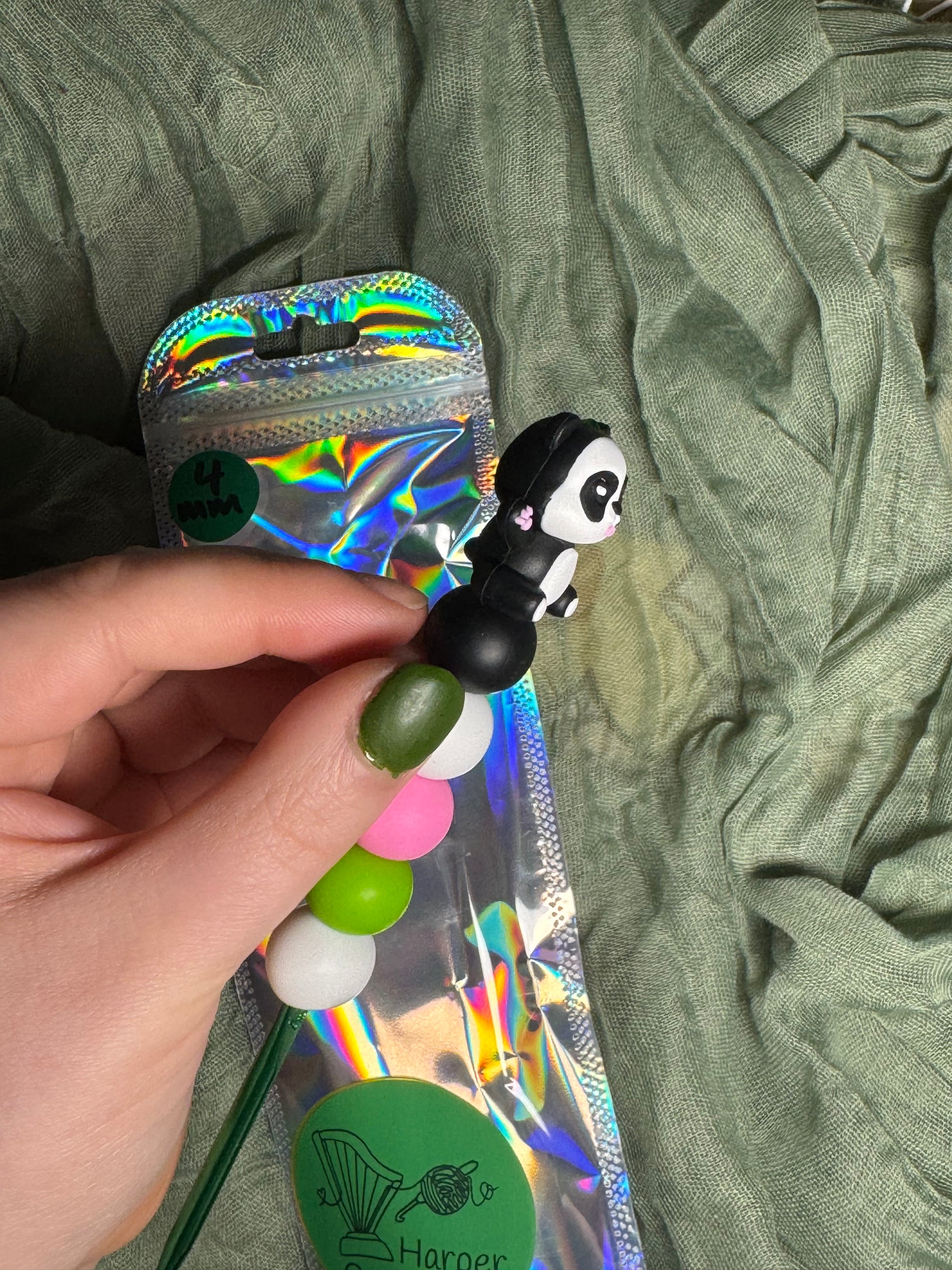 Handmade beaded crochet hook with cute 3D panda topper and colour themed beads in a size 4mm hook.