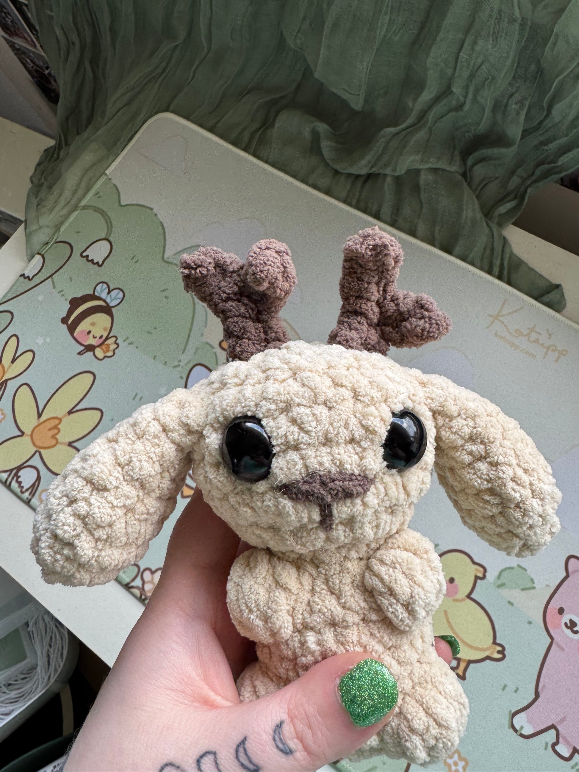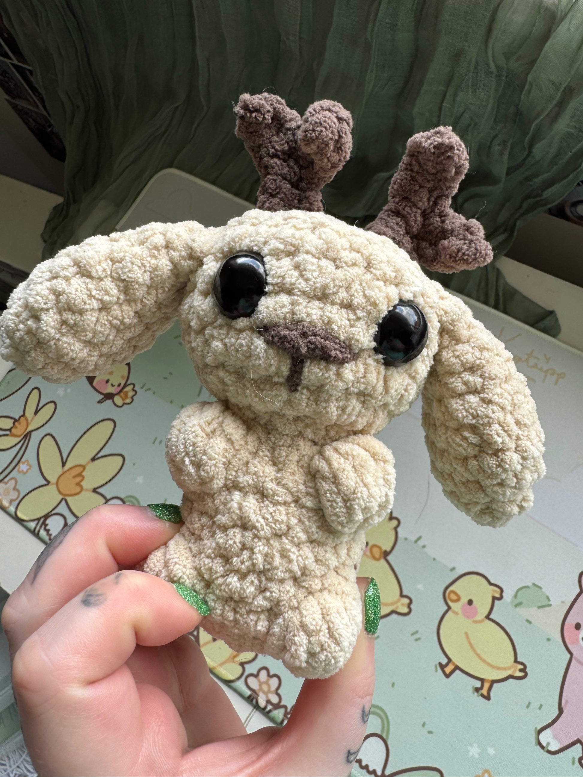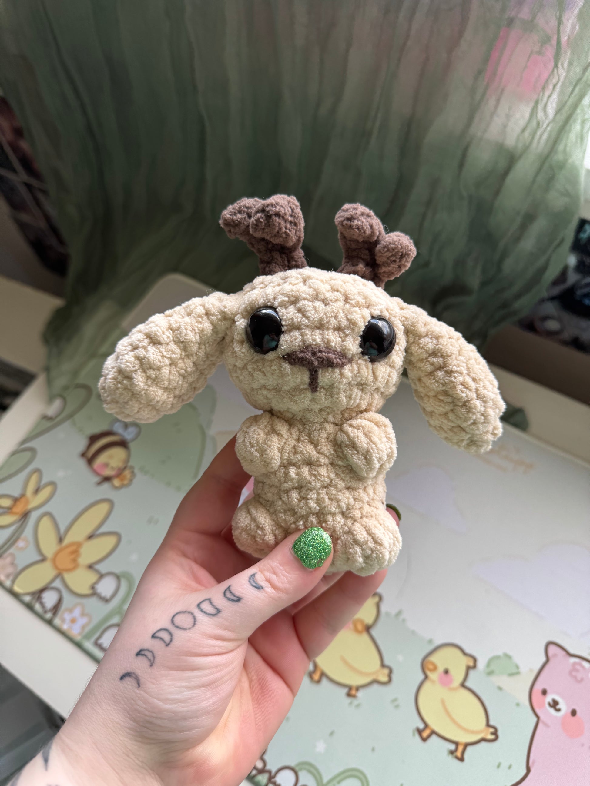 This little bunny cryptid needs a home! The Jackalope is a popular cryptid from folklore and legends, probably because it's so cute! This Jackalope is made in a light tan/ beige yarn for the body with fluffy white bunny rabbit tail, and... antlers? Yep, this is no ordinary bunny, and the antlers stand up from the head in a dark brown colour that matches the nose!