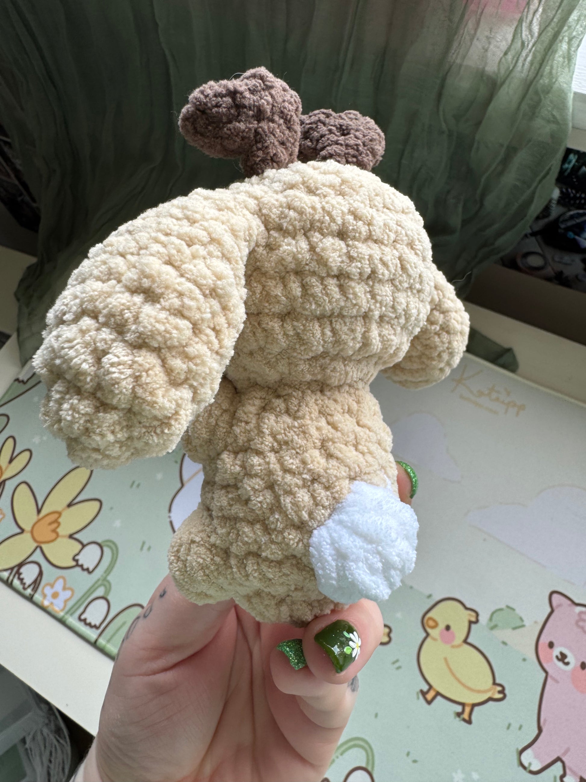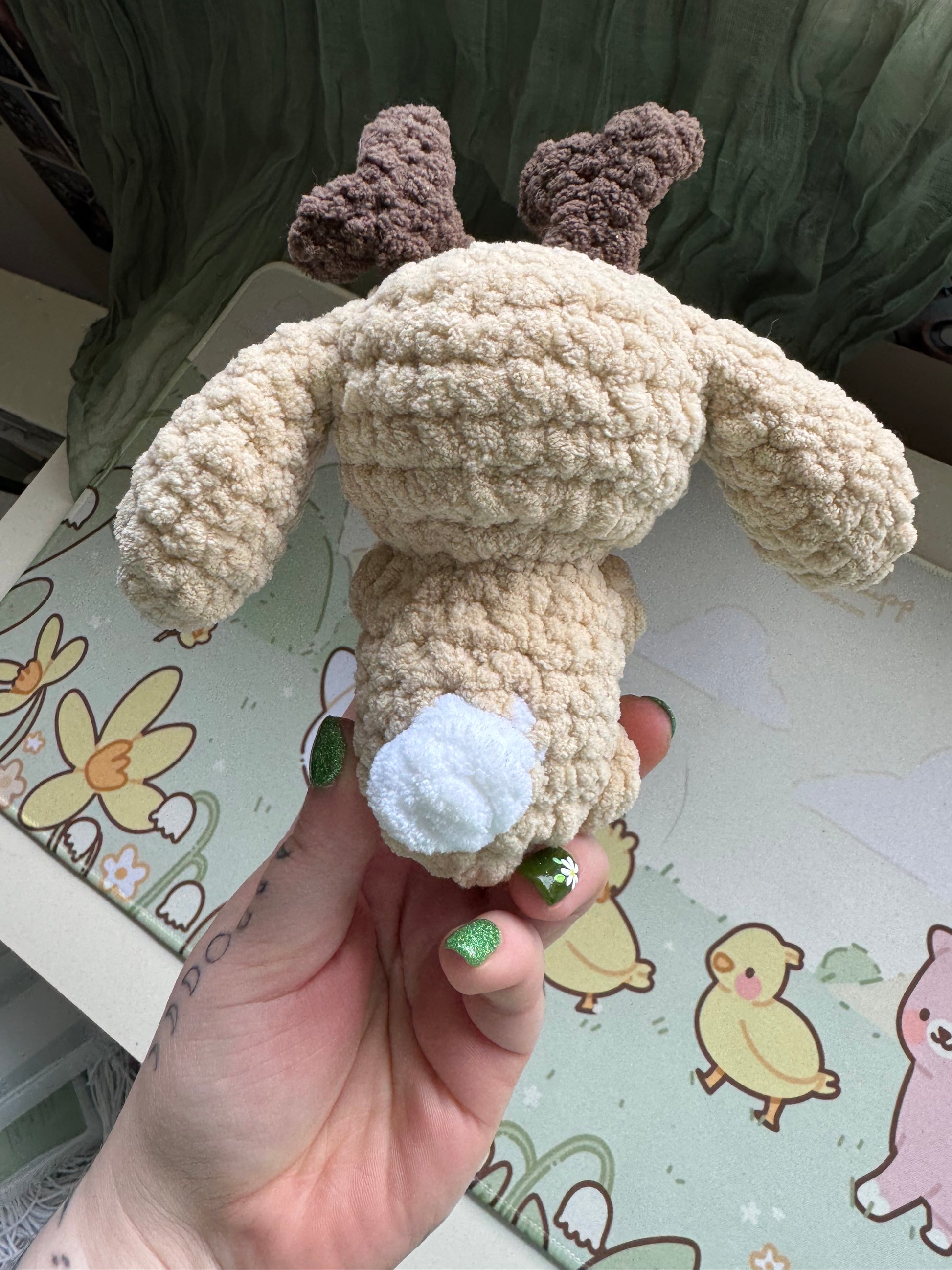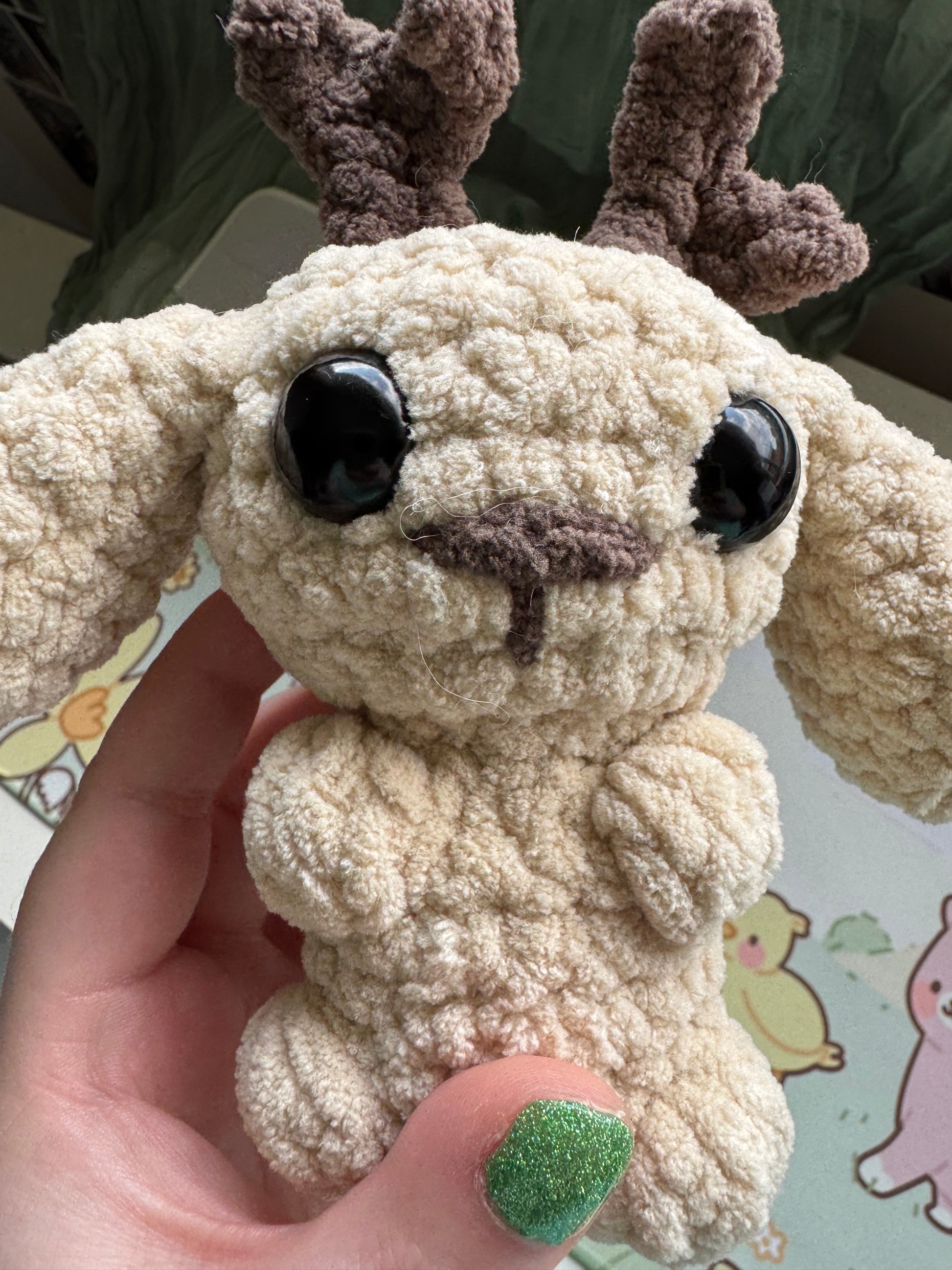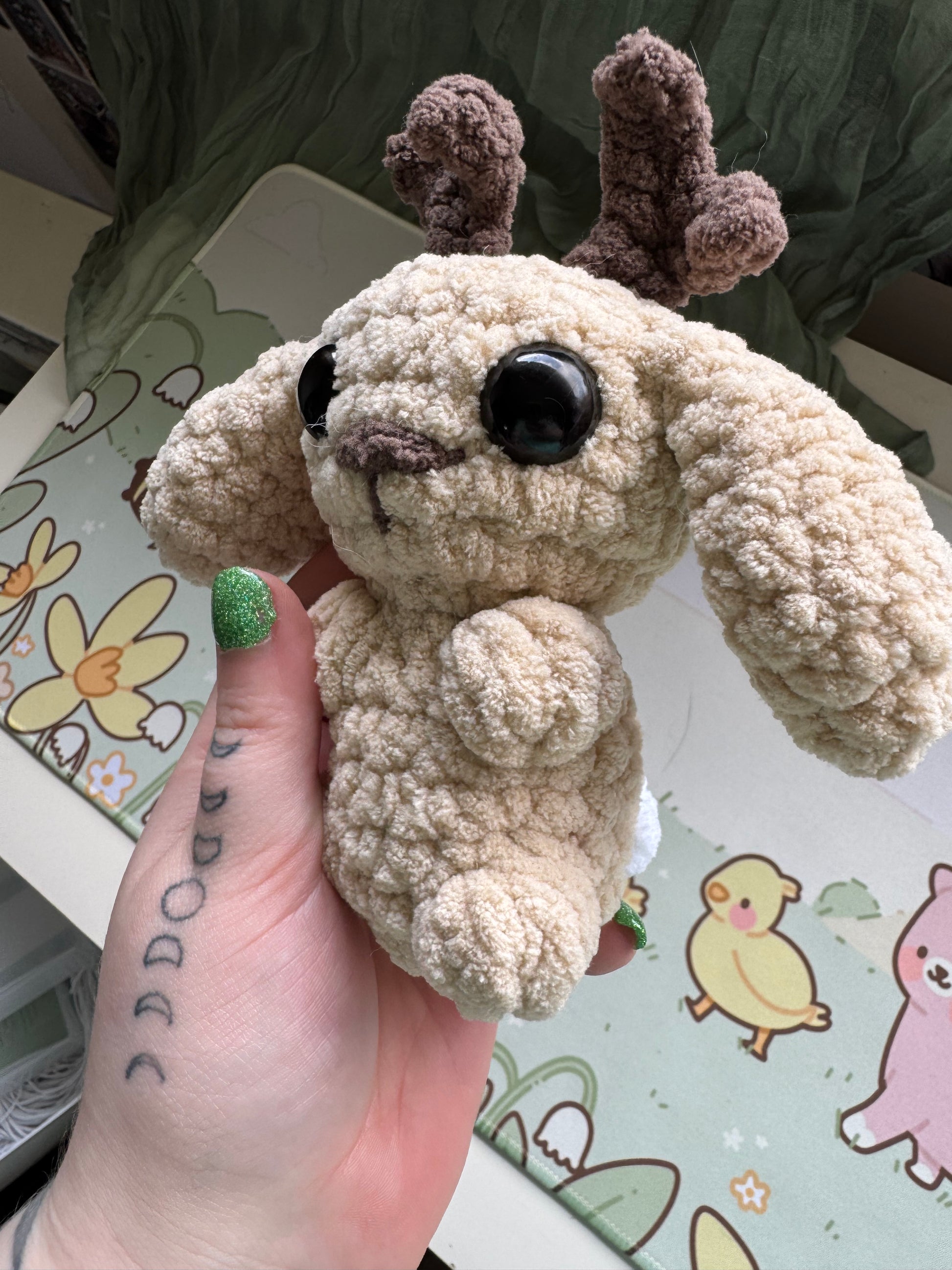 This little bunny cryptid needs a home! The Jackalope is a popular cryptid from folklore and legends, probably because it's so cute! This Jackalope is made in a light tan/ beige yarn for the body with fluffy white bunny rabbit tail, and... antlers? Yep, this is no ordinary bunny, and the antlers stand up from the head in a dark brown colour that matches the nose!