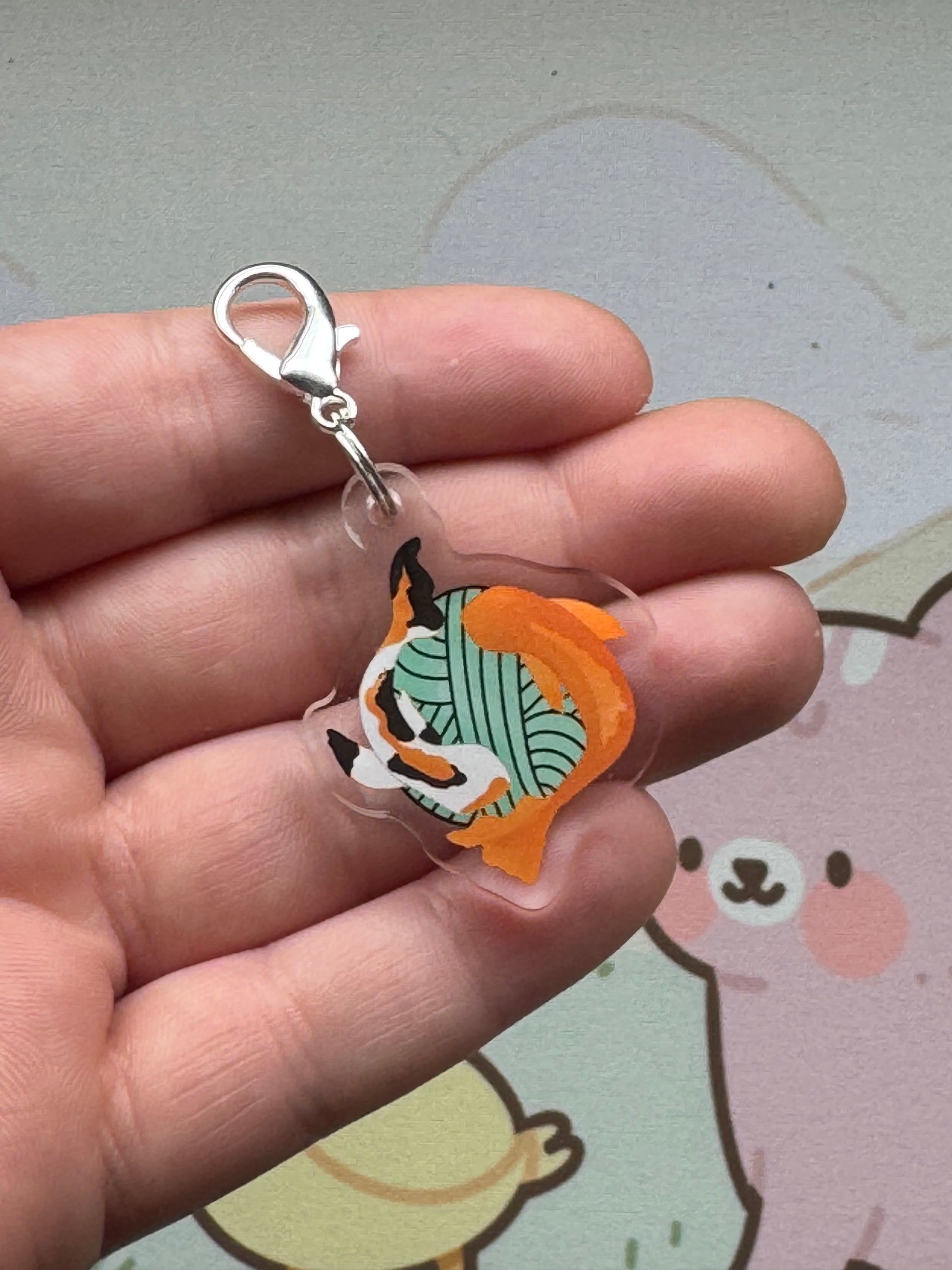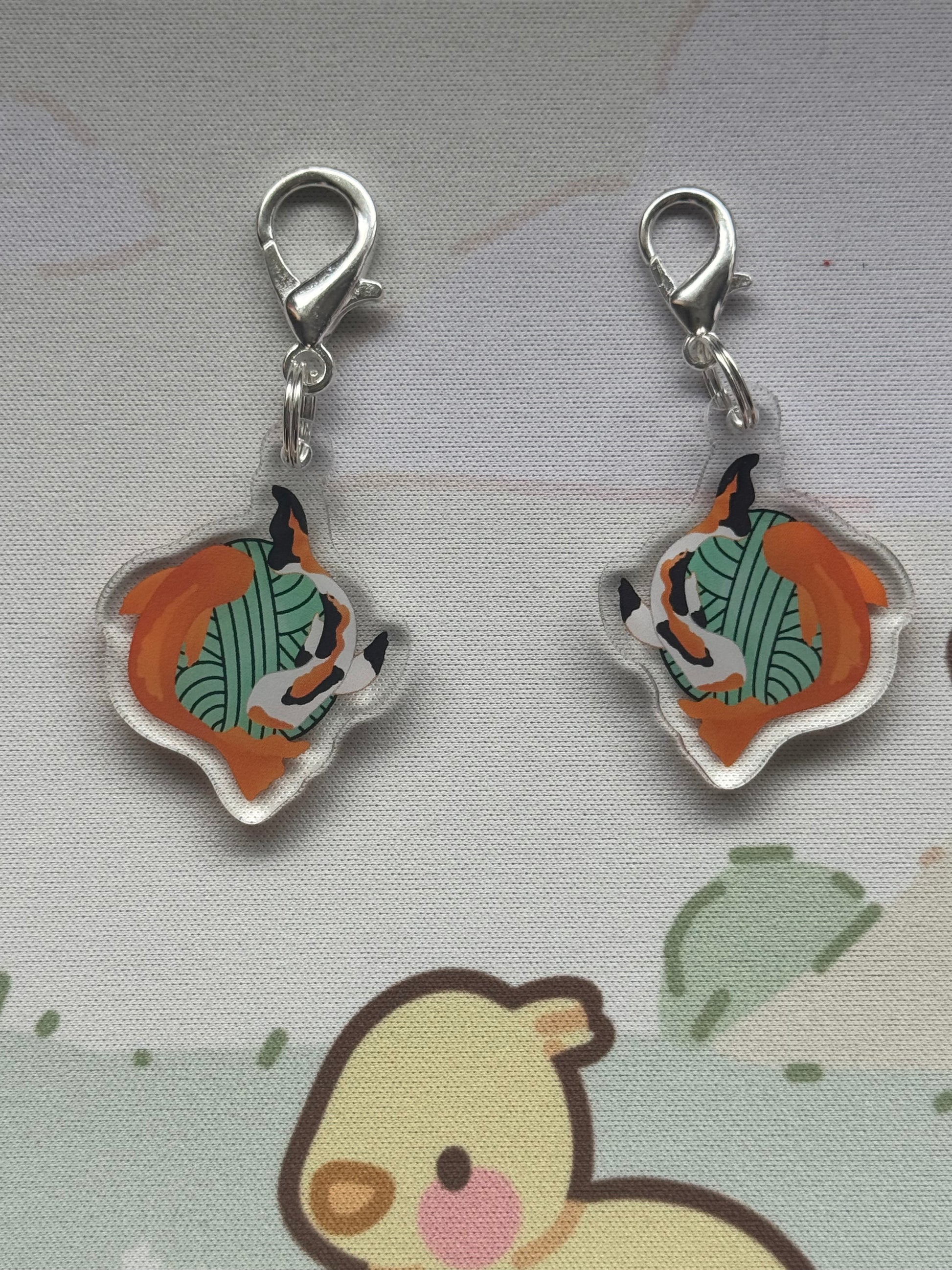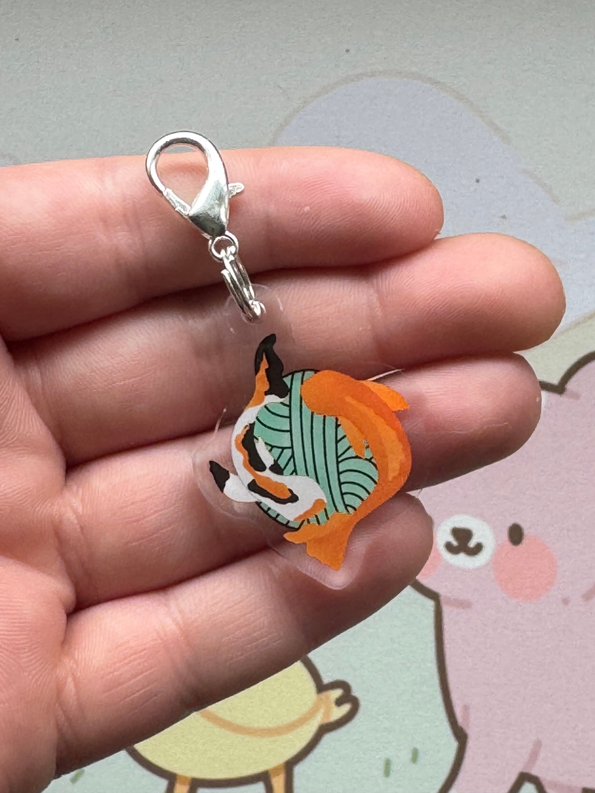Designed by me (Harper), this stitch marker features a double sided printed 1.5 inch charm with my Yin and Yang style koi fish circling a yarn pond design on! The metal parts are a 10mm split ring (making it easy to change the clasp type!) and a 23mm or 18mm lobster clasp, which are the perfect size for larger projects with bulky yarn or smaller projects with thicker yarn!