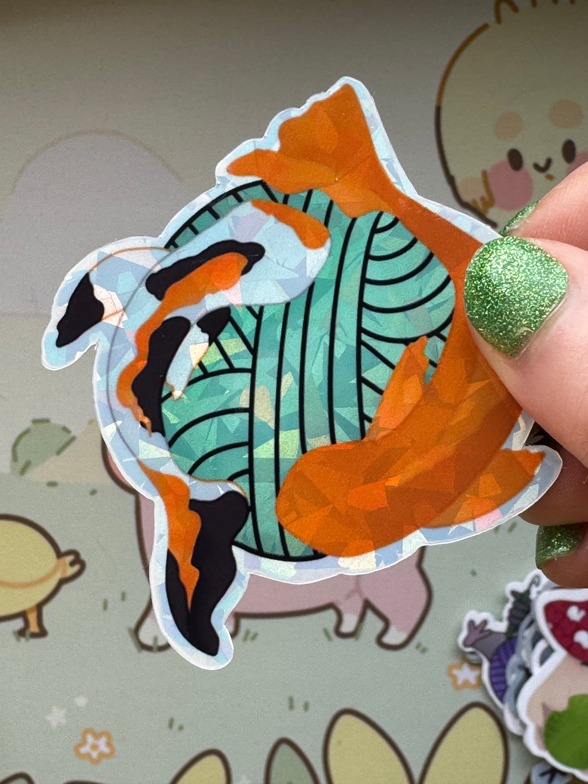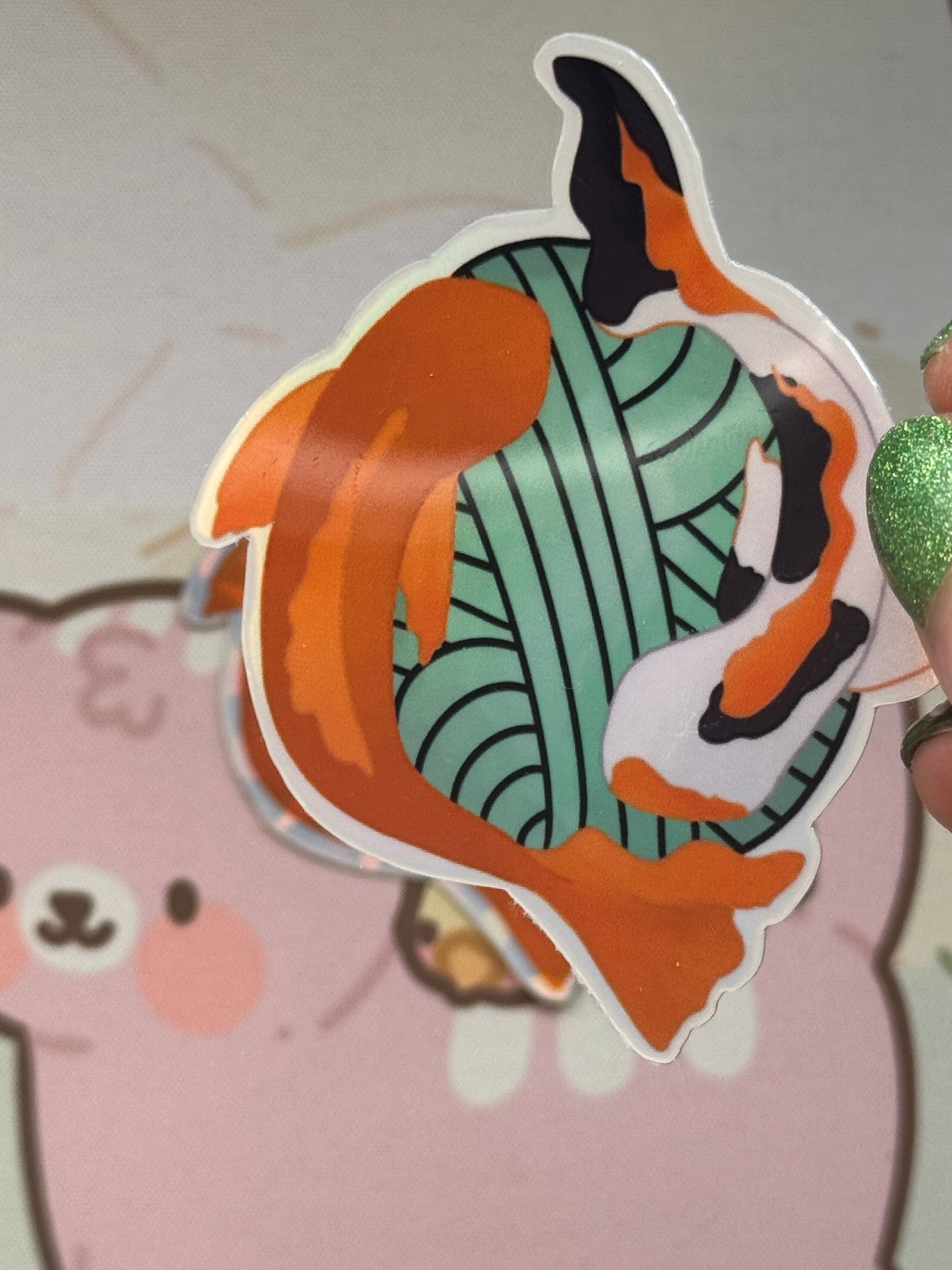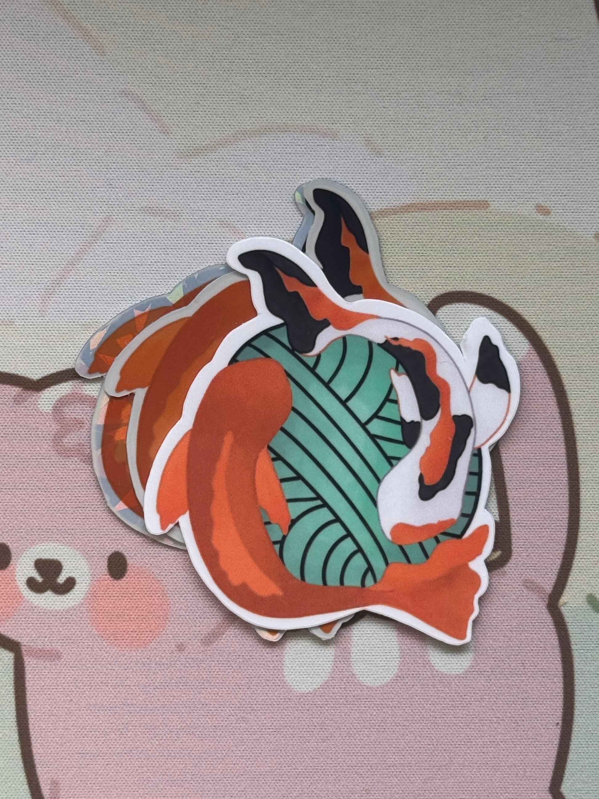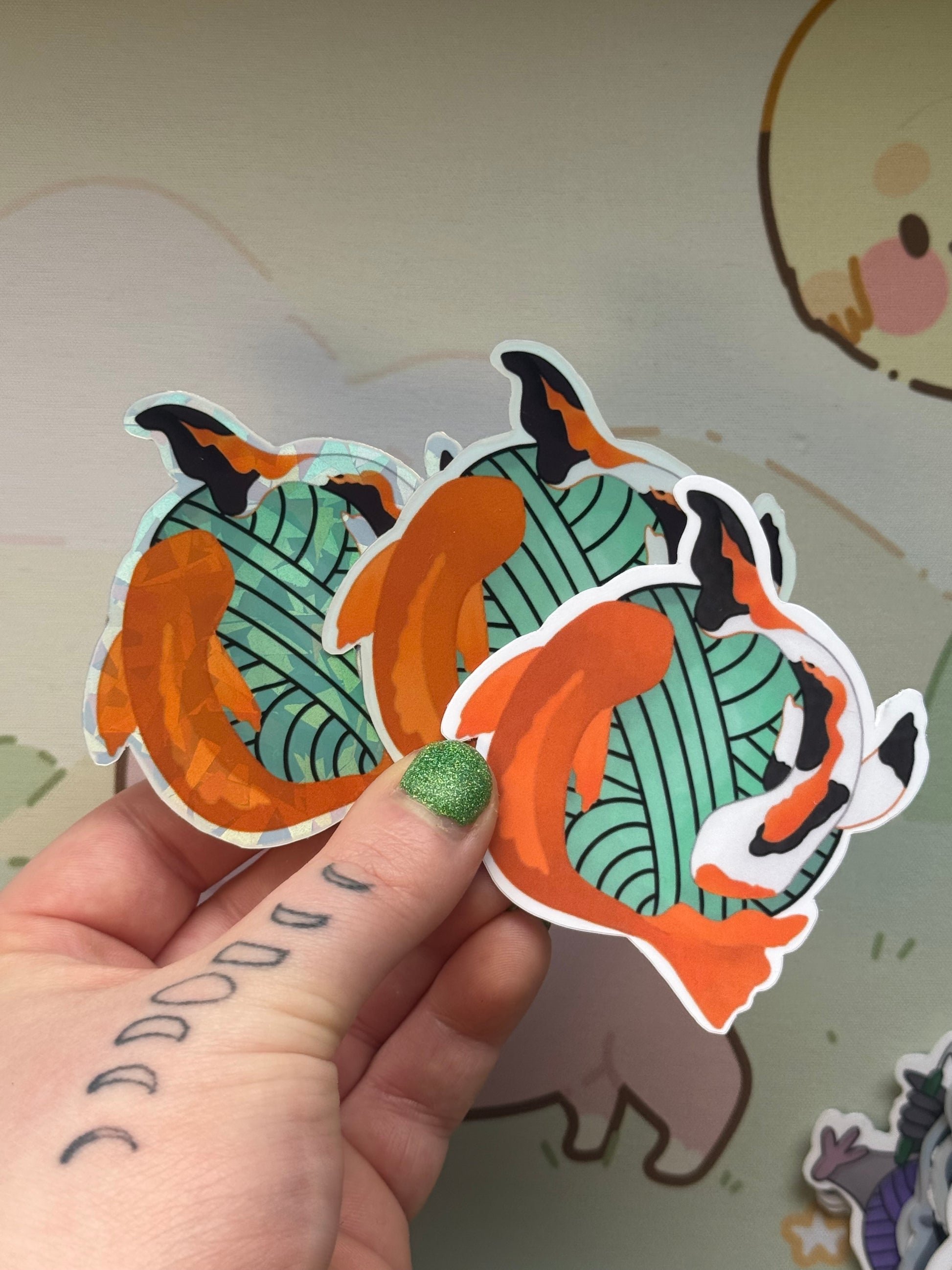 This sticker shows two decorative koi fish swimming around on a circular pond of yarn!! It comes in 3 finishes: white glossy, rainbow holographic, or cracked glass holographic!