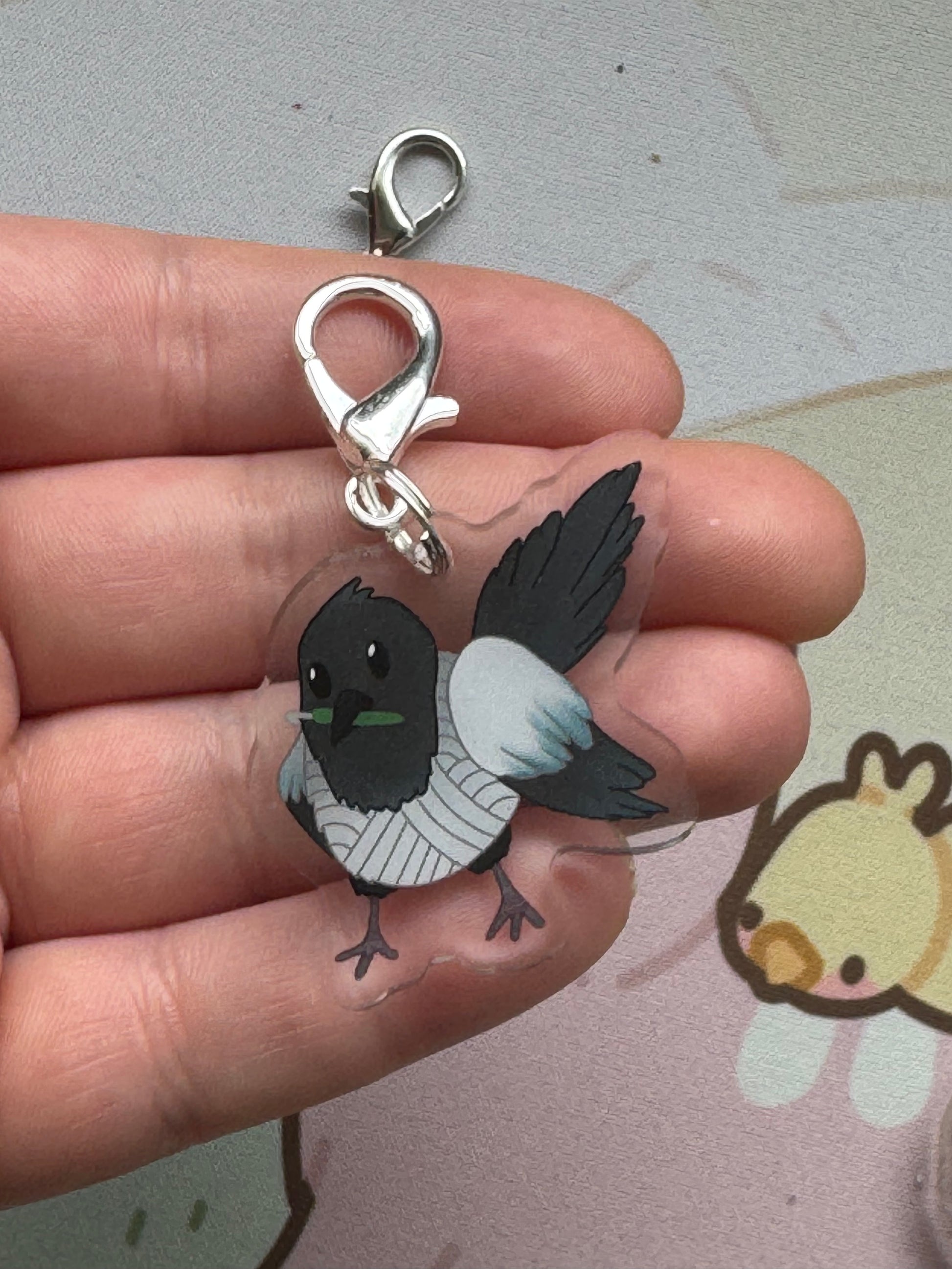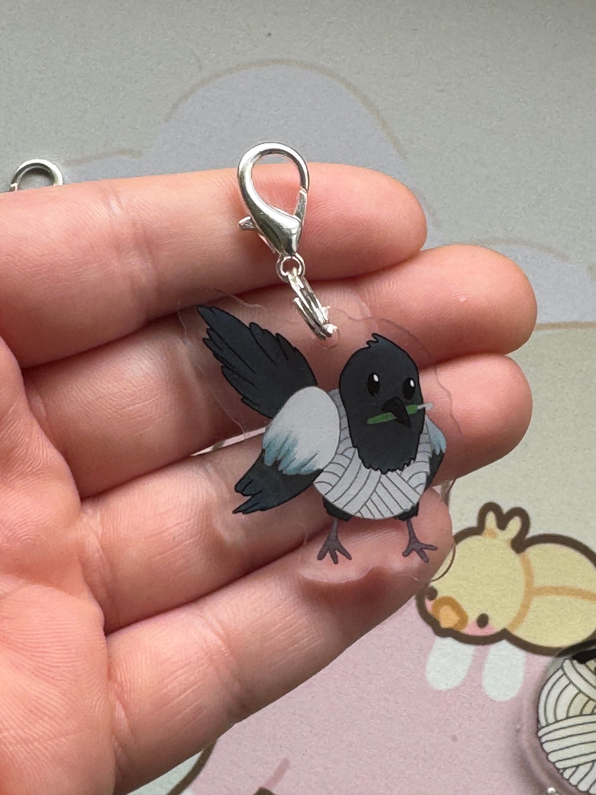 Designed by me (Harper), this stitch marker features a double sided printed 1.5 inch charm with my magpie with a yarn ball body and a crochet hook in its beak design! The metal parts are a 10mm split ring (making it easy to change the clasp type!) and a 23mm or 18mm lobster clasp, which are the perfect size for larger projects with bulky yarn or smaller projects with thicker yarn!