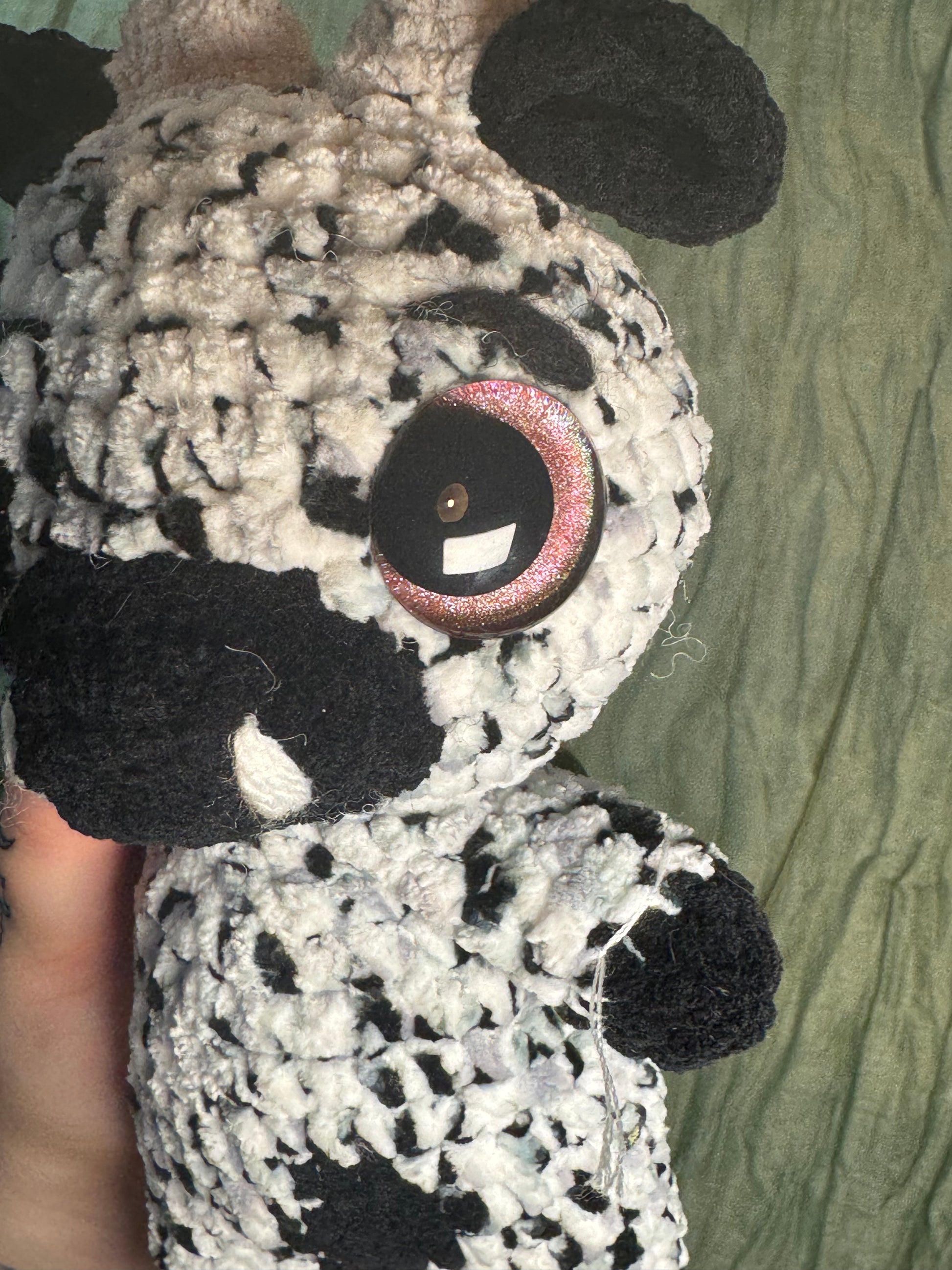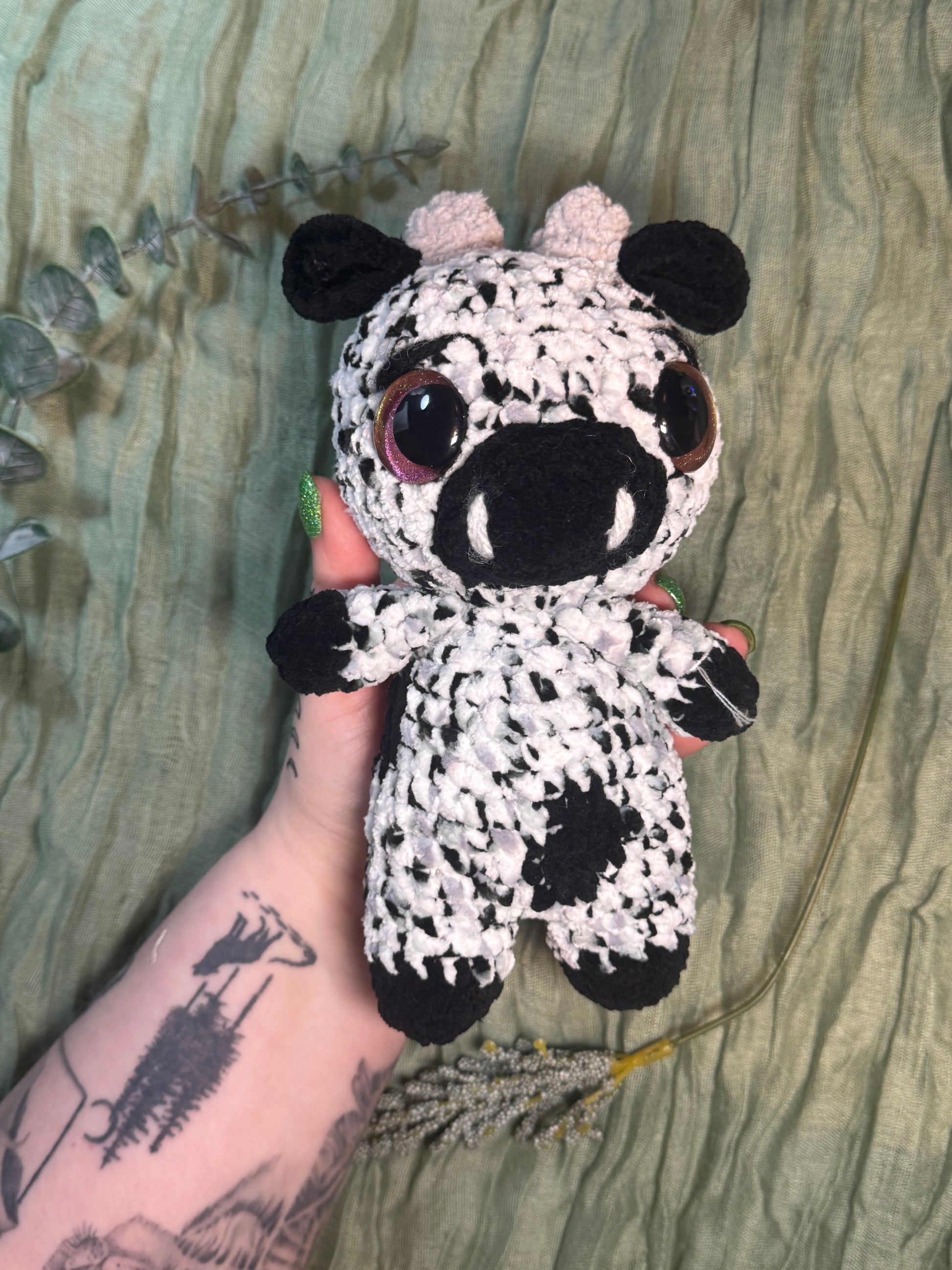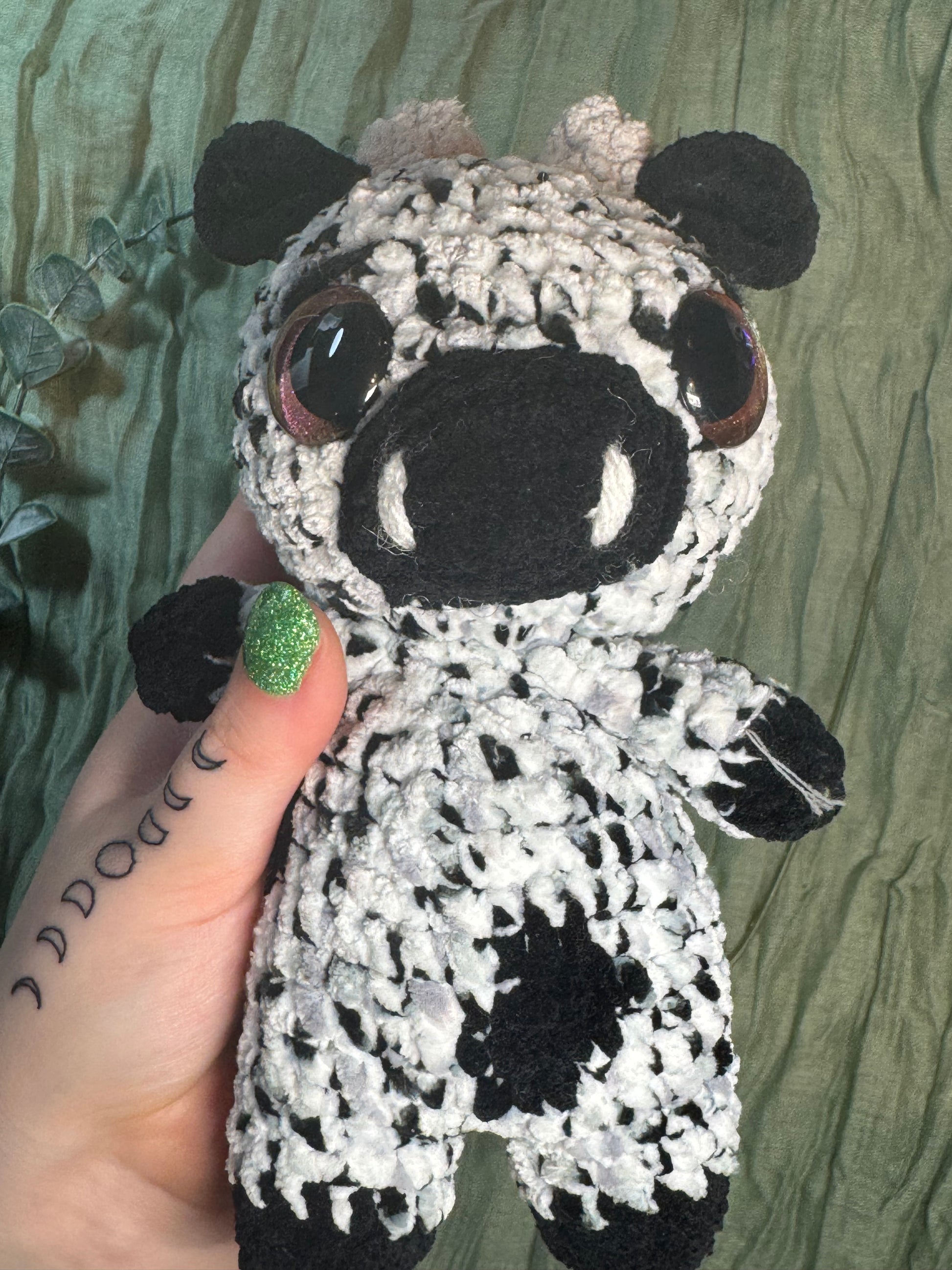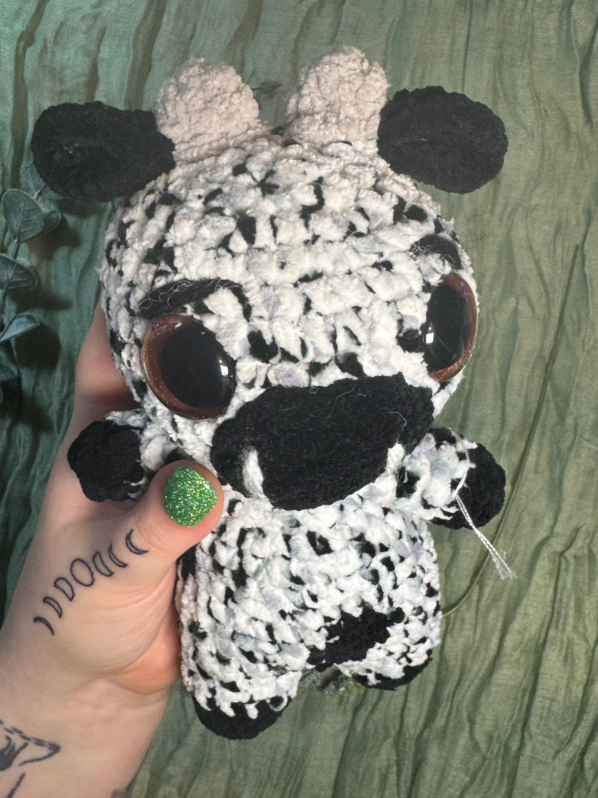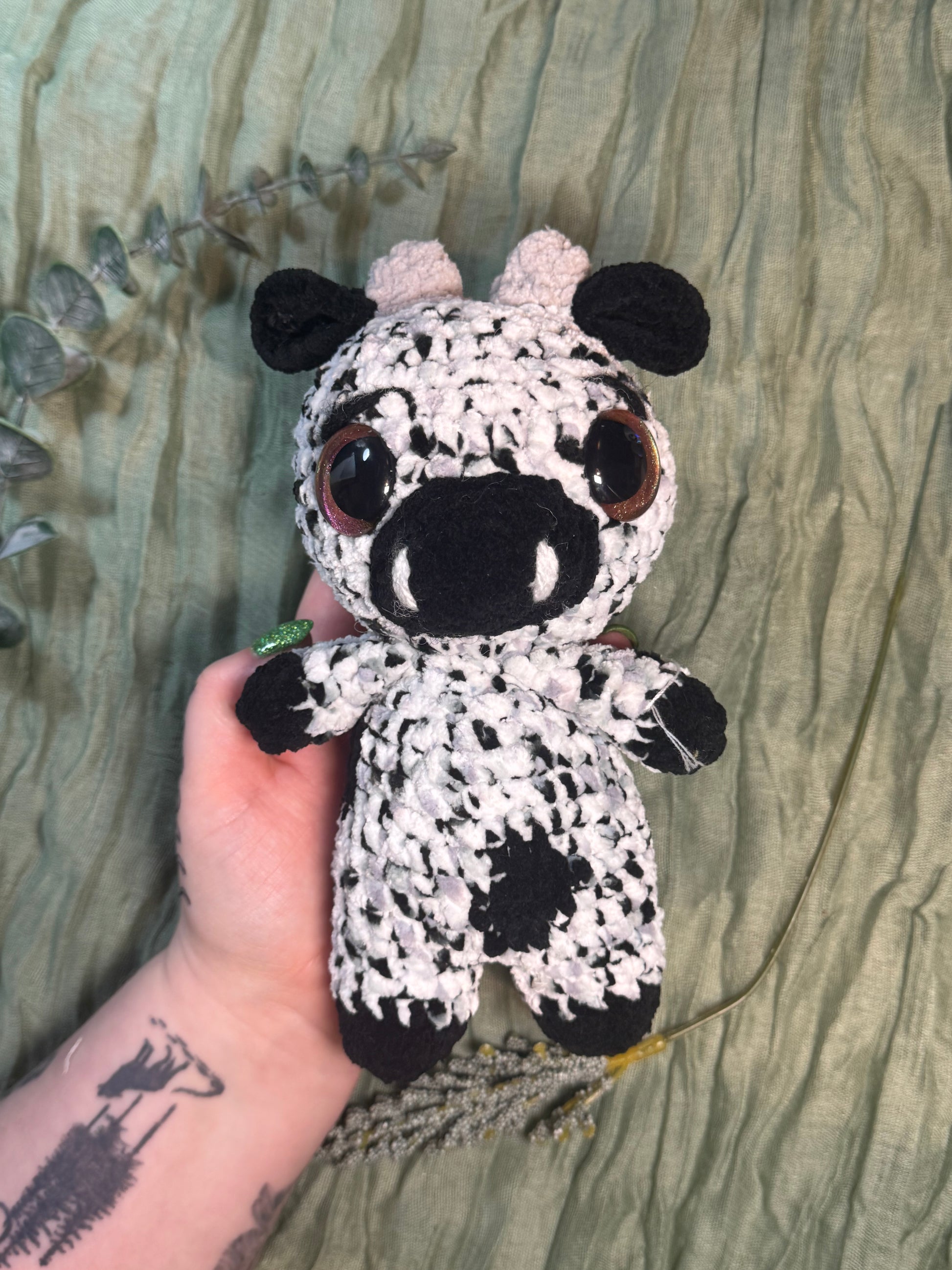 This cute, chunky, speckle black/grey/white milk cow needs a home! This cow is medium sized, the right size for cuddling in bed, and tucking under arms! The belly has a spot of black, and all over the rest is speckled and variegated colours of black/ grey/ white. The large colour shifting safety eyes are full of personality for you to give them! The eyes are hand painted, specifically for this plushie!