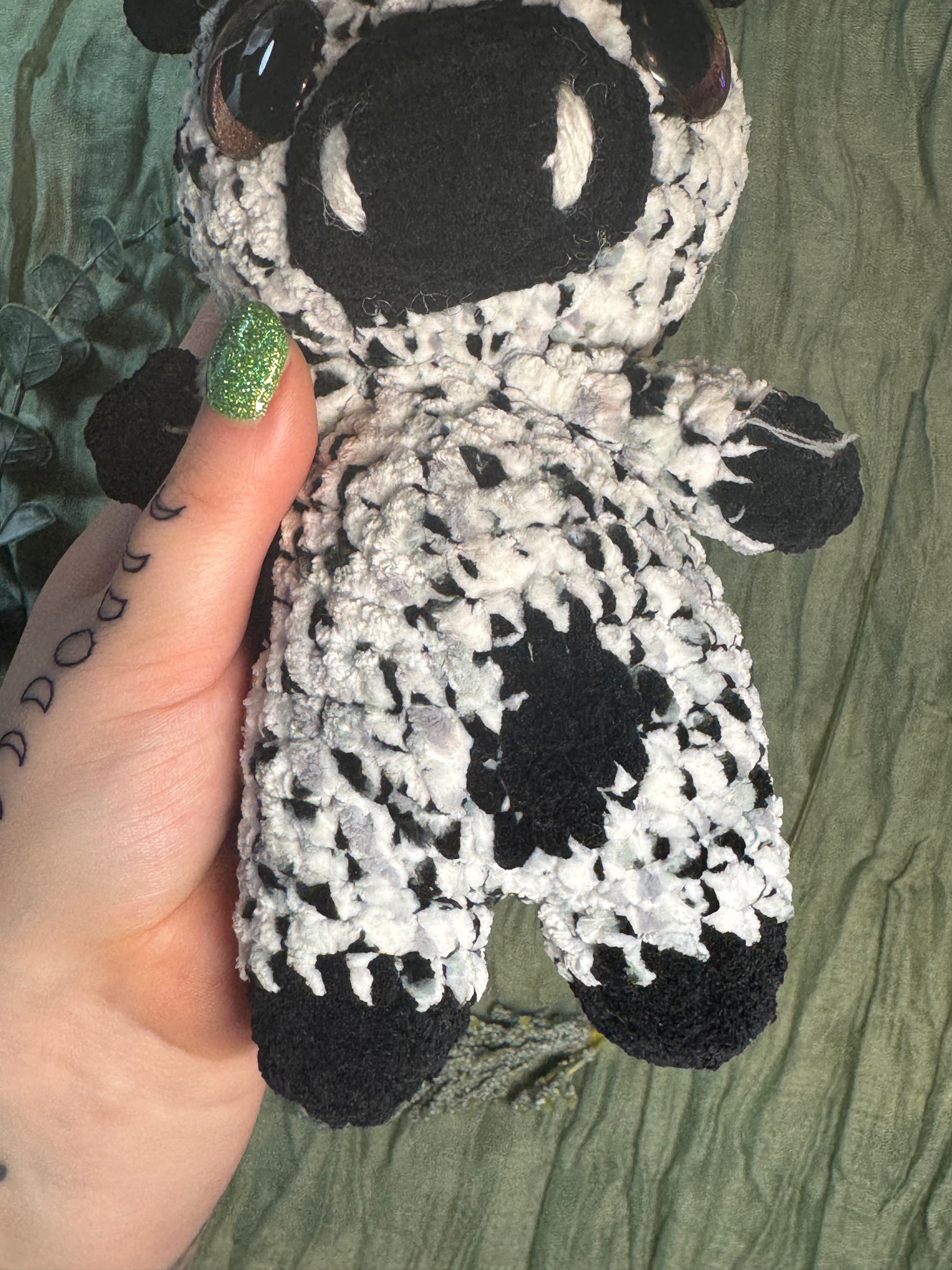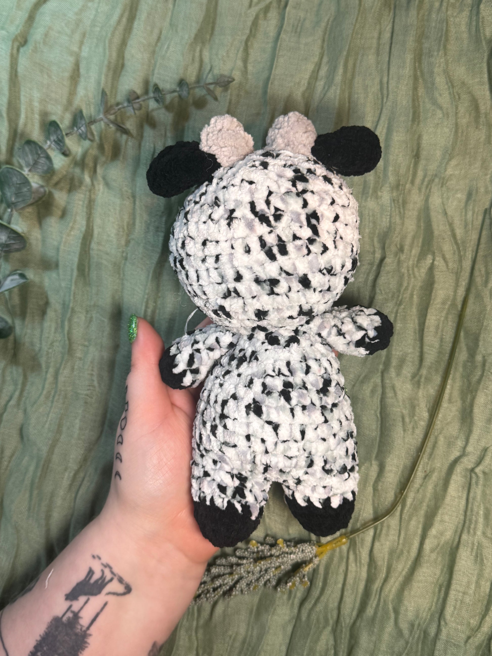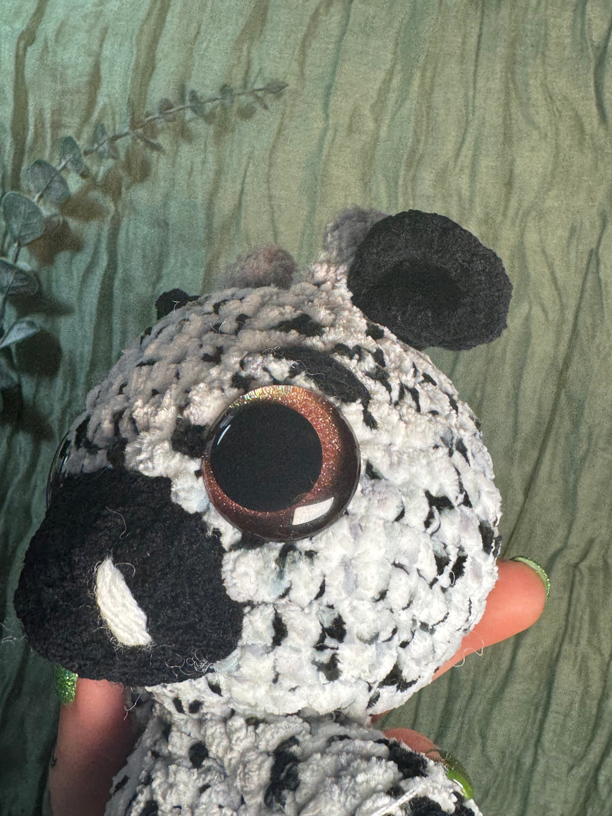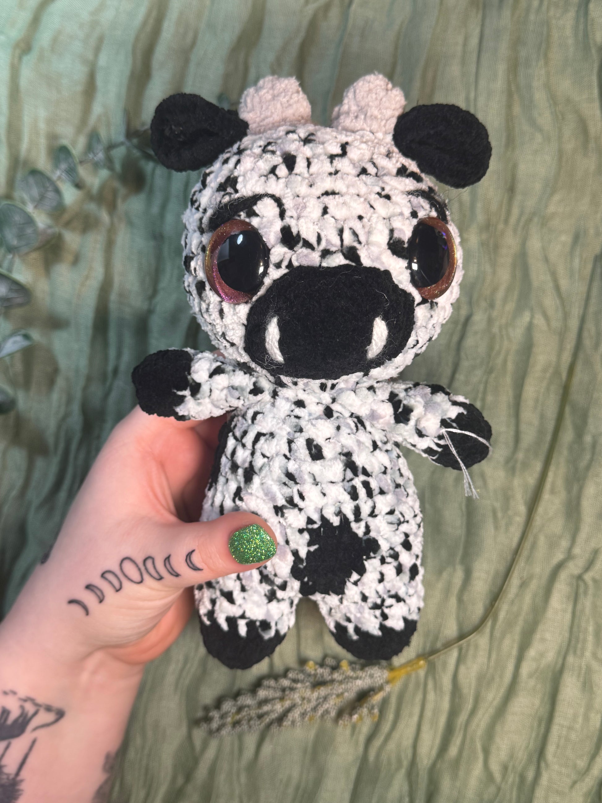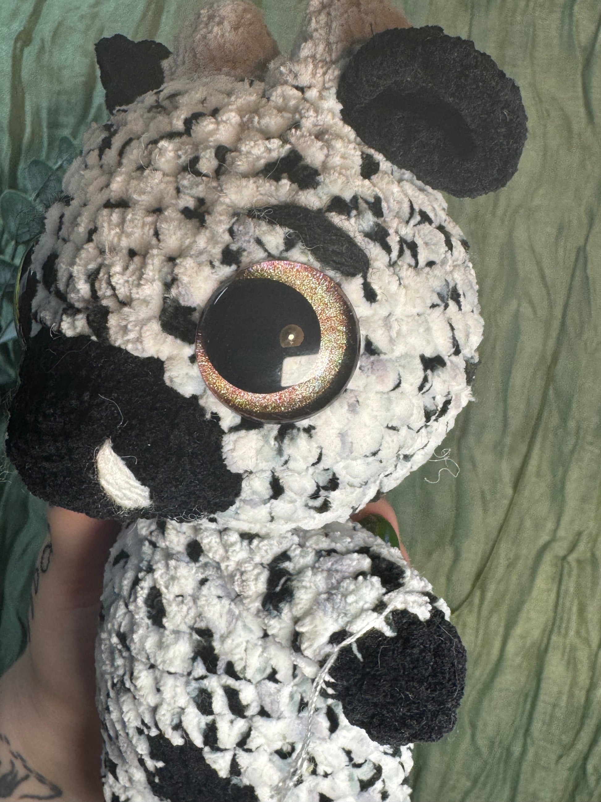 This cute, chunky, speckle black/grey/white milk cow needs a home! This cow is medium sized, the right size for cuddling in bed, and tucking under arms! The belly has a spot of black, and all over the rest is speckled and variegated colours of black/ grey/ white. The large colour shifting safety eyes are full of personality for you to give them! The eyes are hand painted, specifically for this plushie!