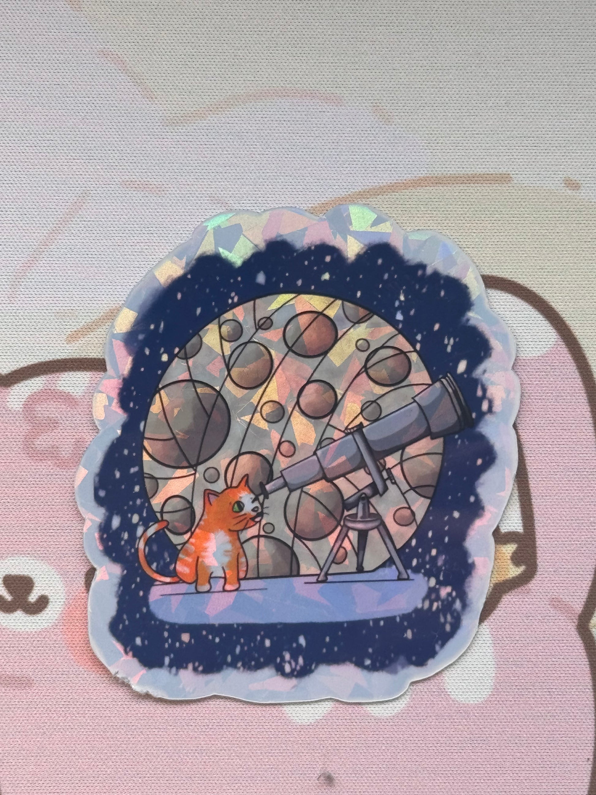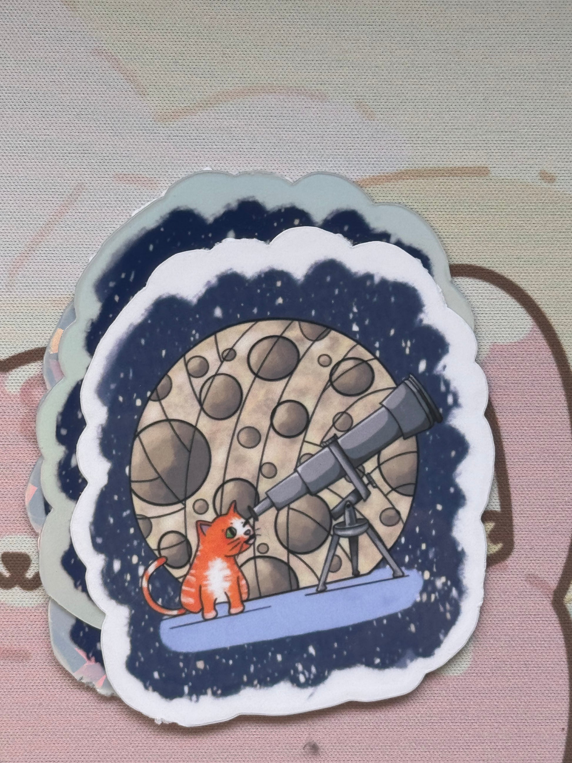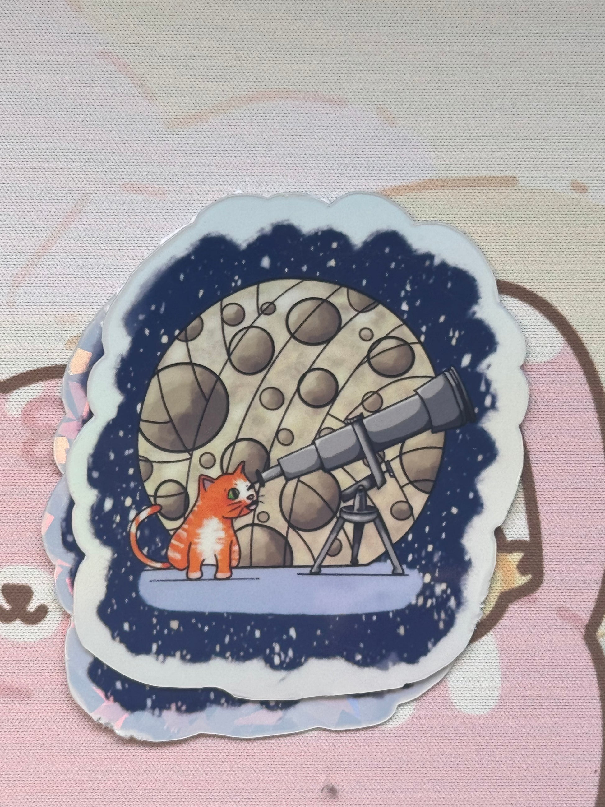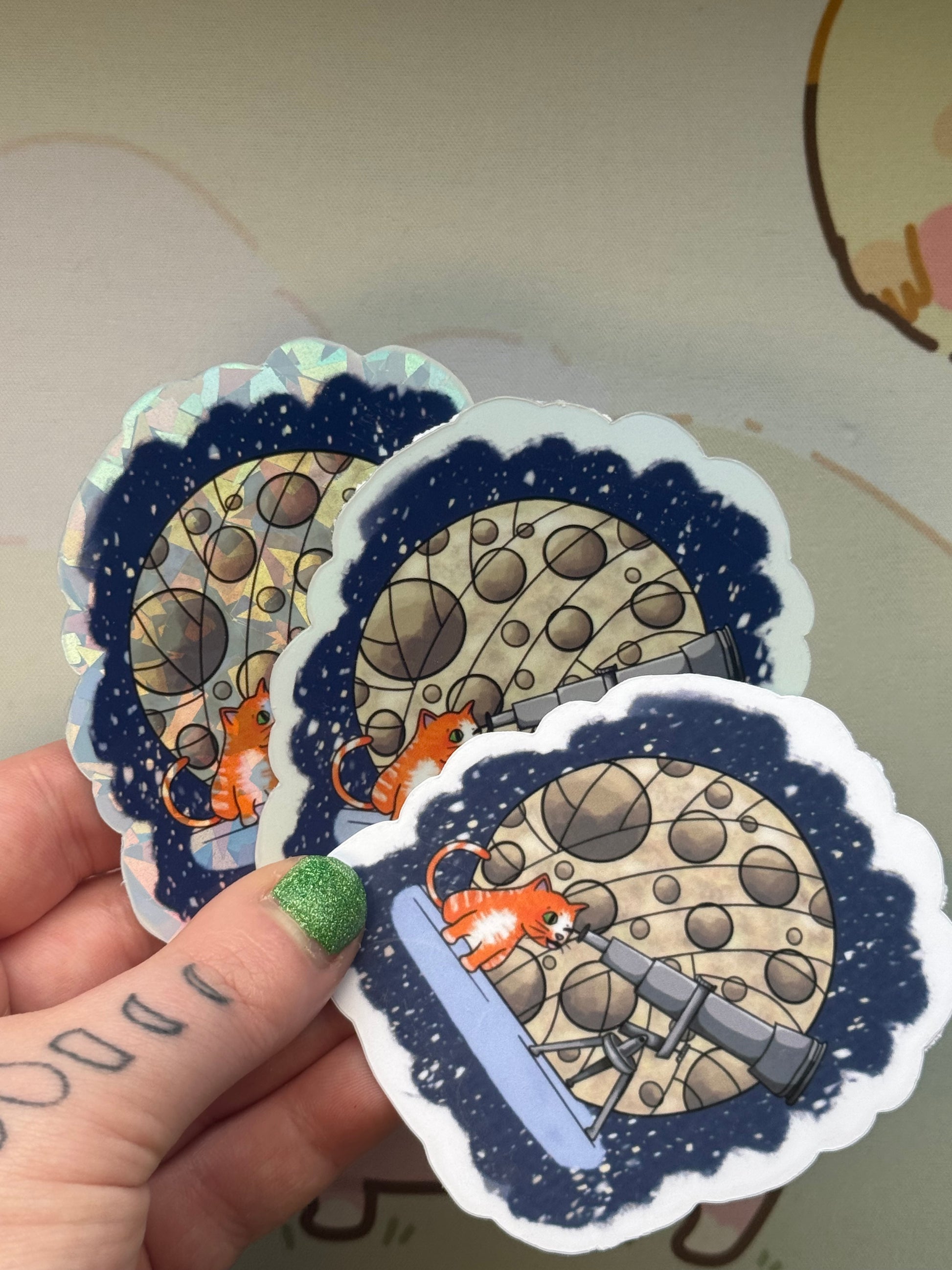 This sticker shows my ginger kitty gazing at the moon through their telescope! It comes in 3 finishes: white glossy, rainbow holographic, or cracked glass holographic!