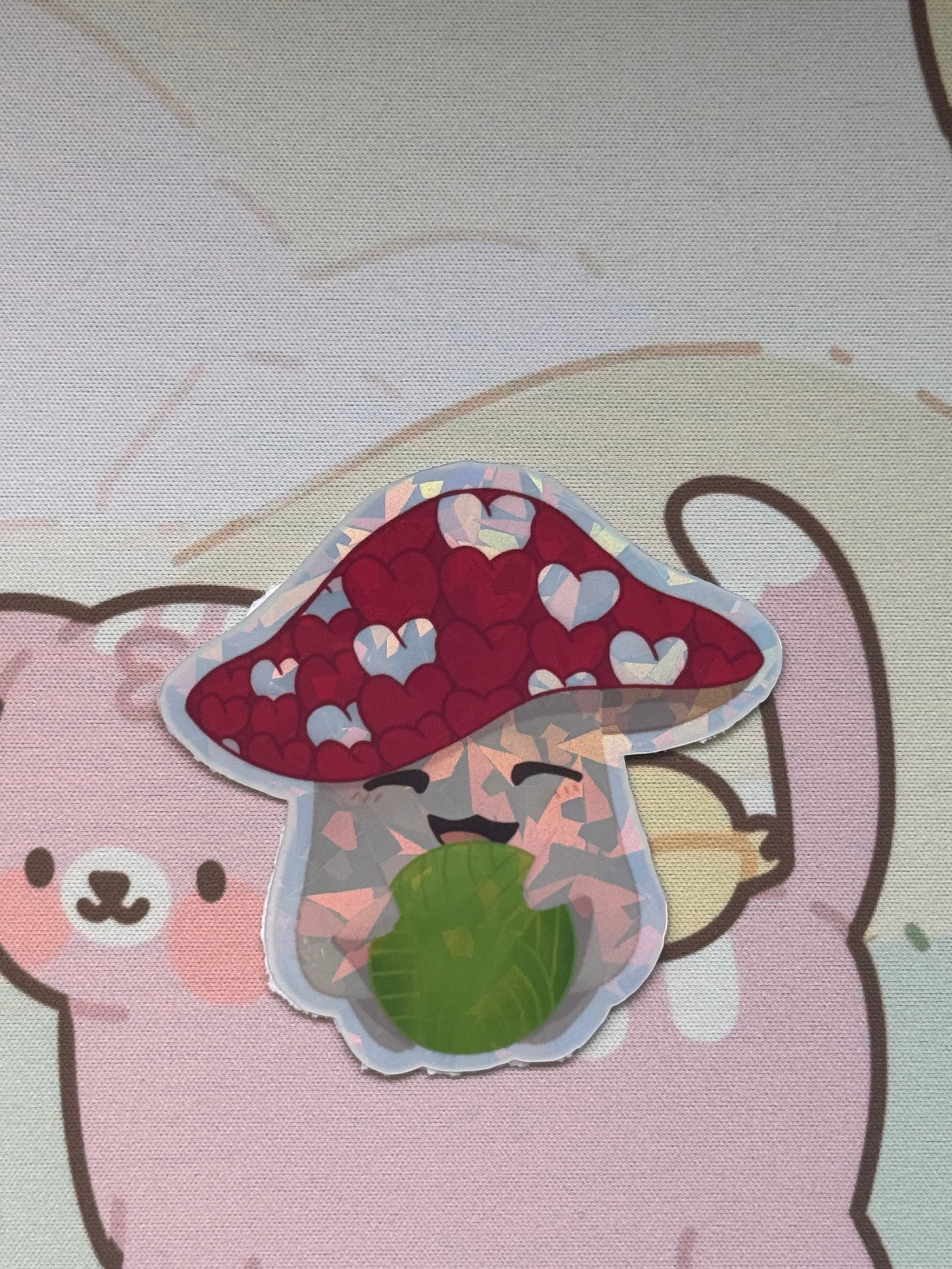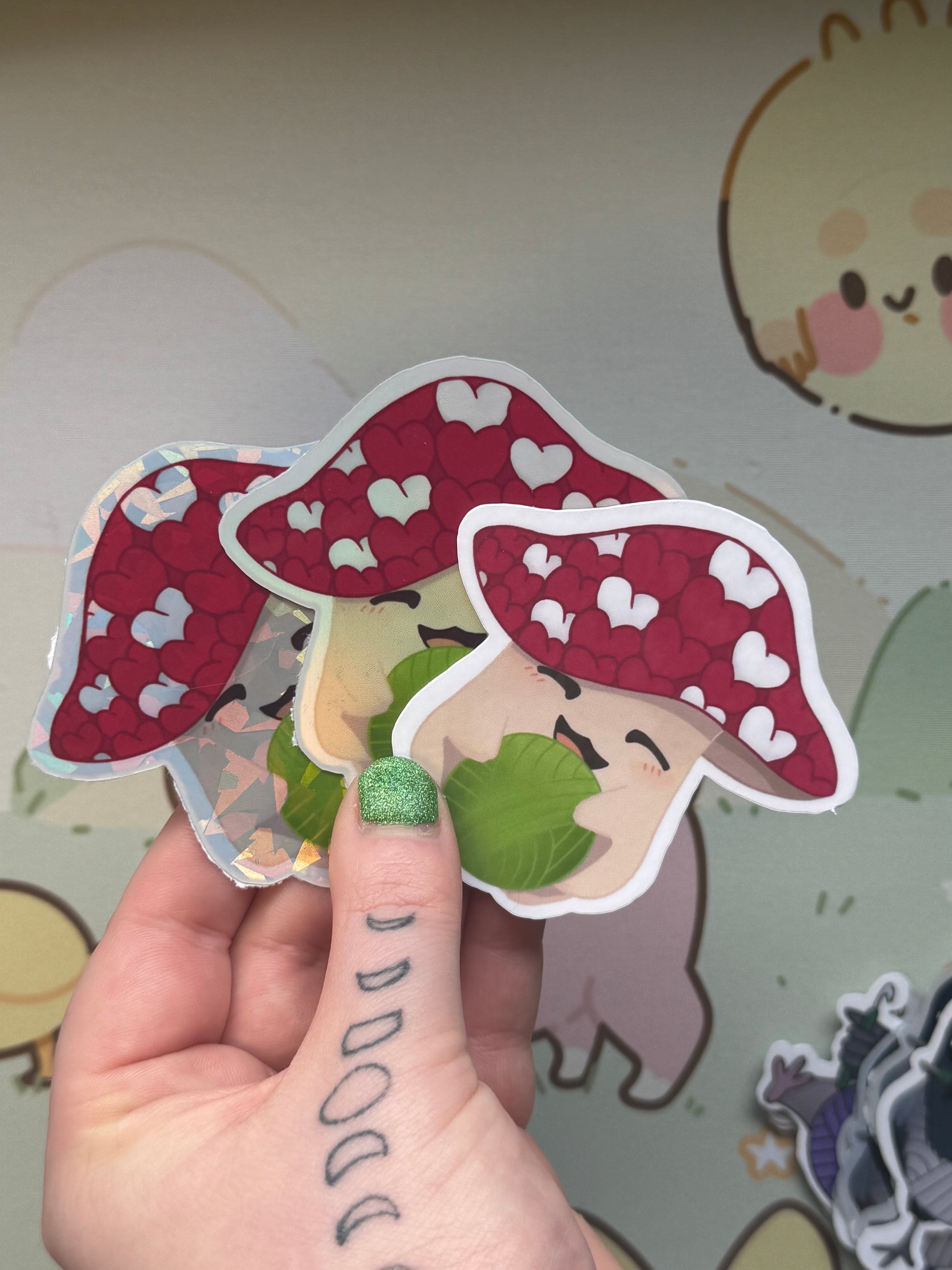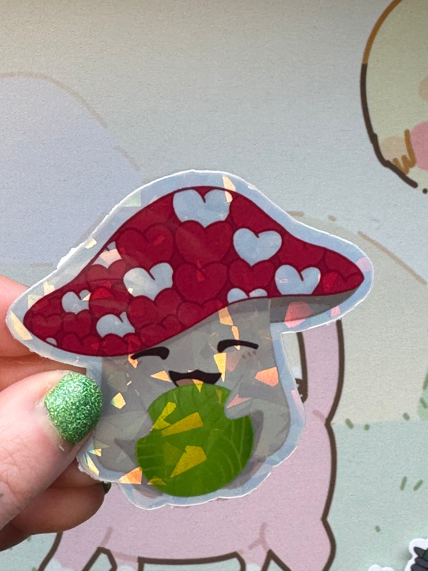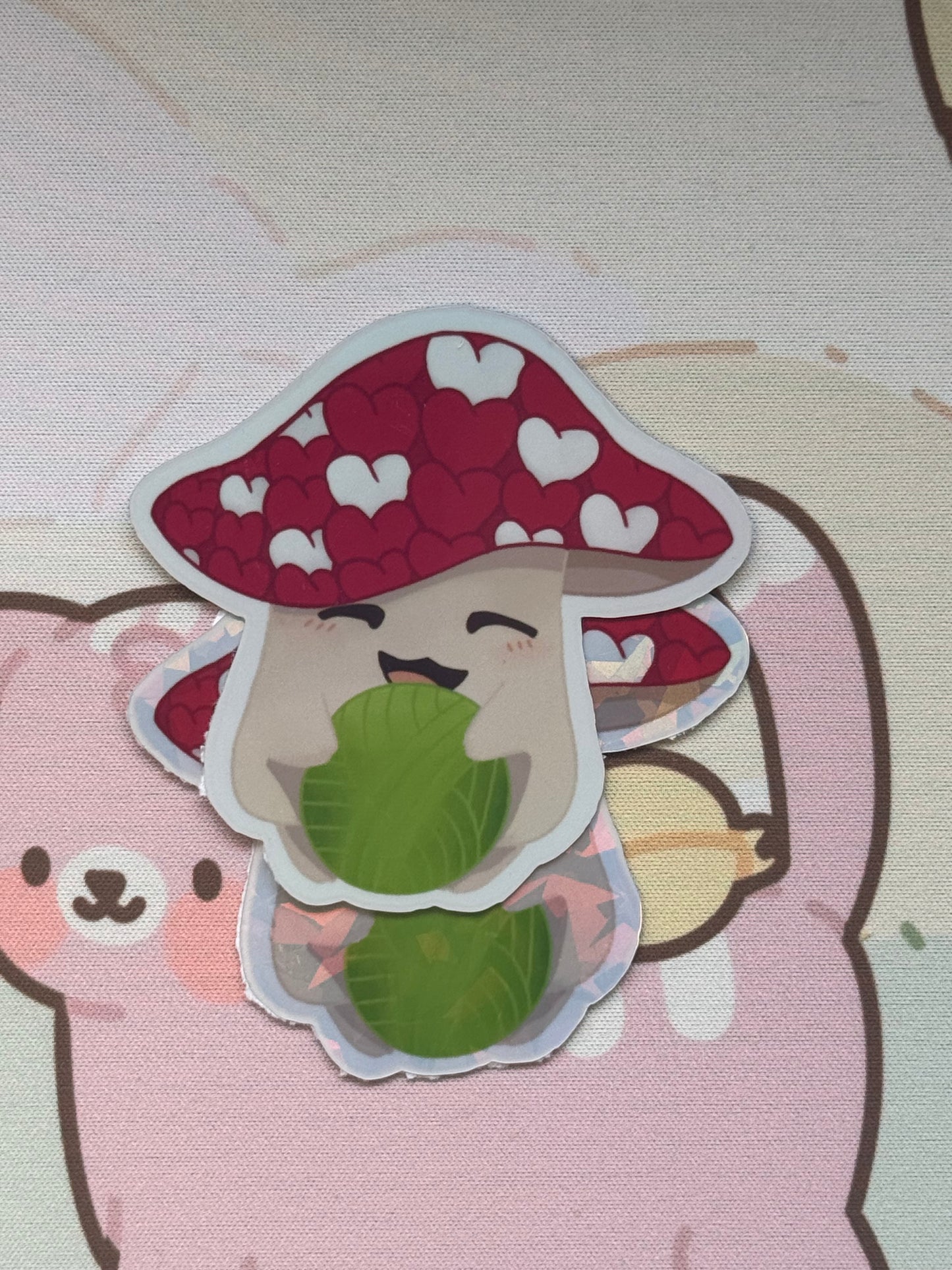 This sticker shows my mushroom holding a ball of yarn design! It comes in 3 finishes: white glossy, rainbow holographic, cracked glass holographic!