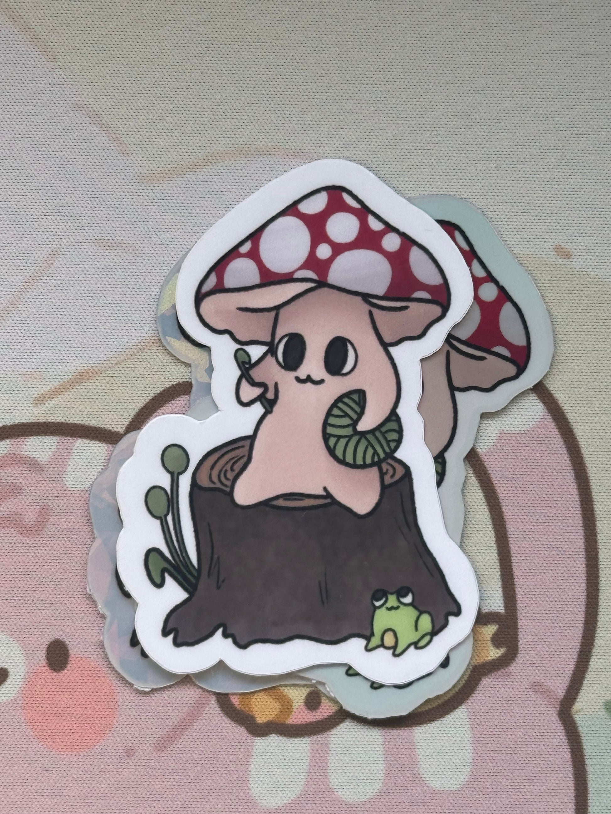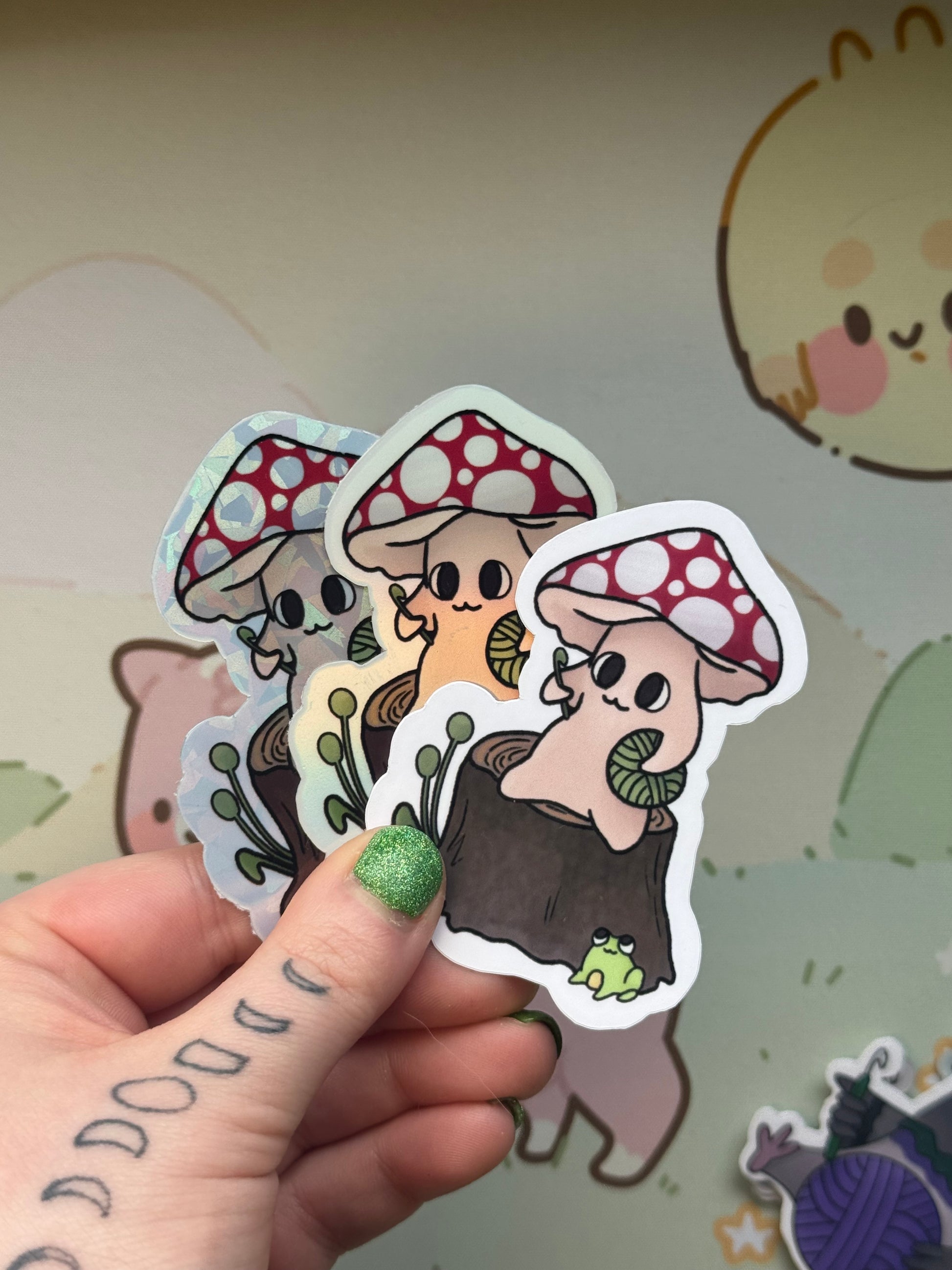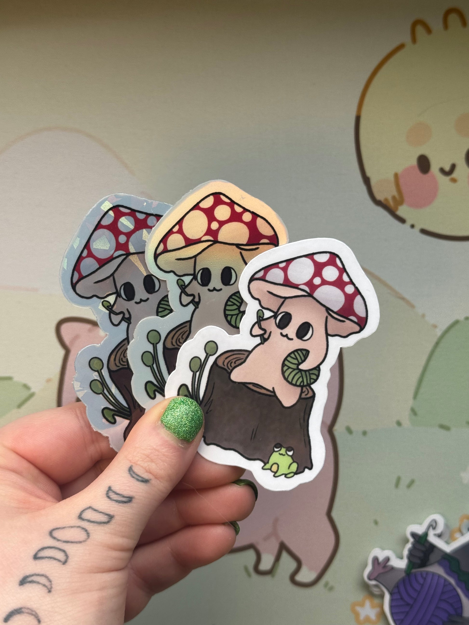 This sticker shows a mushroom sitting on a tree stump, ready to crochet with its grass hook and yarn! It comes in 3 finishes: white glossy, rainbow holographic, cracked glass holographic!