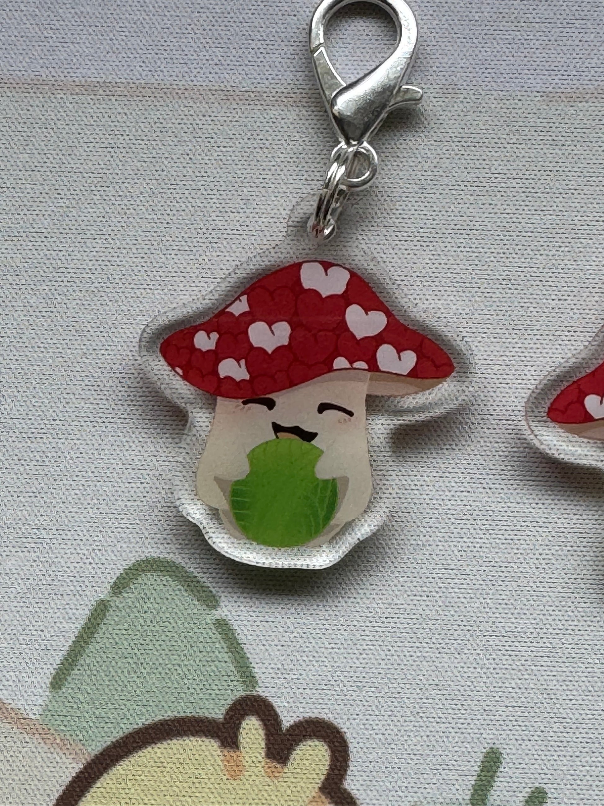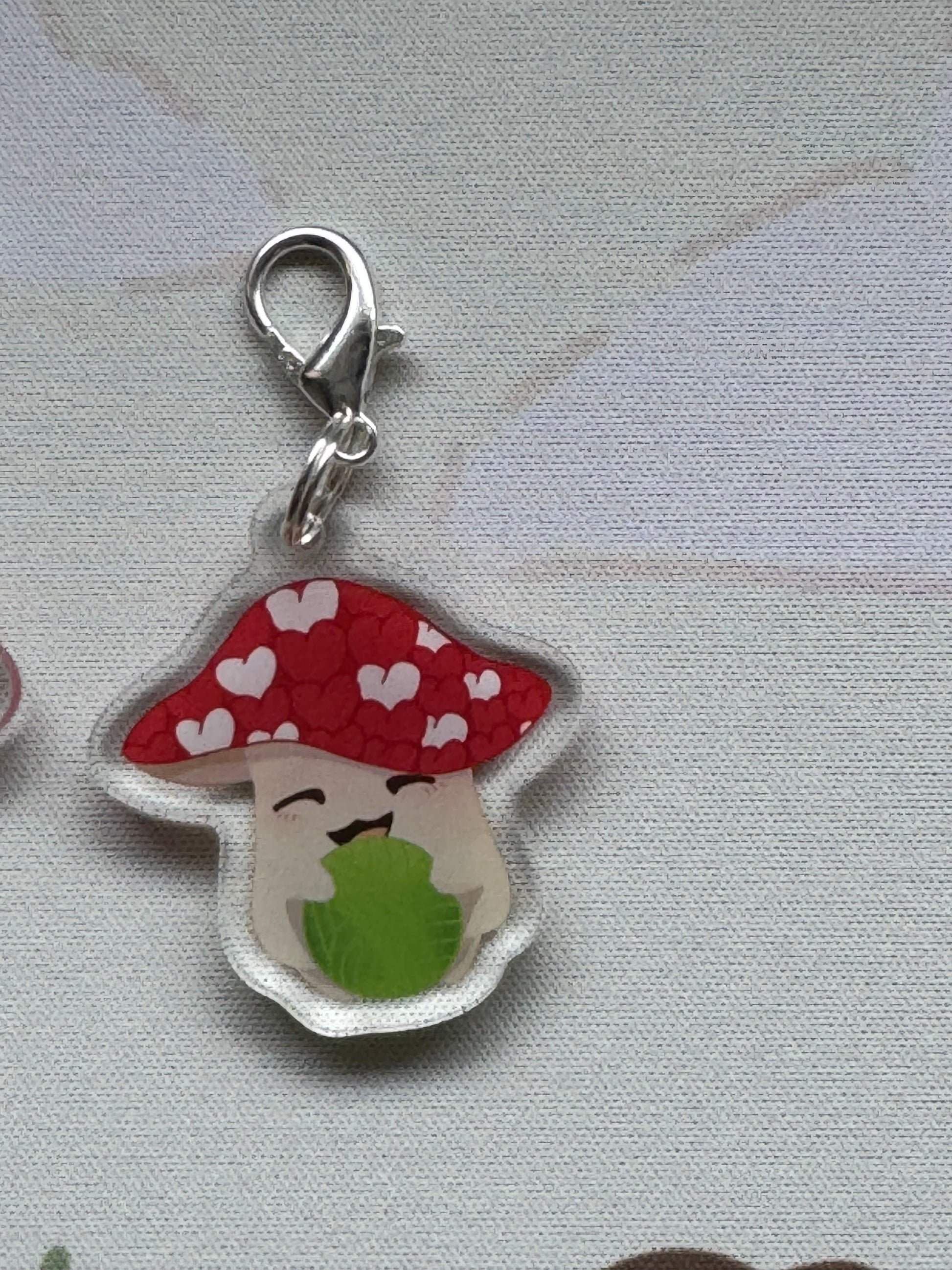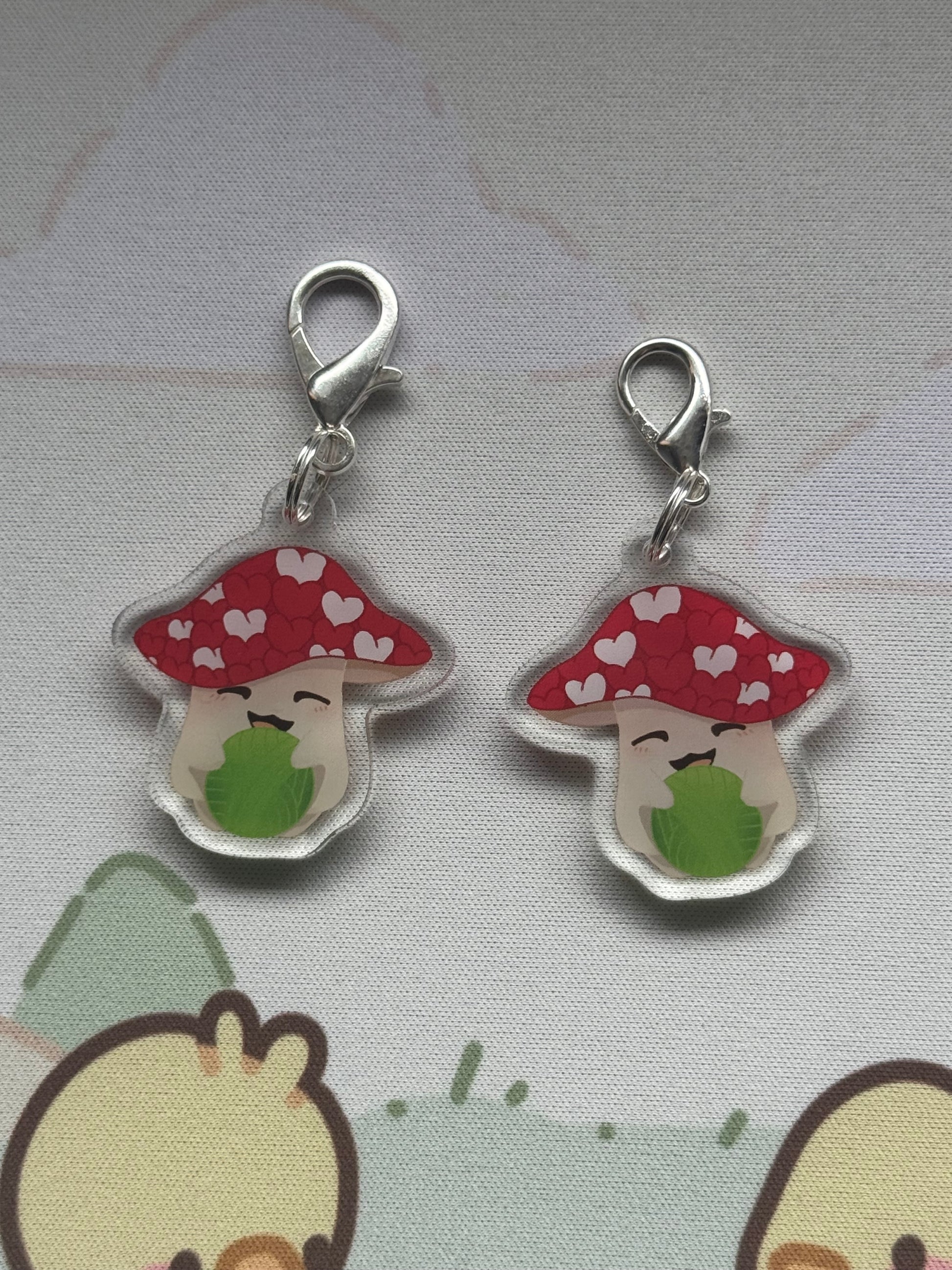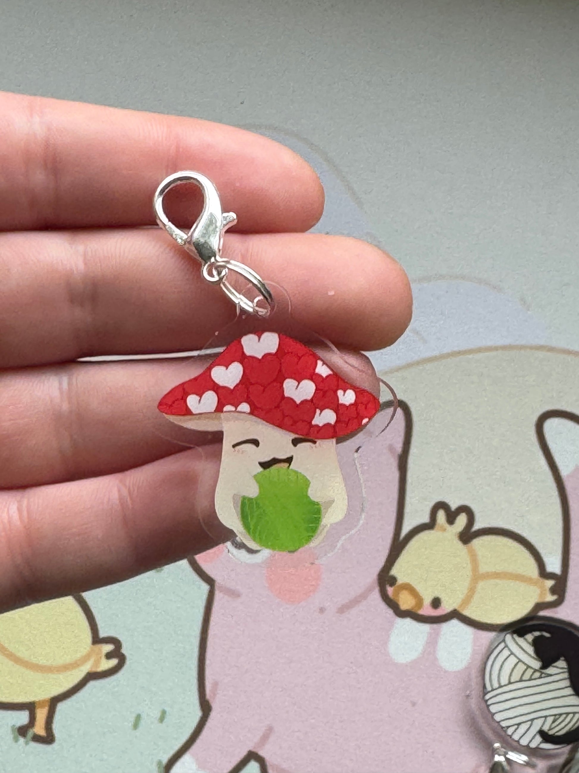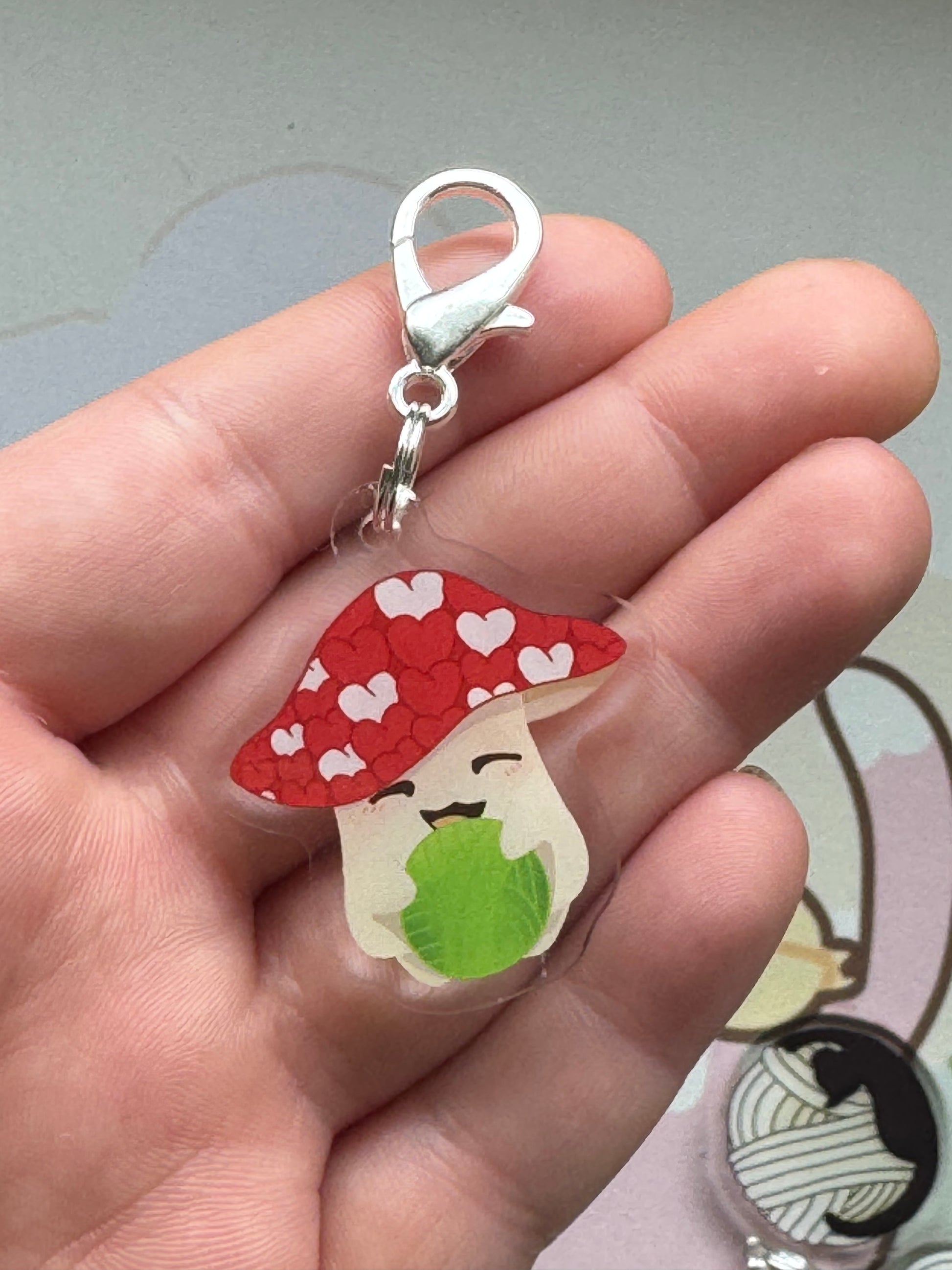Designed by me (Harper), this stitch marker features a double sided printed 1.5 inch charm with my mushroom holding a ball of yarn artwork, the mushroom cap is made of knit stitches too! The metal parts are a 10mm split ring (making it easy to change the clasp type!) and a 23mm or 18mm lobster clasp, which are the perfect size for larger projects with bulky yarn or smaller projects with thicker yarn!