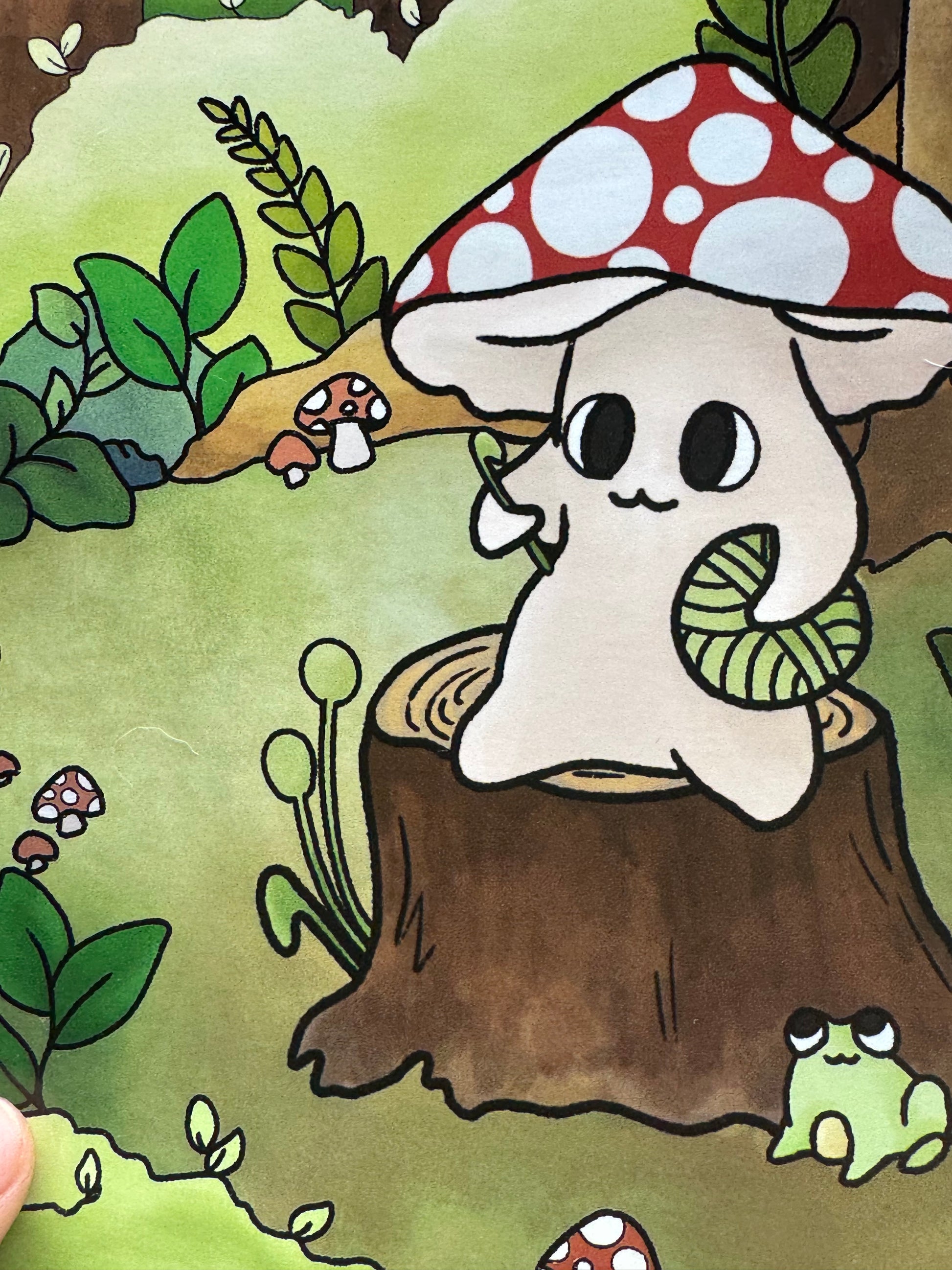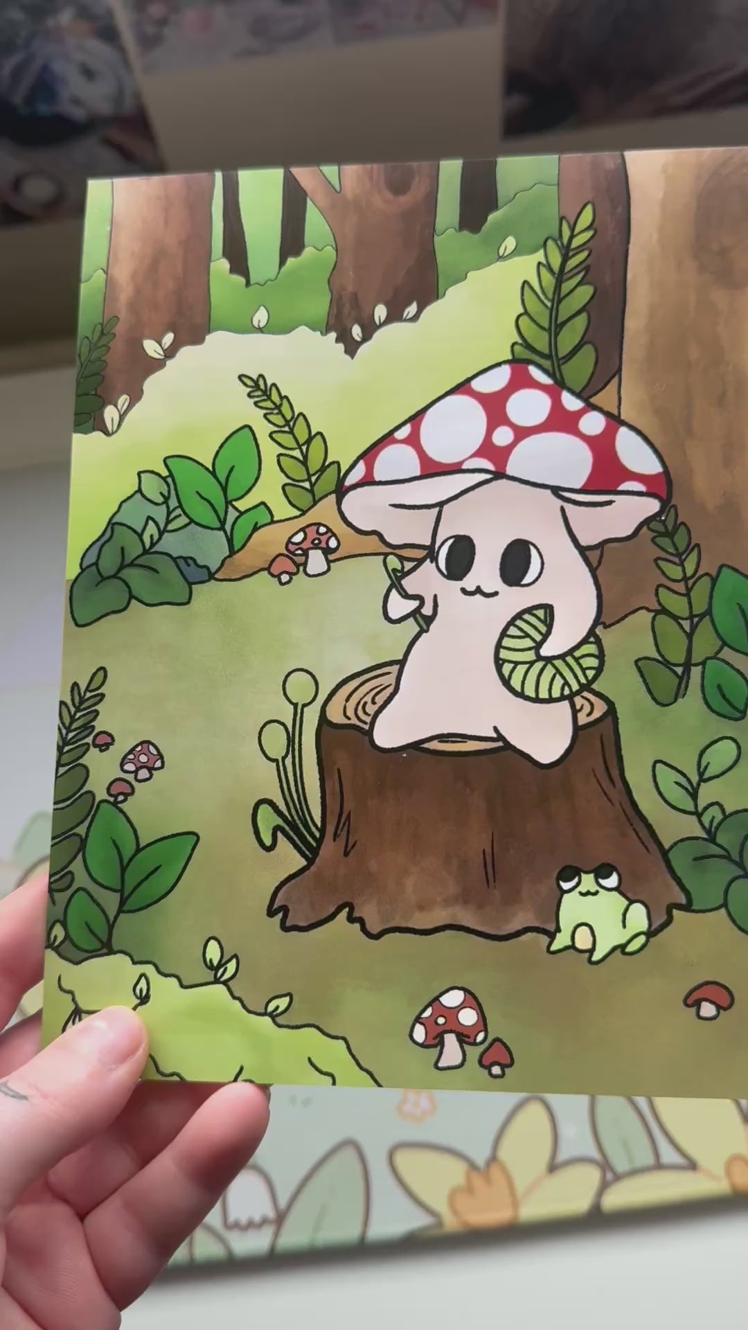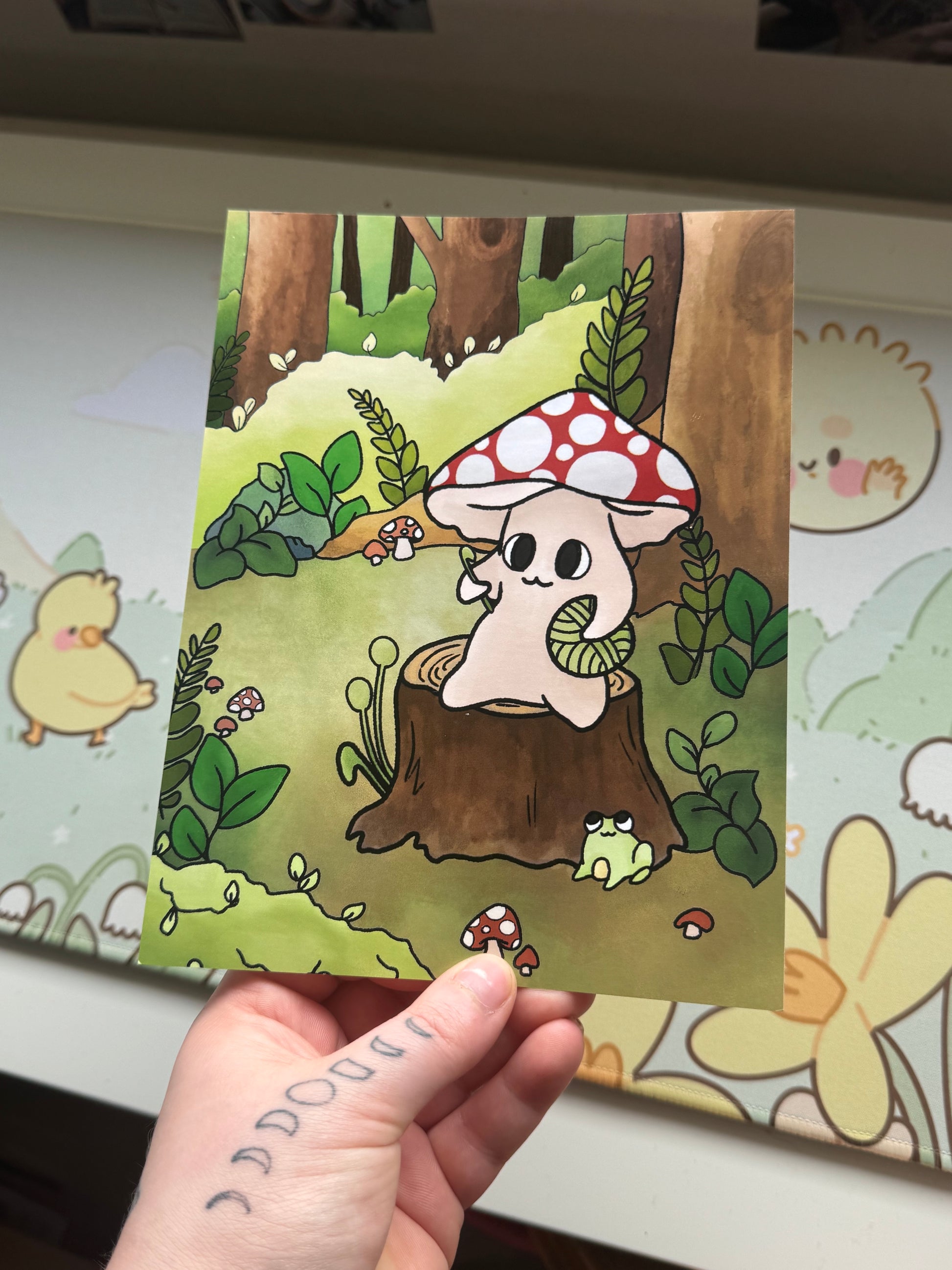 This art print features my mushroom crocheting on a log design, sat in a woodland area background! It measures 6x8 inches, the perfect size to showcase the art, but not so big it’s too large to go on a wall!