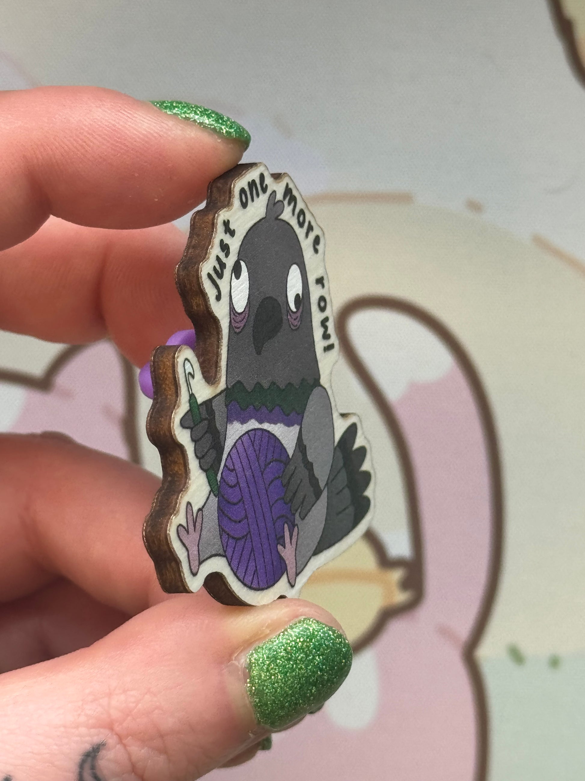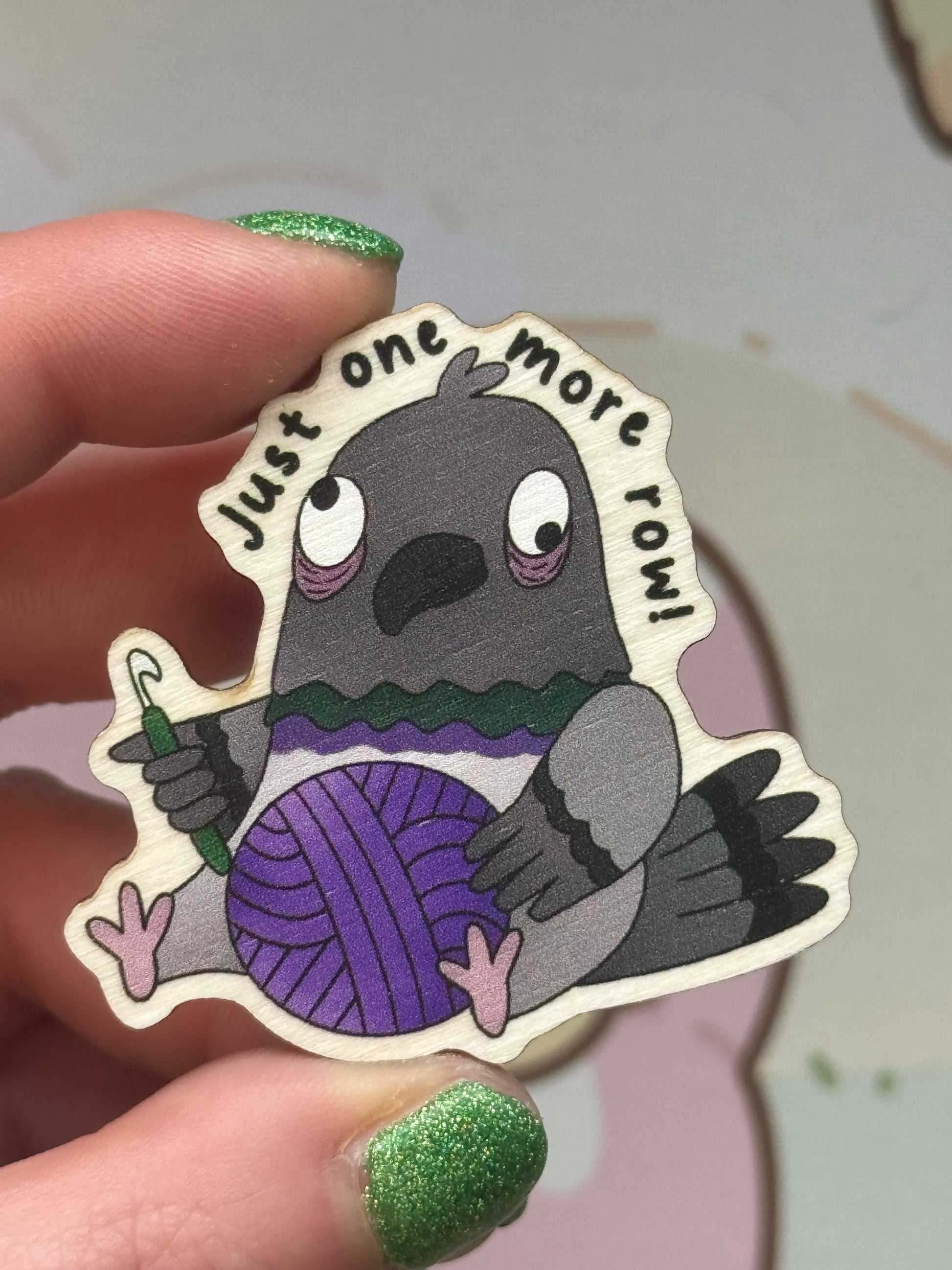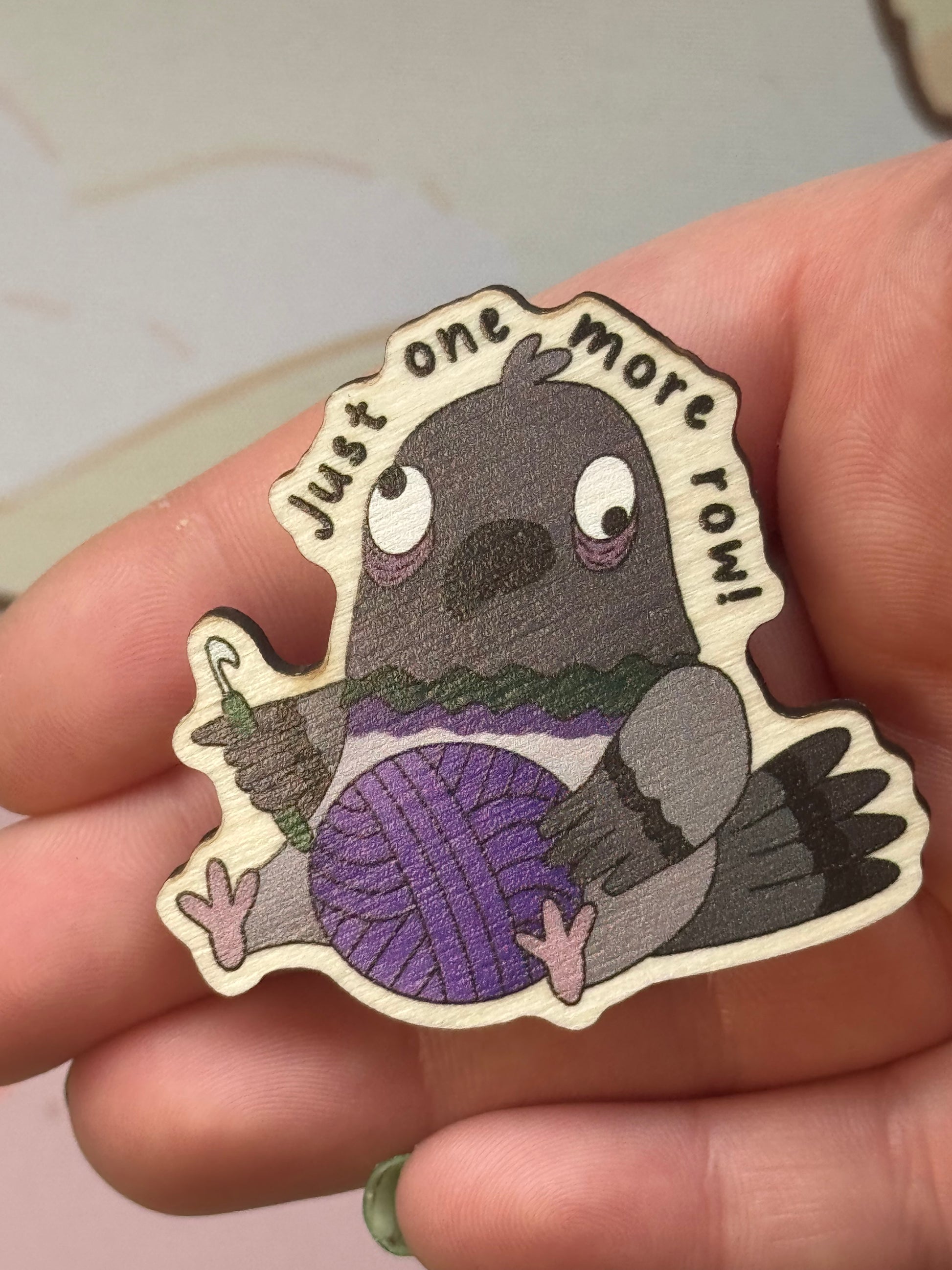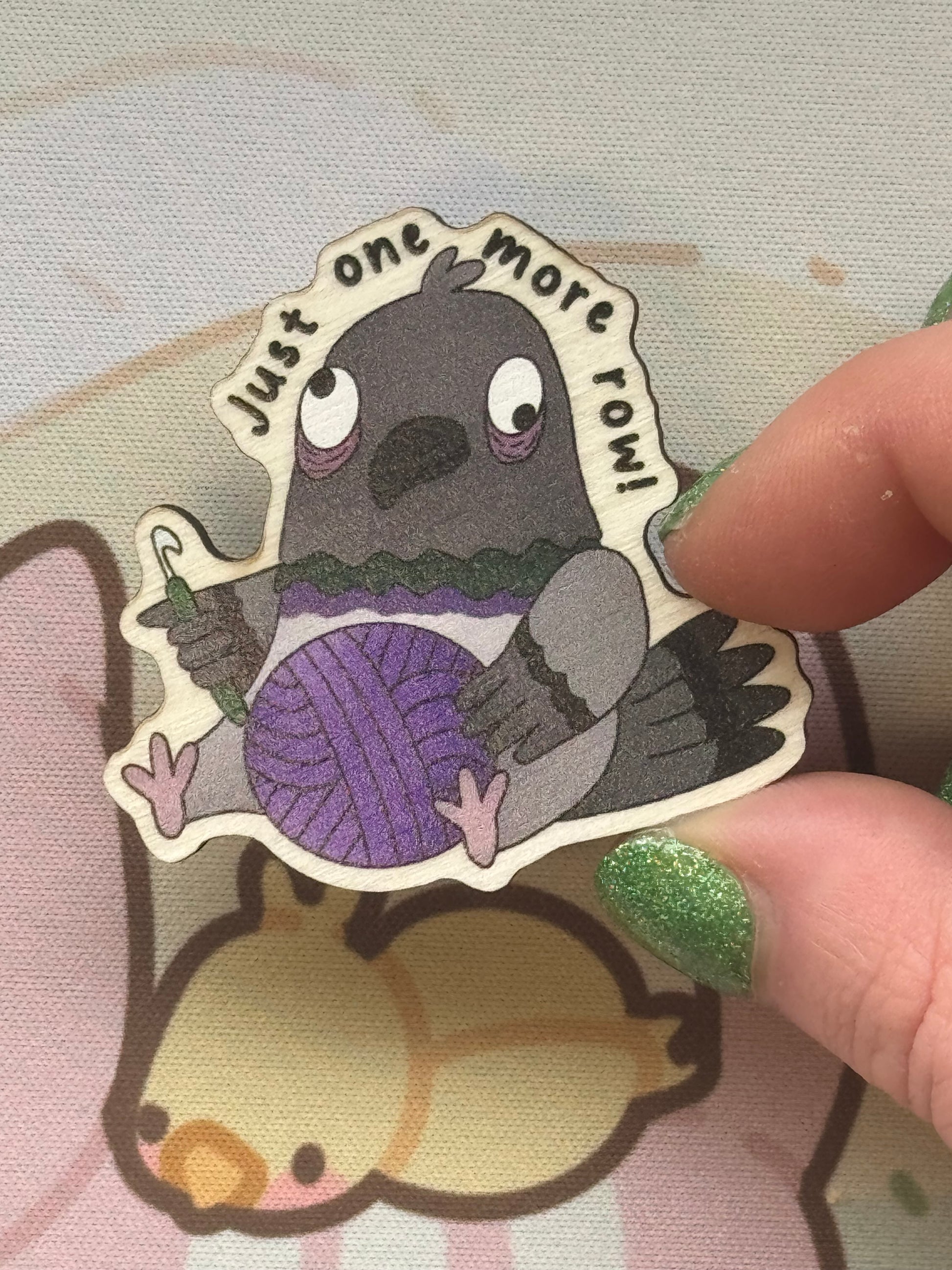 Some fun details of this design: the pigeon is cross eyed from focusing on its crochet project for so long! Are you seeing the stitches twice? The ball of yarn and crochet hook match the pigeon's defining purple and green stripes around its neck- a great colour choice for our pigeon! The text above its head reads: "Just one more row" something I find myself saying all the time when it's late at night, maybe one more row will be enough?! I know it's a bit of a catch-phrase in the crochet and knitting community so I thought it would be perfect for this silly pigeon!