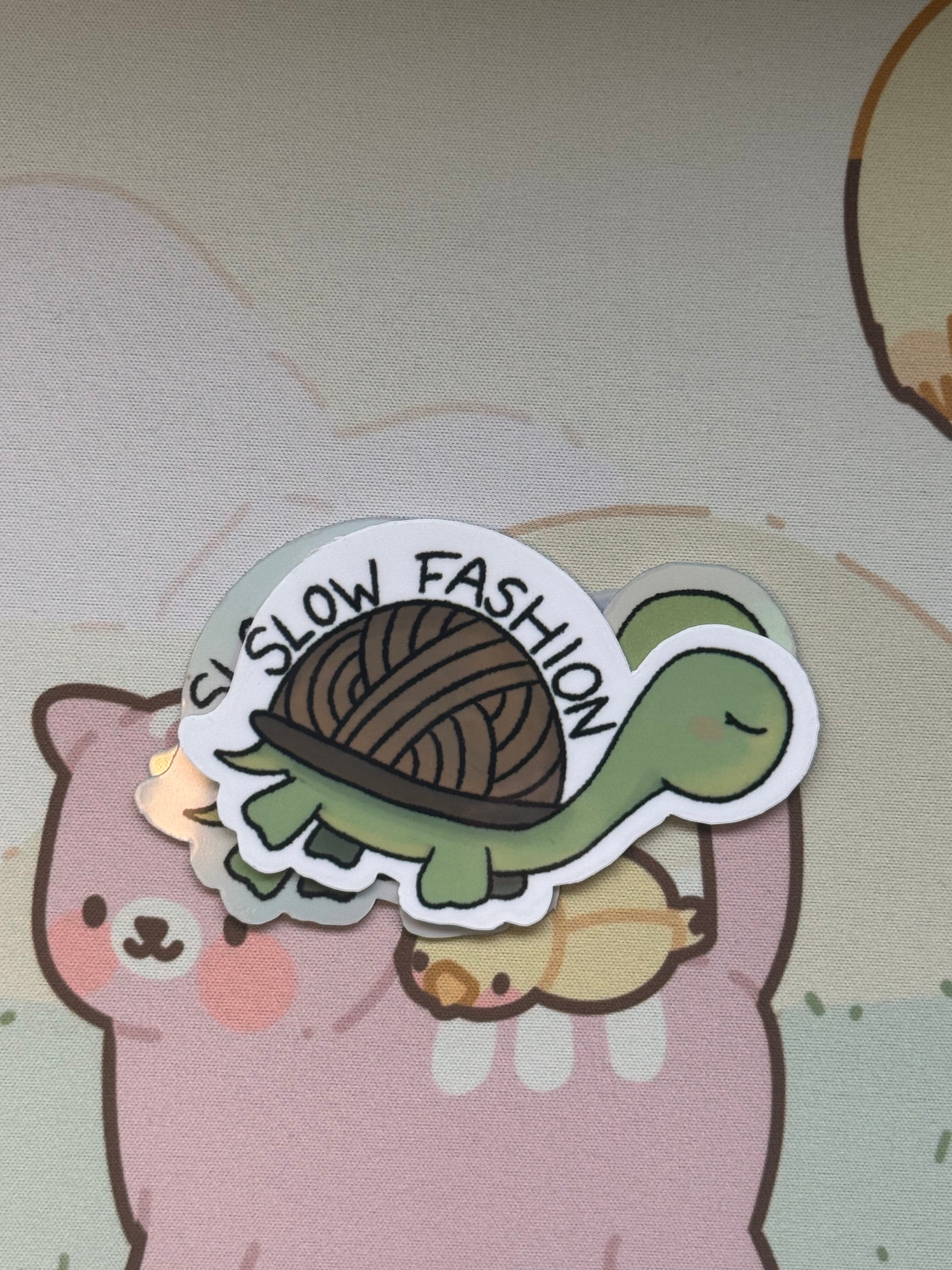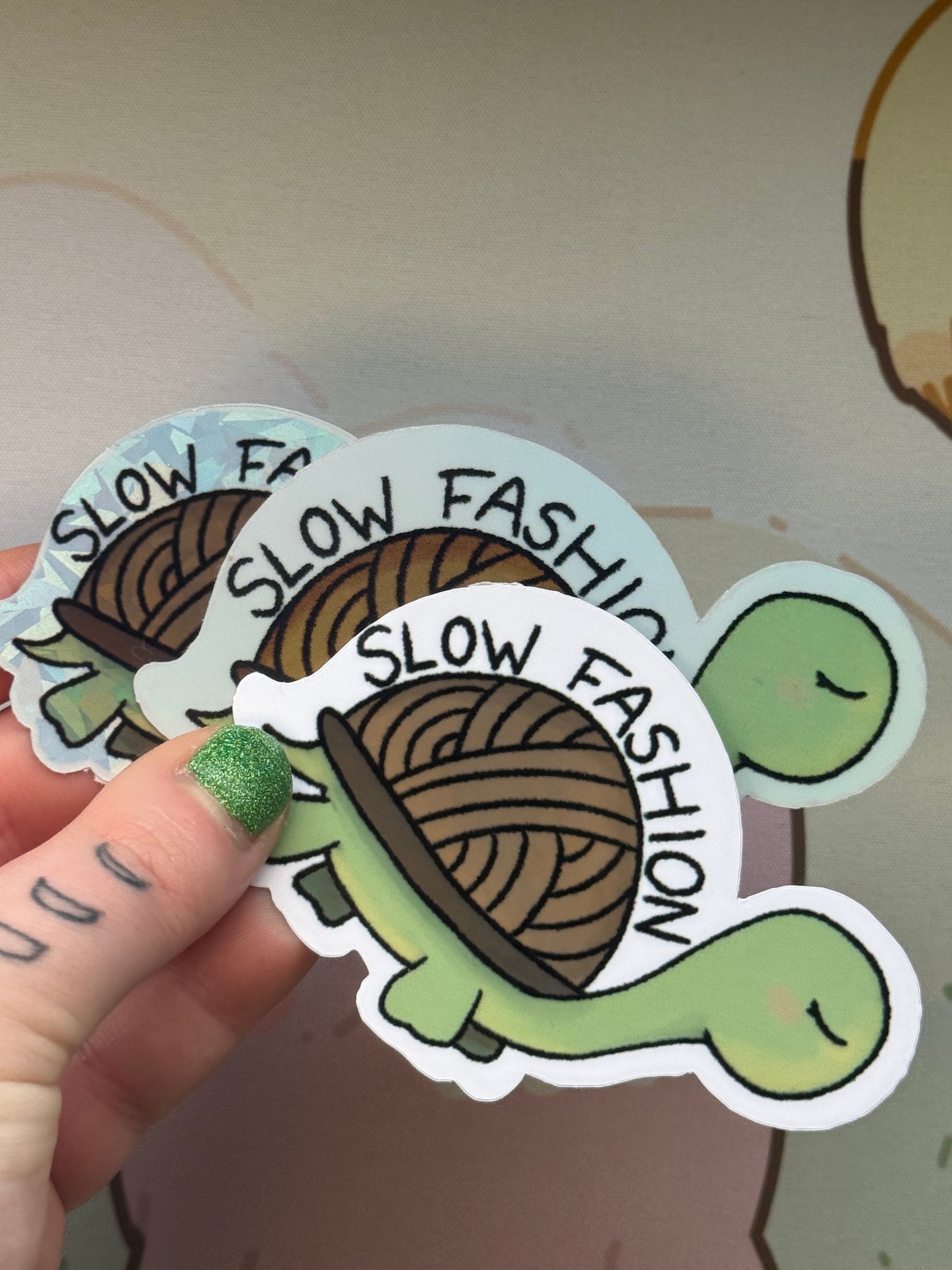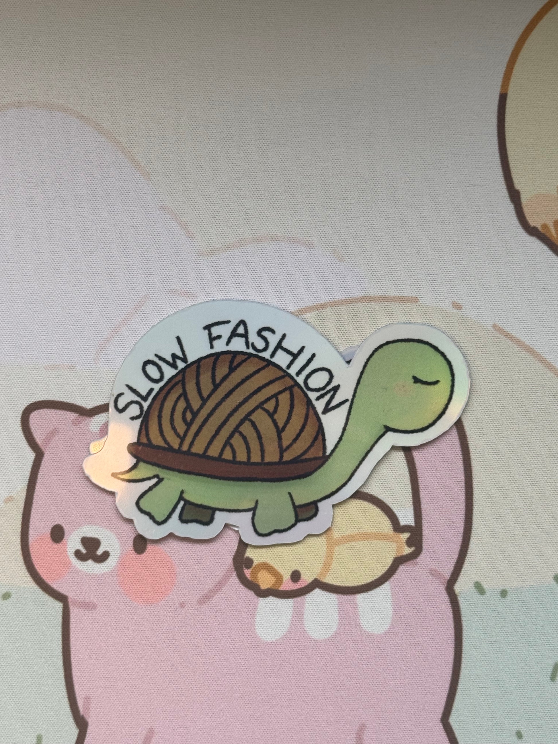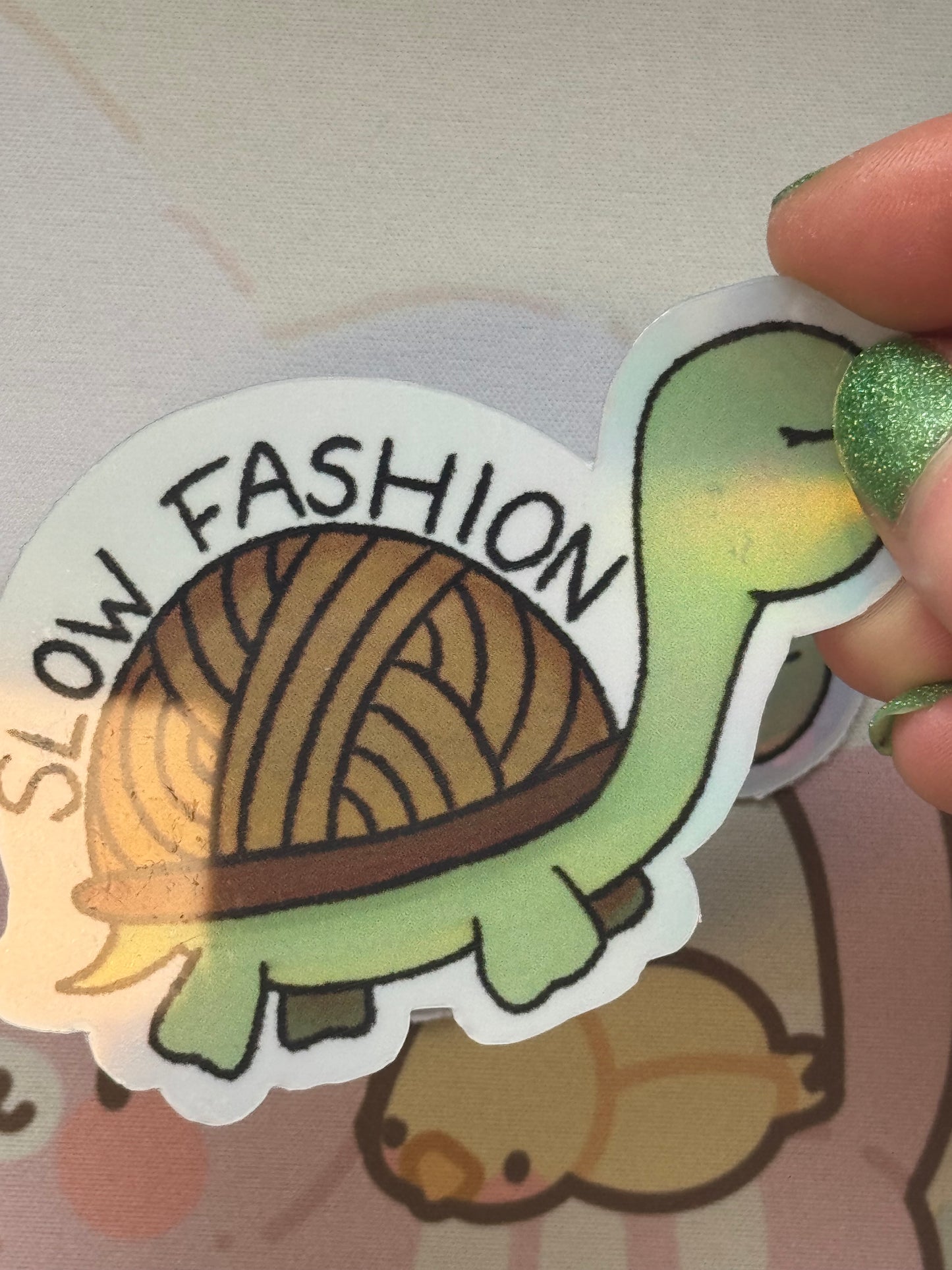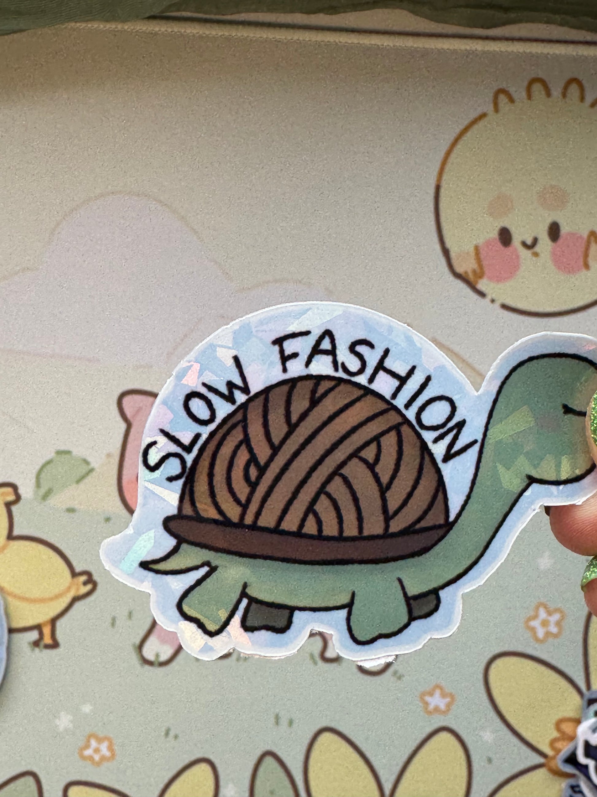 This sticker shows my tortoise with a yarn shell and the words "Slow fashion"! It comes in 4 finishes: white glossy, rainbow holographic, cracked glass holographic, or glow in the dark!