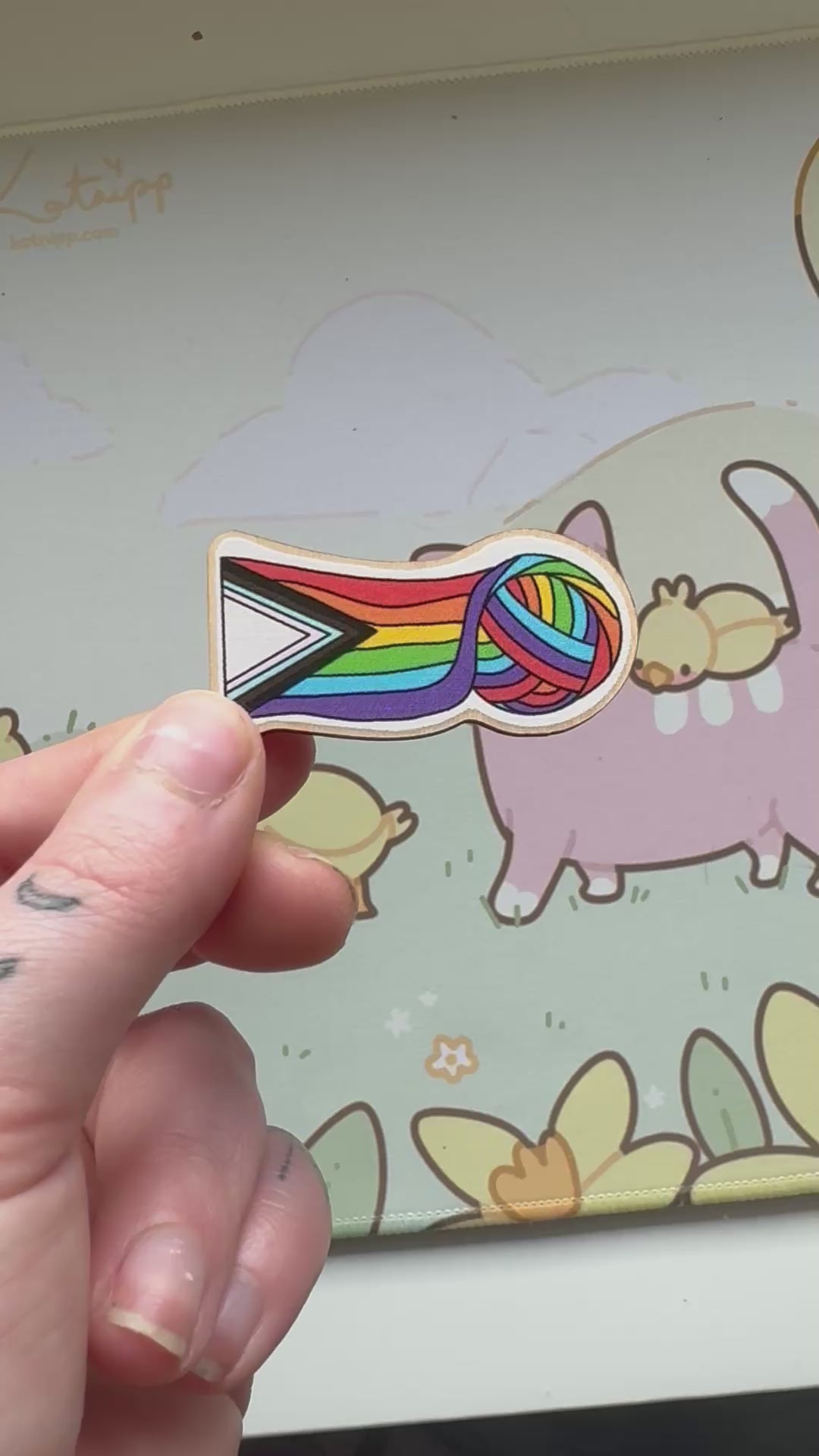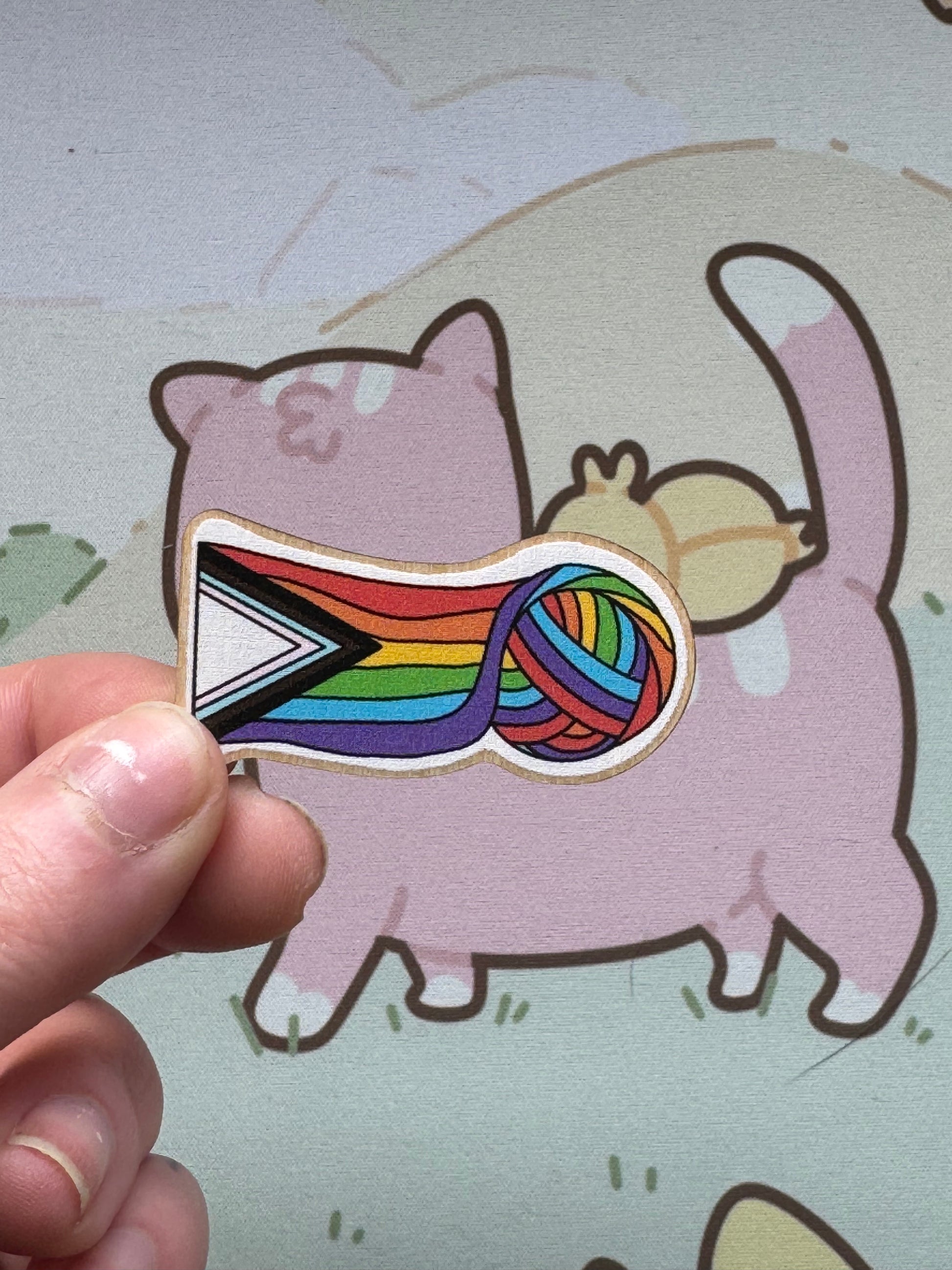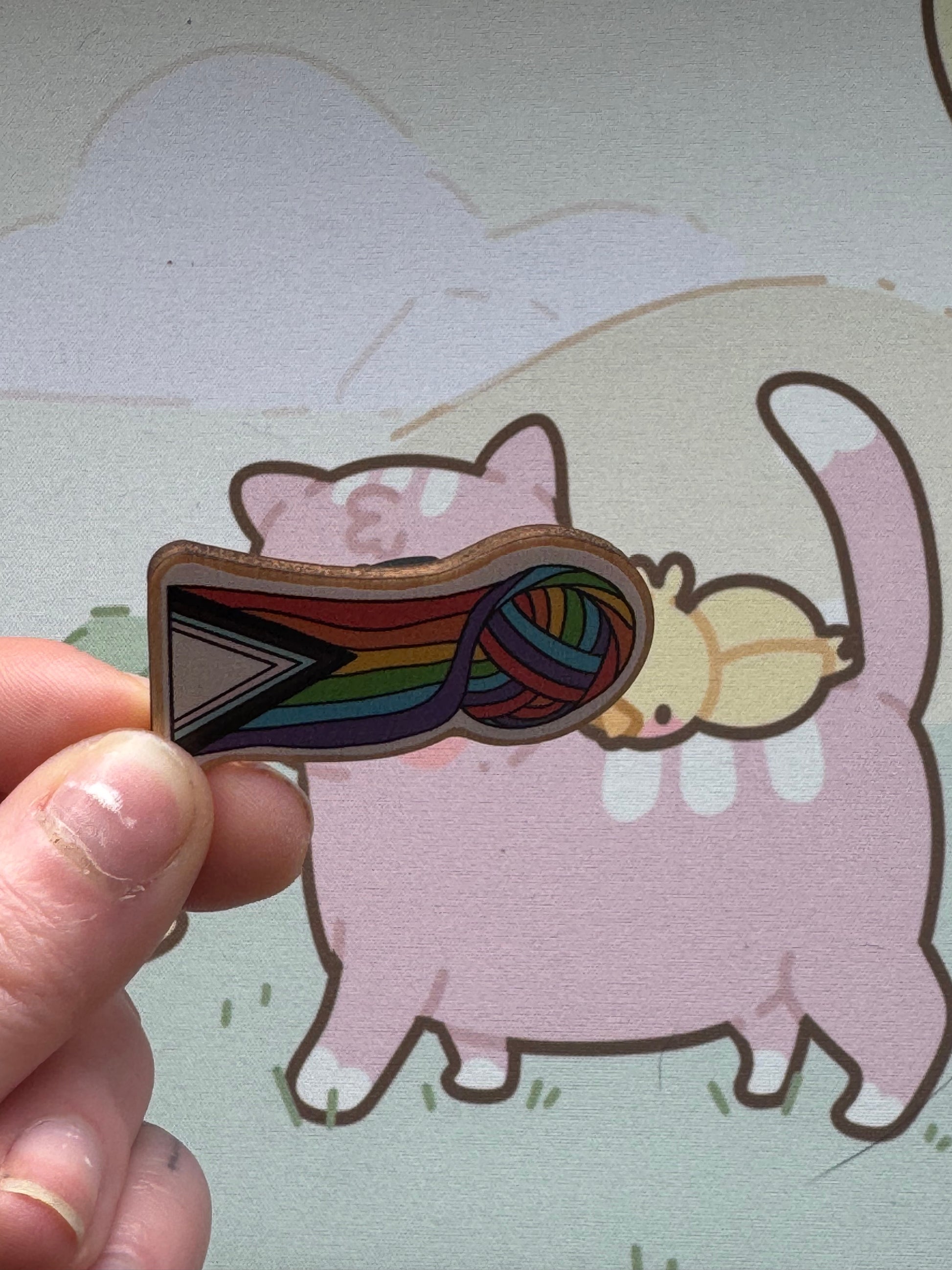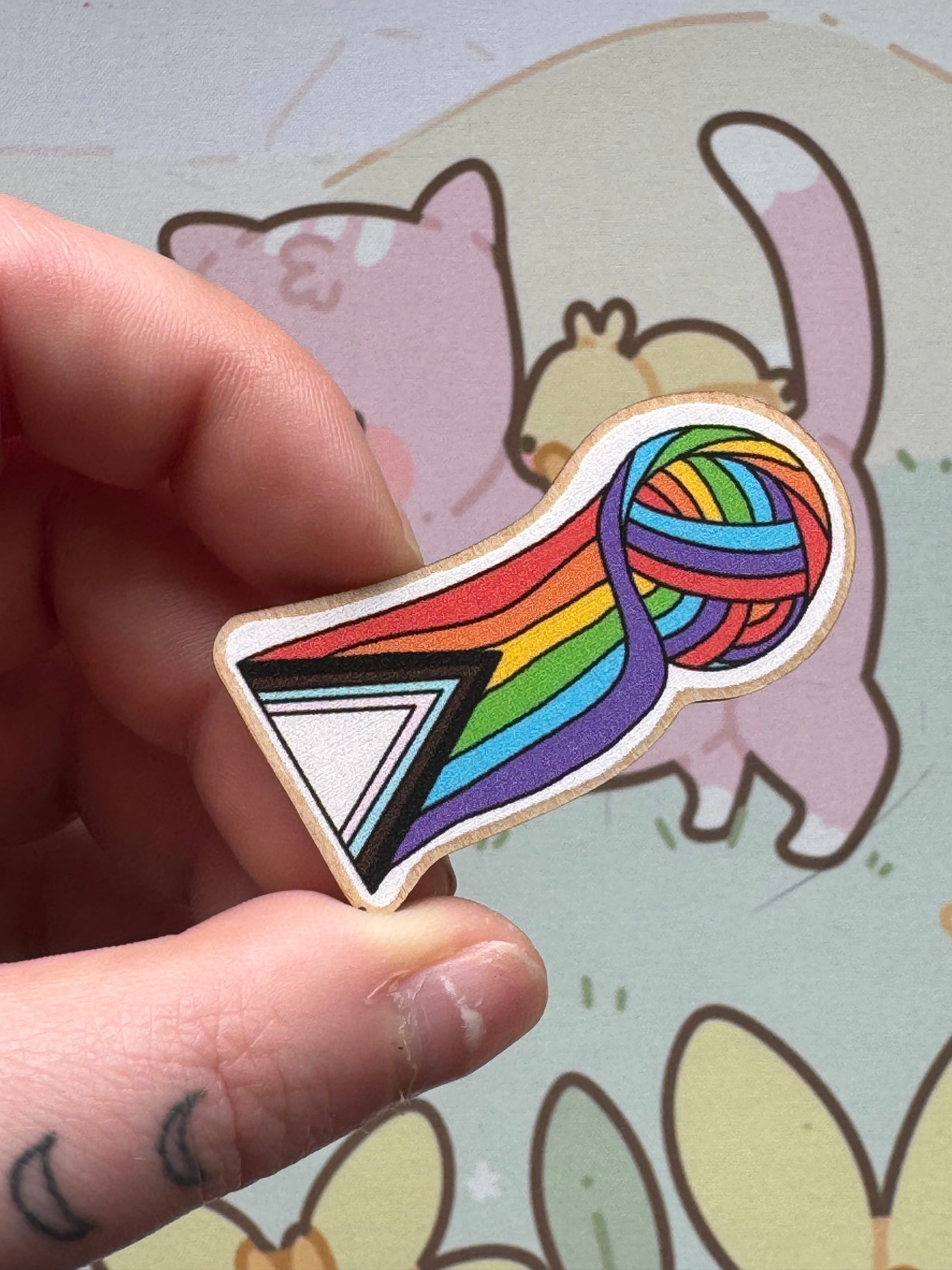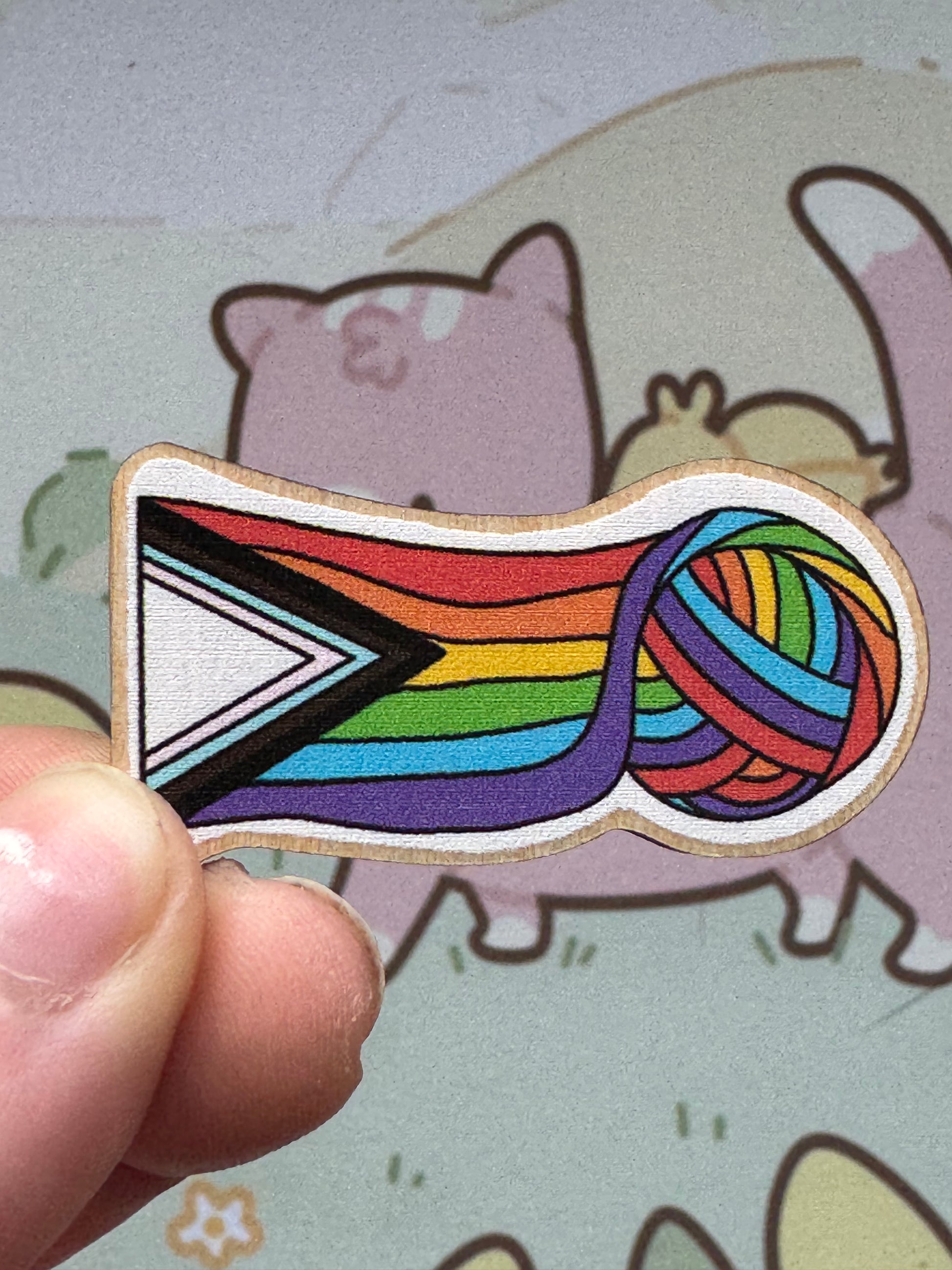 Wooden pin badge with my progress pride flag yarn ball design printed on it. This badge is 2 inches at its largest dimension, and has a rubber clutch in the centre of the back.
