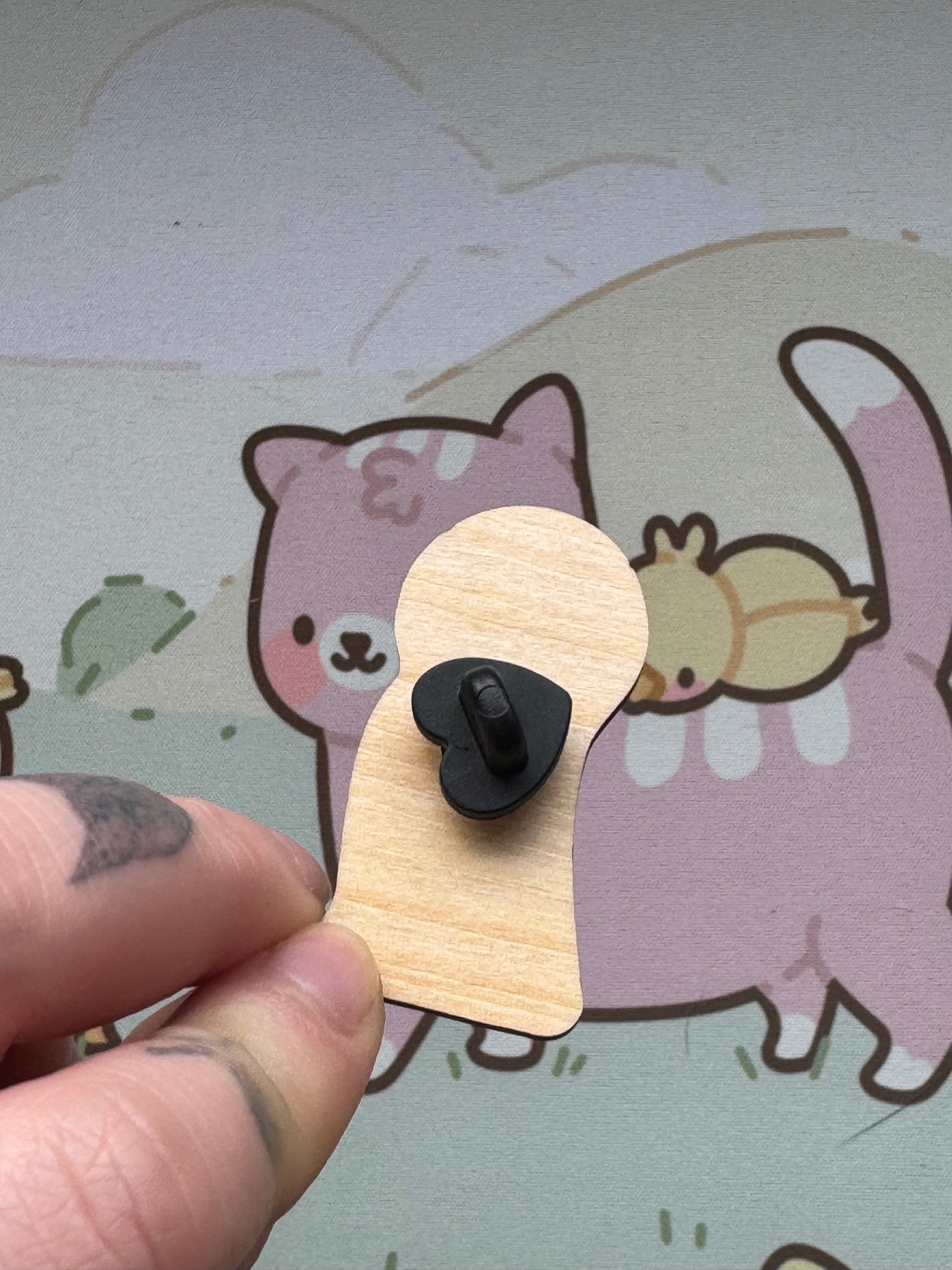 The design was drawn by me (Harper) on my iPad, then sent off to my manufacturer to be made into a synthetic wooden pin! When the pins arrive with me from manufacturing, each one is quality checked and packaged up onto backing cards that I also design!