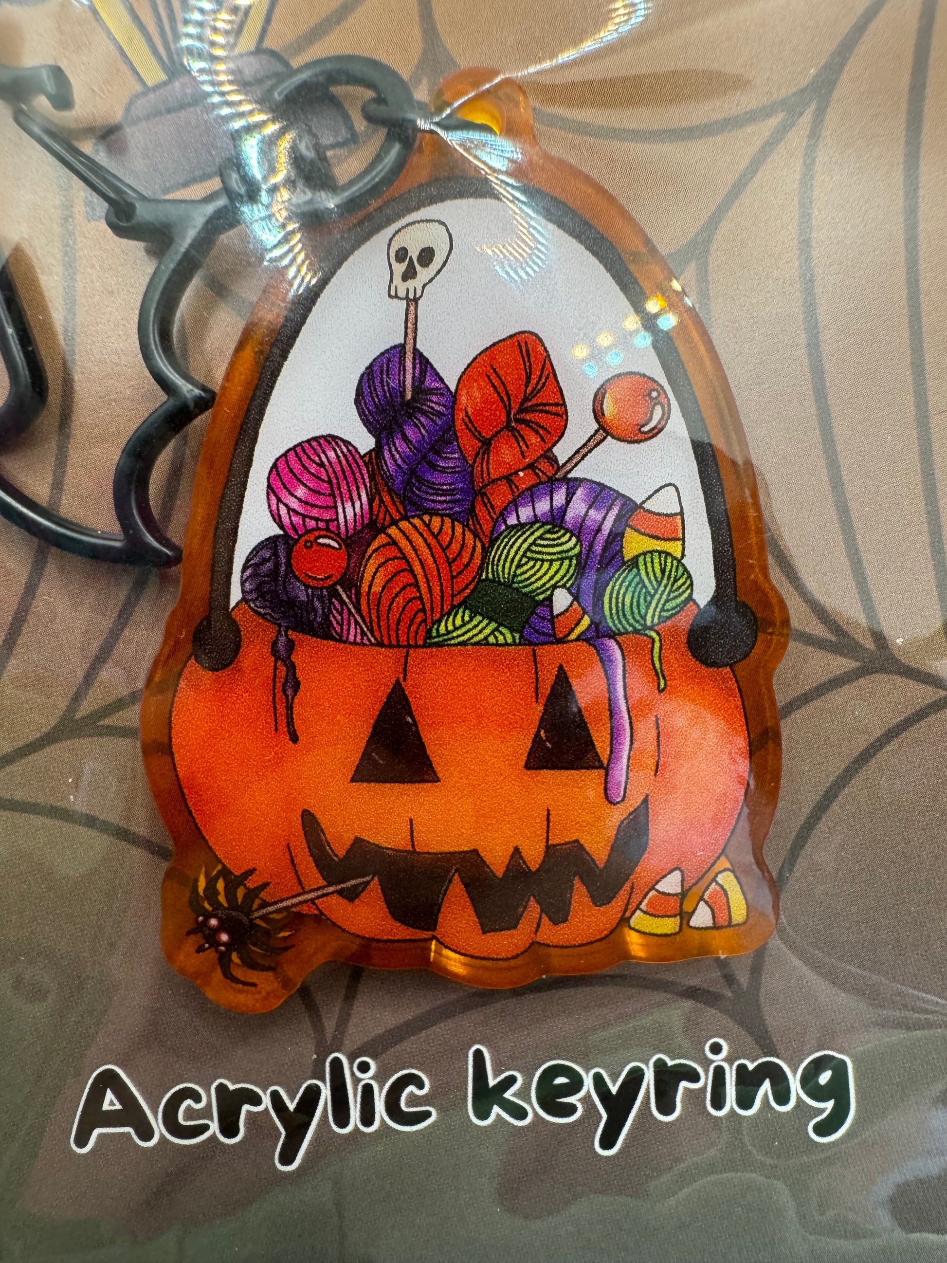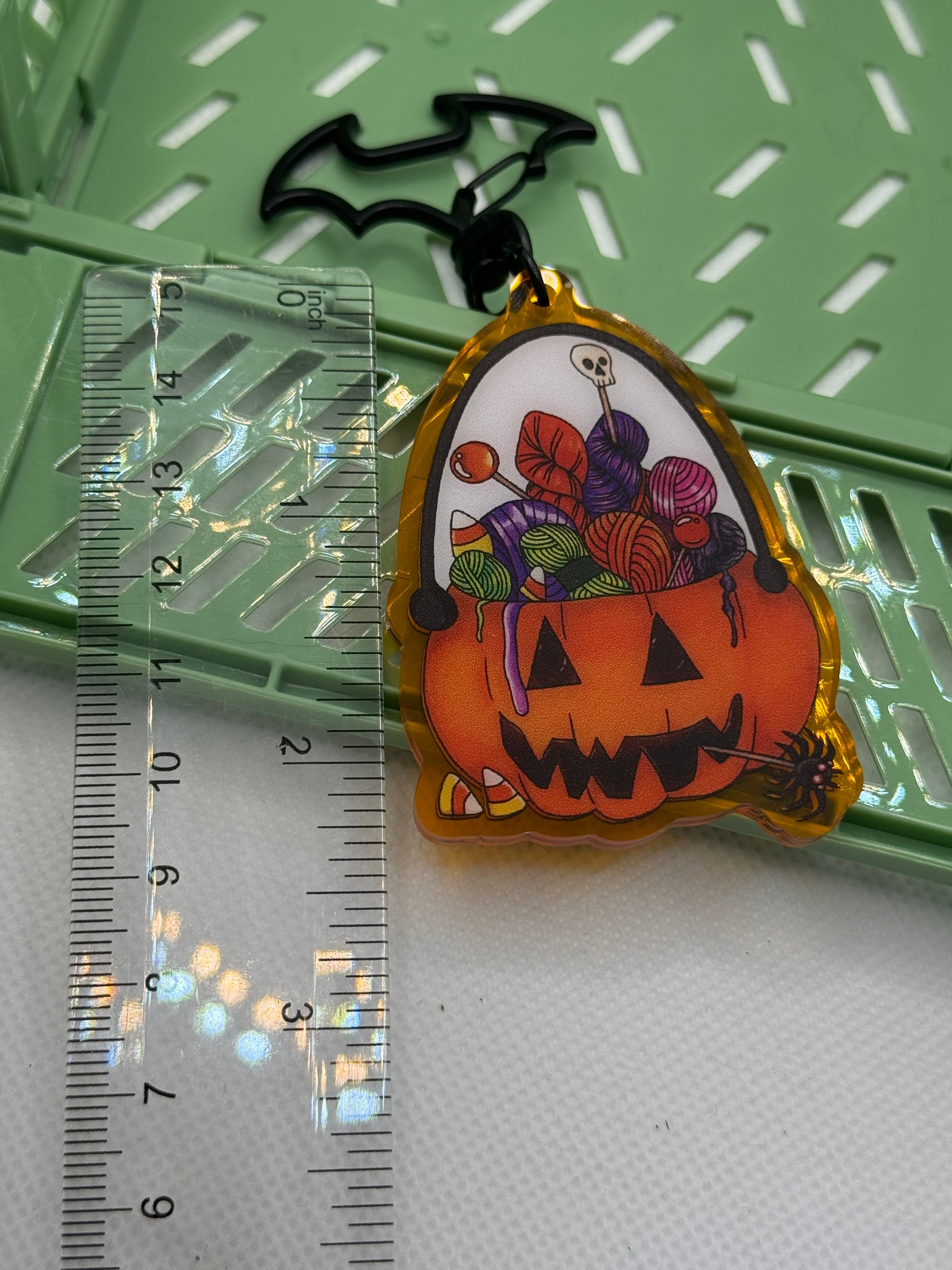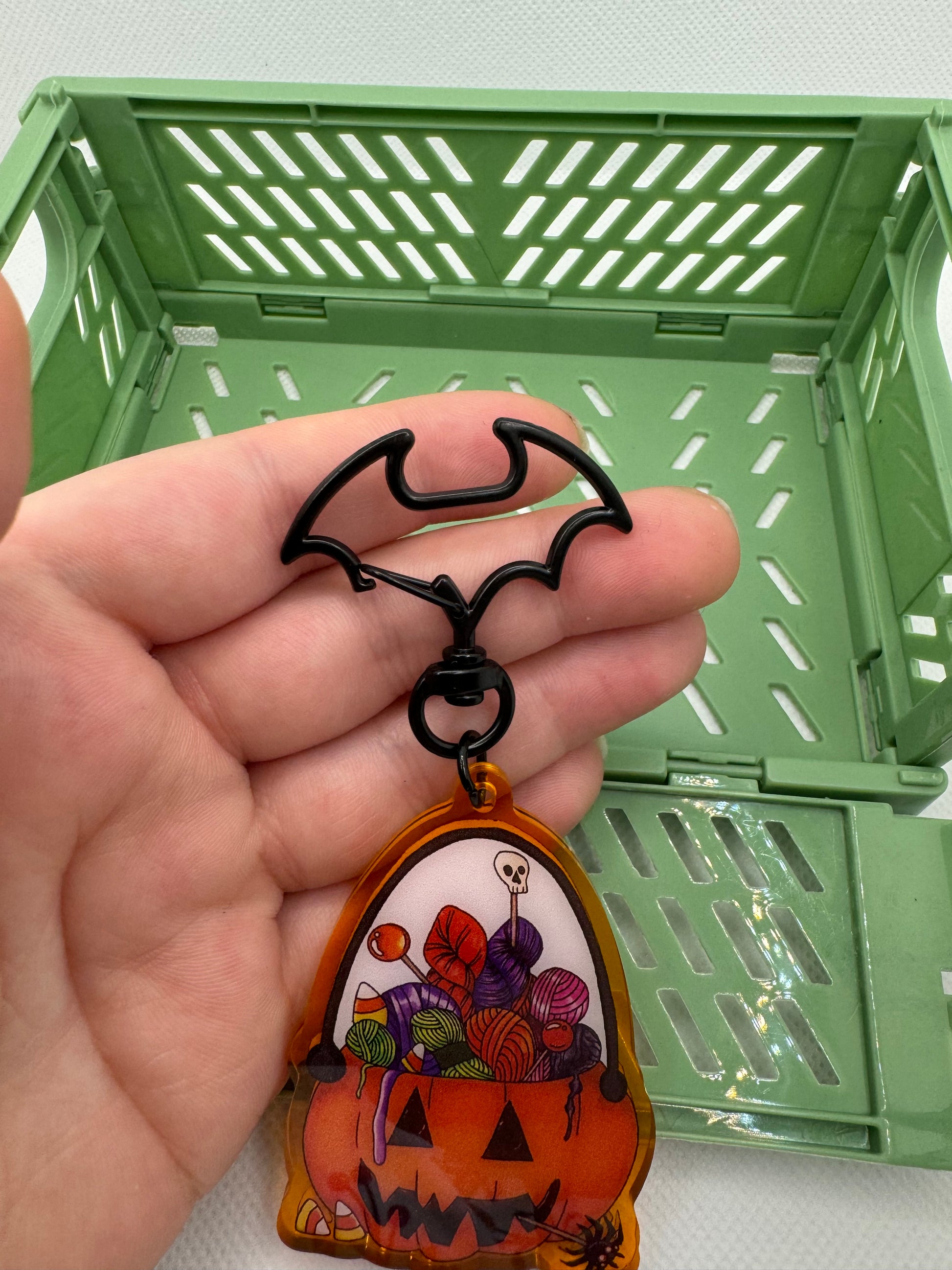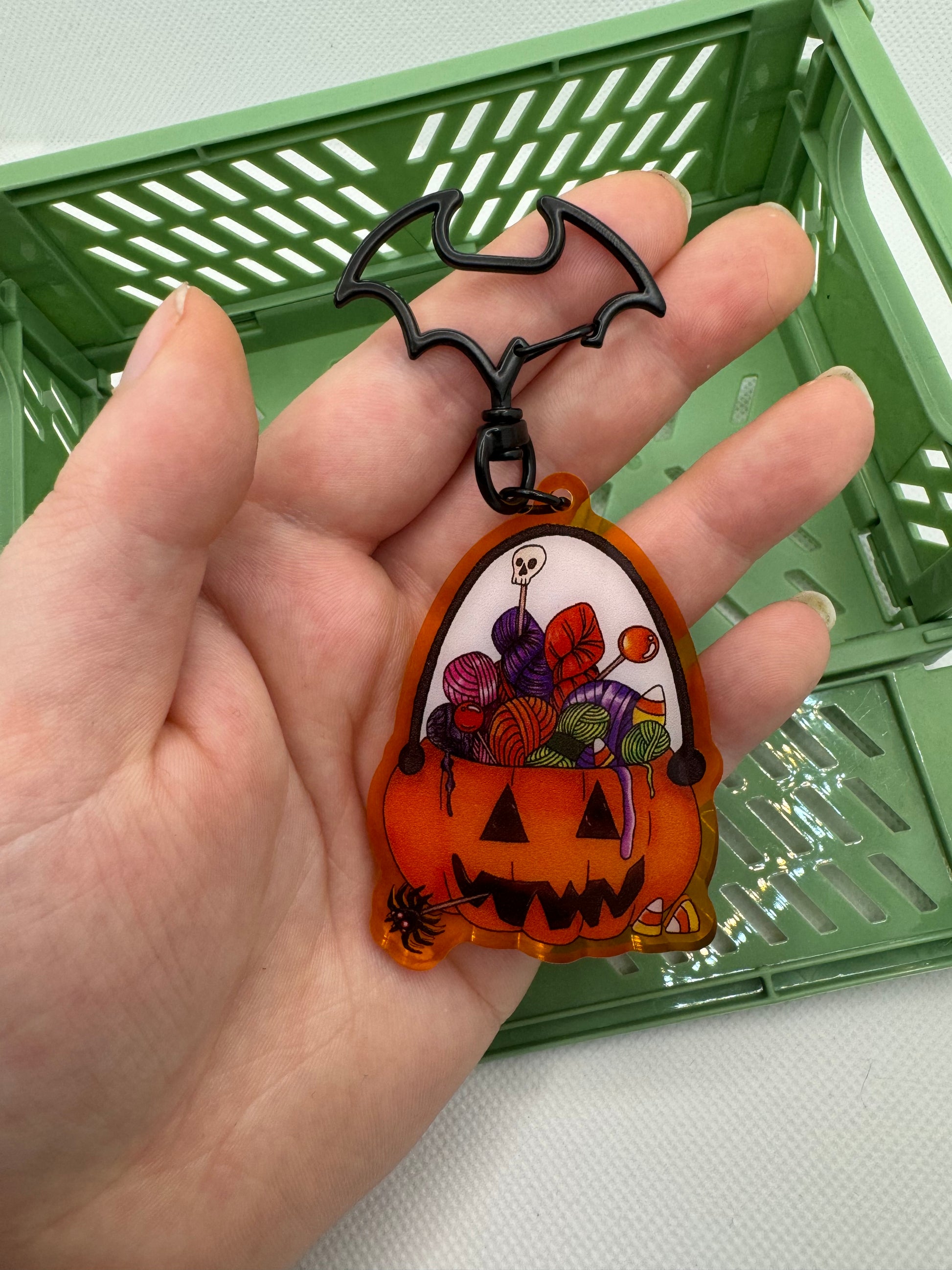 An acrylic keyring with my pumpkin trick or treating bowl full of balls and hanks of yarn design. This keyring is on orange translucent acrylic, and is double sided. The charm measures 2.5 inches at its largest dimension and the keyring part is a black bat lobster clasp style fixing for easy attachment to your keys, bag, zipper, etc!