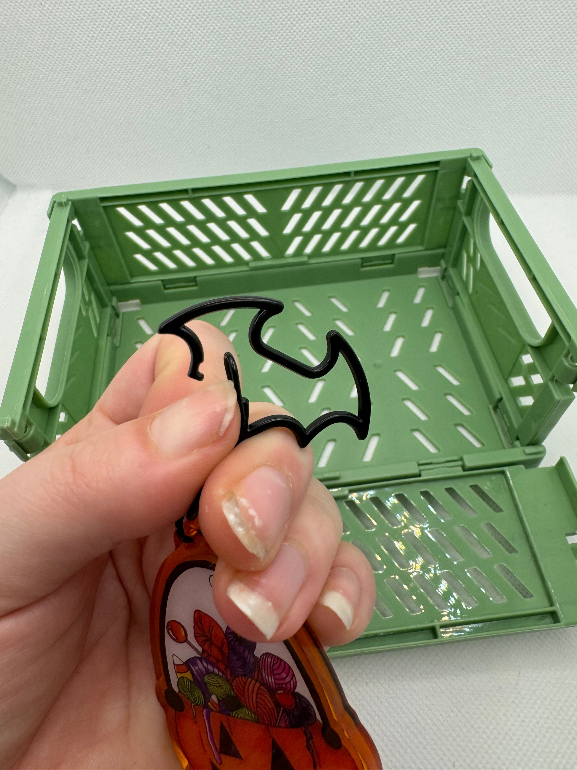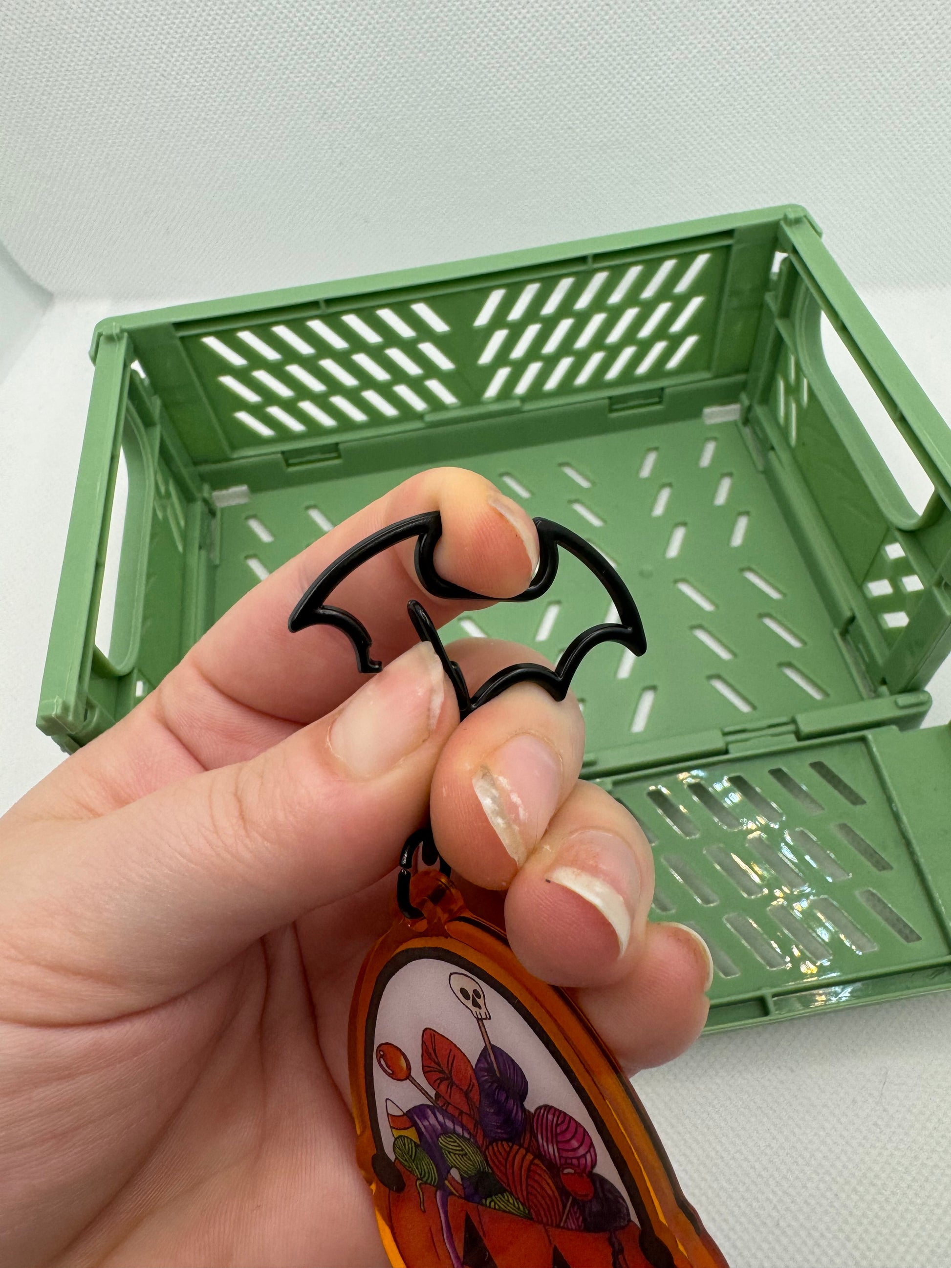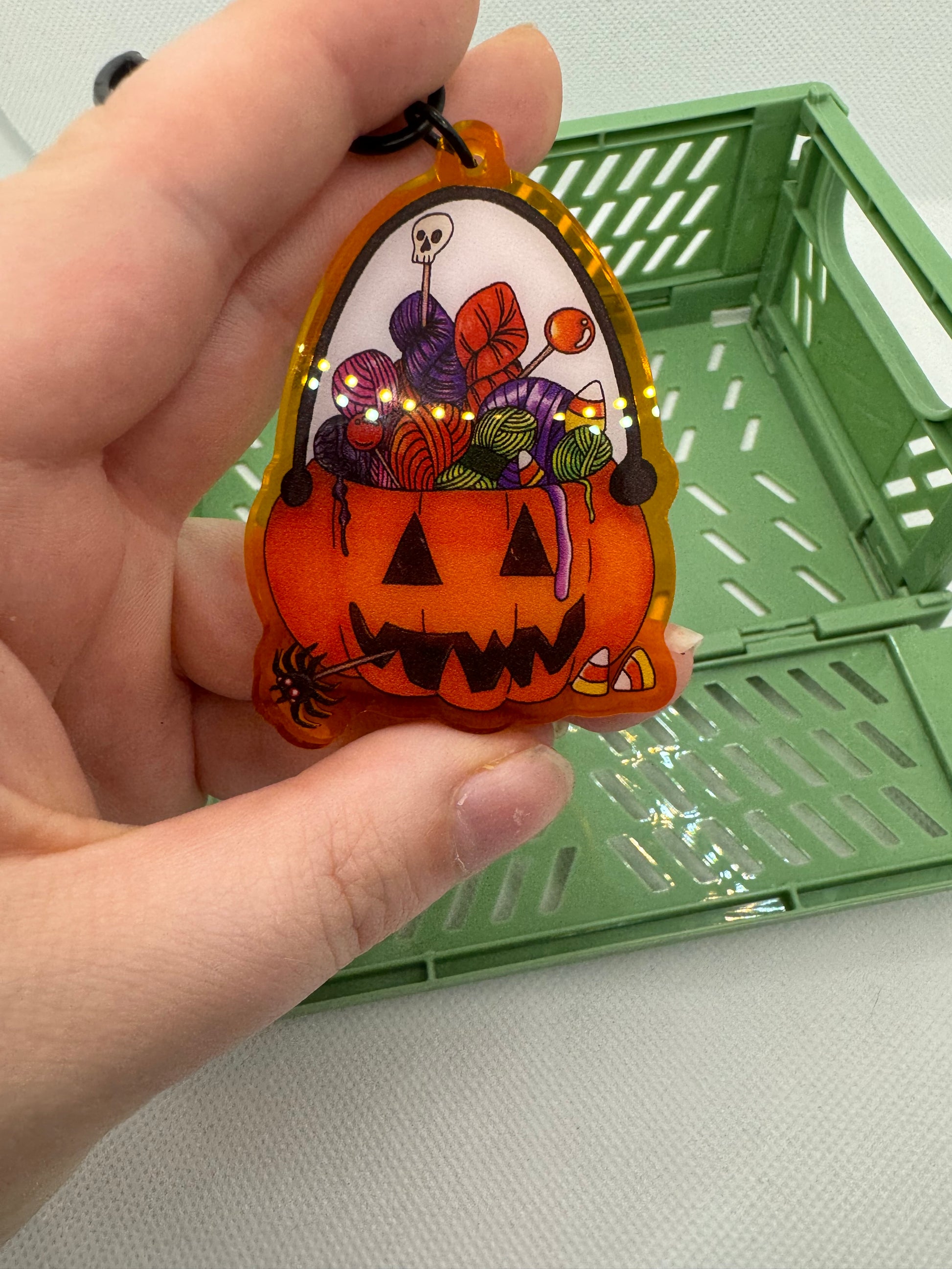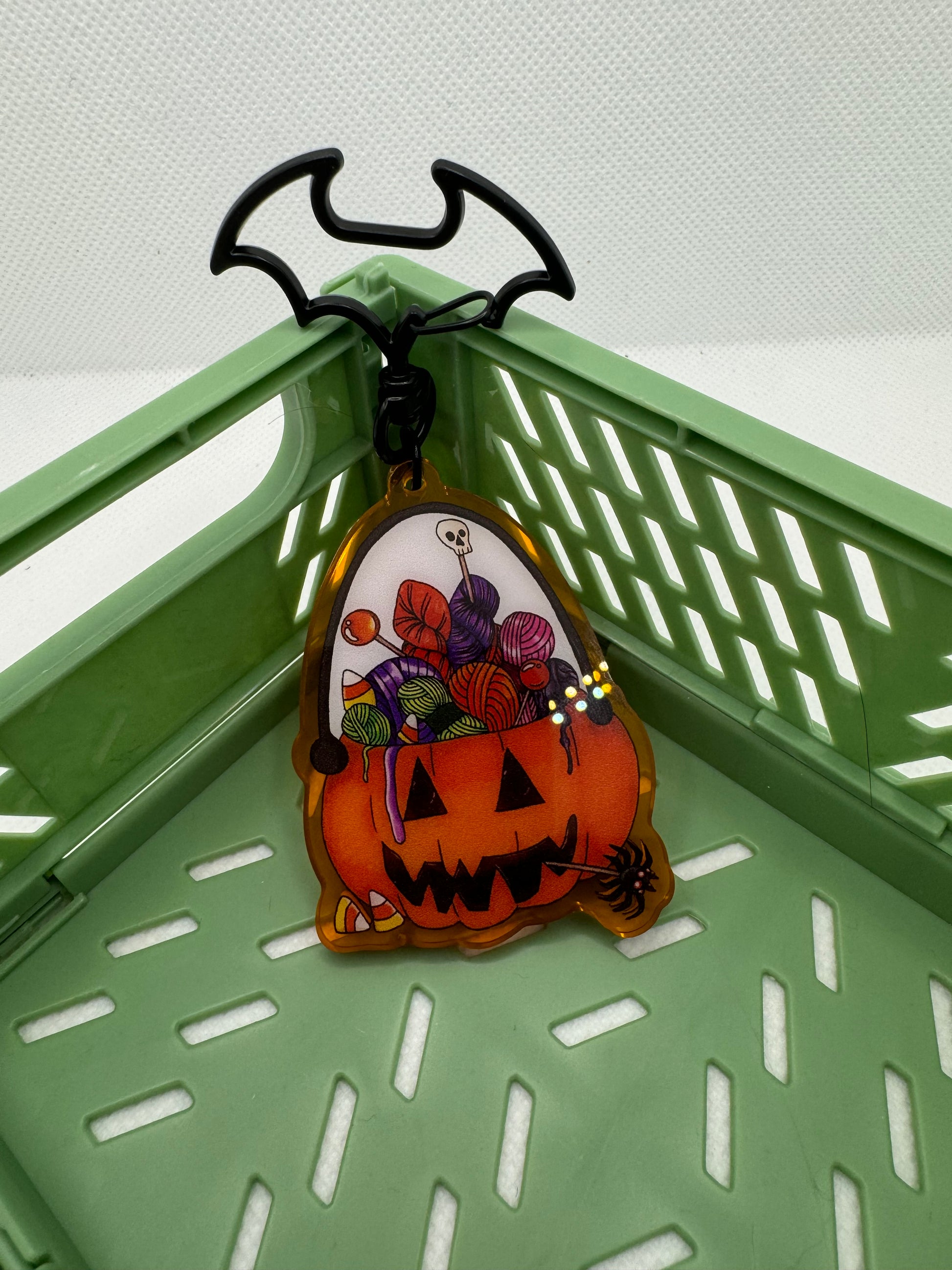 An acrylic keyring with my pumpkin trick or treating bowl full of balls and hanks of yarn design. This keyring is on orange translucent acrylic, and is double sided. The charm measures 2.5 inches at its largest dimension and the keyring part is a black bat lobster clasp style fixing for easy attachment to your keys, bag, zipper, etc!