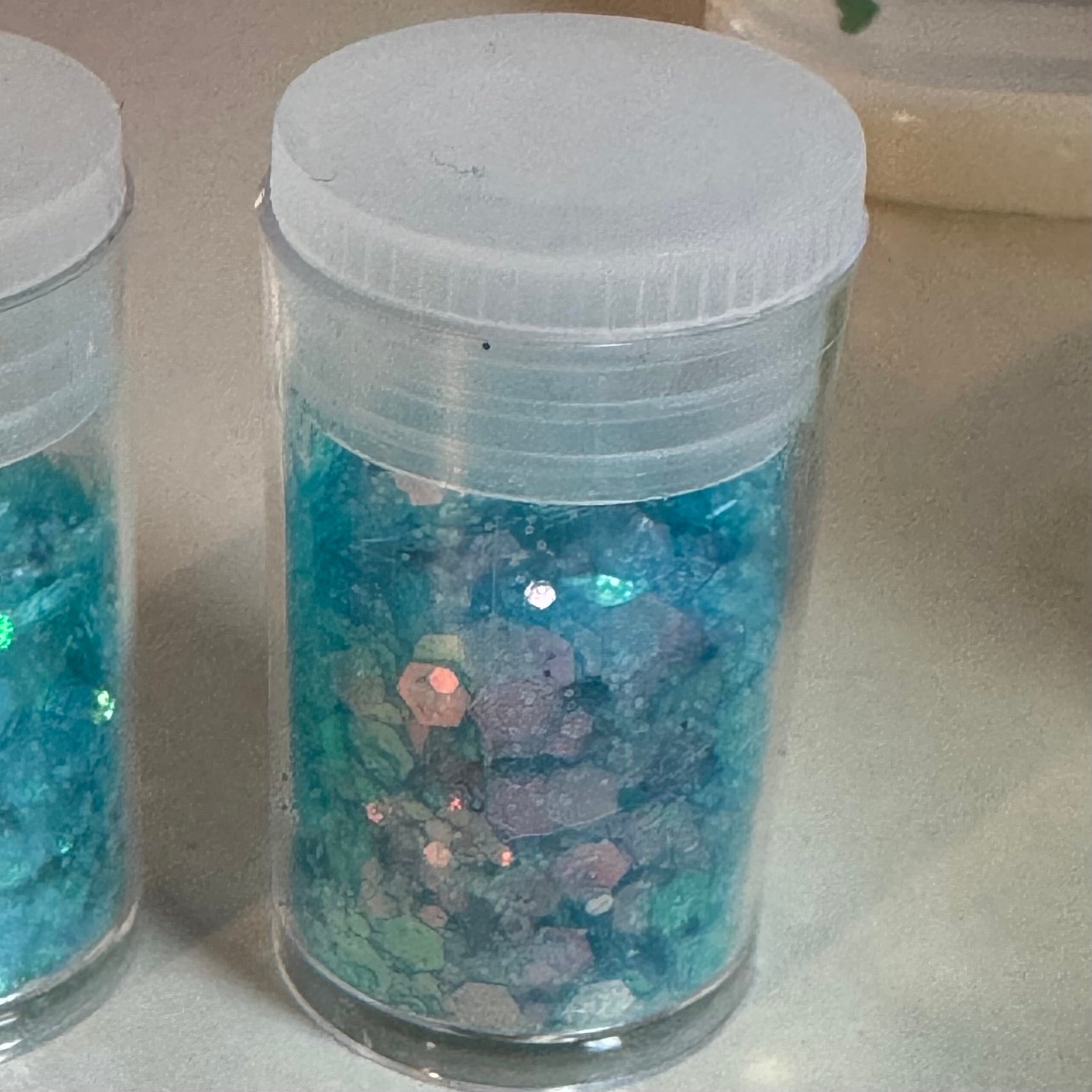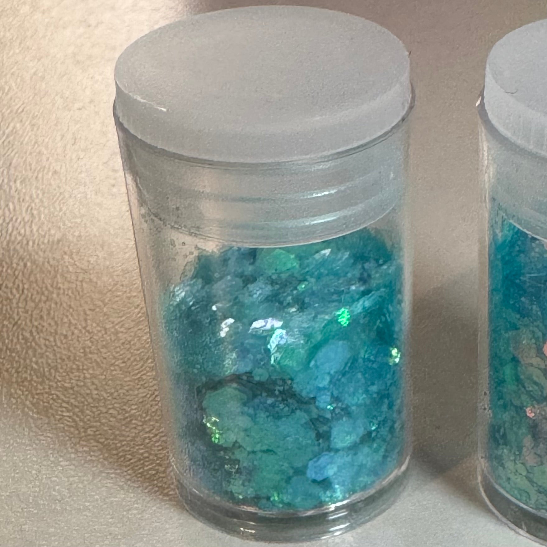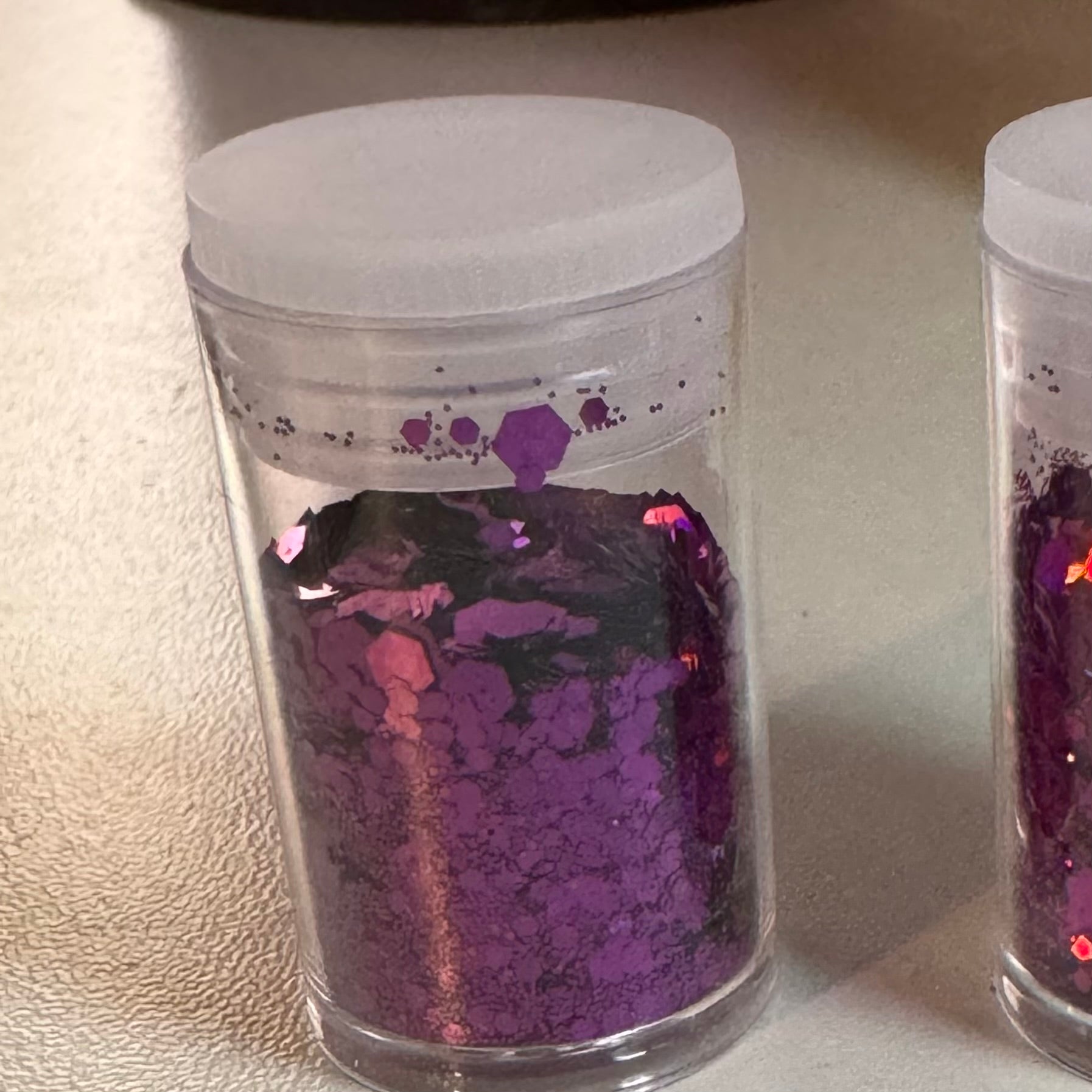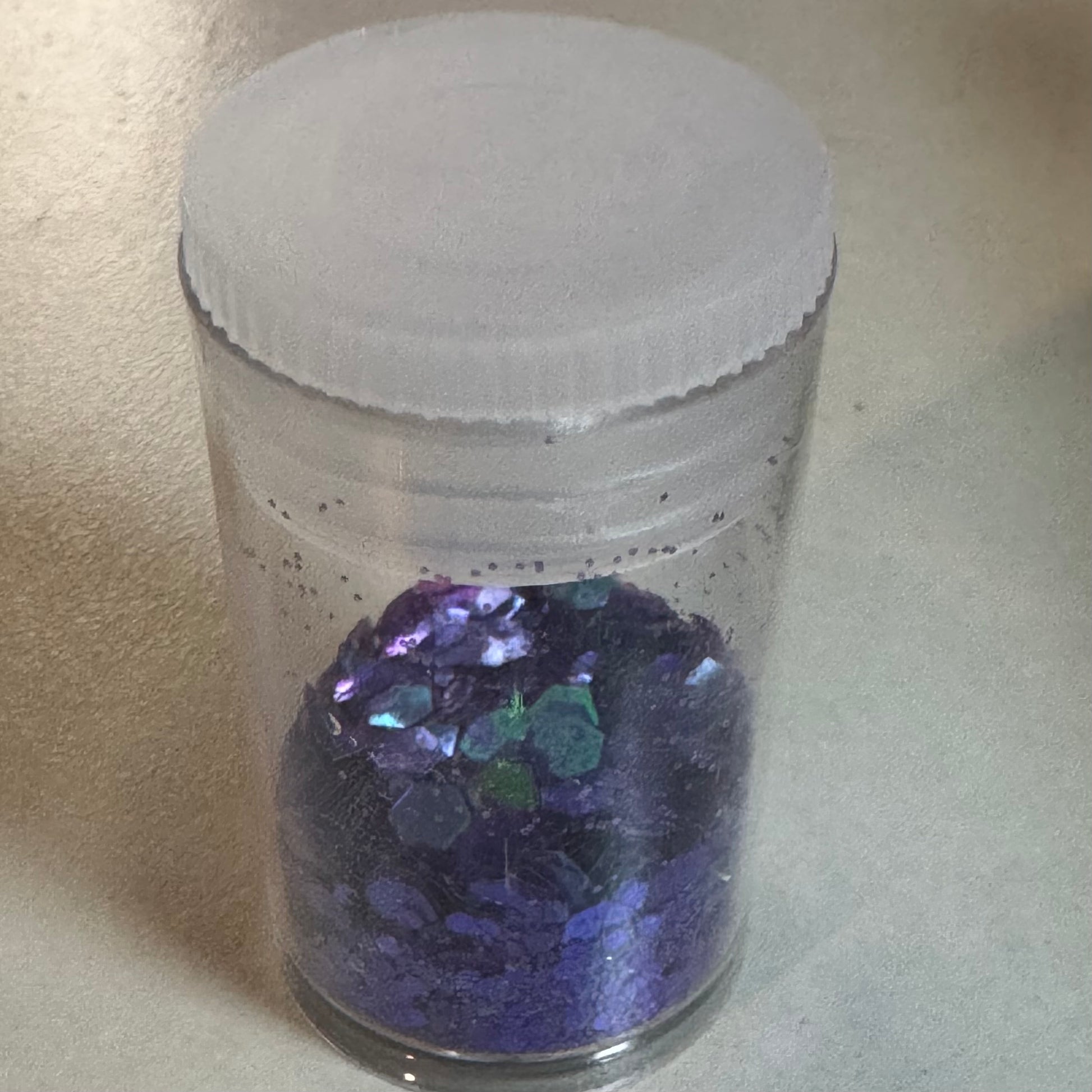 This is what the eyes look like before I paint glitter onto the backs to fill the clear part! I mix UV curing resin with your chosen glitter, paint it onto the eye, and cure under a UV lamp to solidify the glitter. I like to add a final layer of resin mixed with coloured pigment powder (I make sure the coloured powder matches the glitter colour!) onto the back of the glitter layer to seal it and leave a smooth surface on the back of the eye!