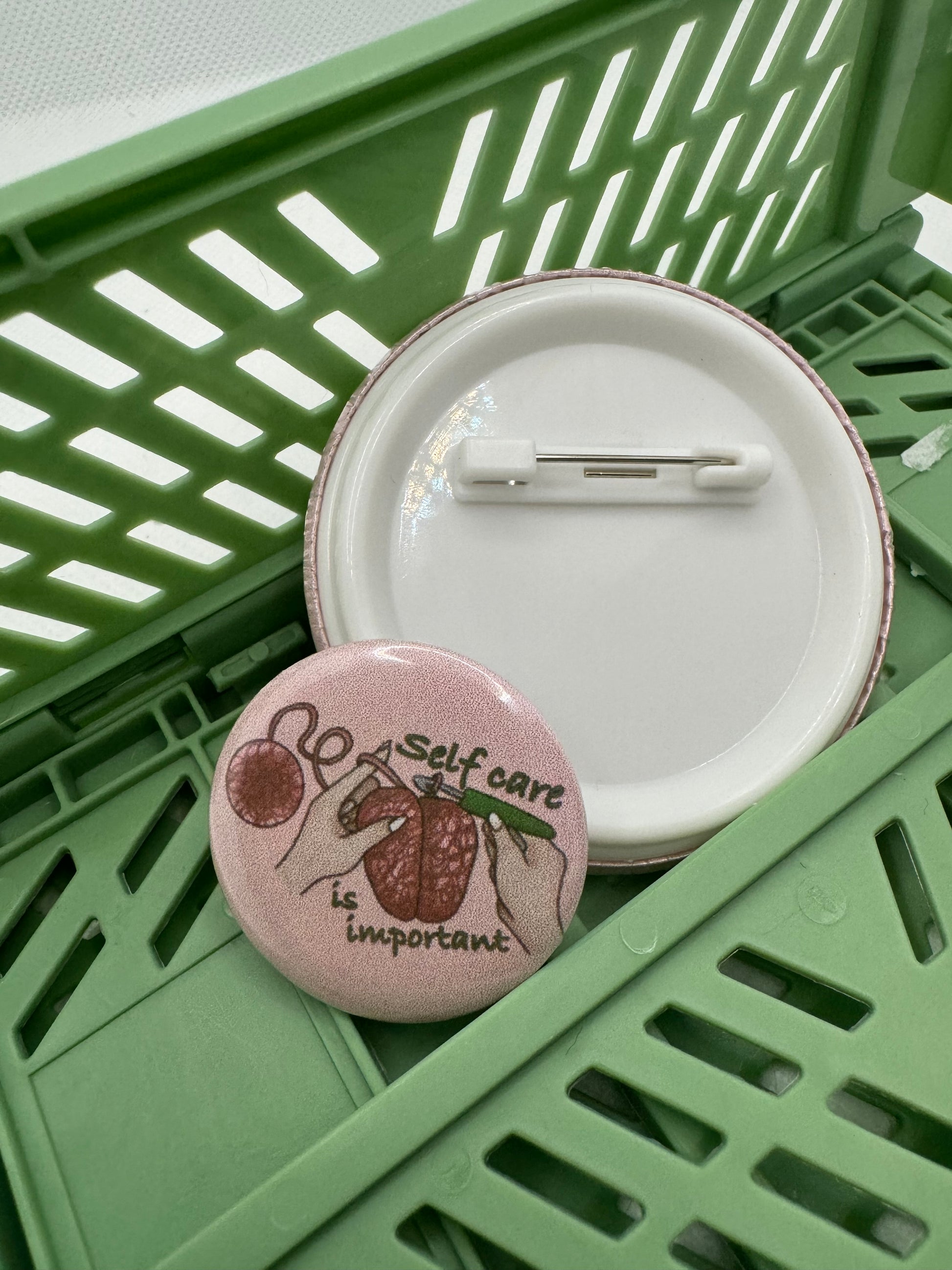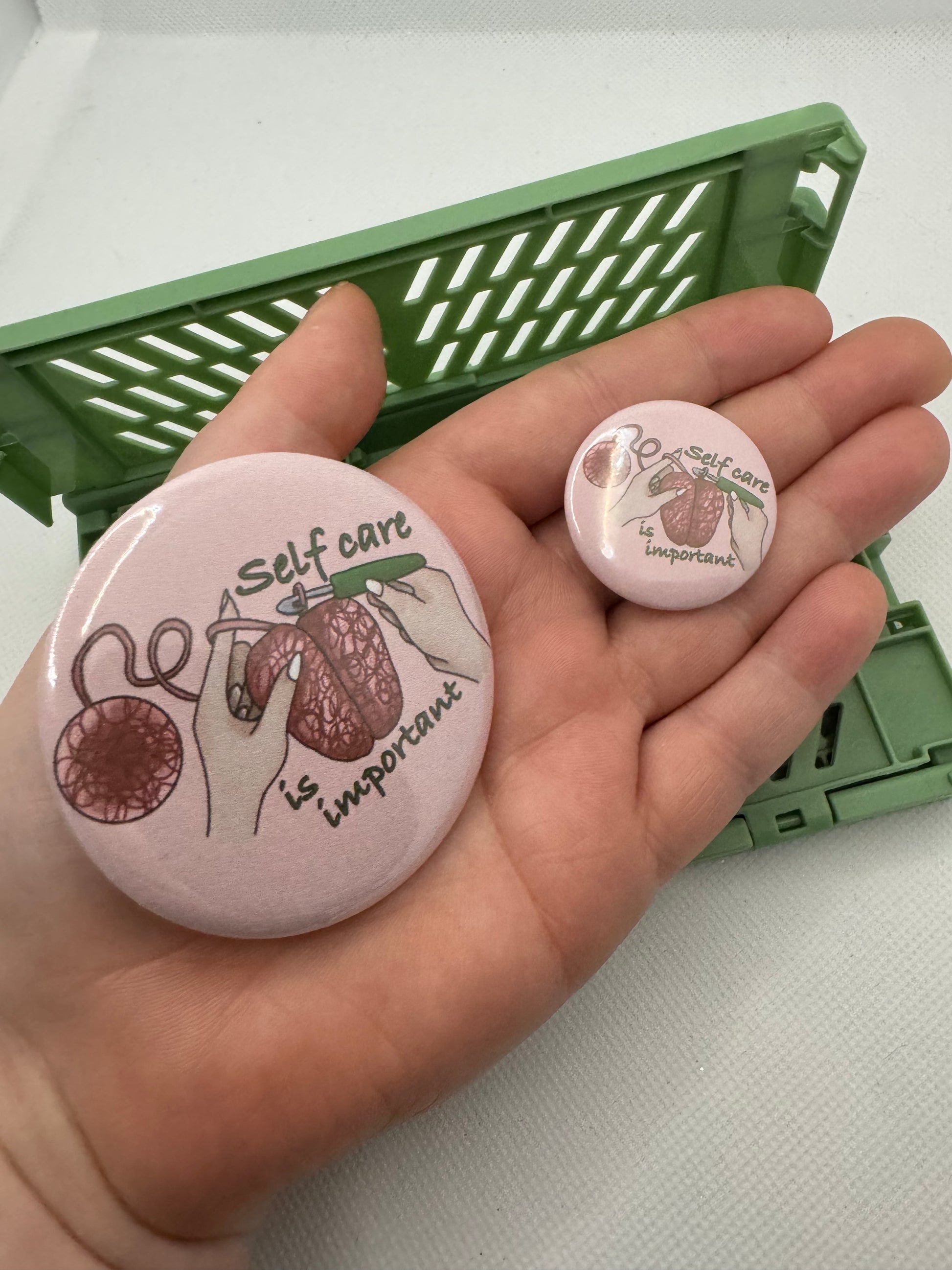 Button badge featuring the words “self care is important” with hands crocheting a brain image on a light pink background.
