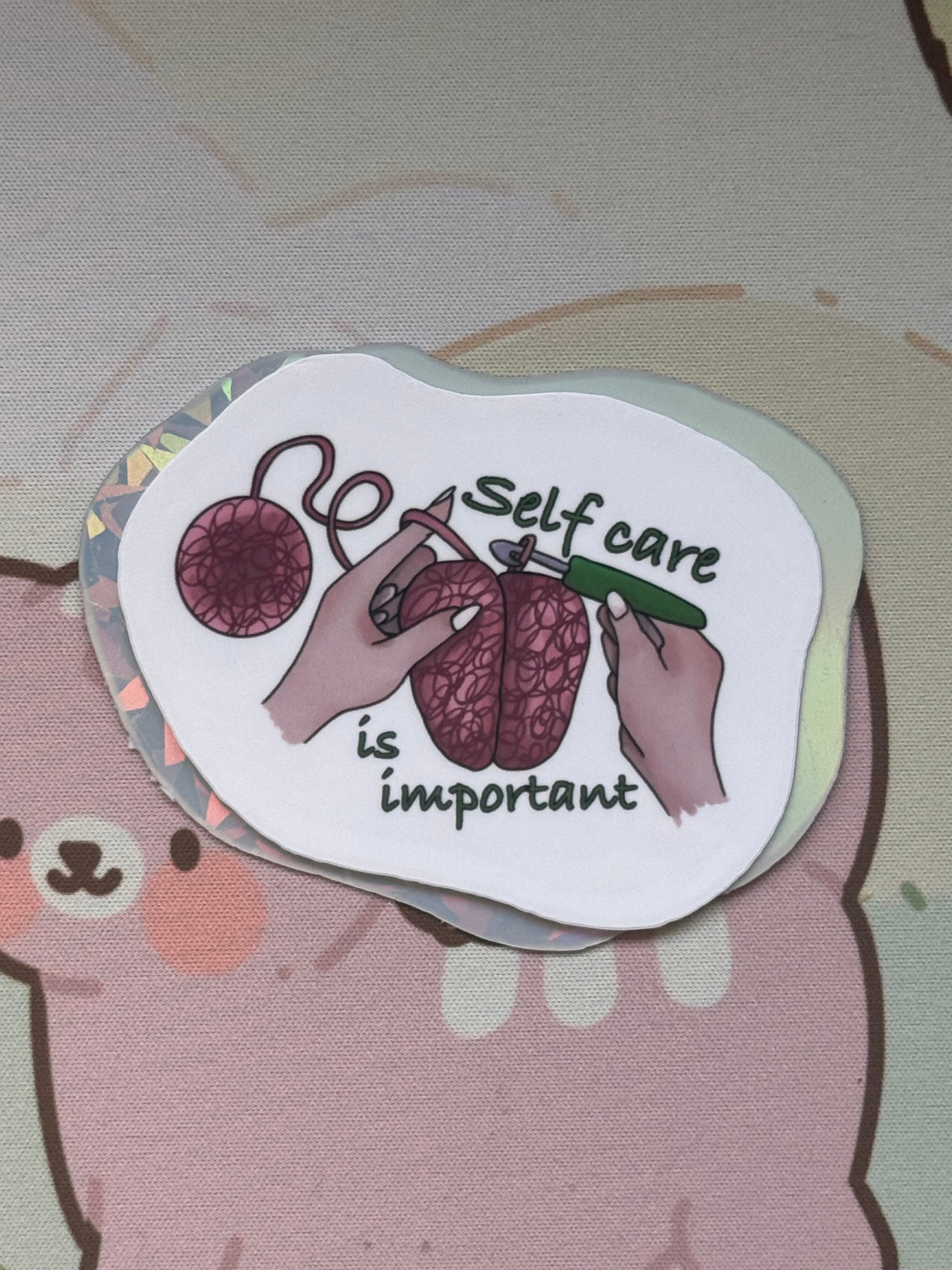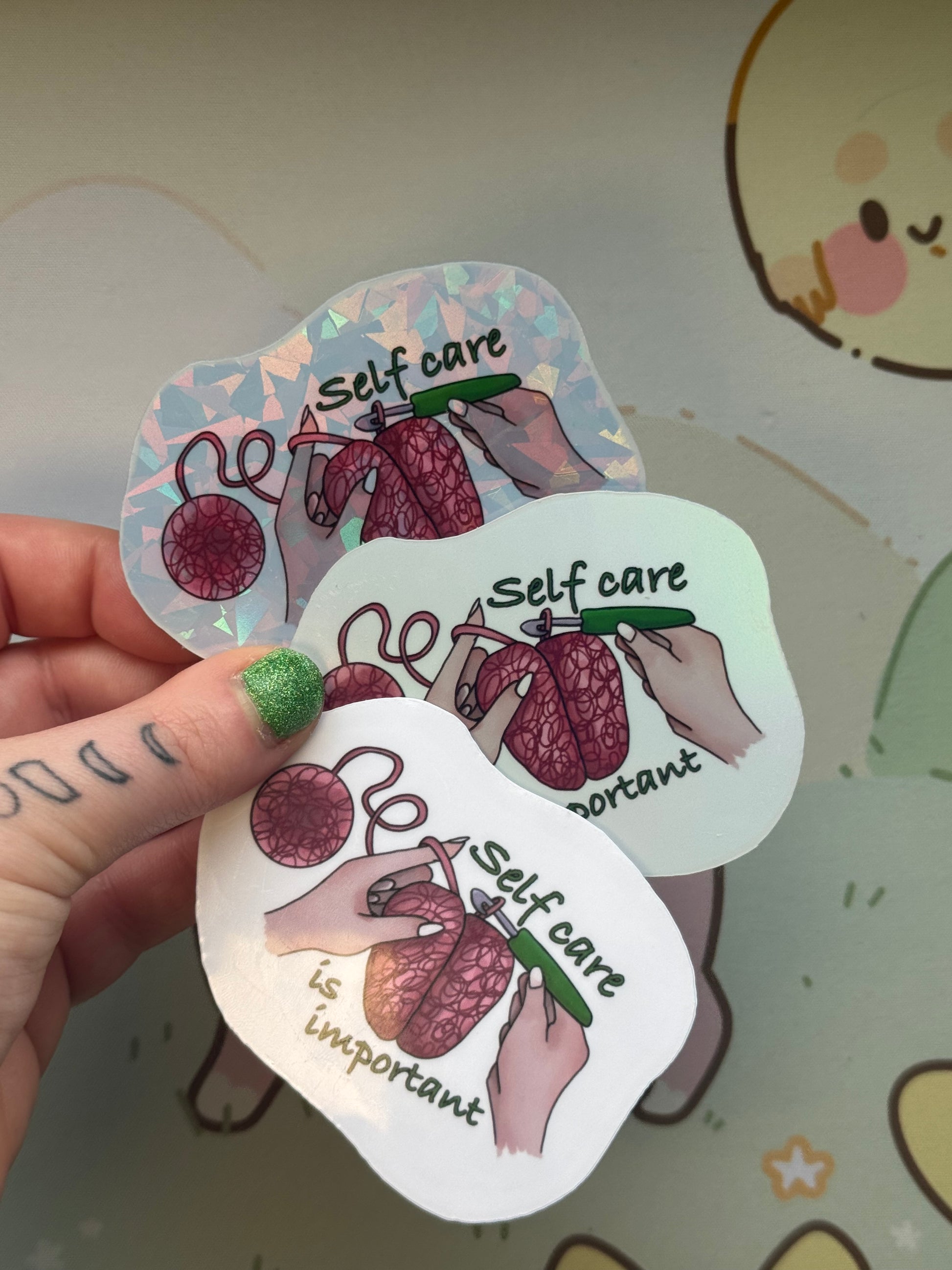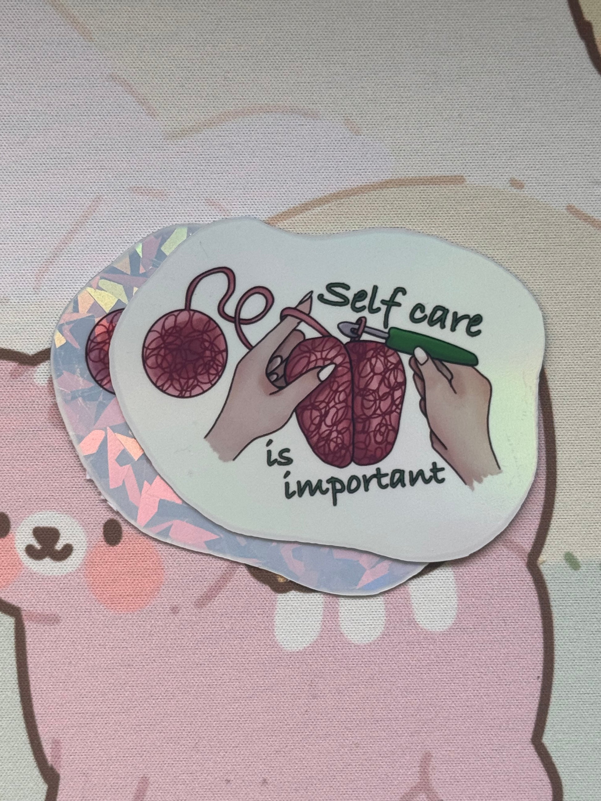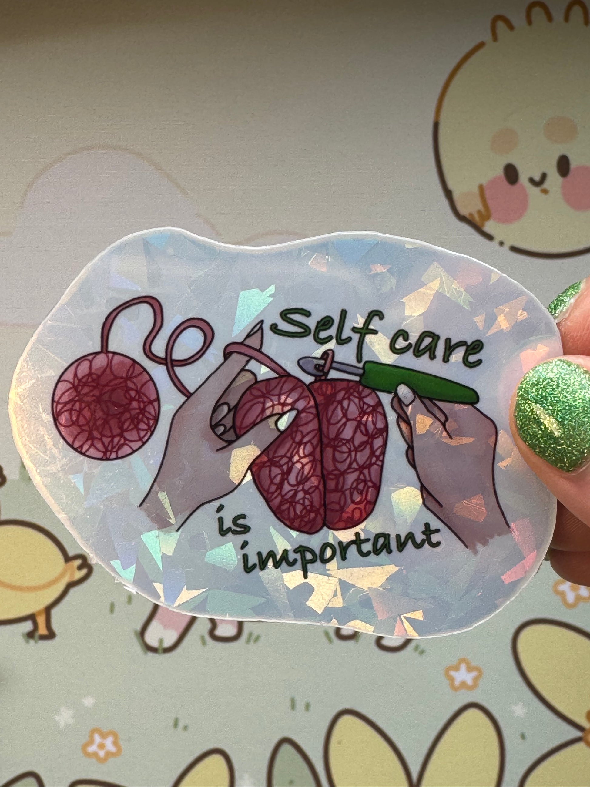This sticker shows my self care reminder design! It comes in 3 finishes: white glossy, rainbow holographic, or cracked glass holographic!