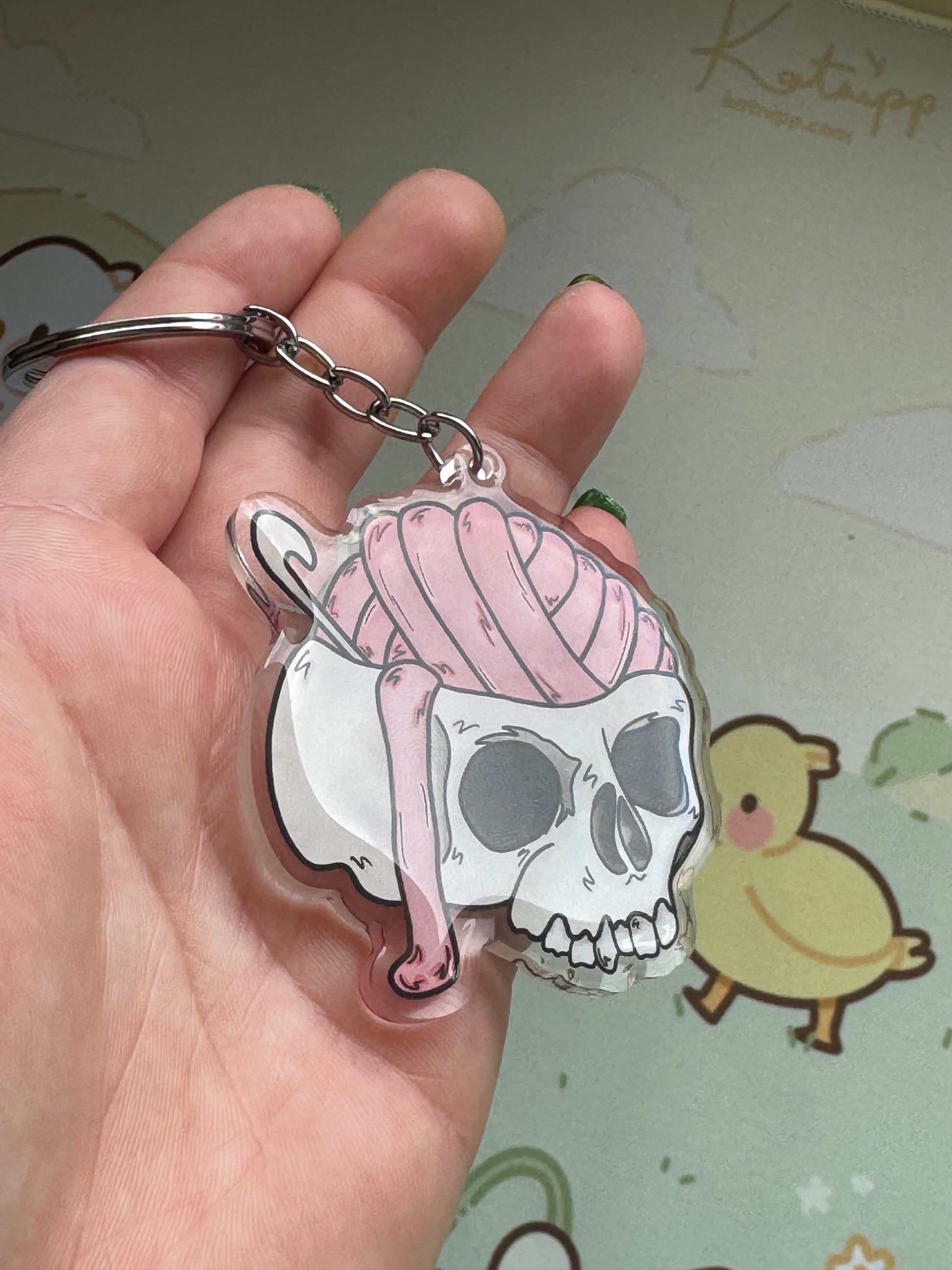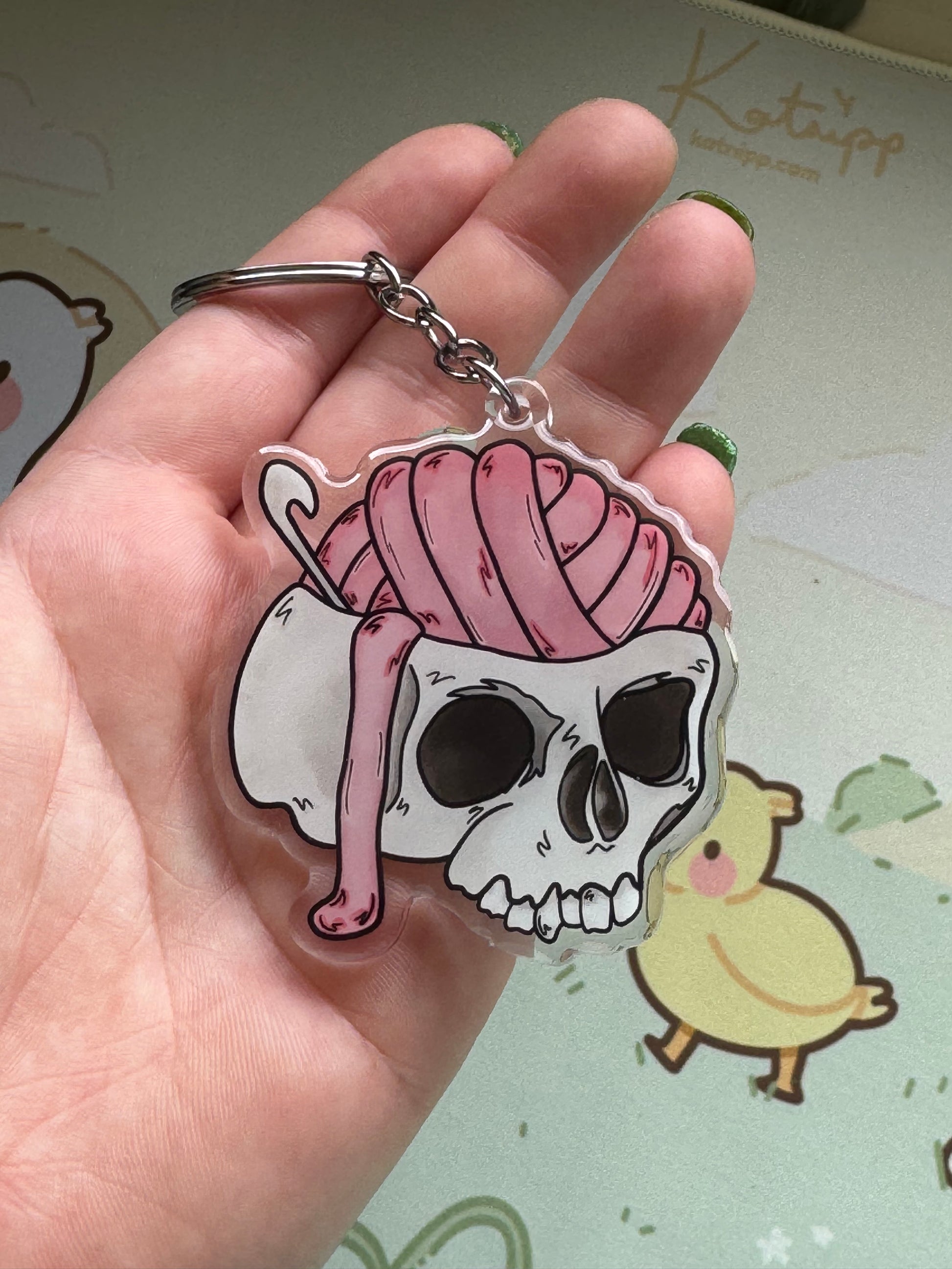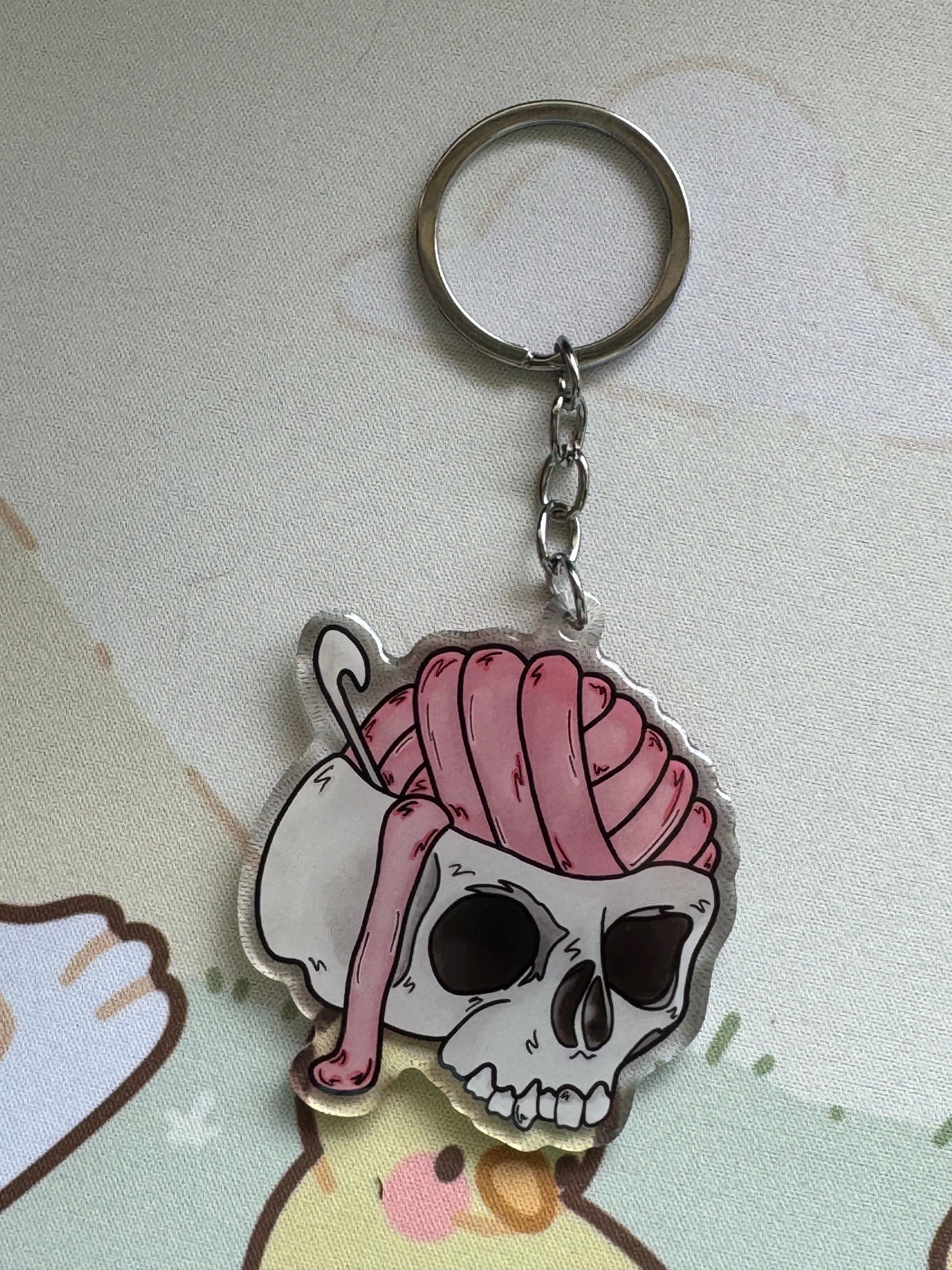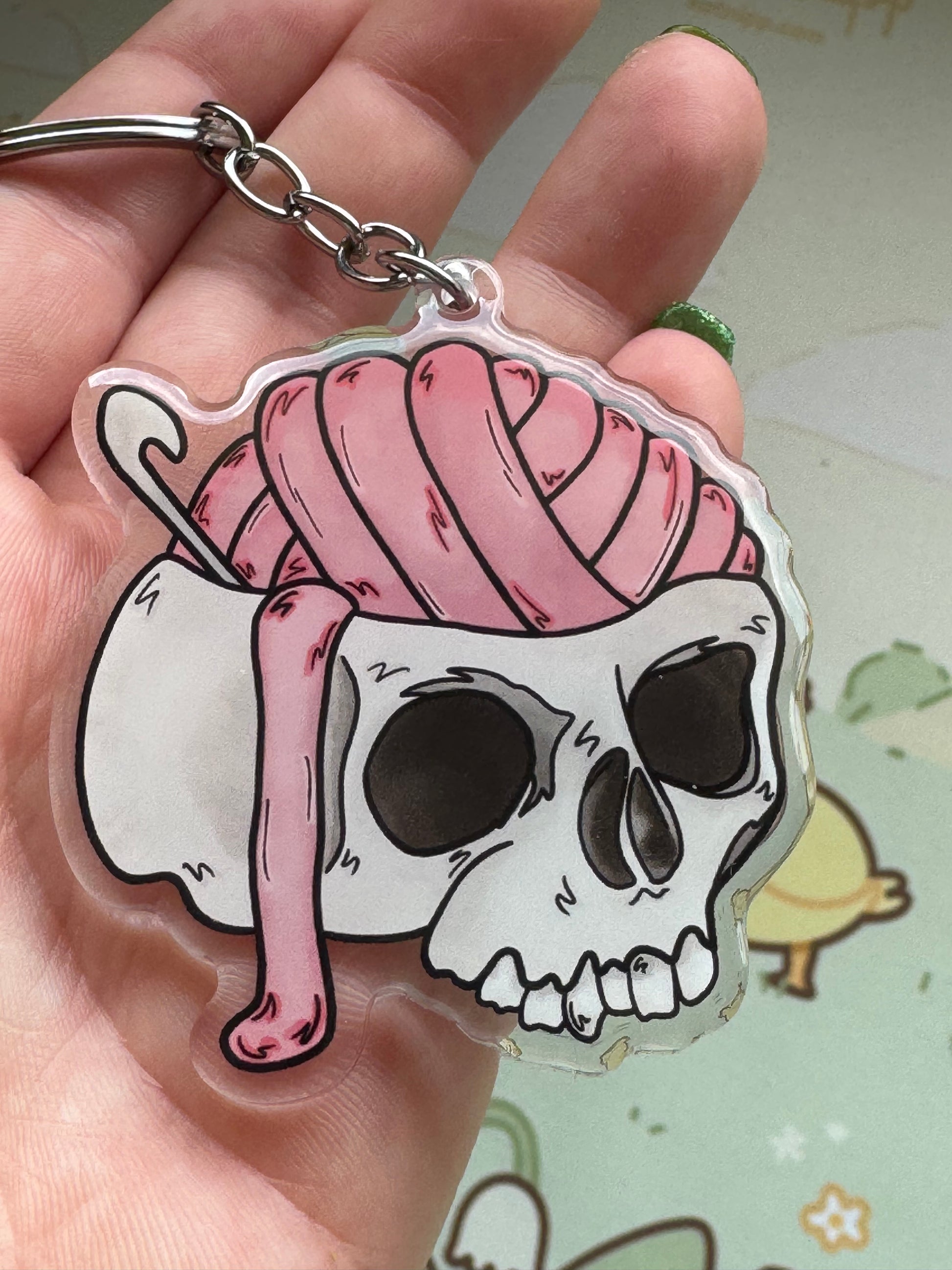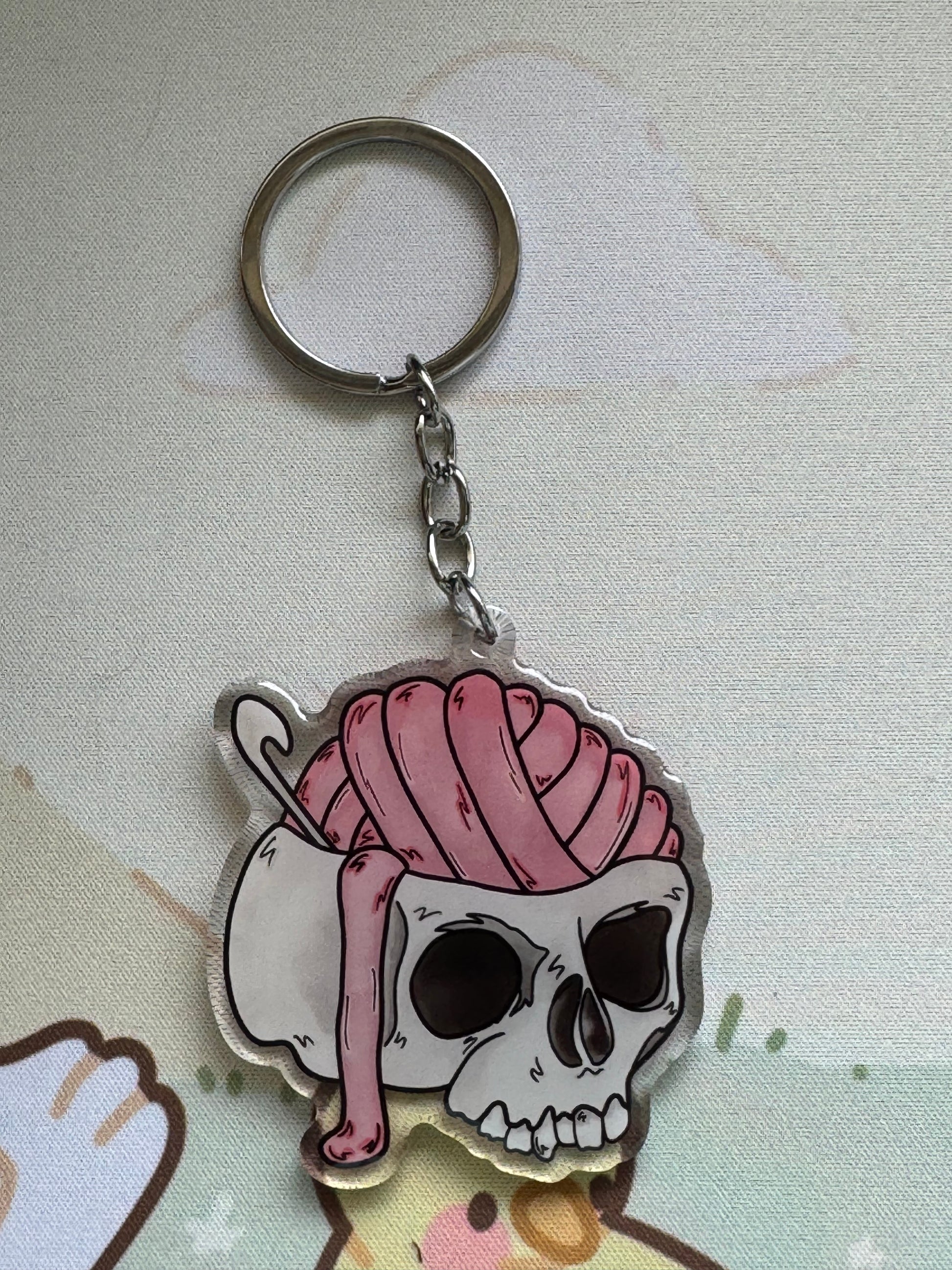 An acrylic keyring with my cracked open skull with yarn brains and a crochet hook design. This keyring is on clear acrylic, and is double sided, with domed epoxy finish on the front. The charm measures 2.5 inches at its largest dimension and the keyring part is a simple silver chain and large split ring for easy attachment to your keys, bag, zipper, etc!